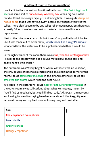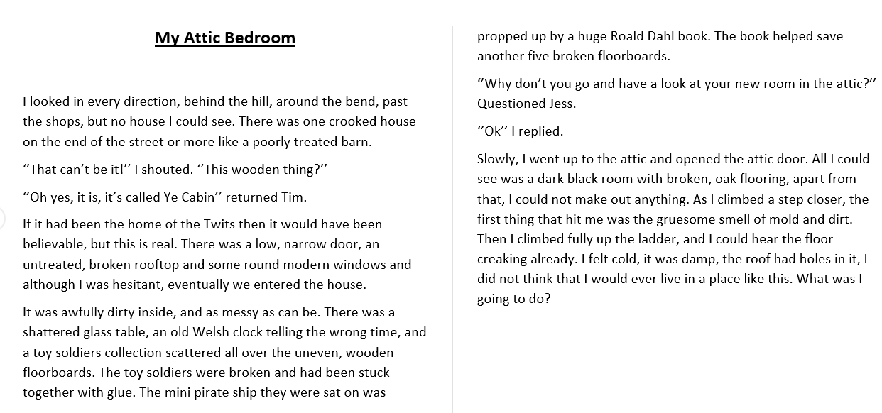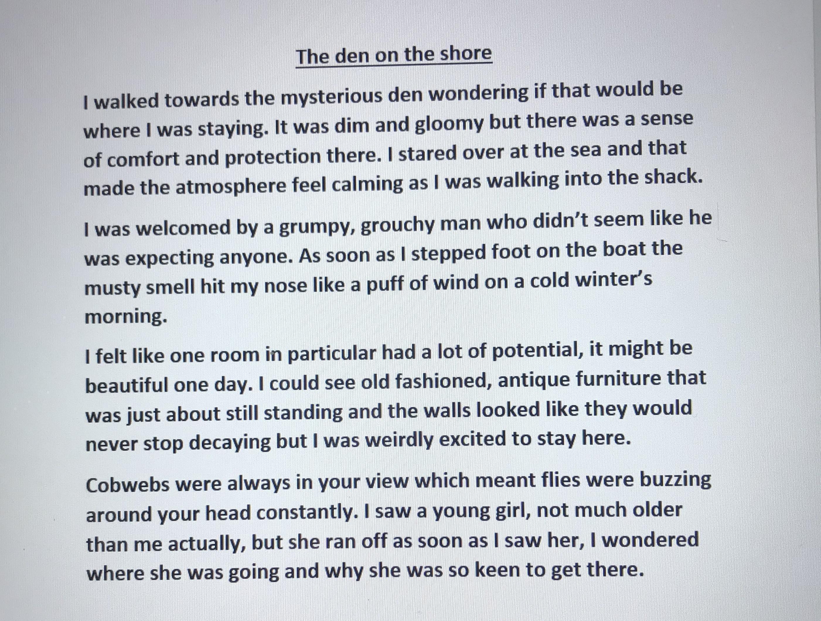 A huge barge washed up on the side. I looked up and down and all around me. A broken down fence looking entrance, which was difficult to get in. Paint was peeling off the windows making them look dirty. We stepped in all quite well until Ellie stumbled over a rotten loose floorboard. I could hear the sound of rats scurrying above my head.