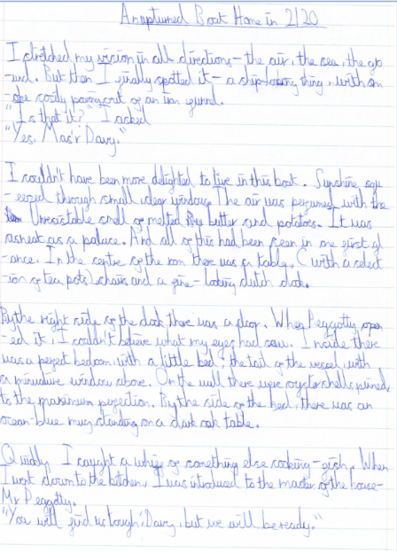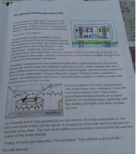 Gliding towards me, a robot butler took my coat and suitcases and showed me around my new home. The main room was minimalist and loaded with state of the art technology. A clever hologram machine sat on a fibre glass table and a fridge, that ordered food when running low, rested against the other wall. The boathouse had everything I needed but it was all cleverly hidden away, ready to come out at the touch of a button! The voice activated lighting system ran around the whole vessel. Although I had windows for natural light, my favourite element was the ability to project any image/scenery onto them as a view.