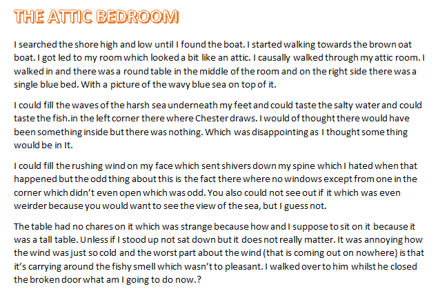 It was a mission to find that barge that lay on the shore line. Along with a group of explorers we trekked over mountains, through jungles and even across ice. I spent every night camping on the grass in the wild. I looked across the damp, dewy grass and in the distance I thought I could see it. A wooden old barge washed up on the shore “Are you sure that’s it” questioned Ellie. We had to get closer, so we rushed over to take a closer look.