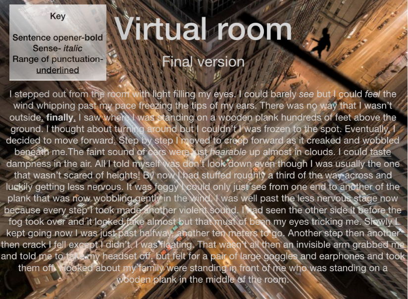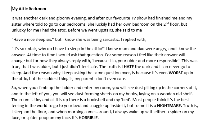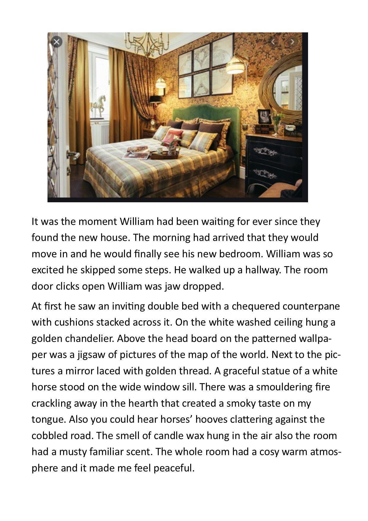 Mayble carefully opened the door and found herself inside a brightly coloured room with nothing but strange pictures on the wall. Of random objects, it smelt weird in there like there was once a beautiful rose in there until someone came along and cut it. Zachary came running after her as soon as he walked in the door there was a strange silence brought upon them. it was like they could hear everything before but now they don't hear anything.