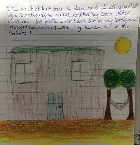 In the distance was a small wooden den on the beach. It was made of rotting wood and old scraps of metal that had been washed up by the sea. I slowly trod over to it, walking over the silky sand and climbing over the ancient granite rocks. As I got nearer to the den, I could make out five tree stumps made for people to sit on.
