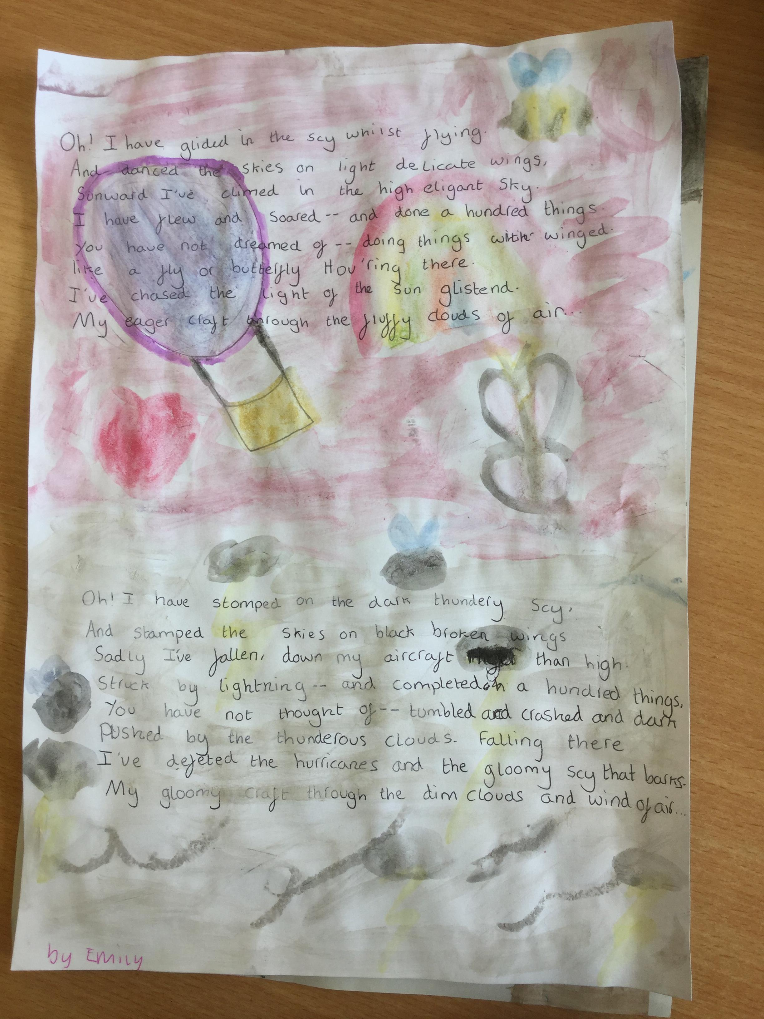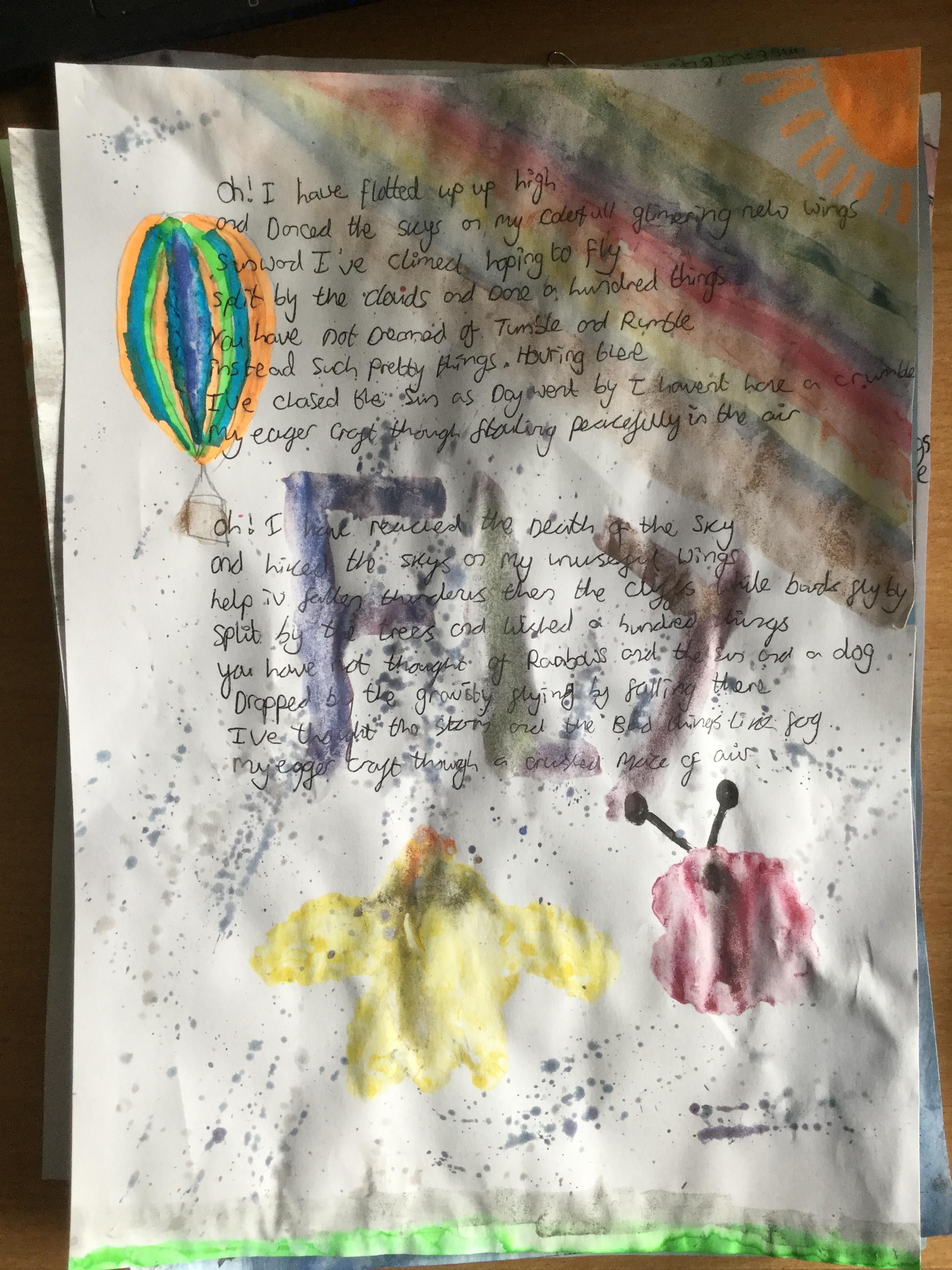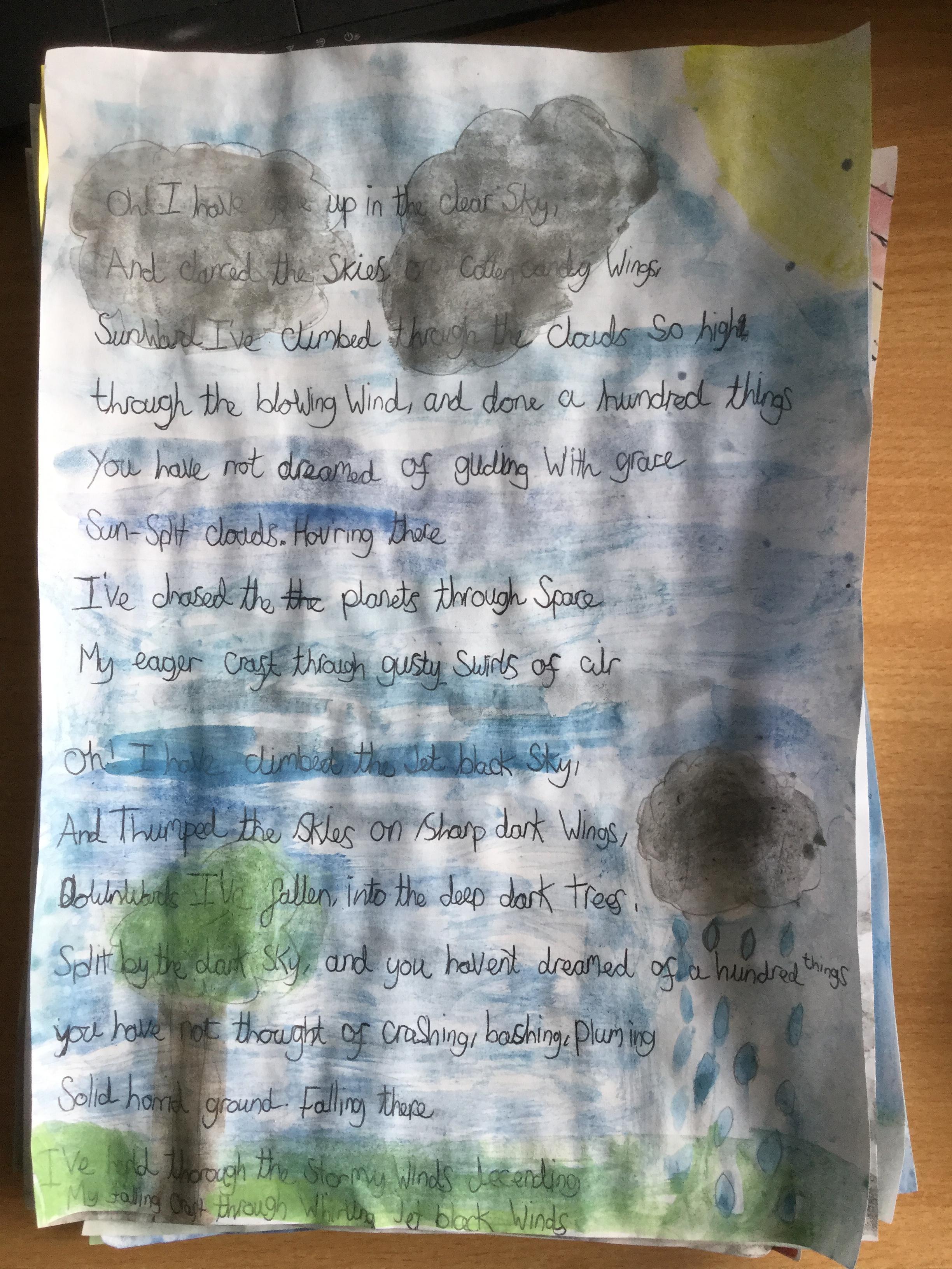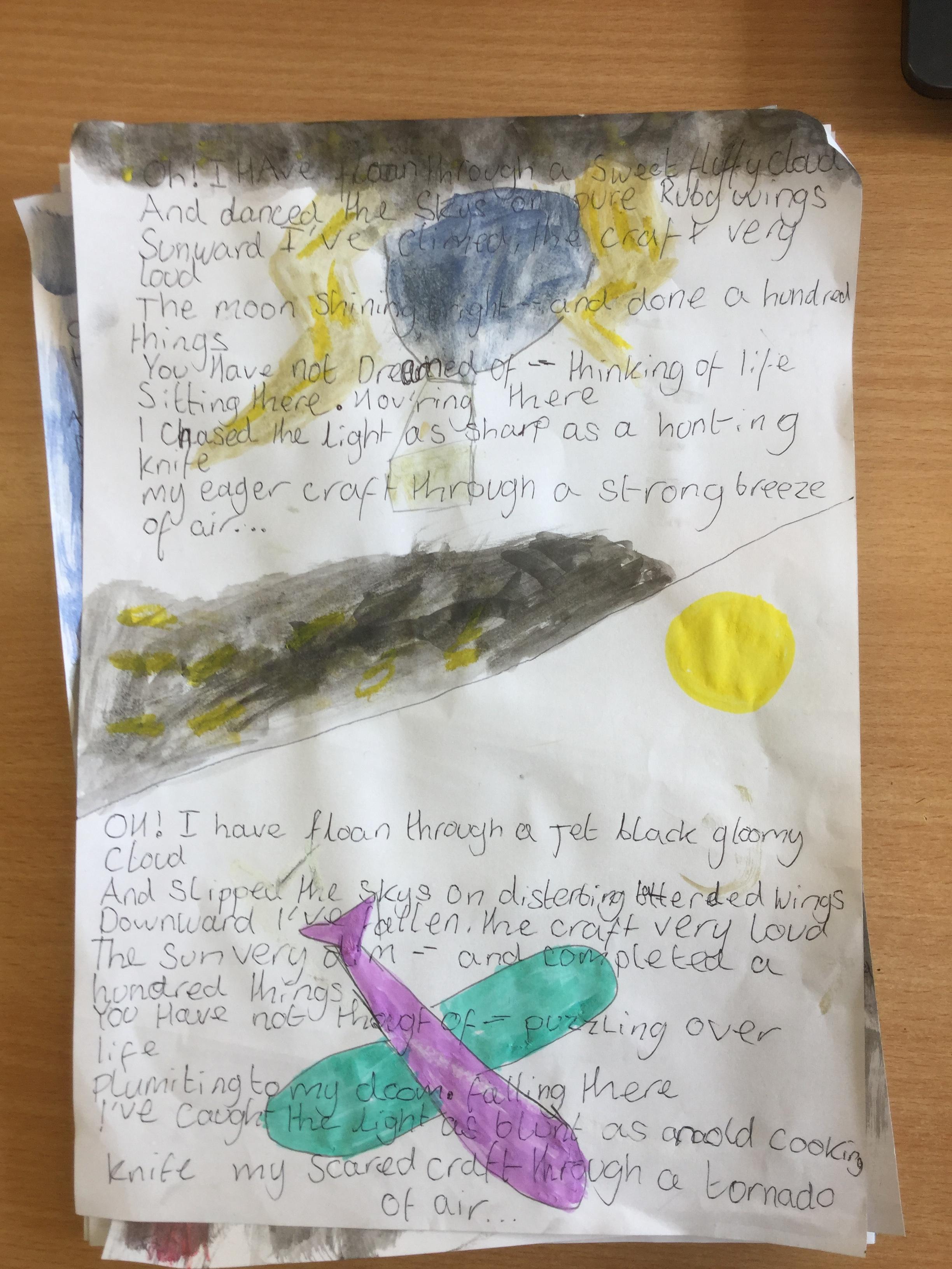 This week, we are reading a poem about flight looking specifically at the language used and he images it creates of the feeling of flying through the air. The children then collected many words to do with flight and they turned it into a group poem travelling around their table!
