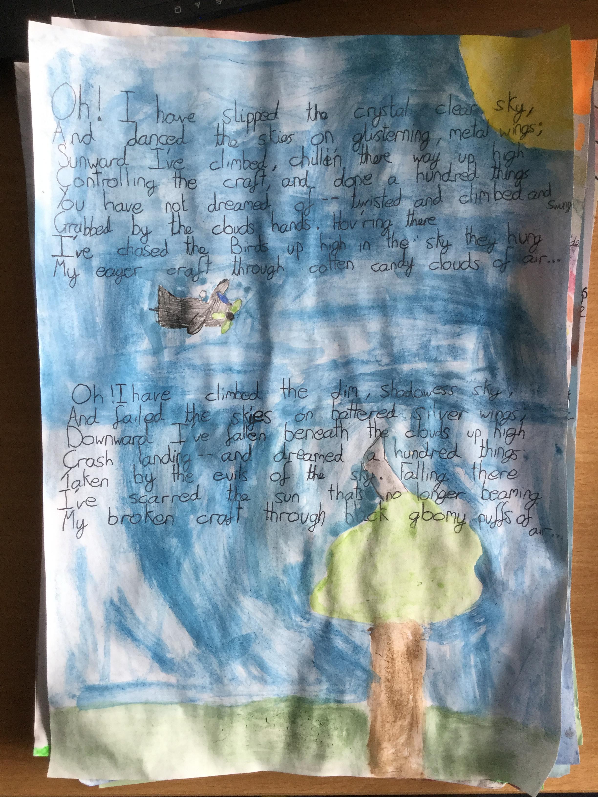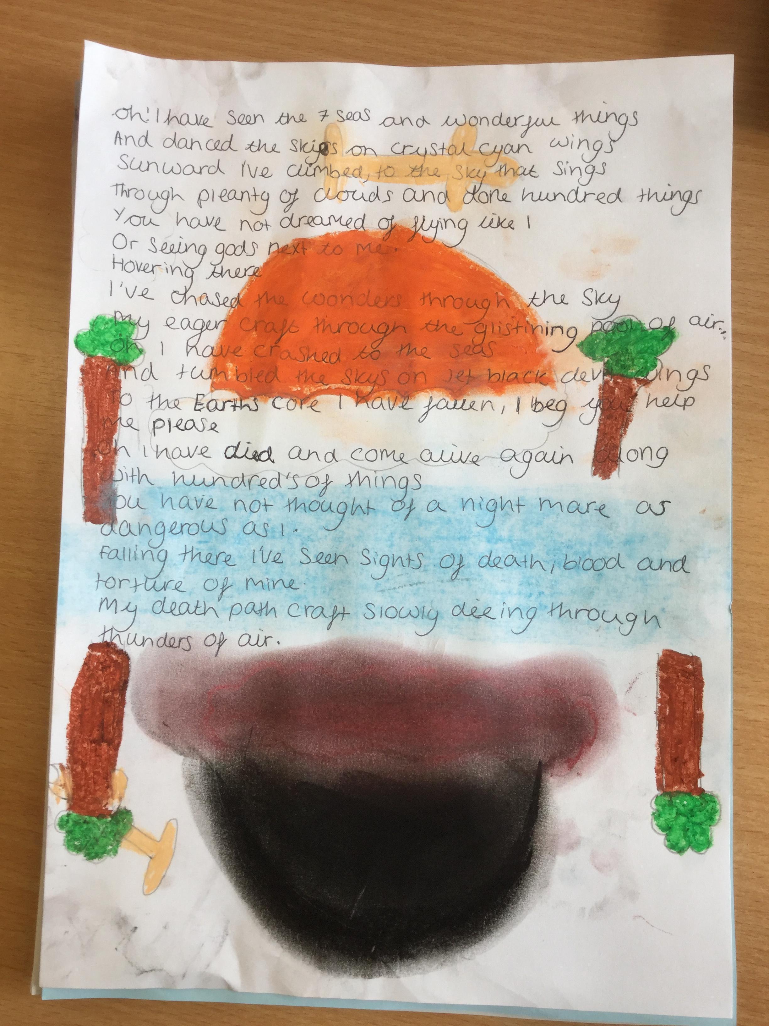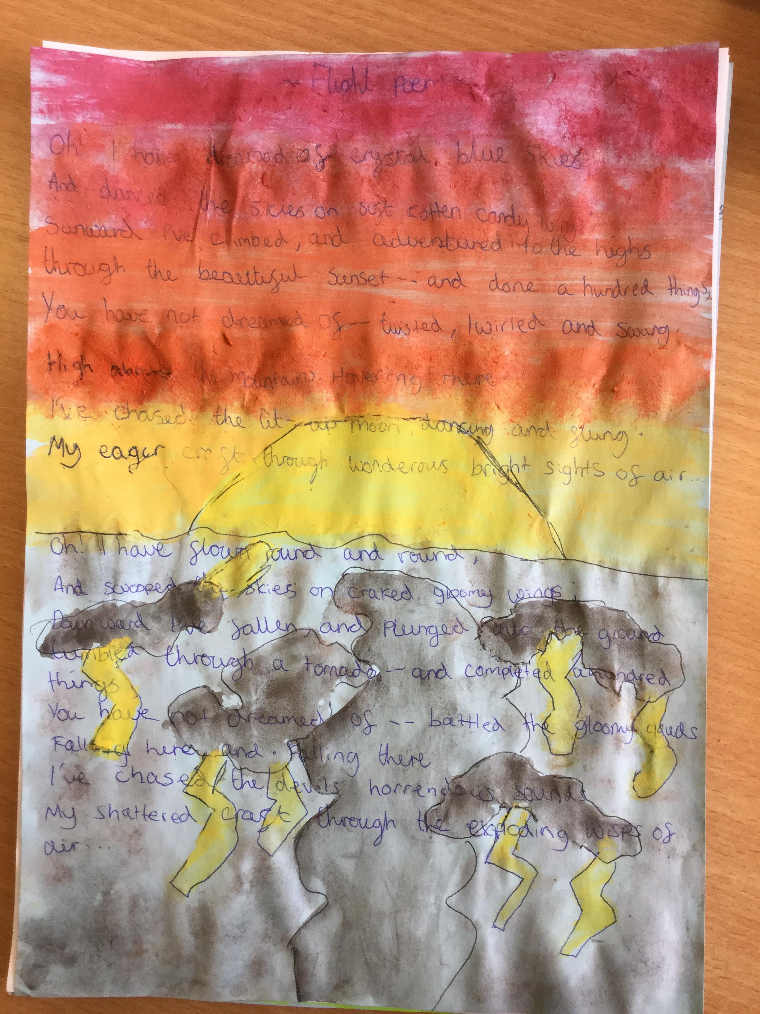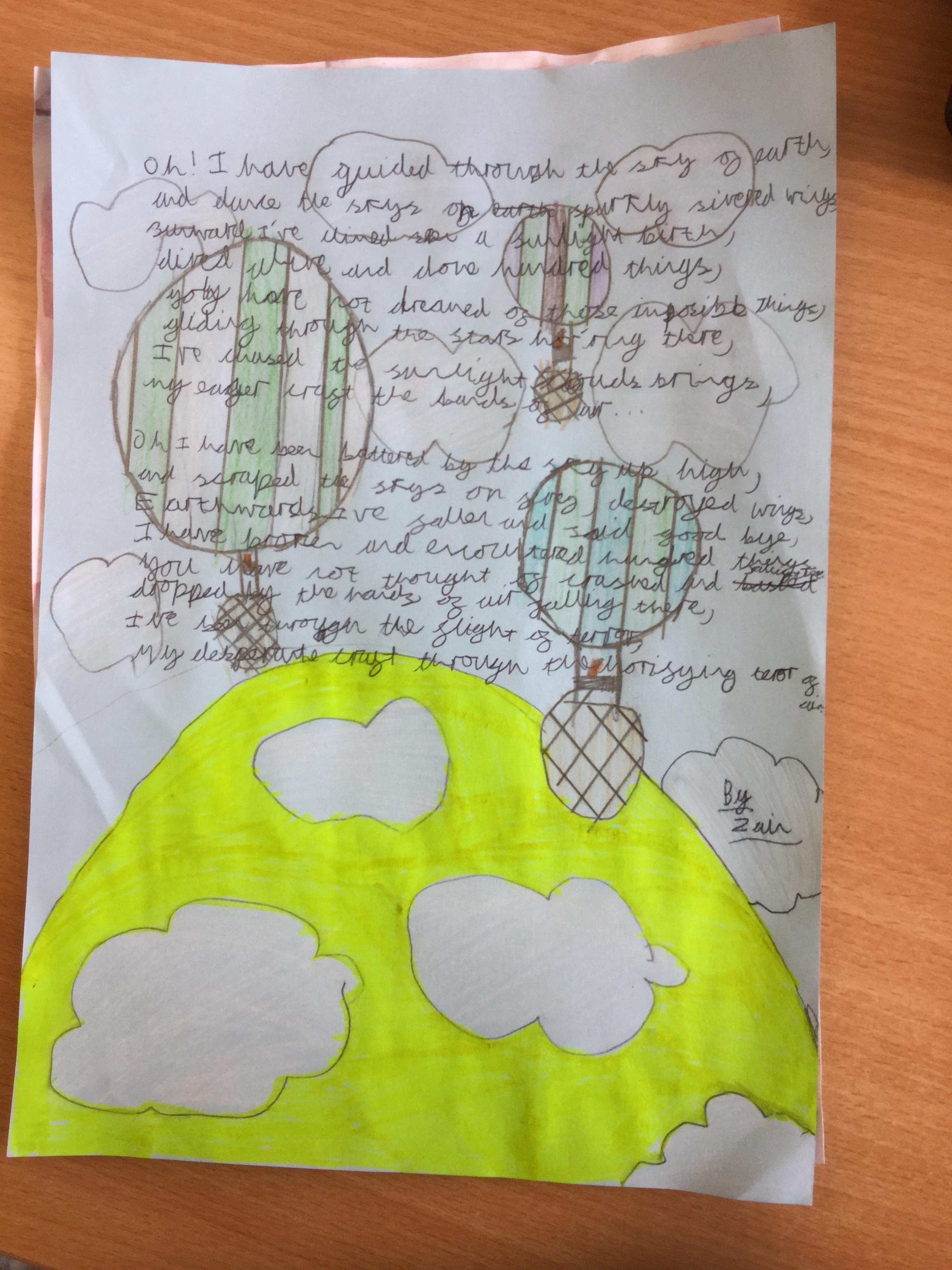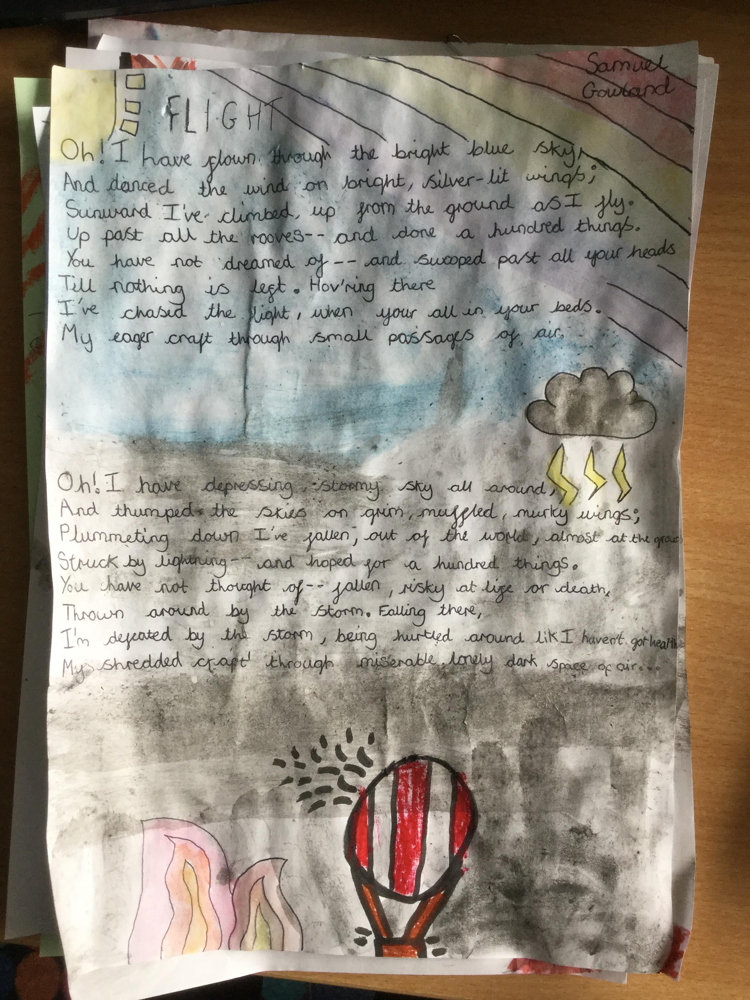 This week, we are reading a poem about flight looking specifically at the language used and he images it creates of the feeling of flying through the air. The children then collected many words to do with flight and they turned it into a group poem travelling around their table!