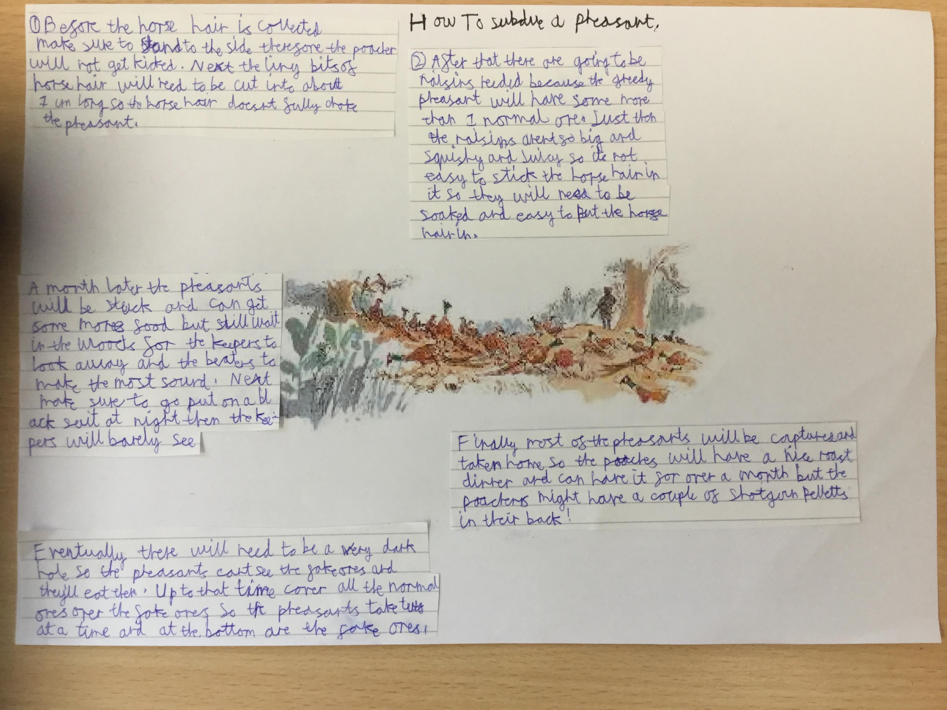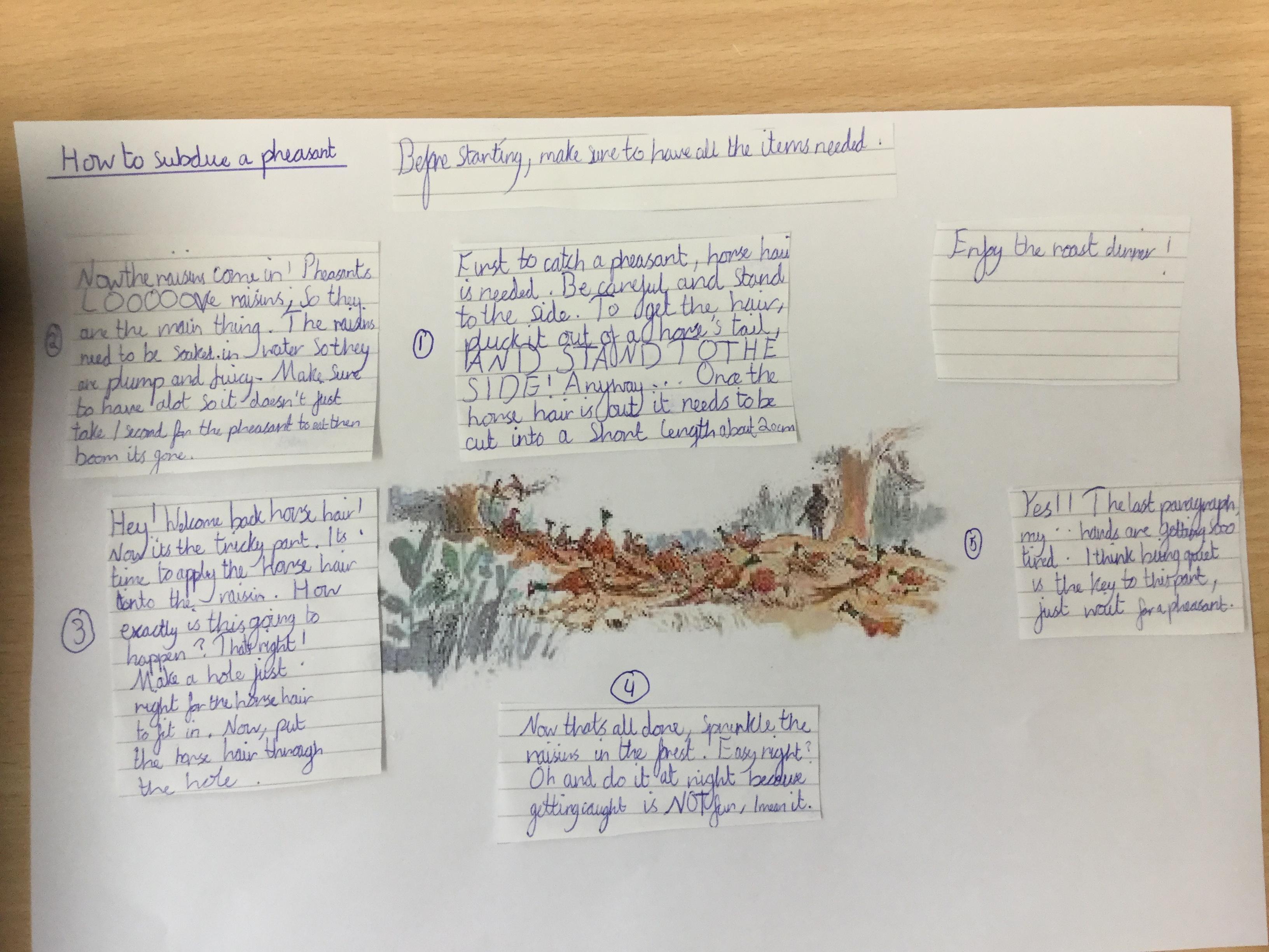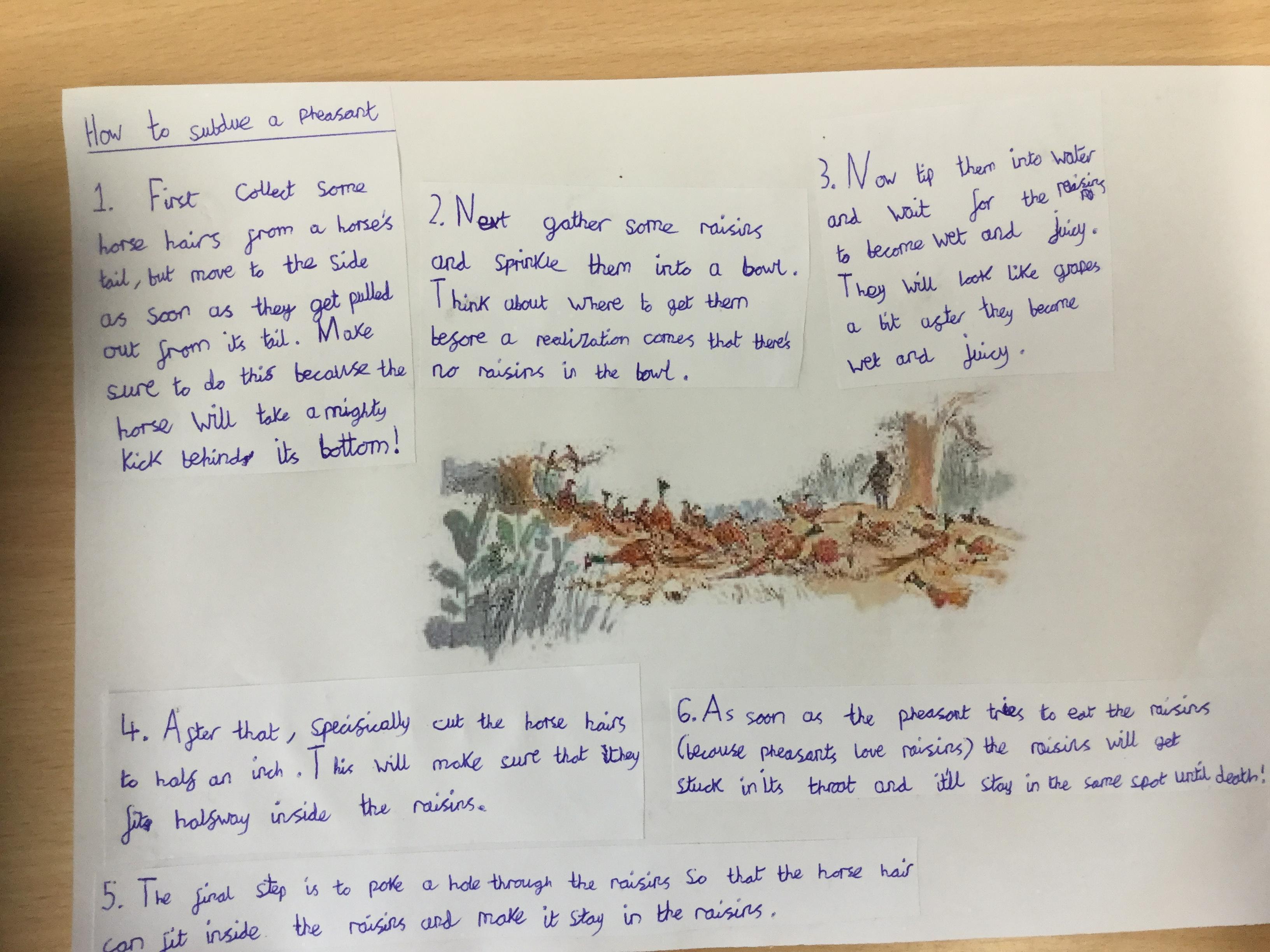 This week we have been writing an explanation of how to subdue a pheasant based on Danny the Champion of the World.