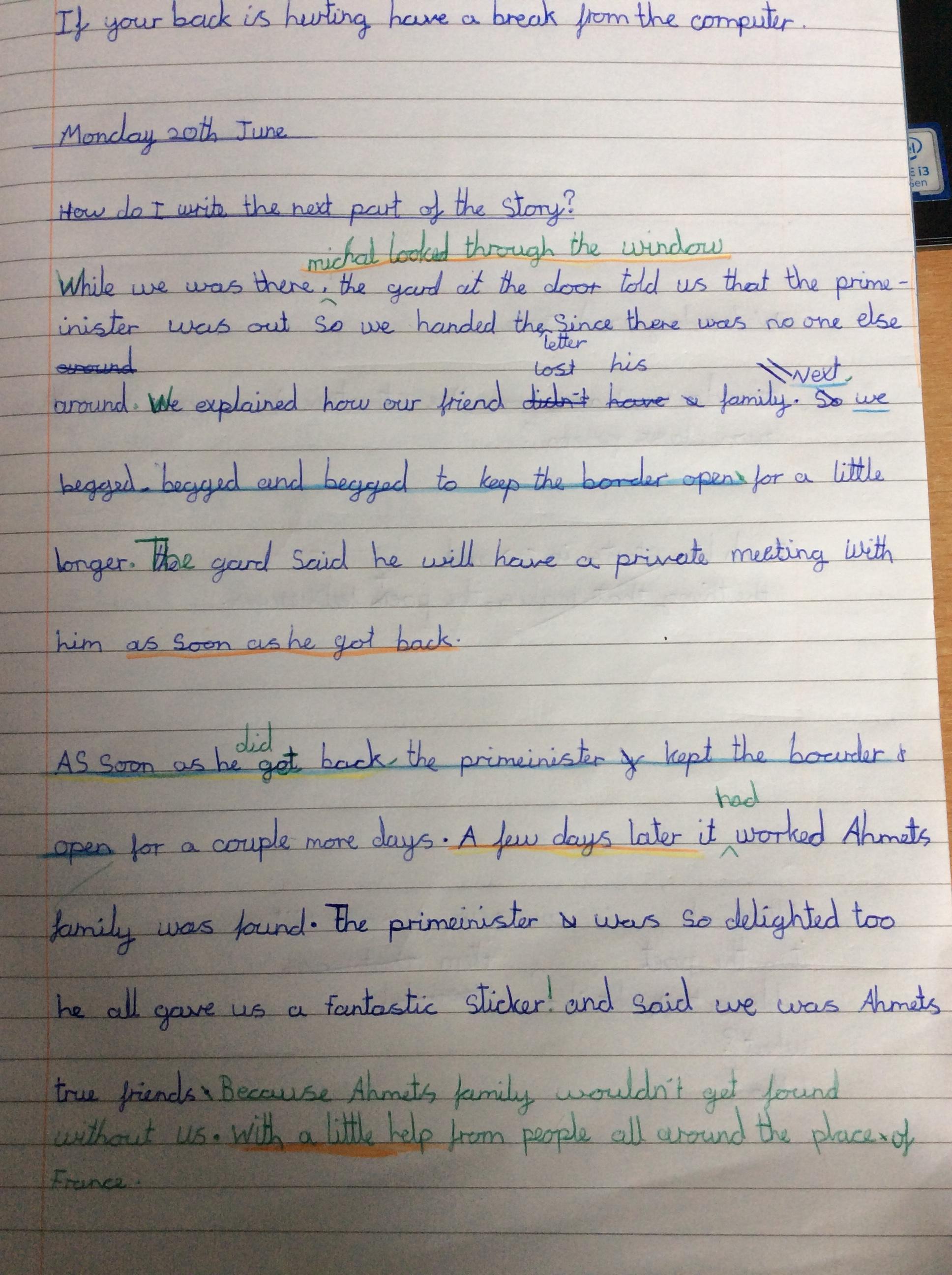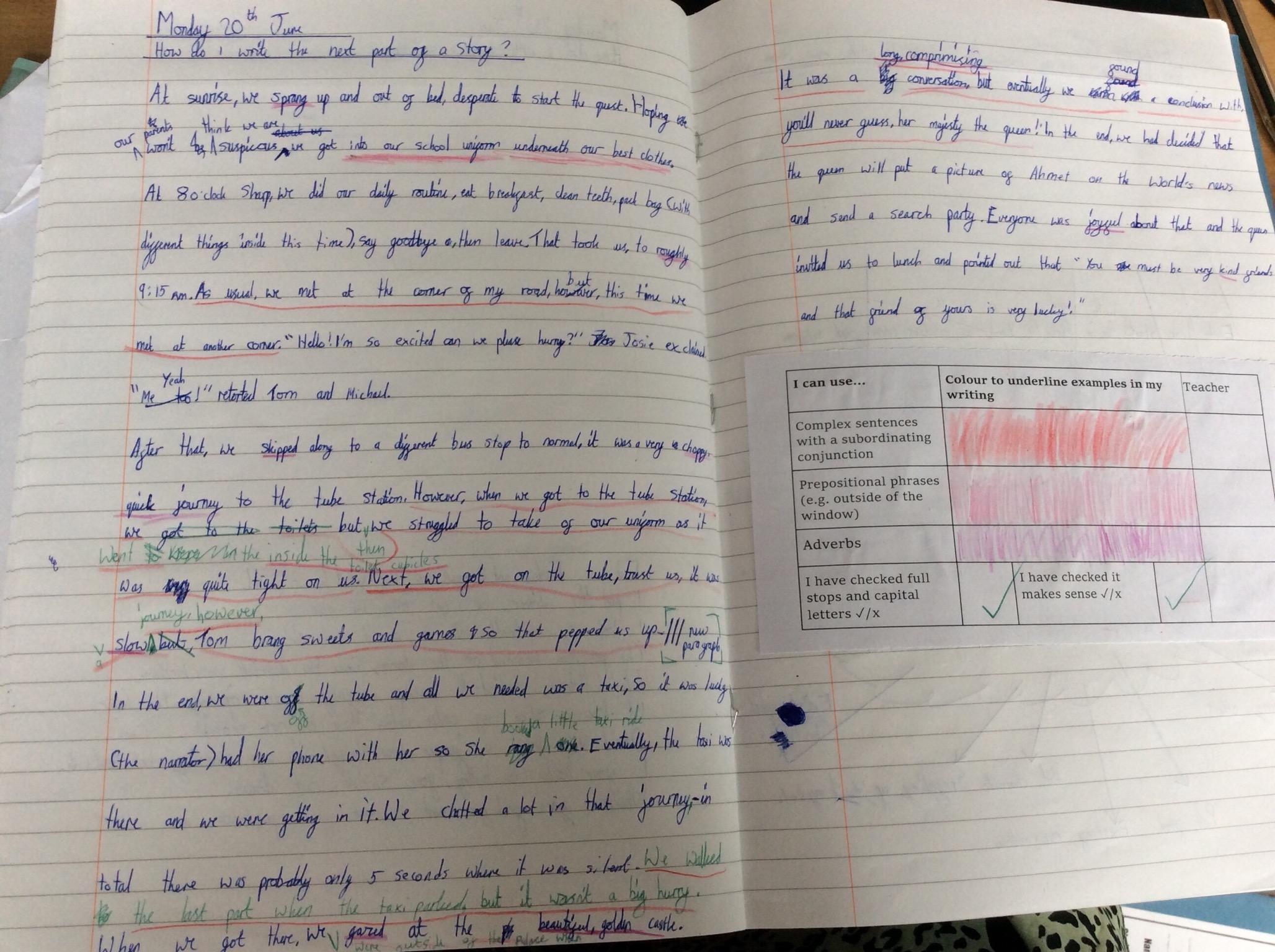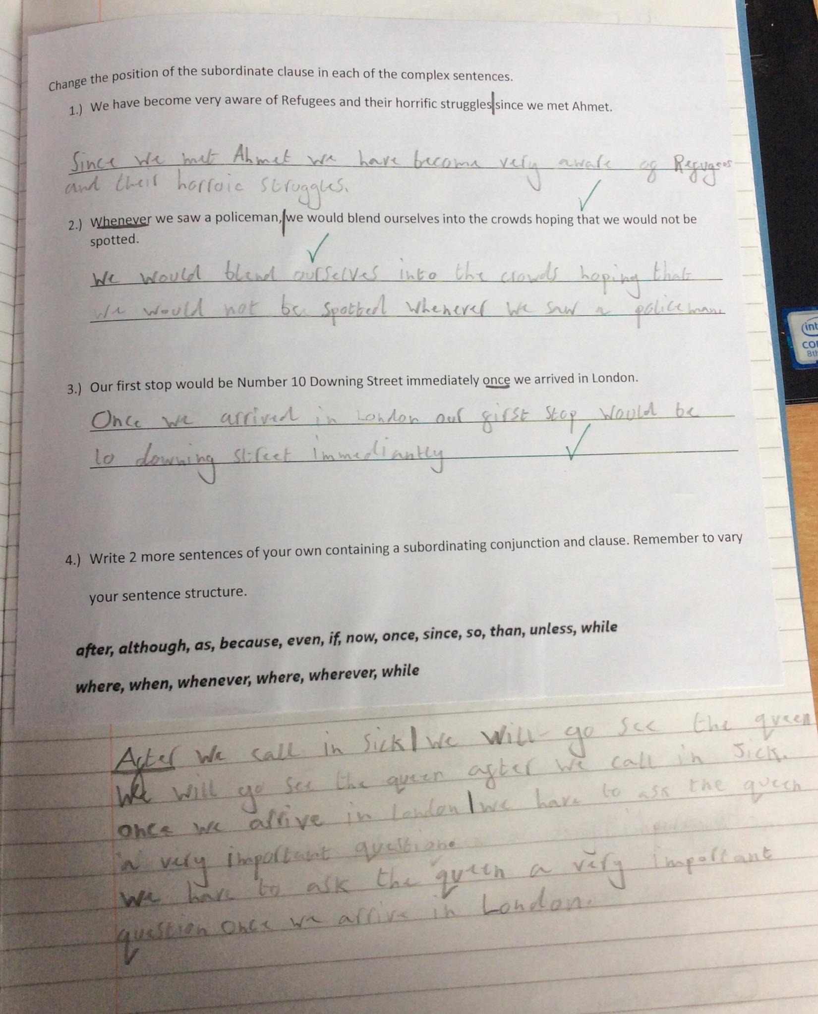 Next, we applied our knowledge of subordinate clauses to our piece of writing in which we predicted what the children’s ‘greatest idea in the world’ was going to be, in order to ensure that Ahmet could see his family again.