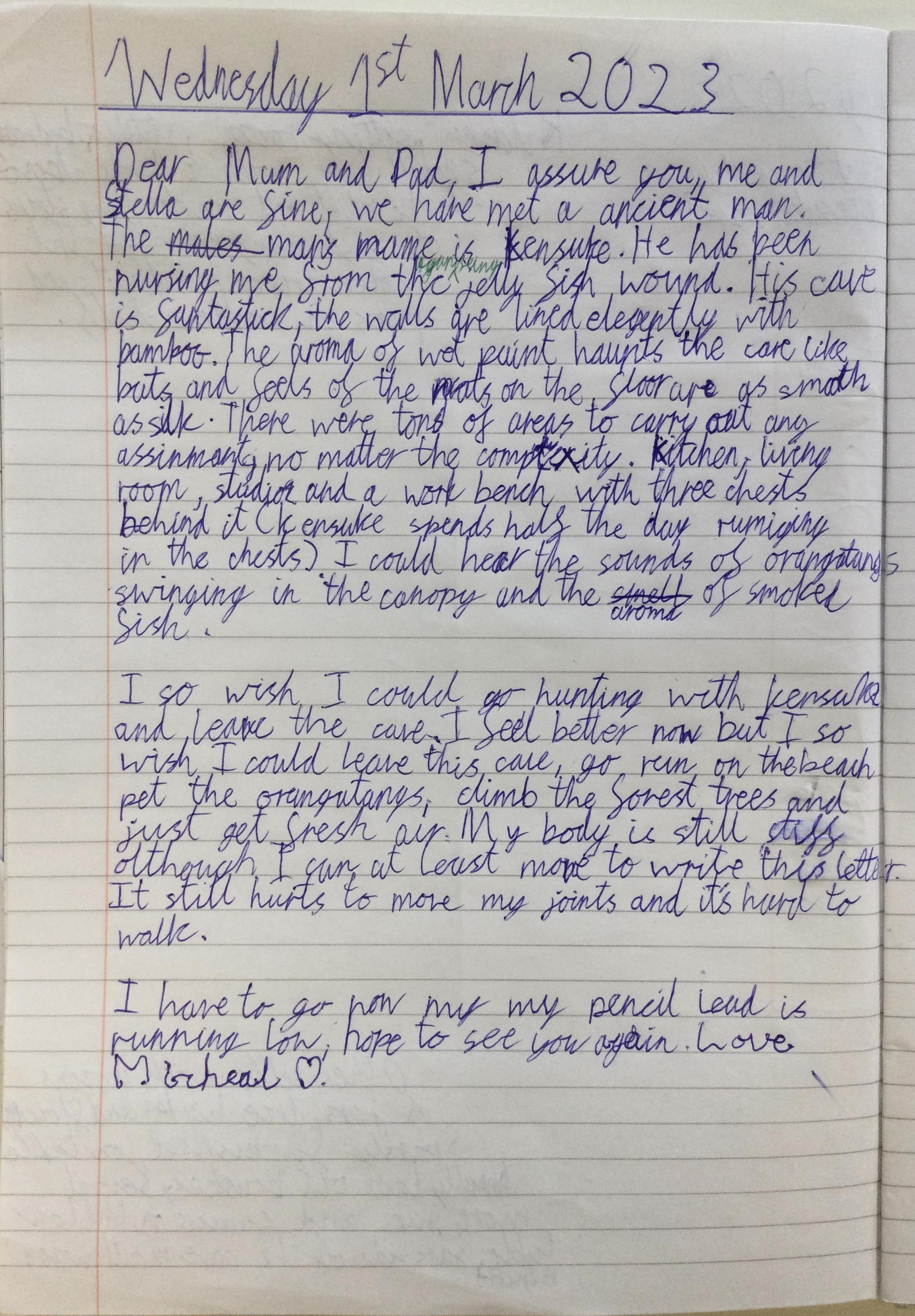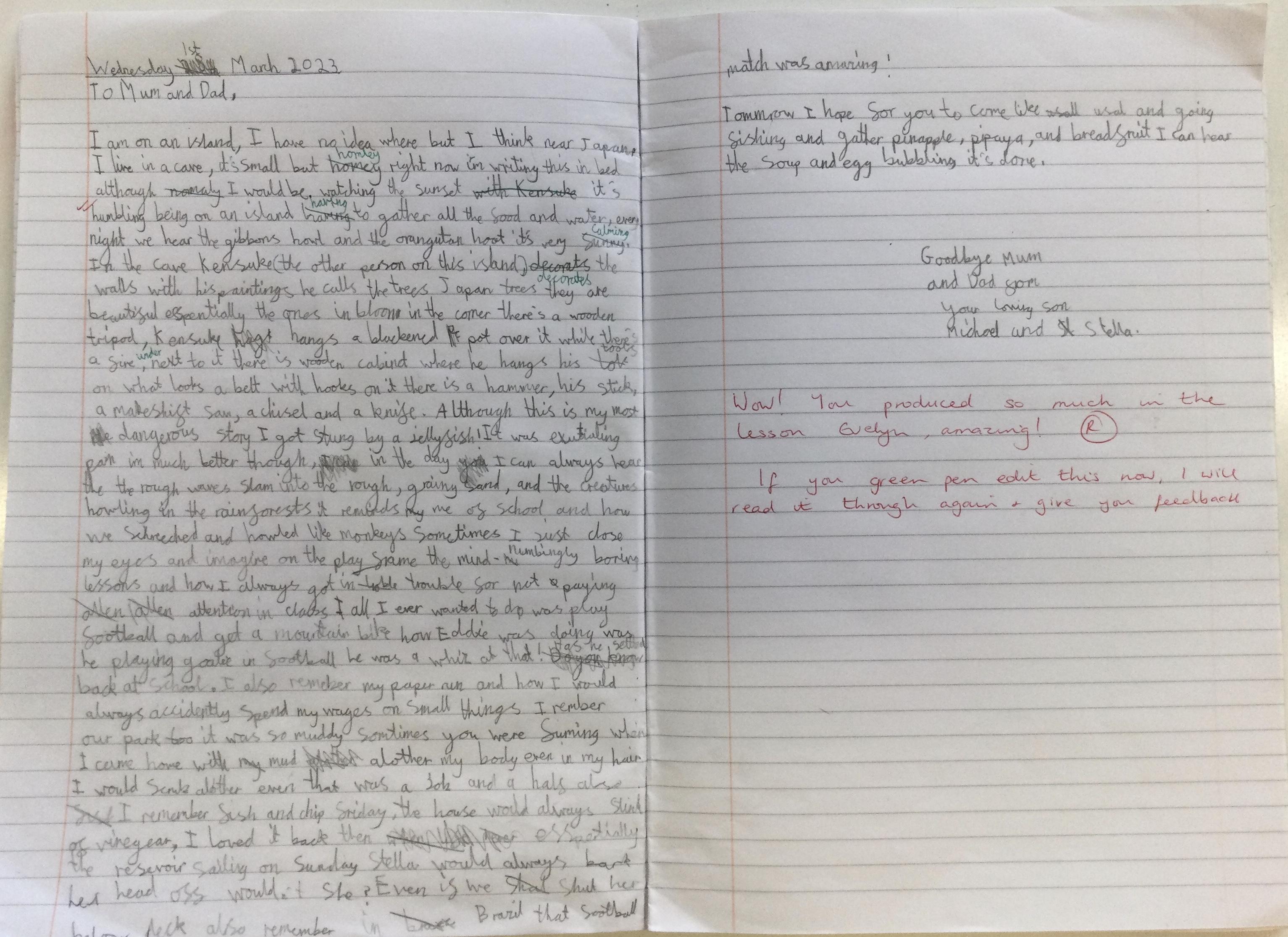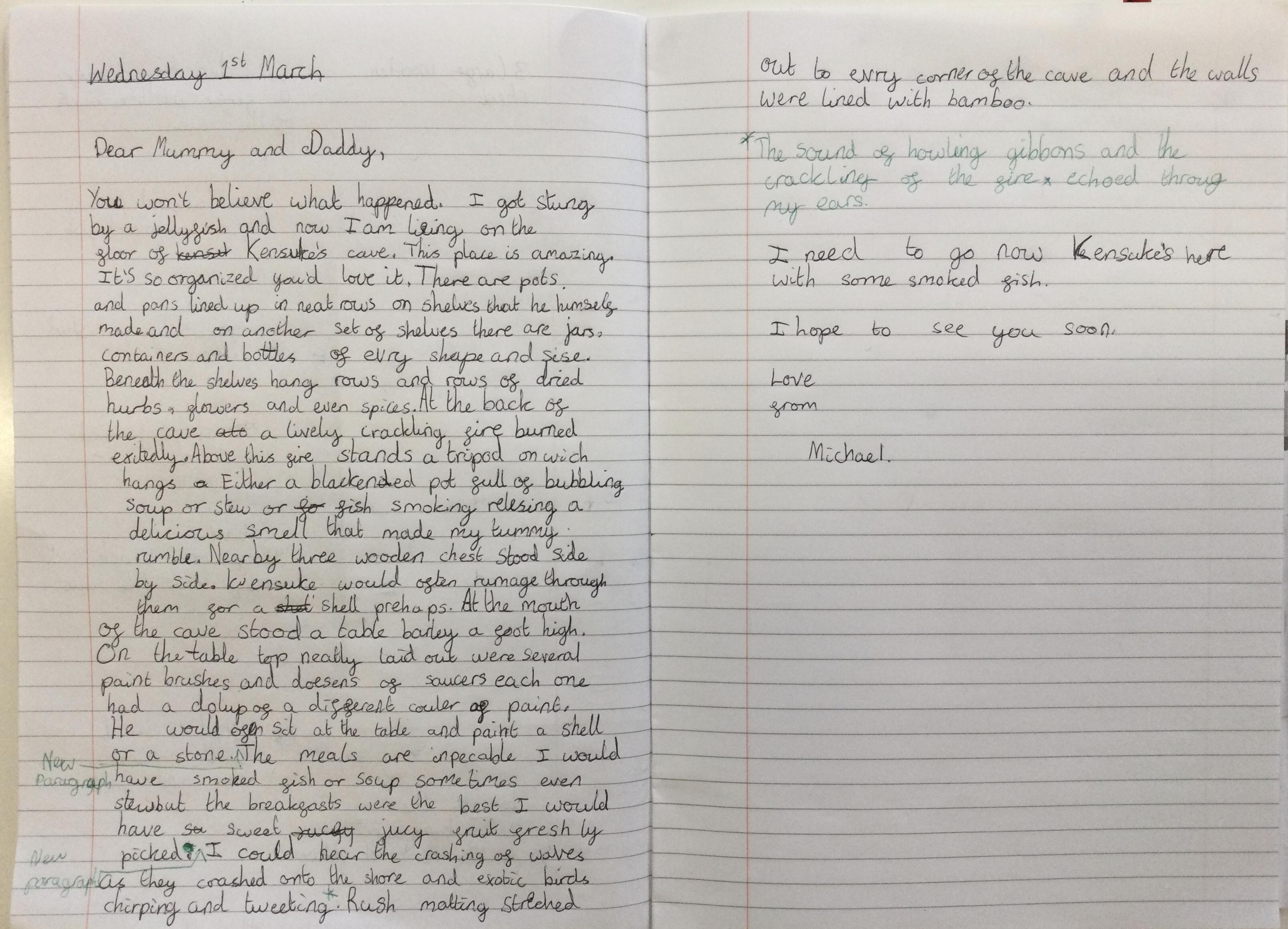 This half term we have been reading Kensuke's Kingdom by Michael Morpurgo. We have completed a range of writing tasks related to the novel, including a description of Kensuke's cave, a letter home from Michael to his parents and writing to create suspense. Please see below for some examples of the children's work.