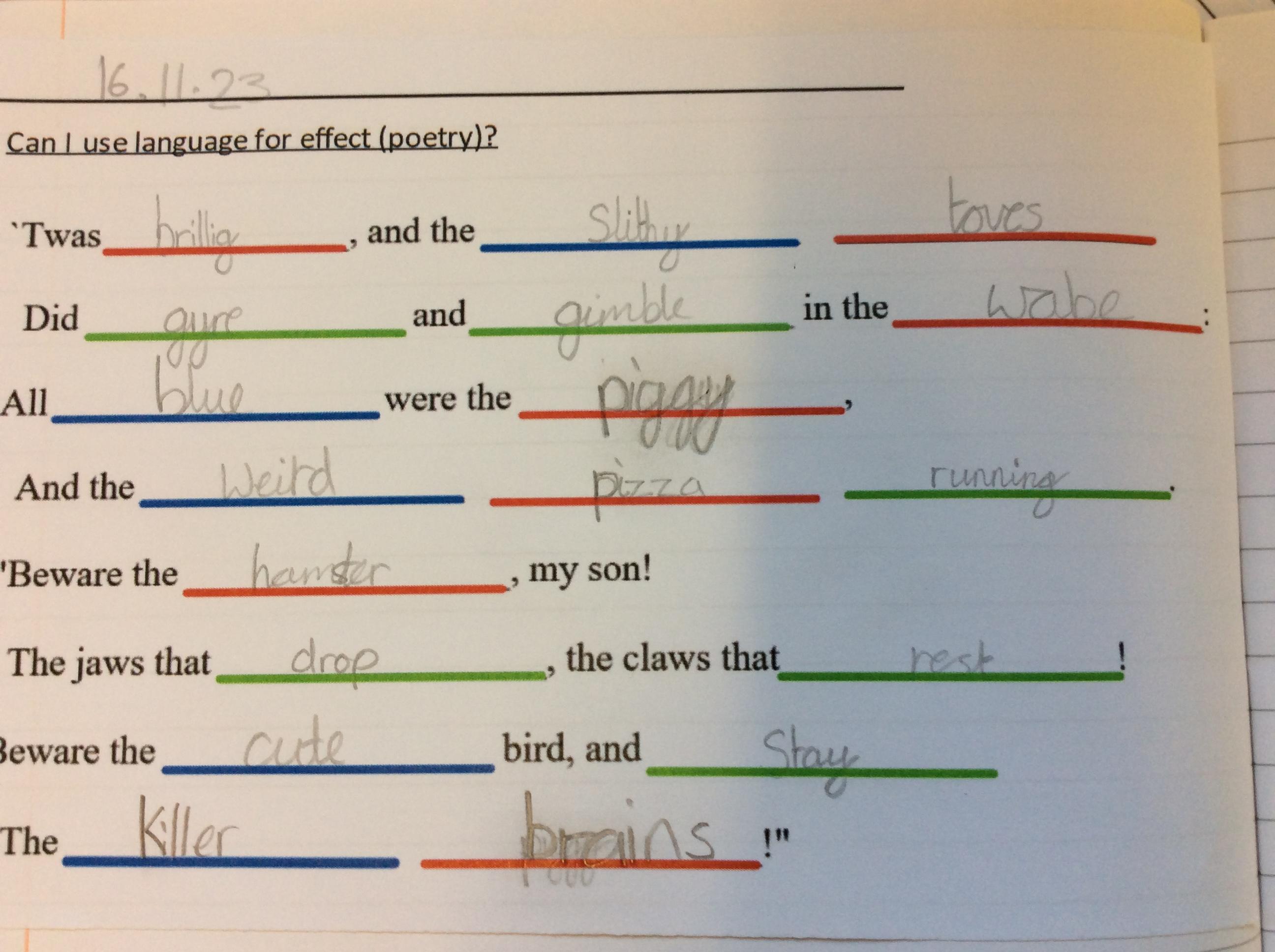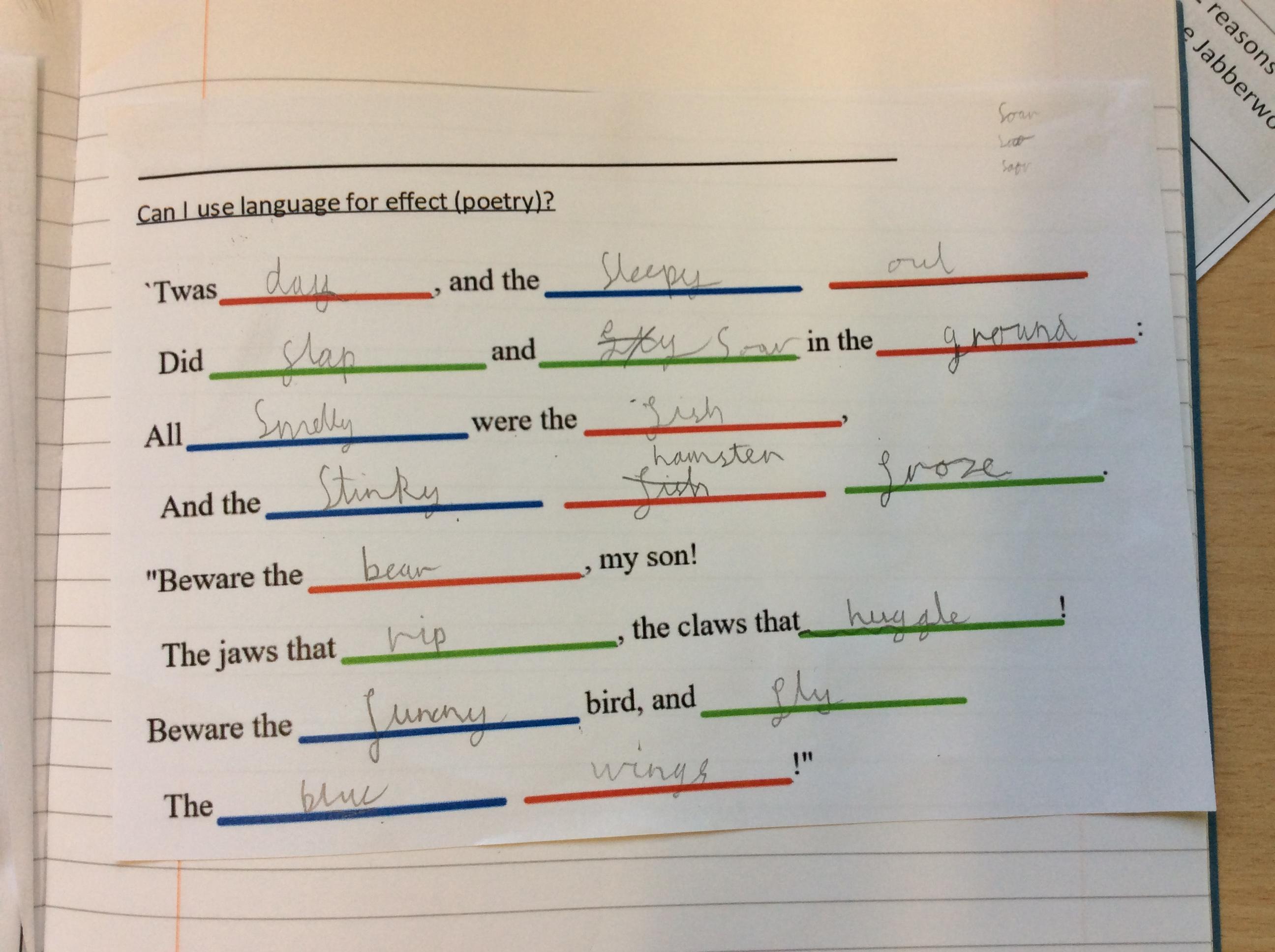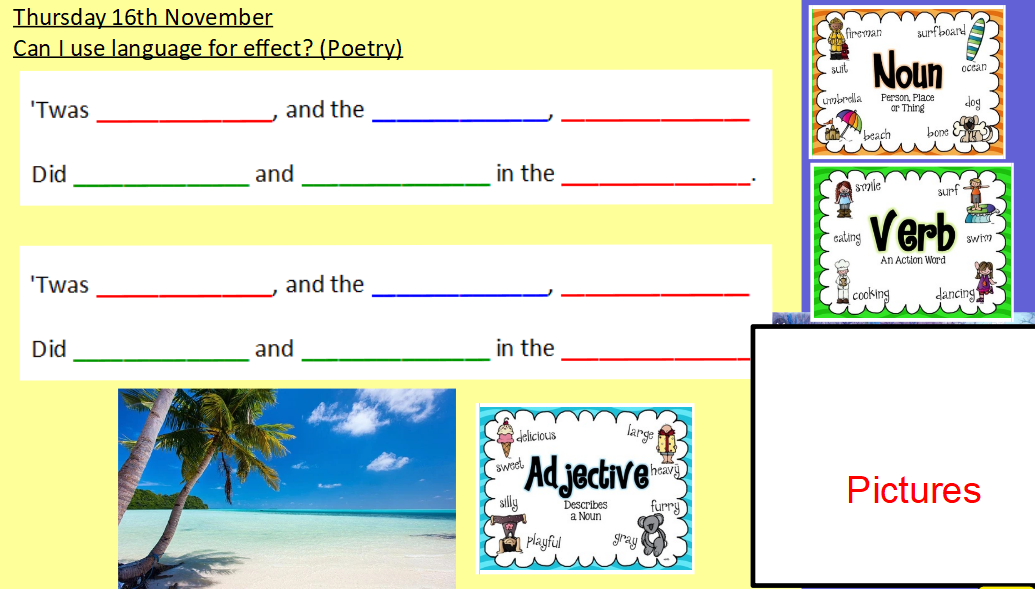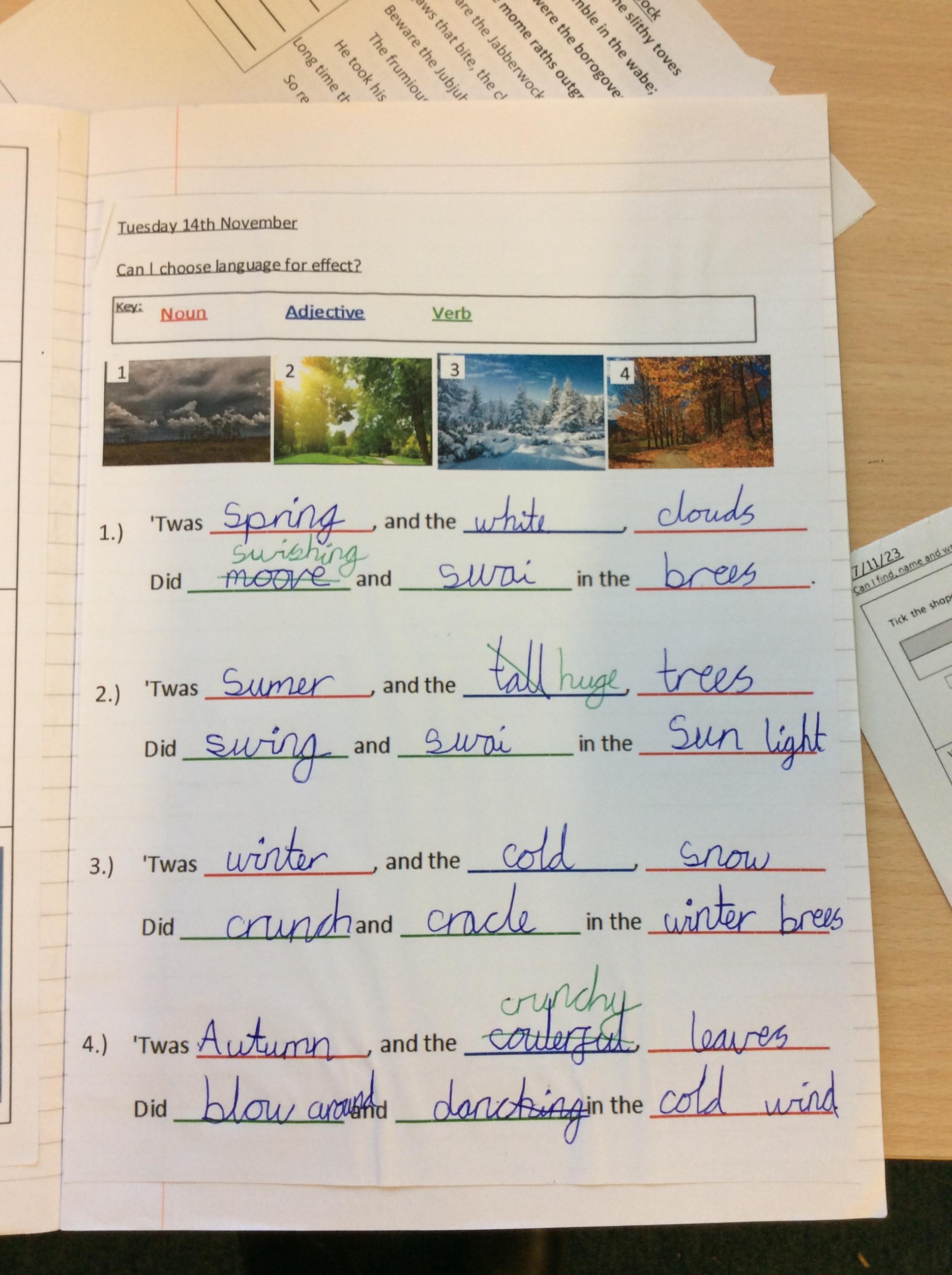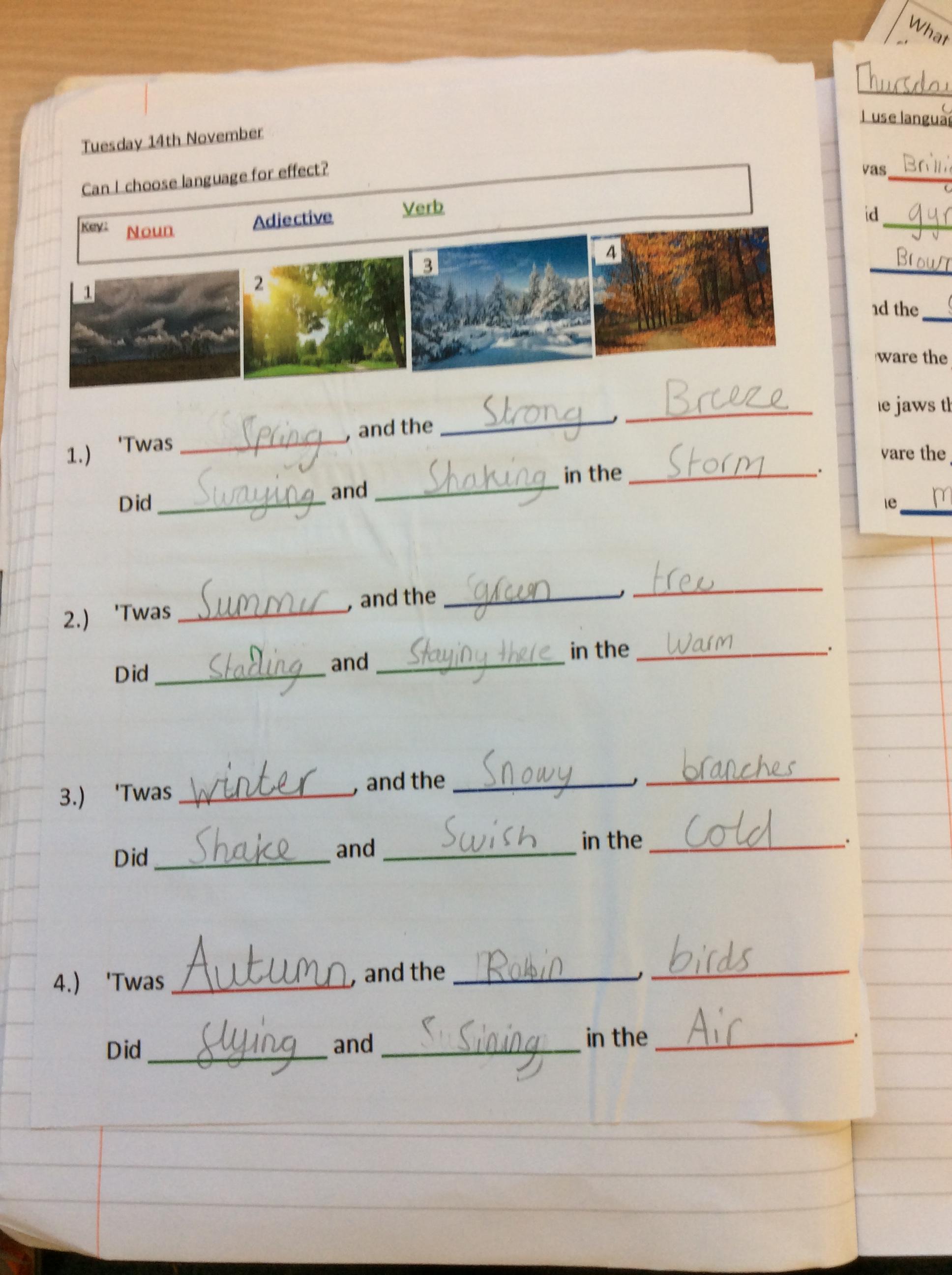 We recalled our work on word classes. nouns, verbs and adjectives. We tried to use the colour codes to add words to the stem sentences to describe different pictures. We had to play around with the words to until we were happy with what we had written.