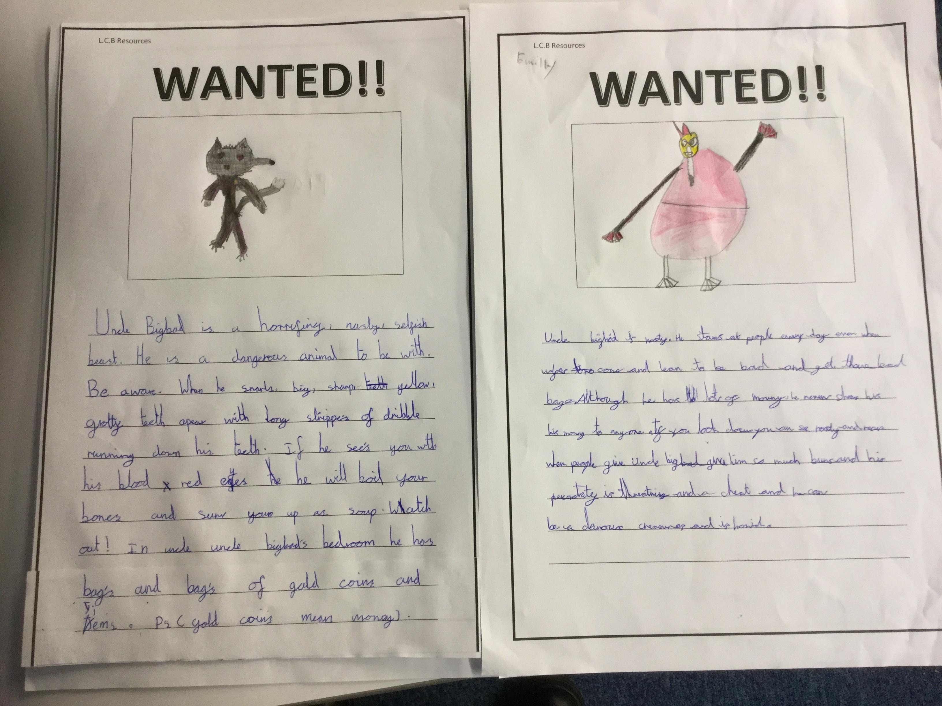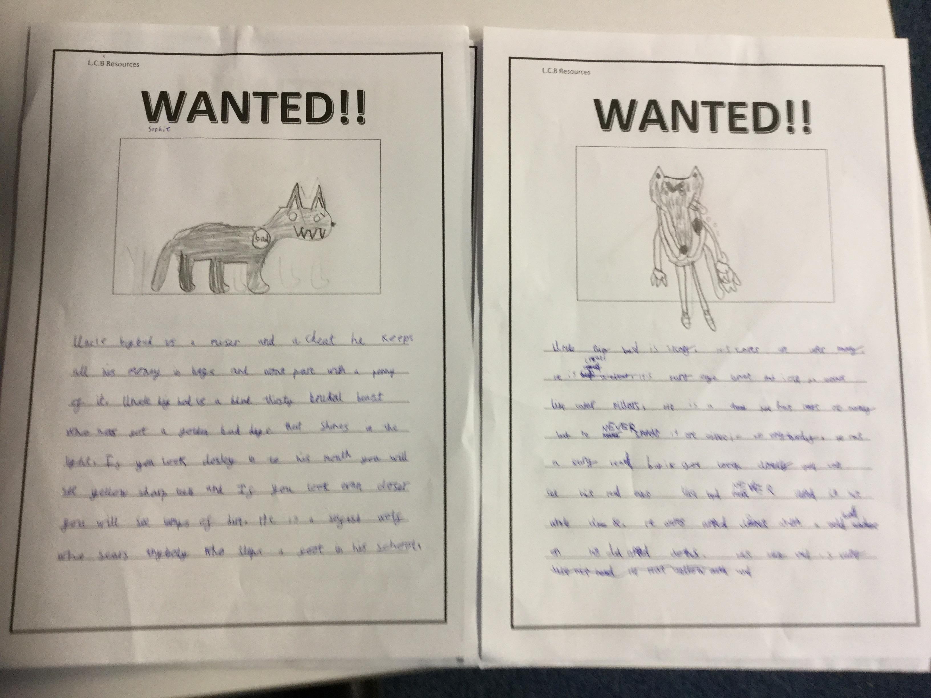 Following on from describing a setting, we have been focusing on how to describe a character, using their personality and appearance. We have used the character of Uncle Bigbad from our text (Little Wolf’s Book of Badness). Using the text, we drew a picture of Uncle Bigbad and then wrote a description of him. We used all of this to create a wanted poster for him.