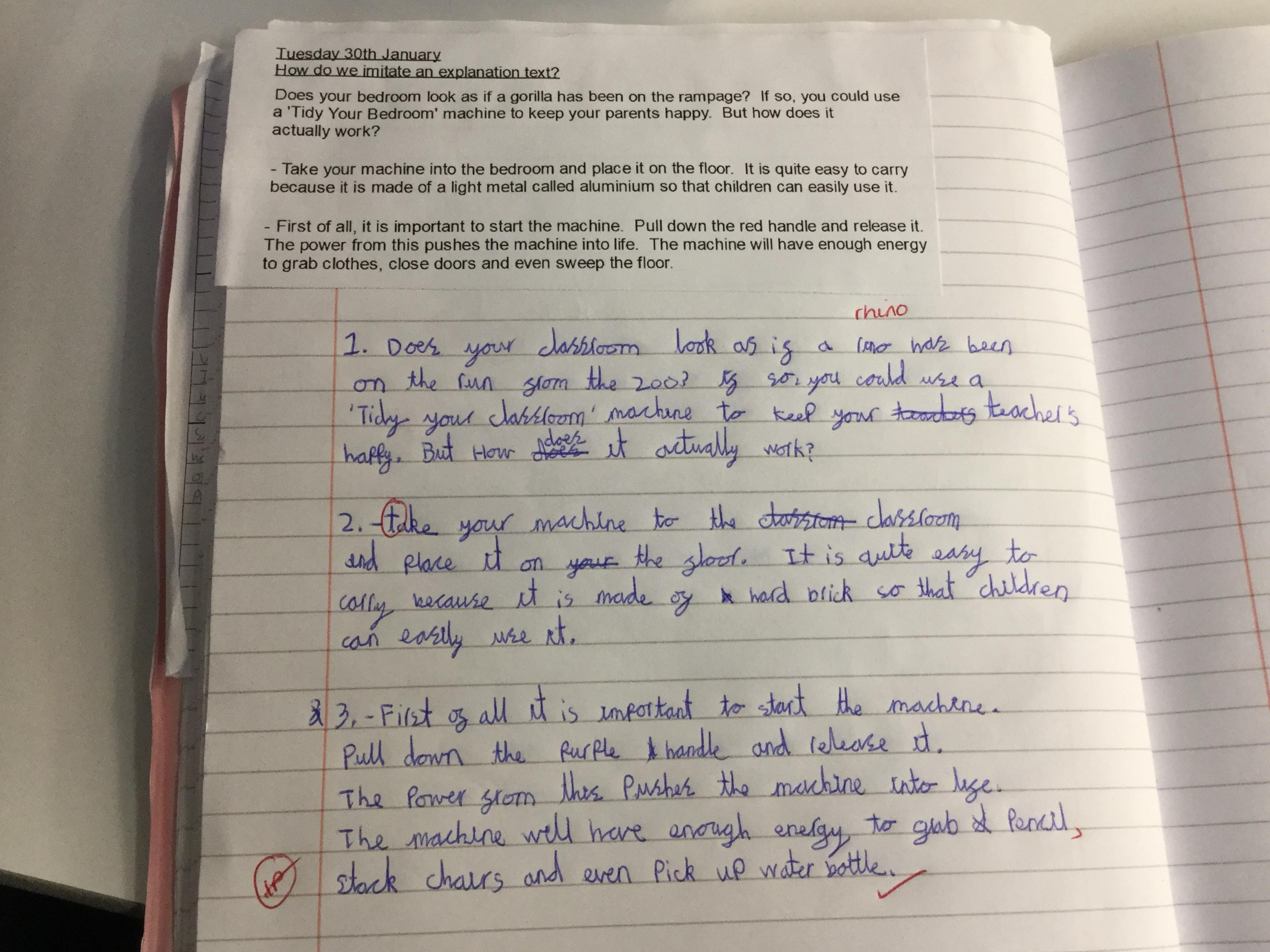 We read an explanation of ‘The Bedroom Tidying Machine’ and then imitated some of the sentences to start to write an explanation of how ‘The Classroom Tidying machine’ might work.