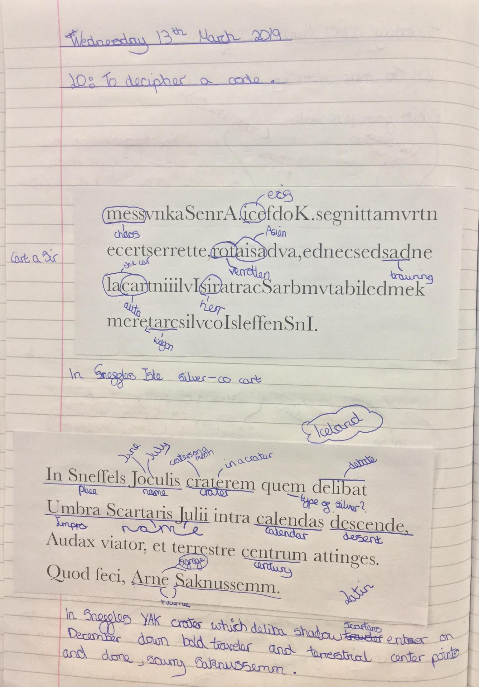 After HG Wells we were given a mysterious code from Journey to the Centre of the Earth by Jules Verne. It read - InSneffllsIokuliskrateremkemdelibatumbraSkartarisIuliiintrakalendasdeskende,audasuiator,teterrestrekentrumattinges.Kodfeki.ArneSaknussemm
