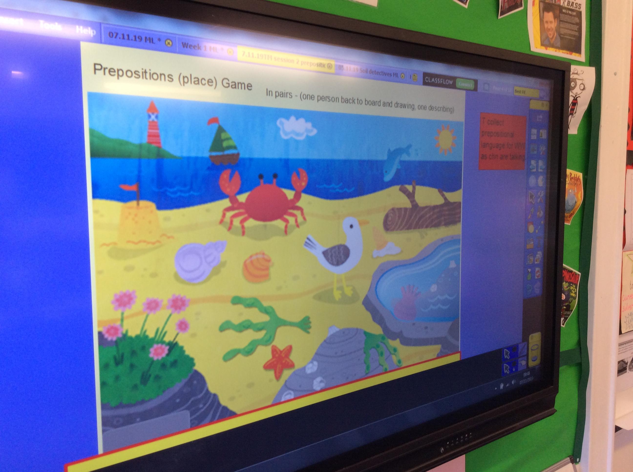 To help improve our writing, we learnt about prepositions of place. We tried to describe a picture for our partner to draw using prepositions.