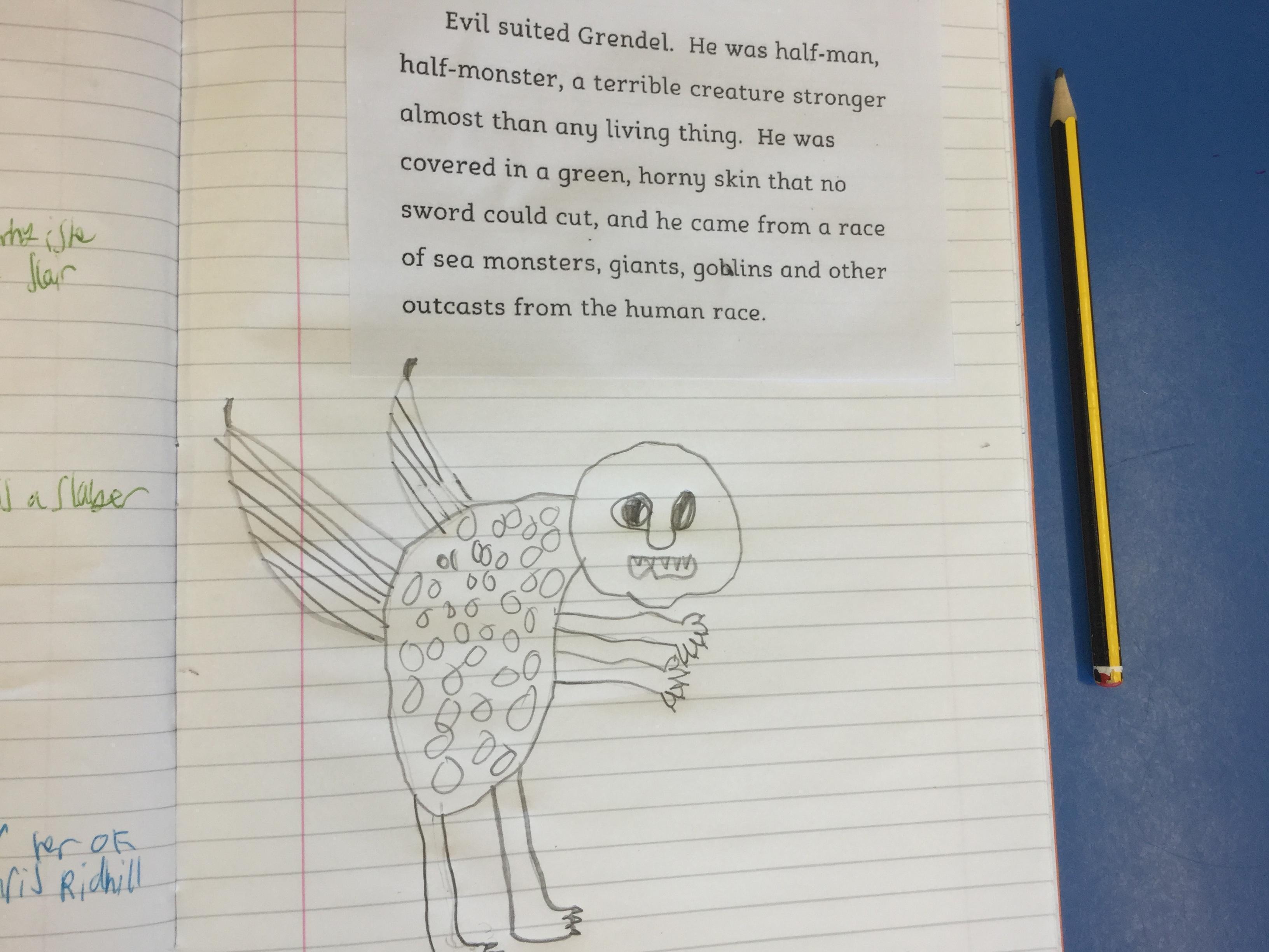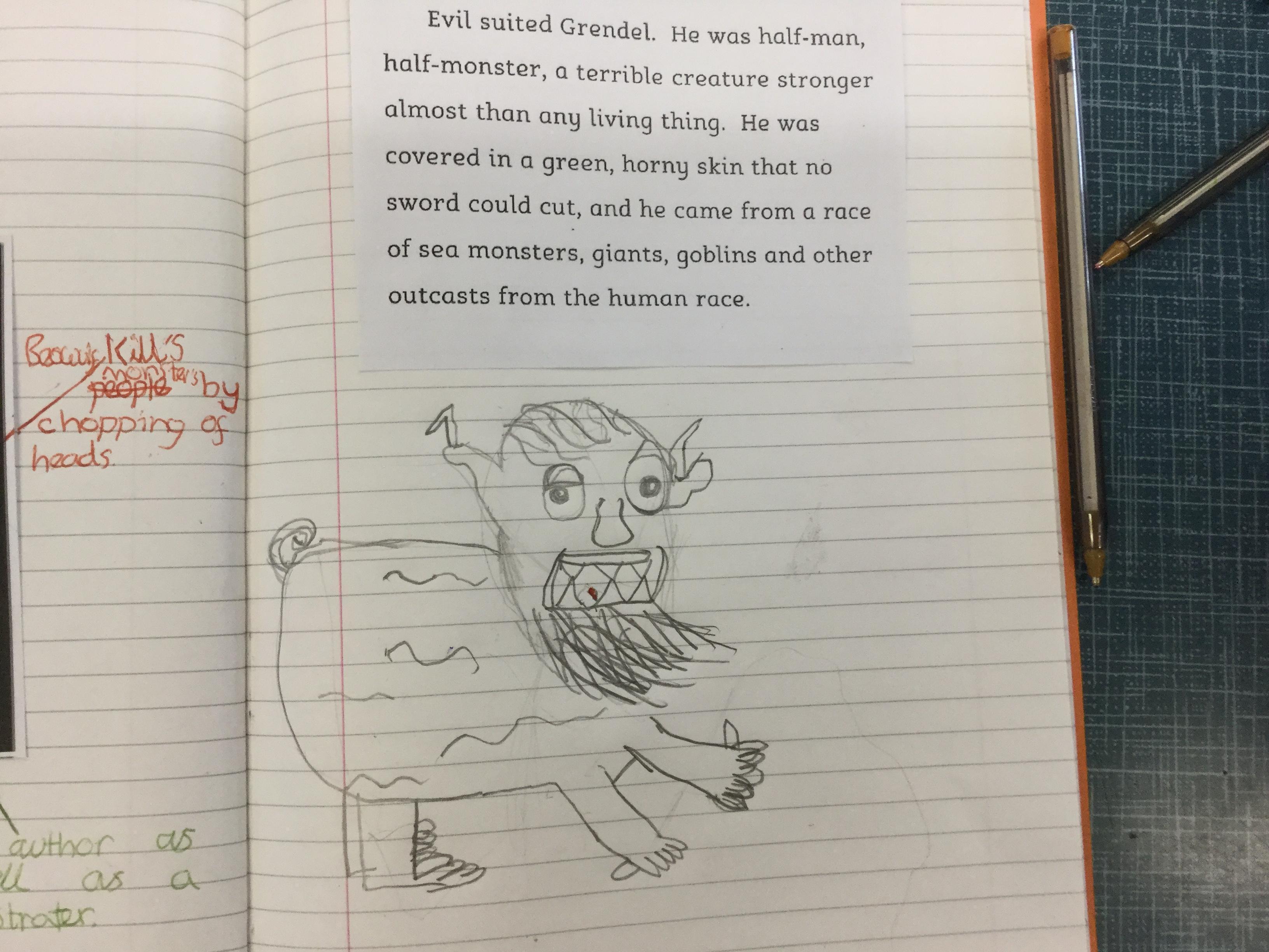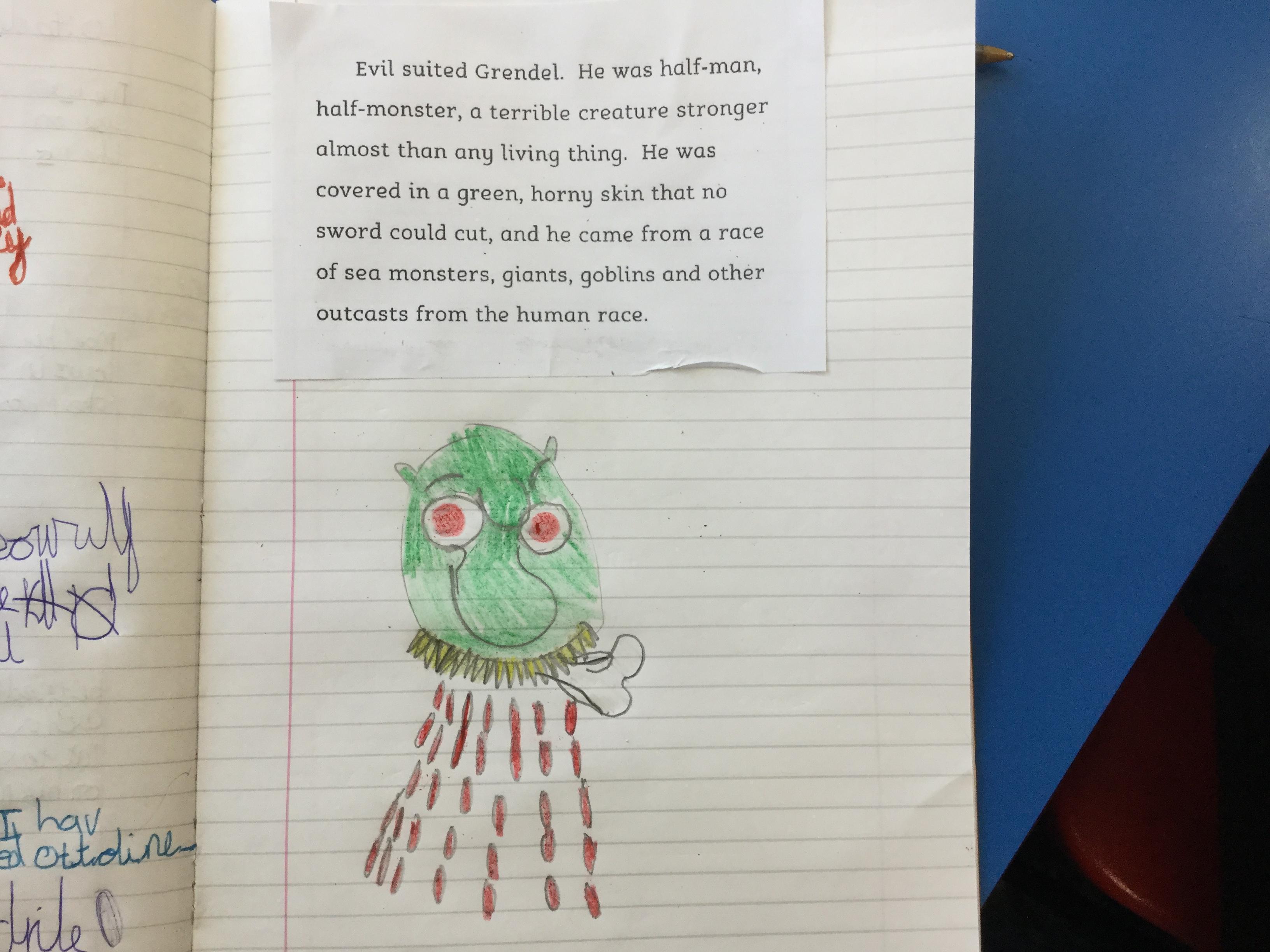 We used the description of the monster, Grendel, to draw what we think the creature looks like using all the information we could find from the text.