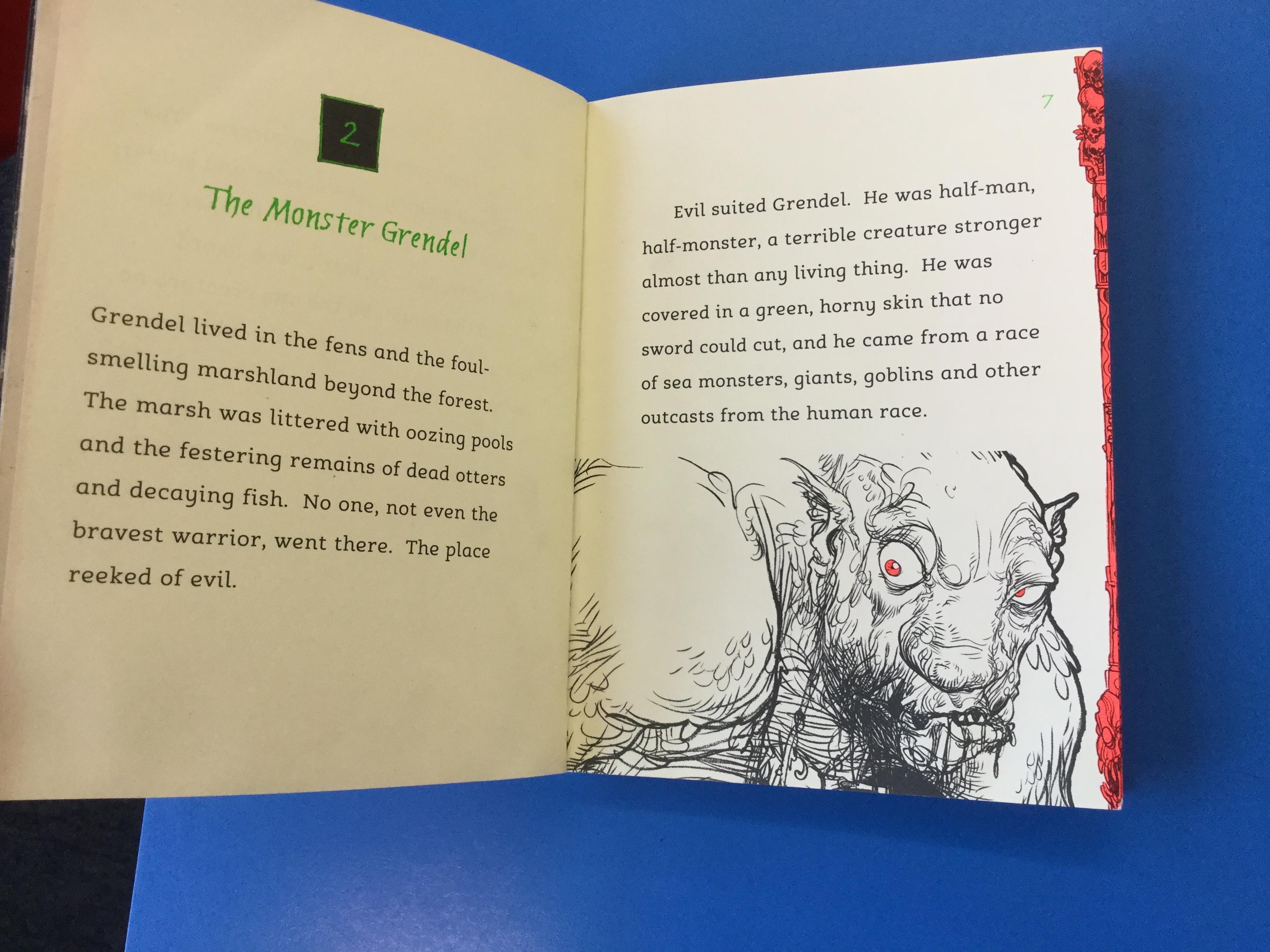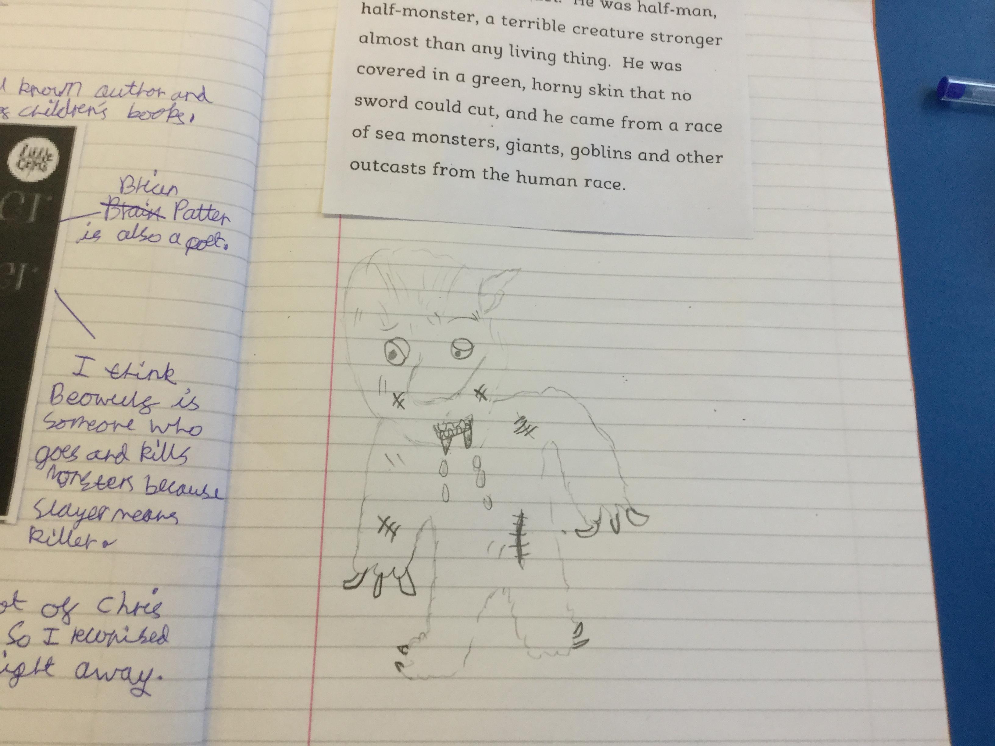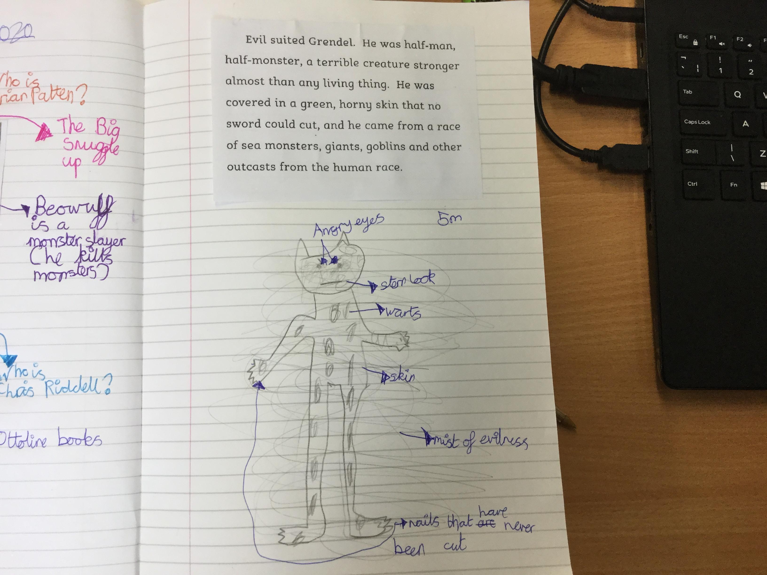 We used the description of the monster, Grendel, to draw what we think the creature looks like using all the information we could find from the text.