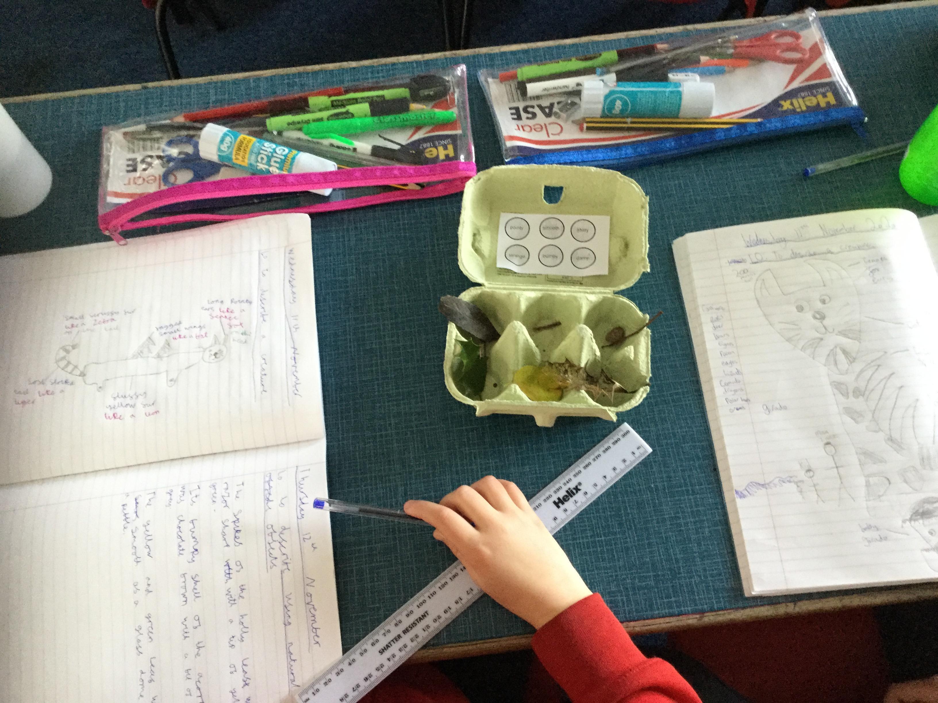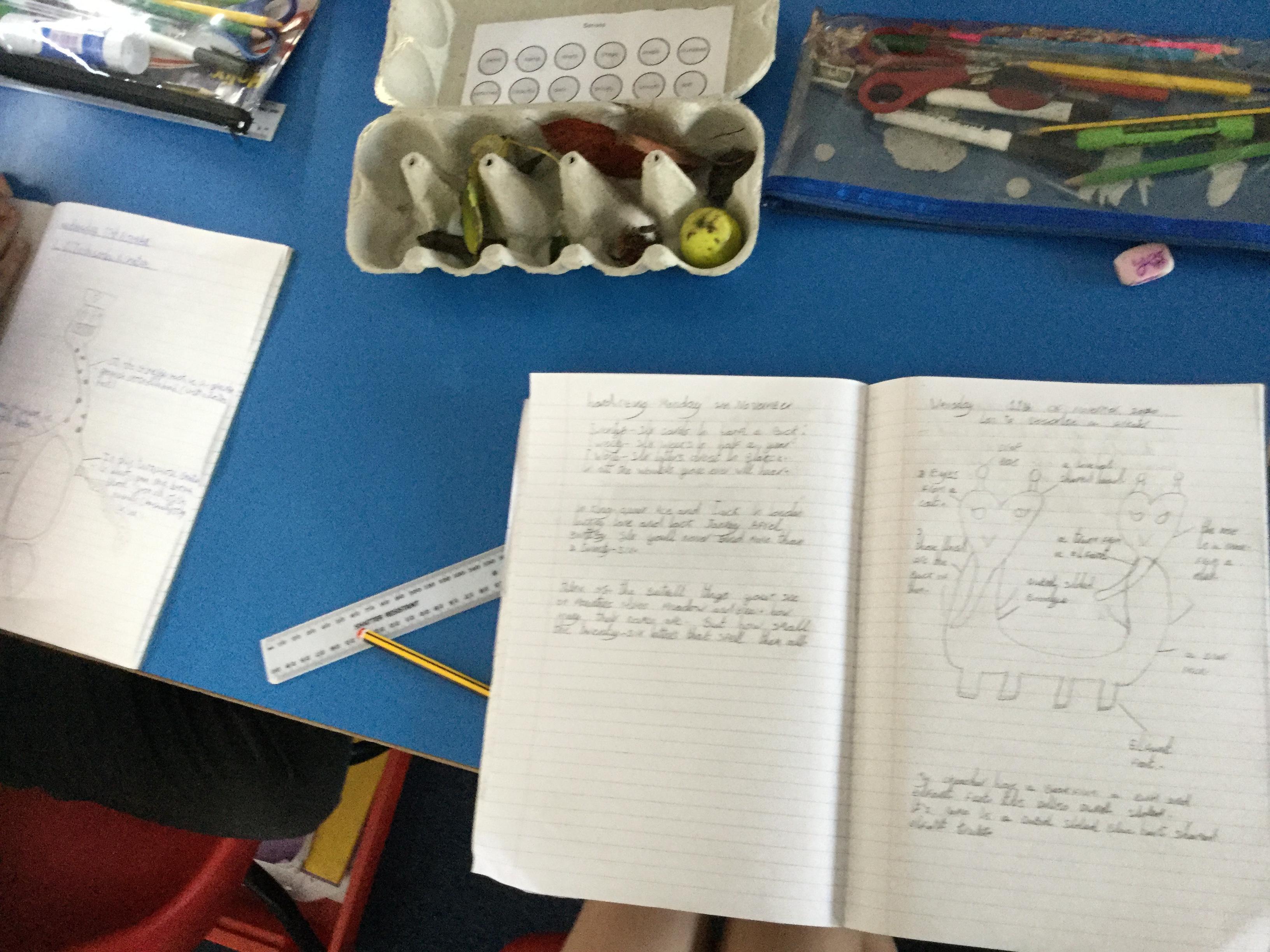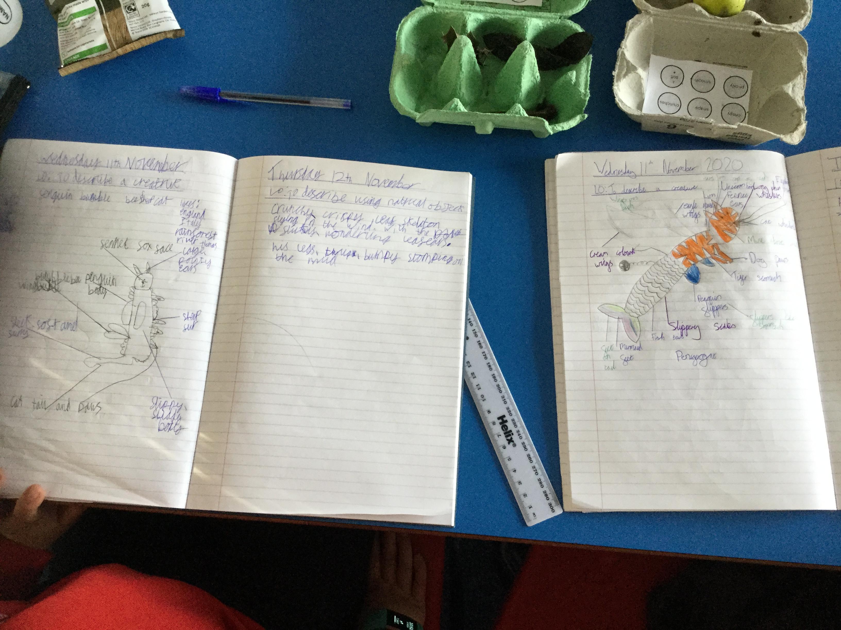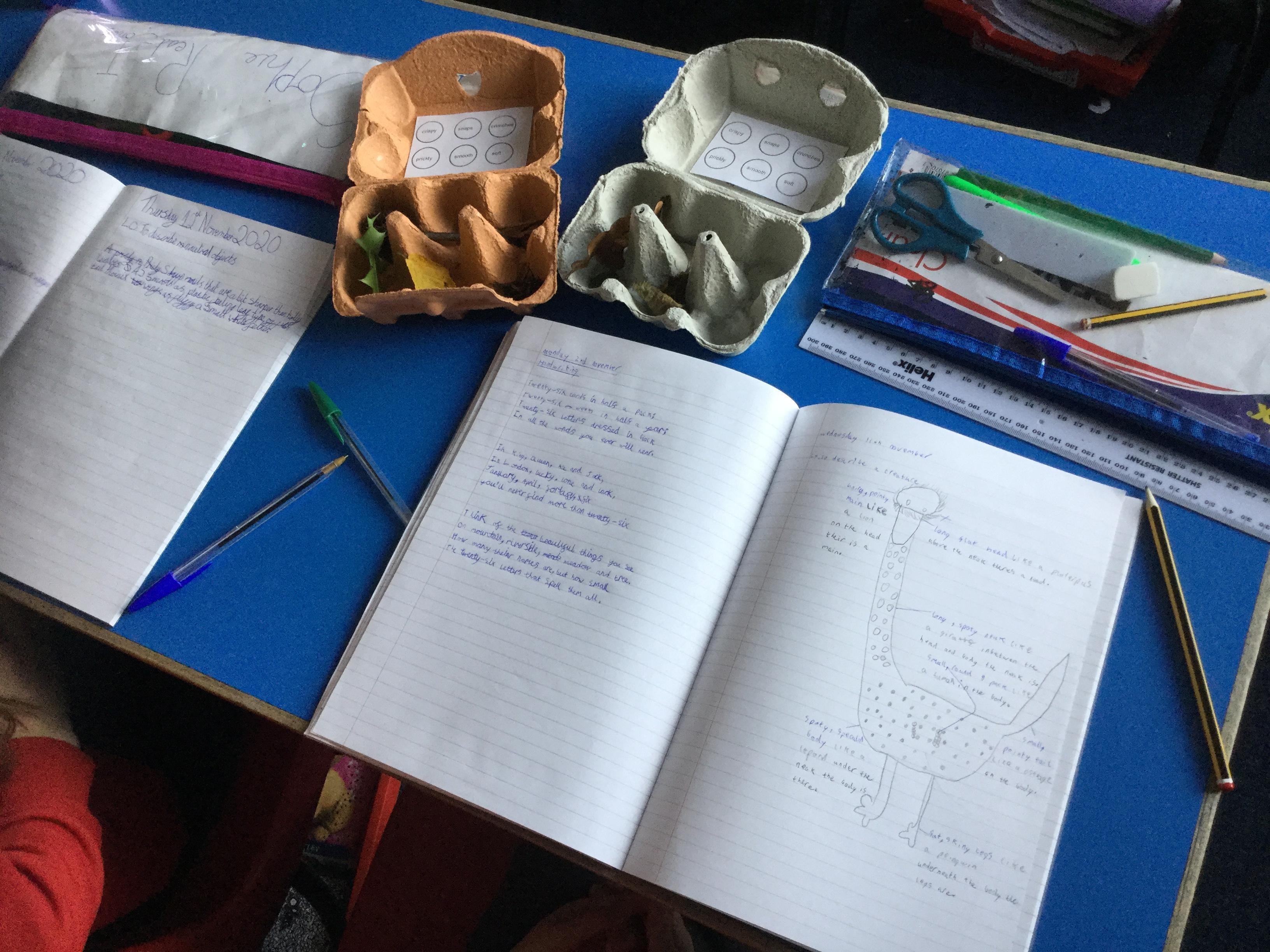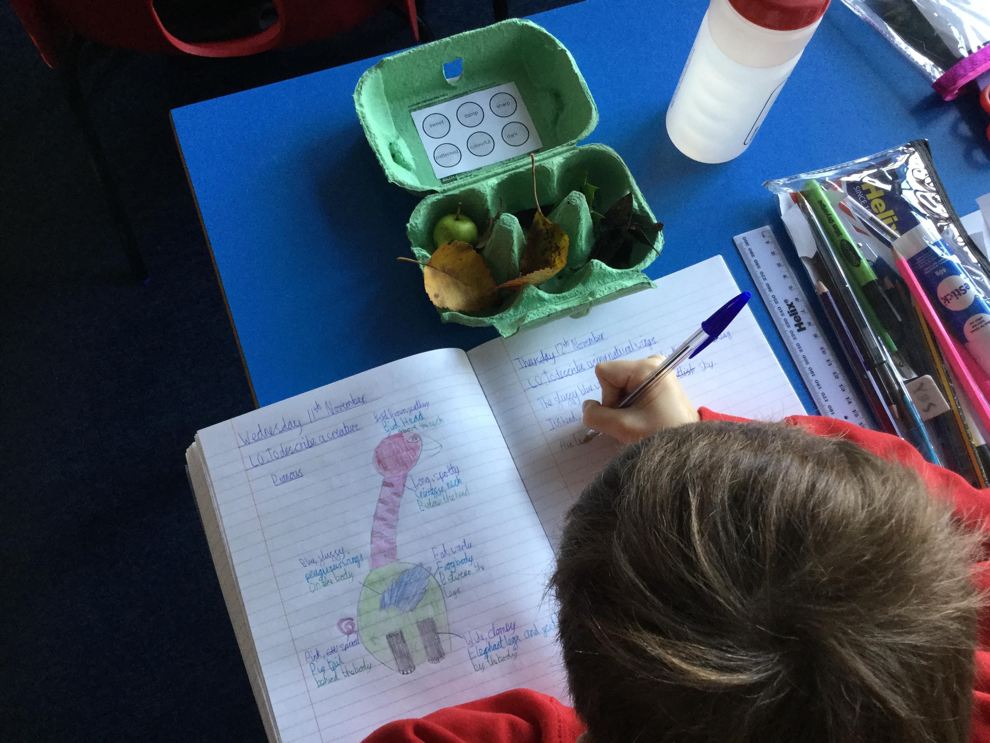 Our text this half term is  The Waterhorse.  This week the children have drawn their own imaginary creature.  They then used the egg boxes to go into the copse and collect objects which matched the words they had inside the egg box.  Then they used the word bank they created to describe their creature
