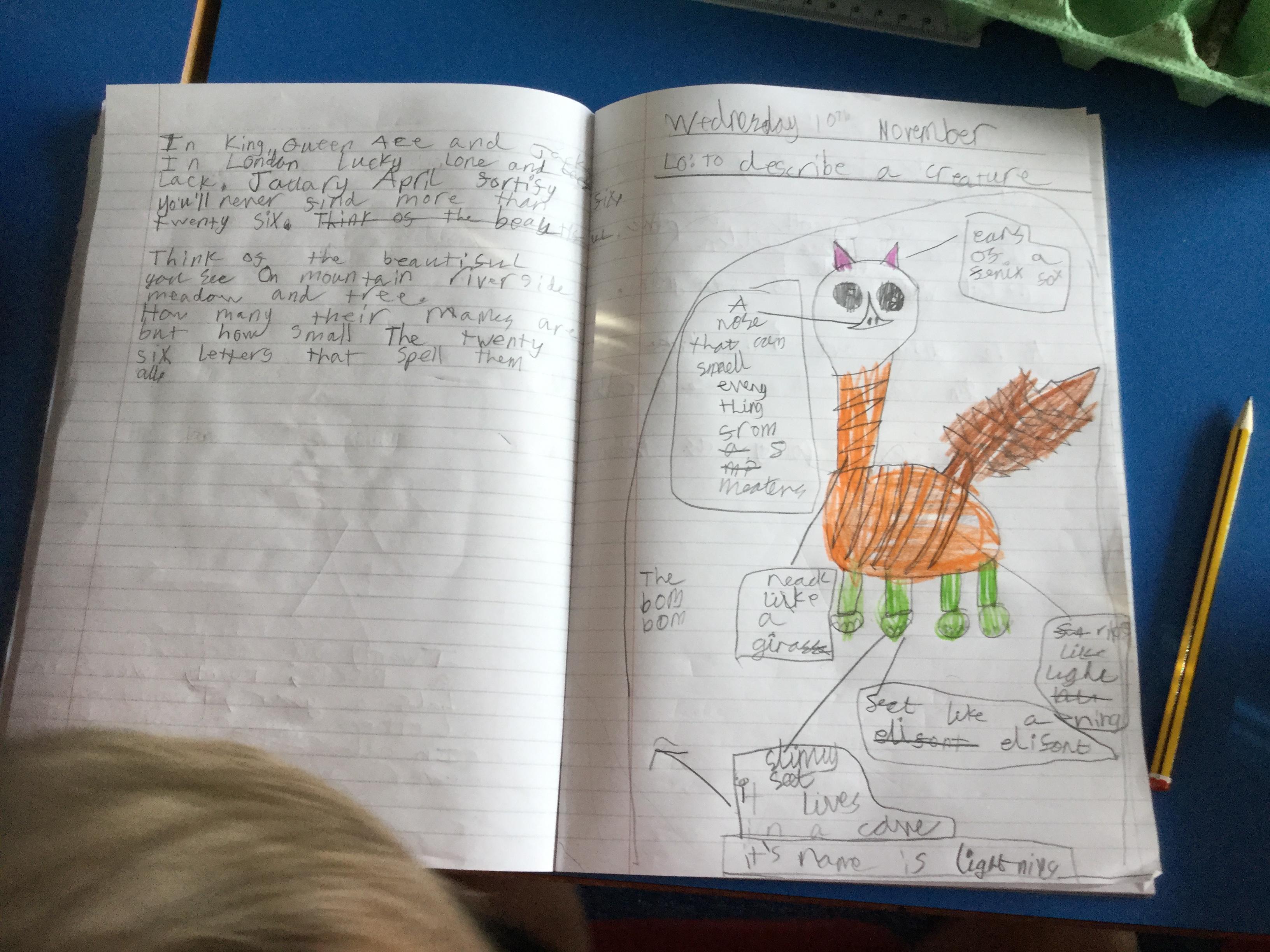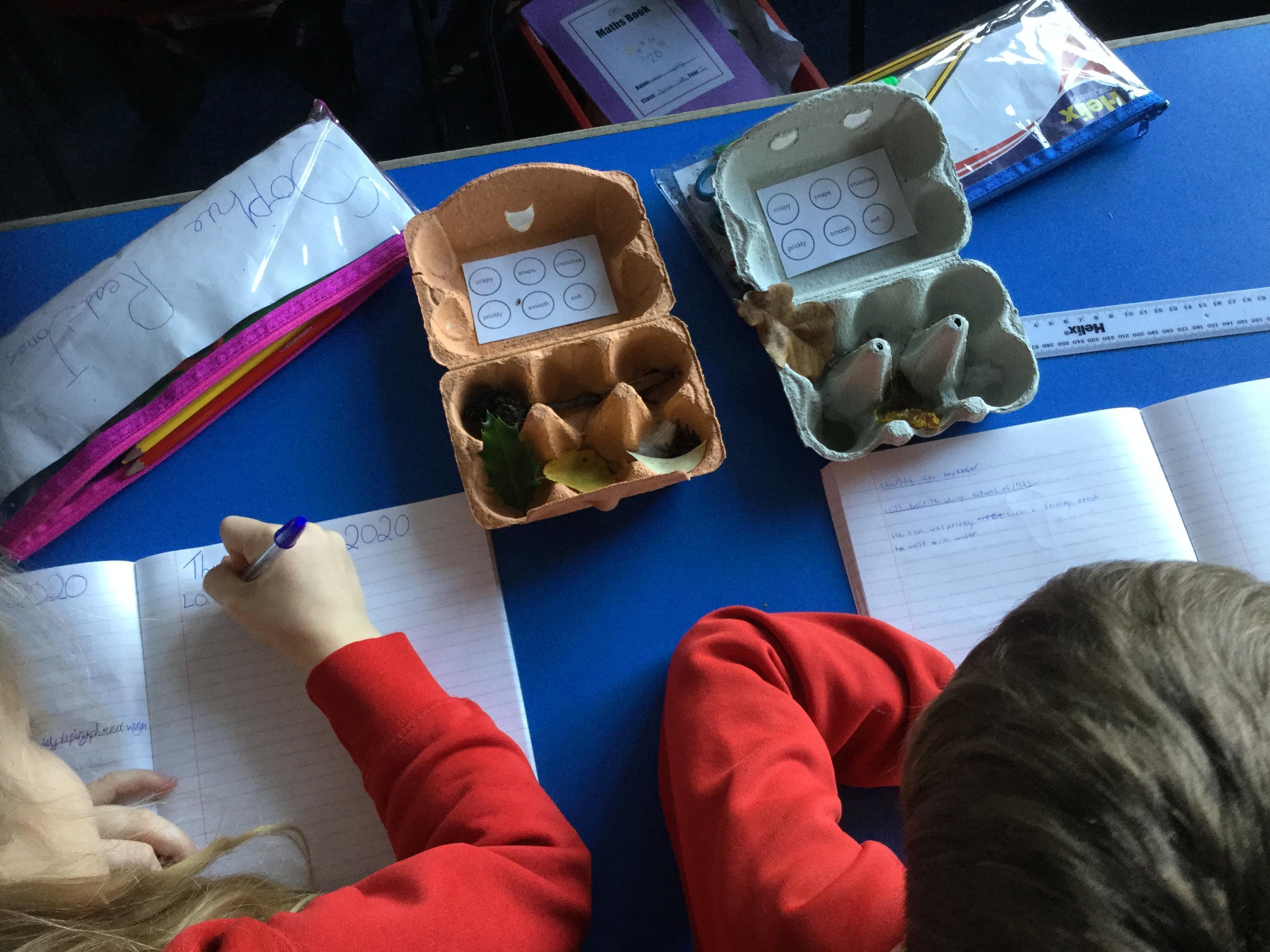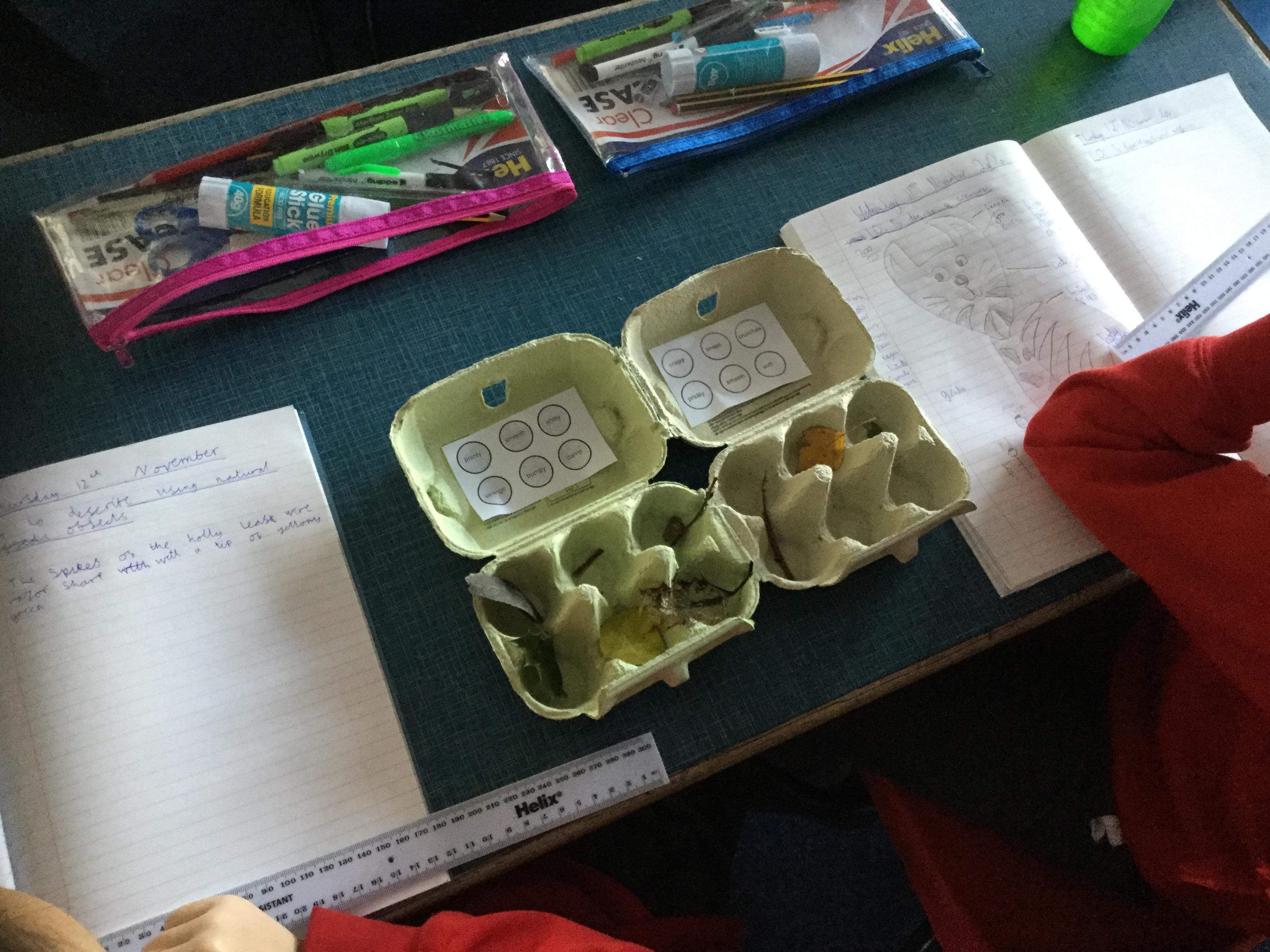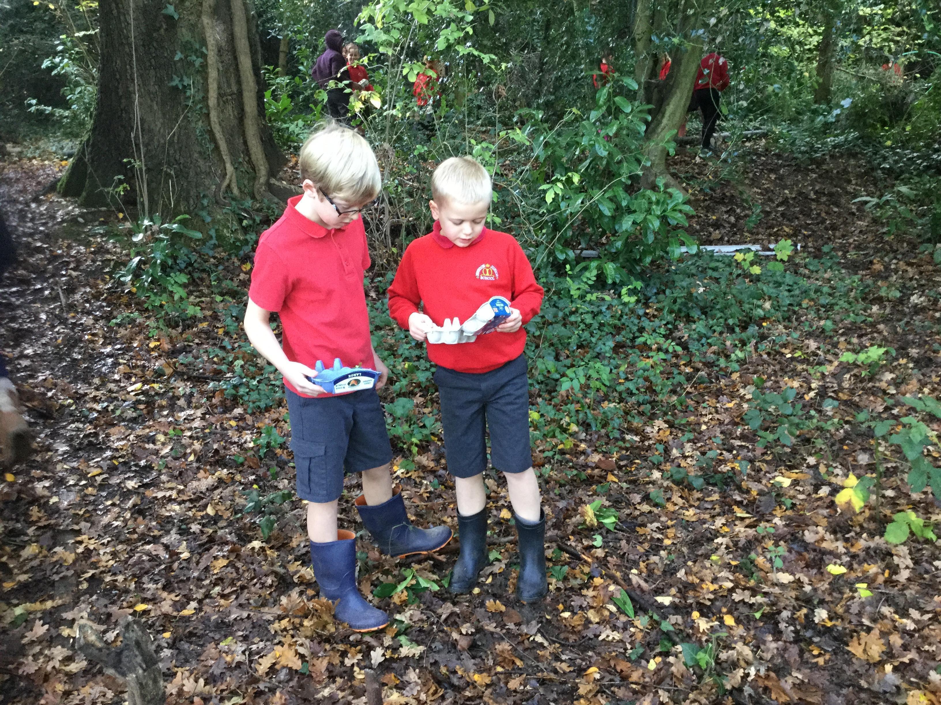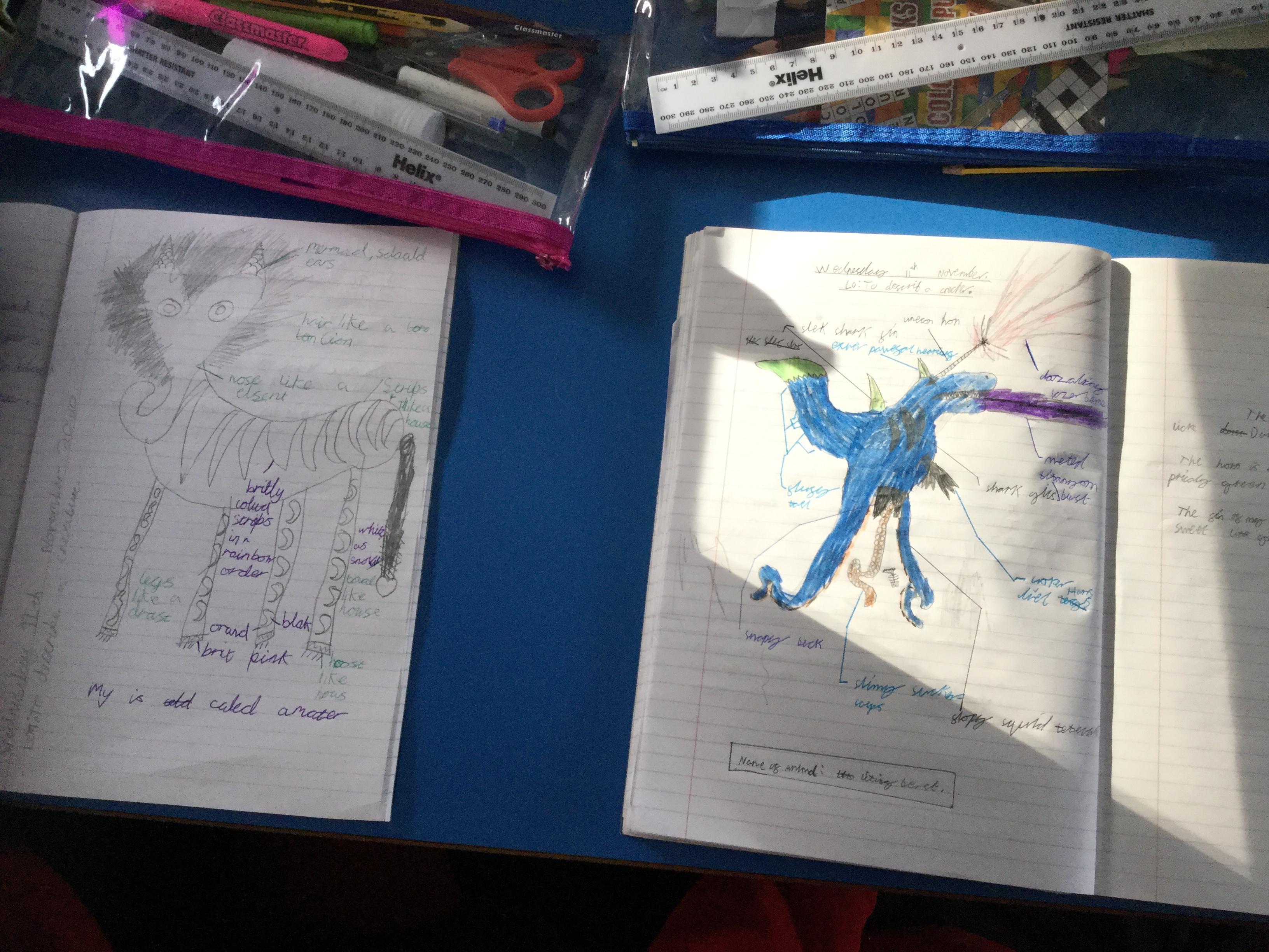 Our text this half term is  The Waterhorse.  This week the children have drawn their own imaginary creature.  They then used the egg boxes to go into the copse and collect objects which matched the words they had inside the egg box.  Then they used the word bank they created to describe their creature