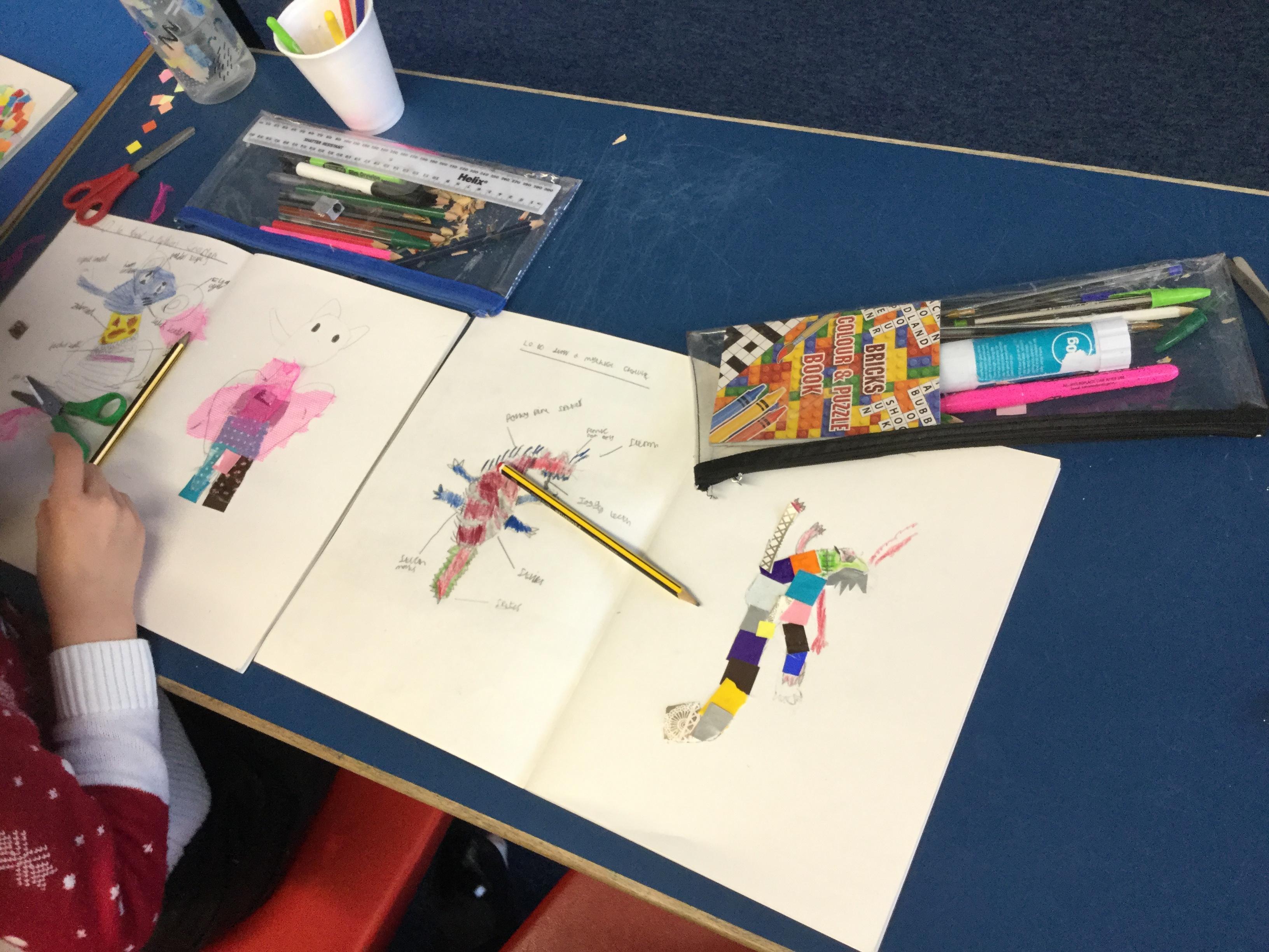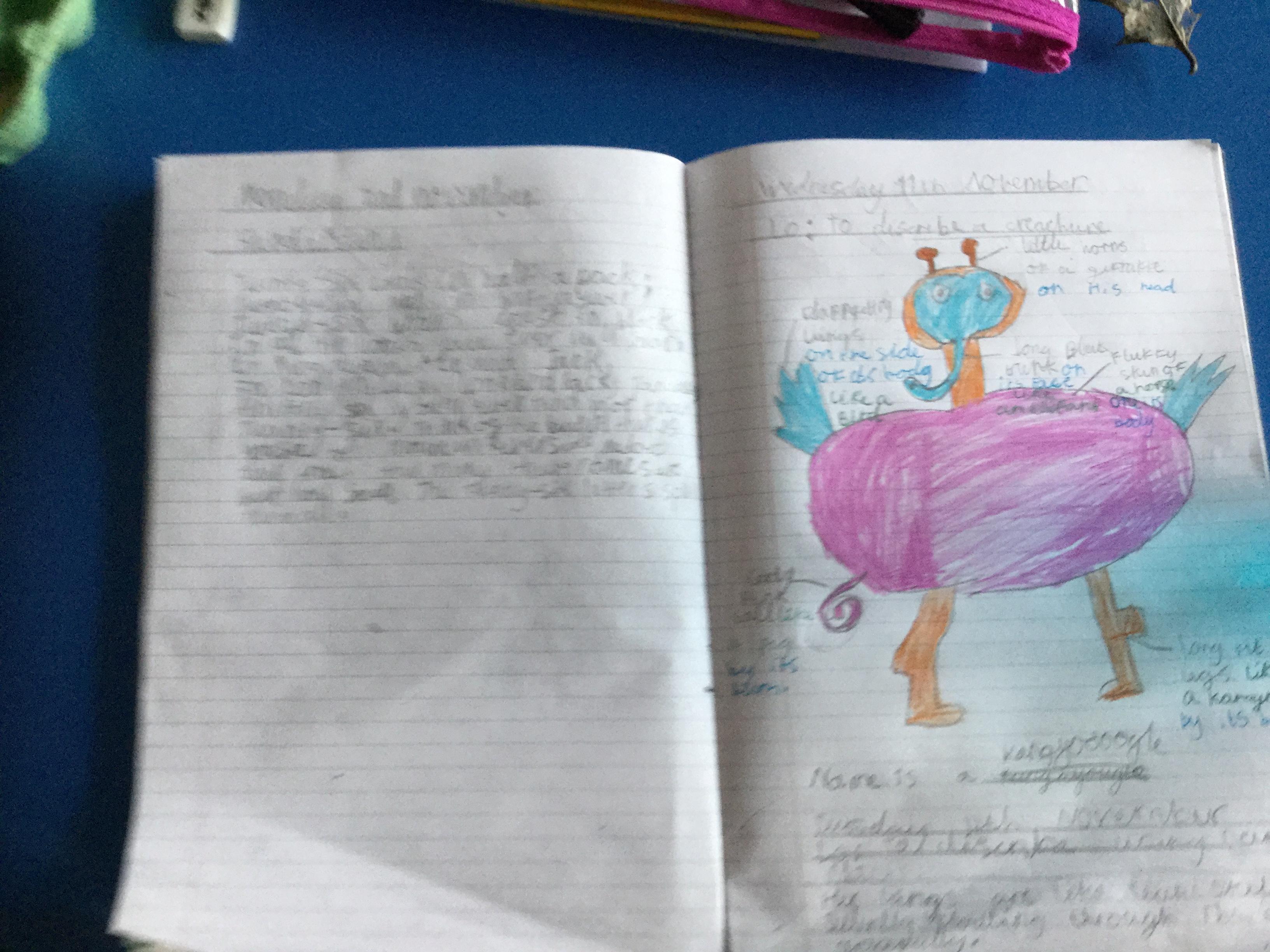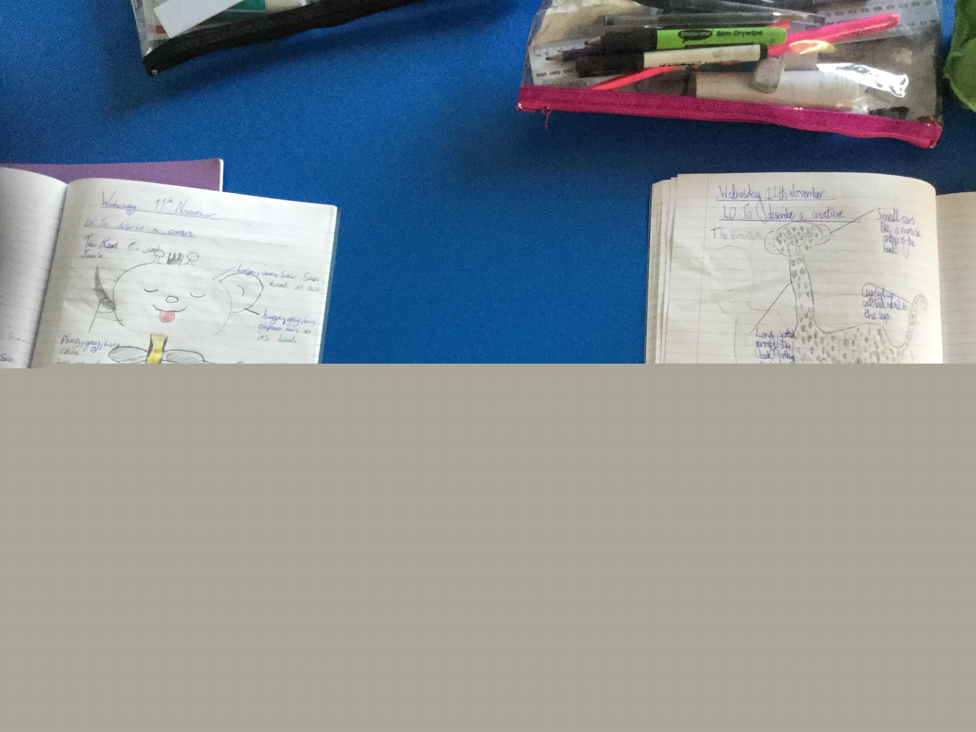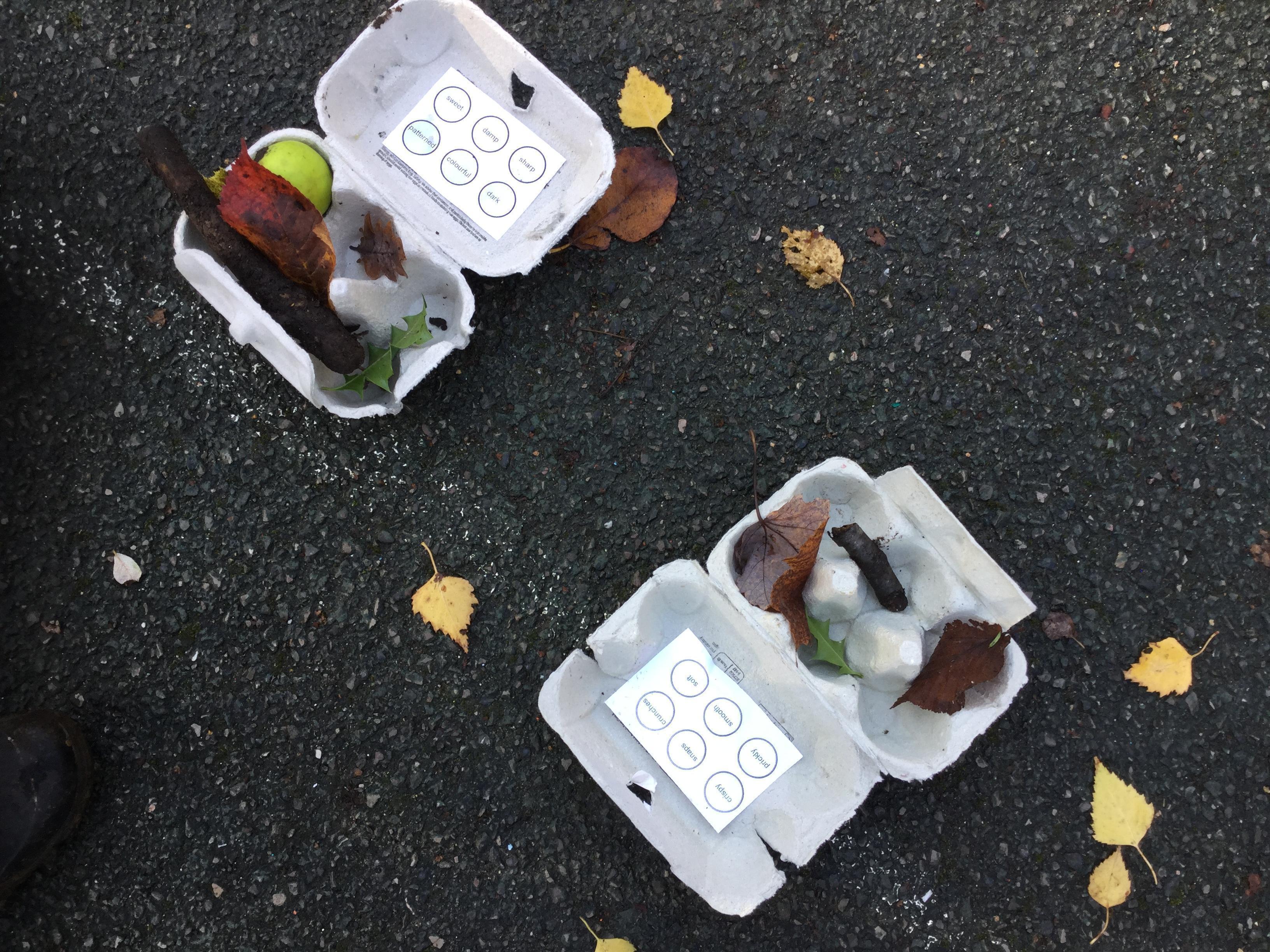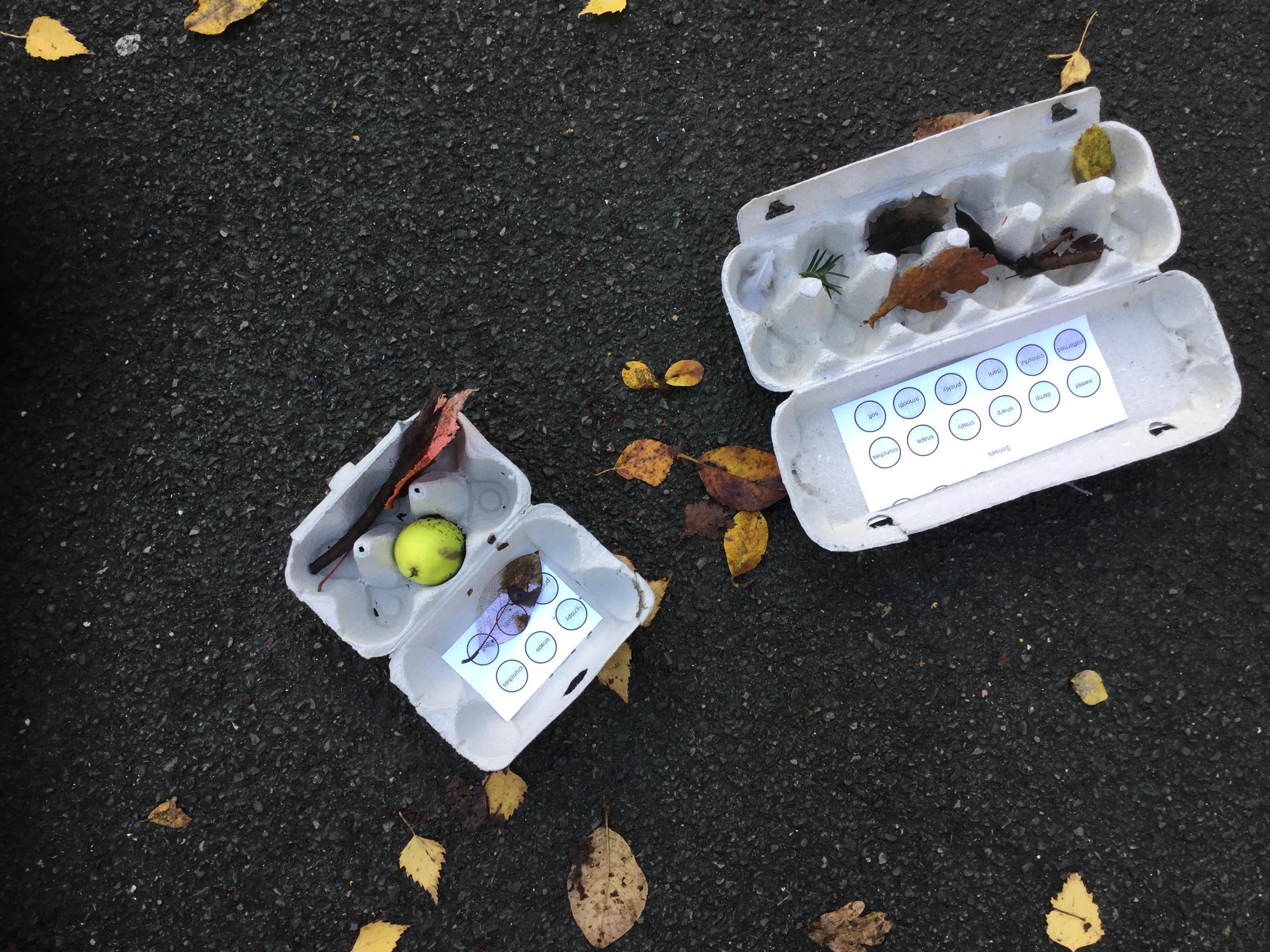 Our text this half term is  The Waterhorse.  This week the children have drawn their own imaginary creature.  They then used the egg boxes to go into the copse and collect objects which matched the words they had inside the egg box.  Then they used the word bank they created to describe their creature