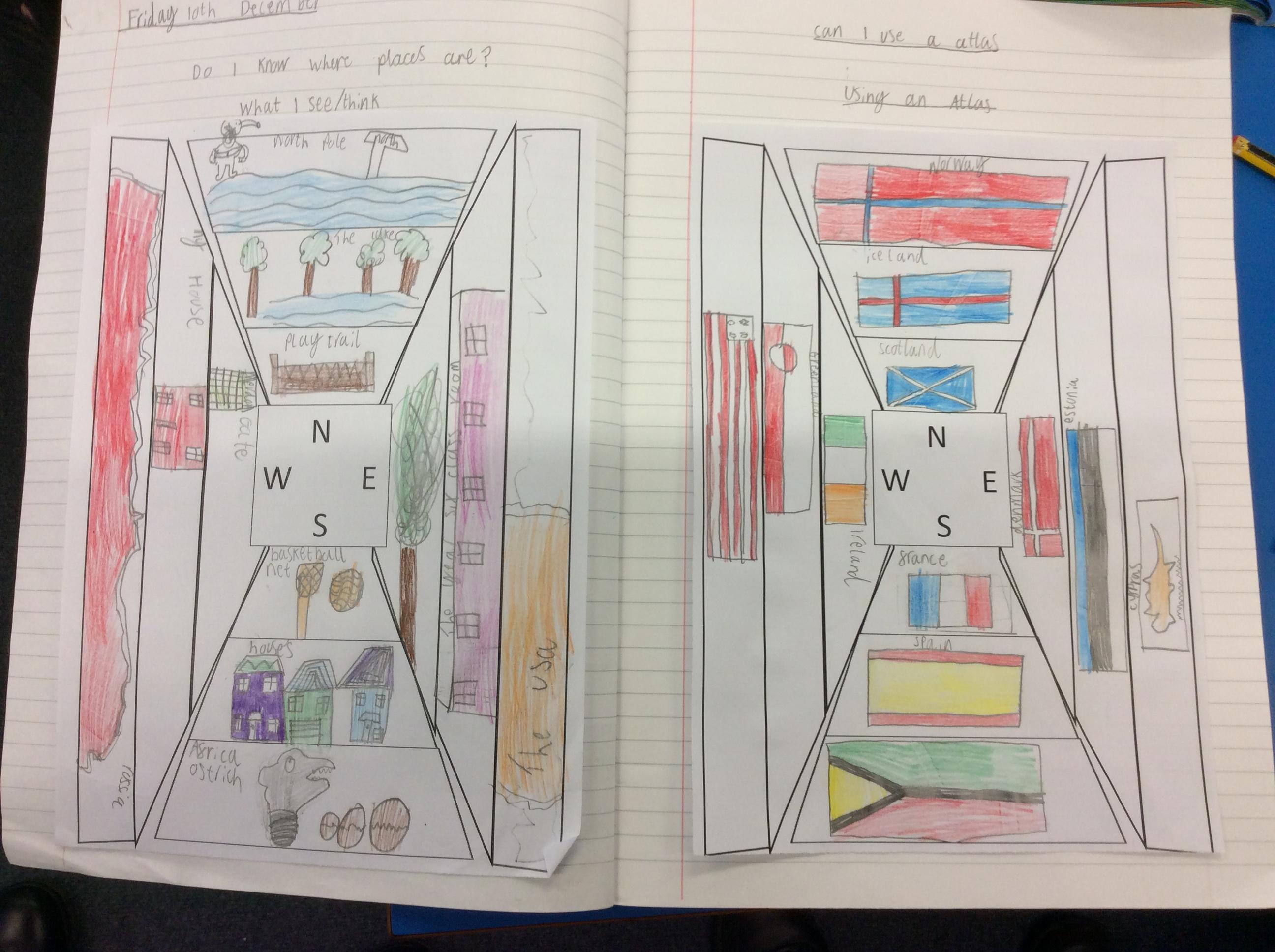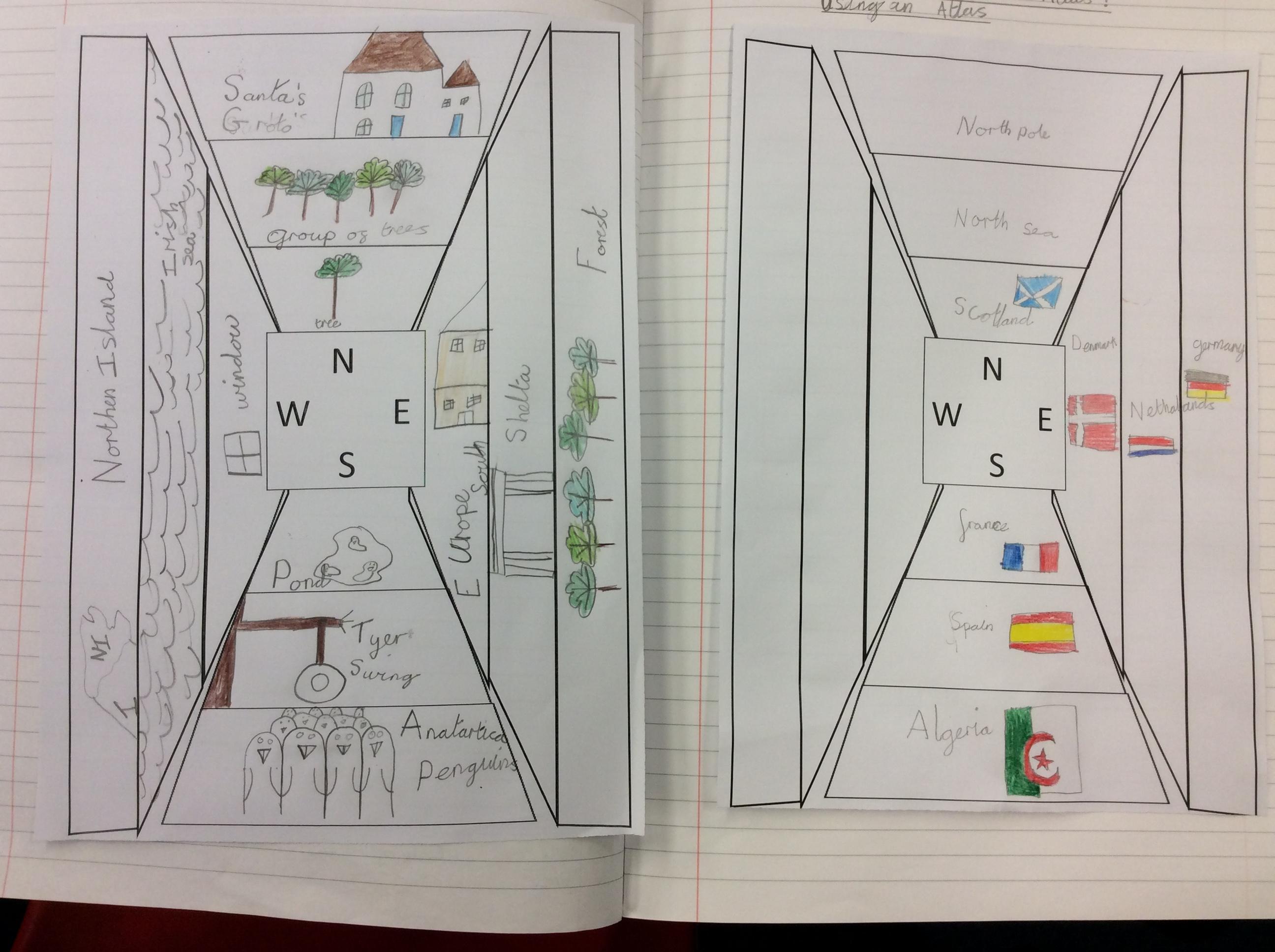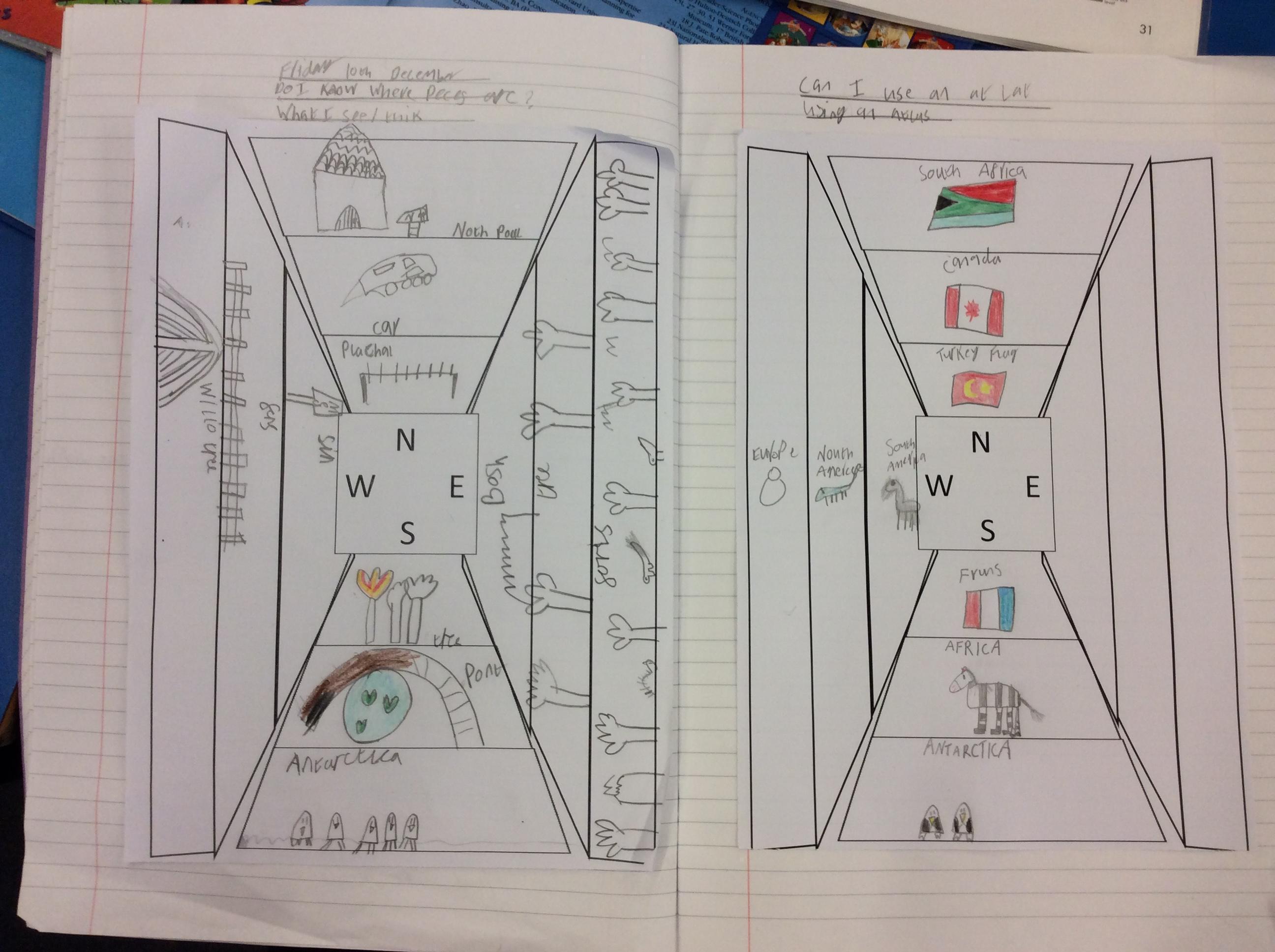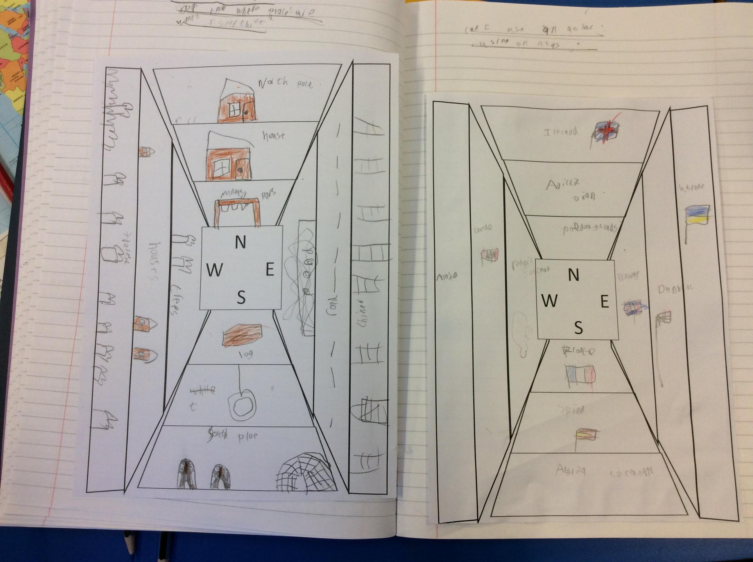 Then, we used the atlases to find other places we would find if we travelled in each of the four compass directions.