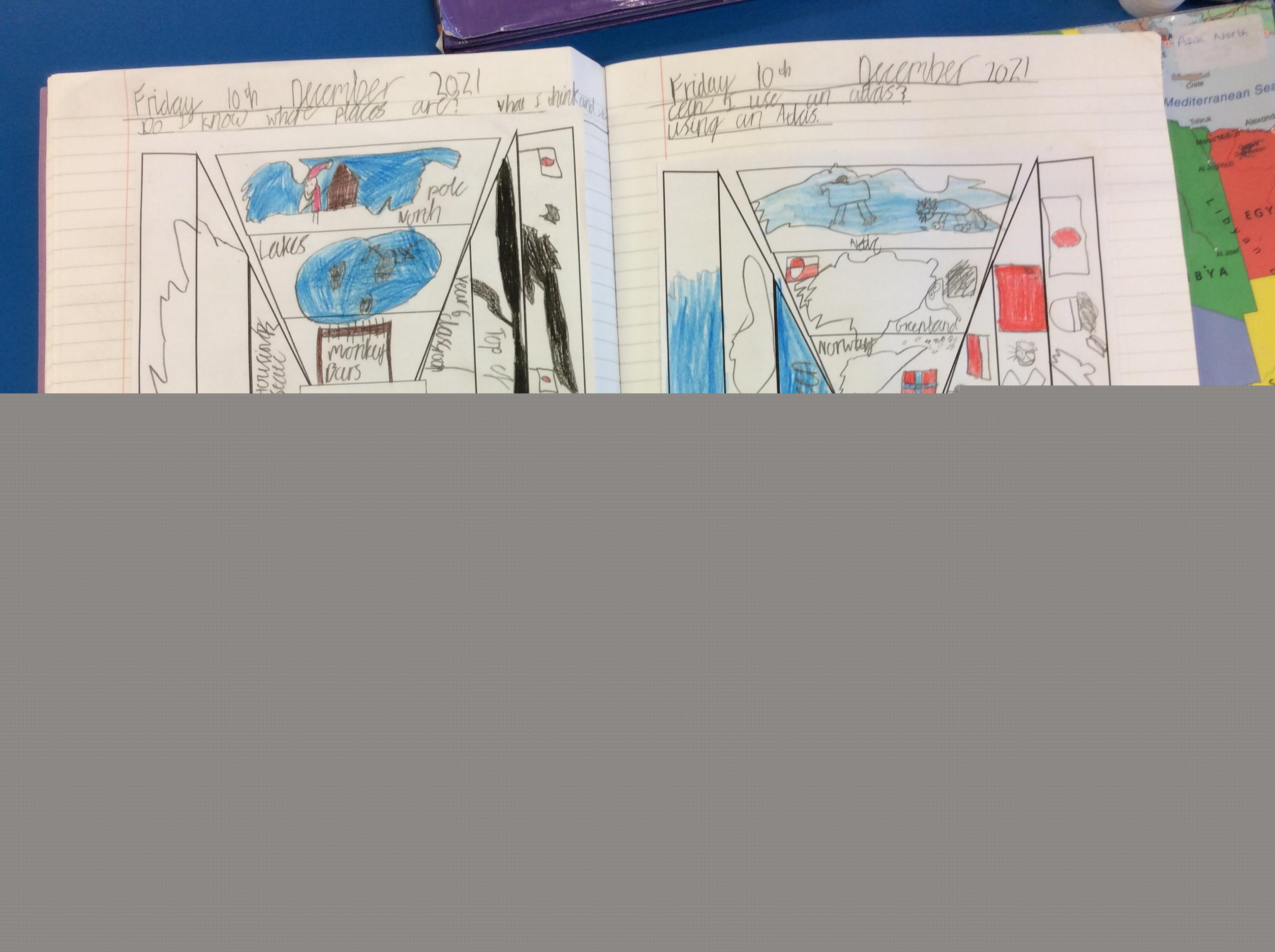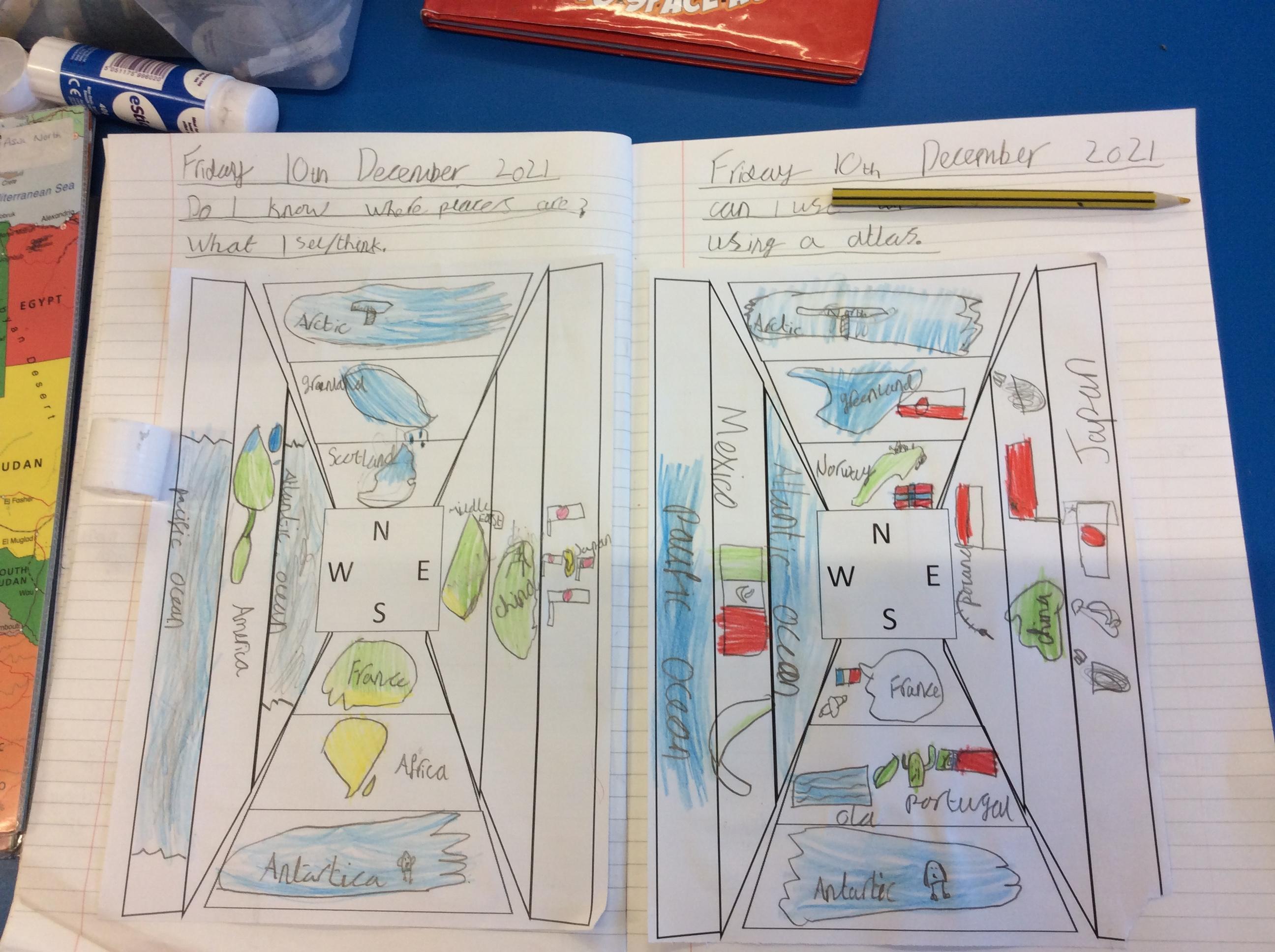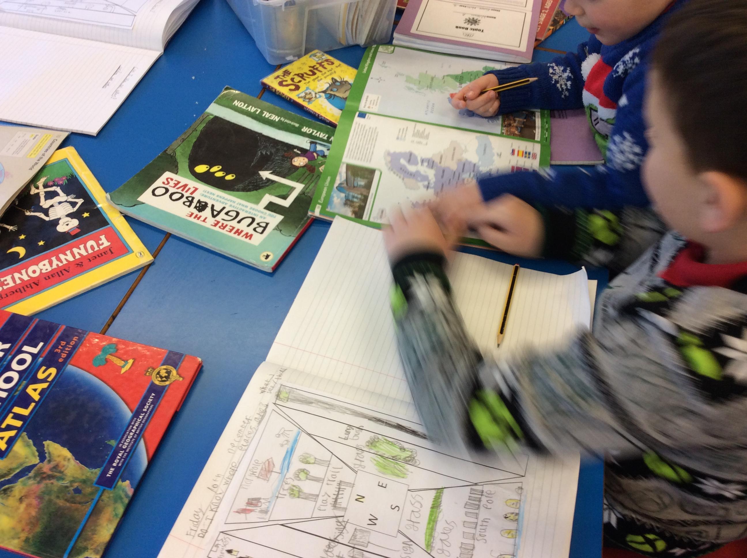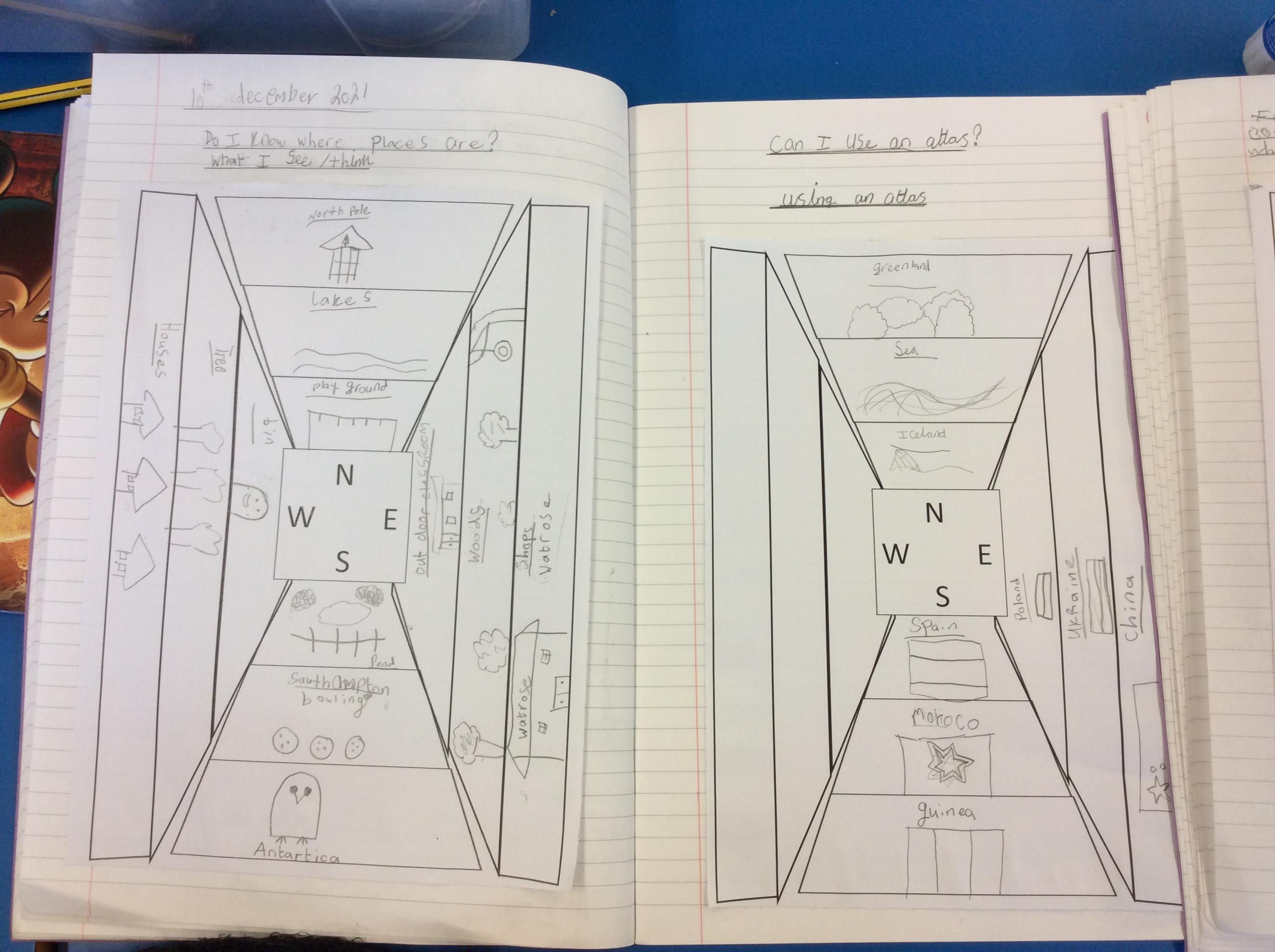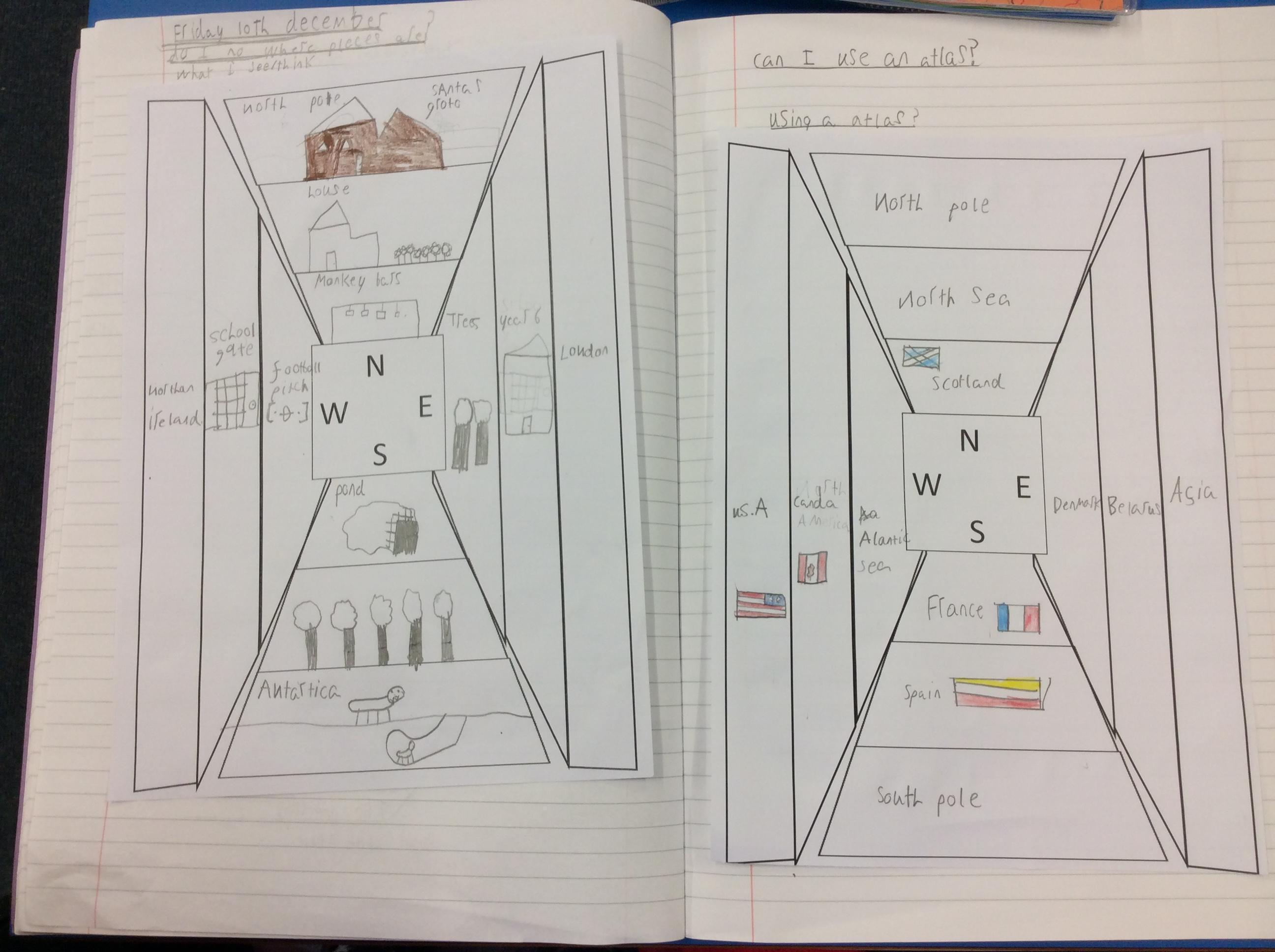 Then, we used the atlases to find other places we would find if we travelled in each of the four compass directions.