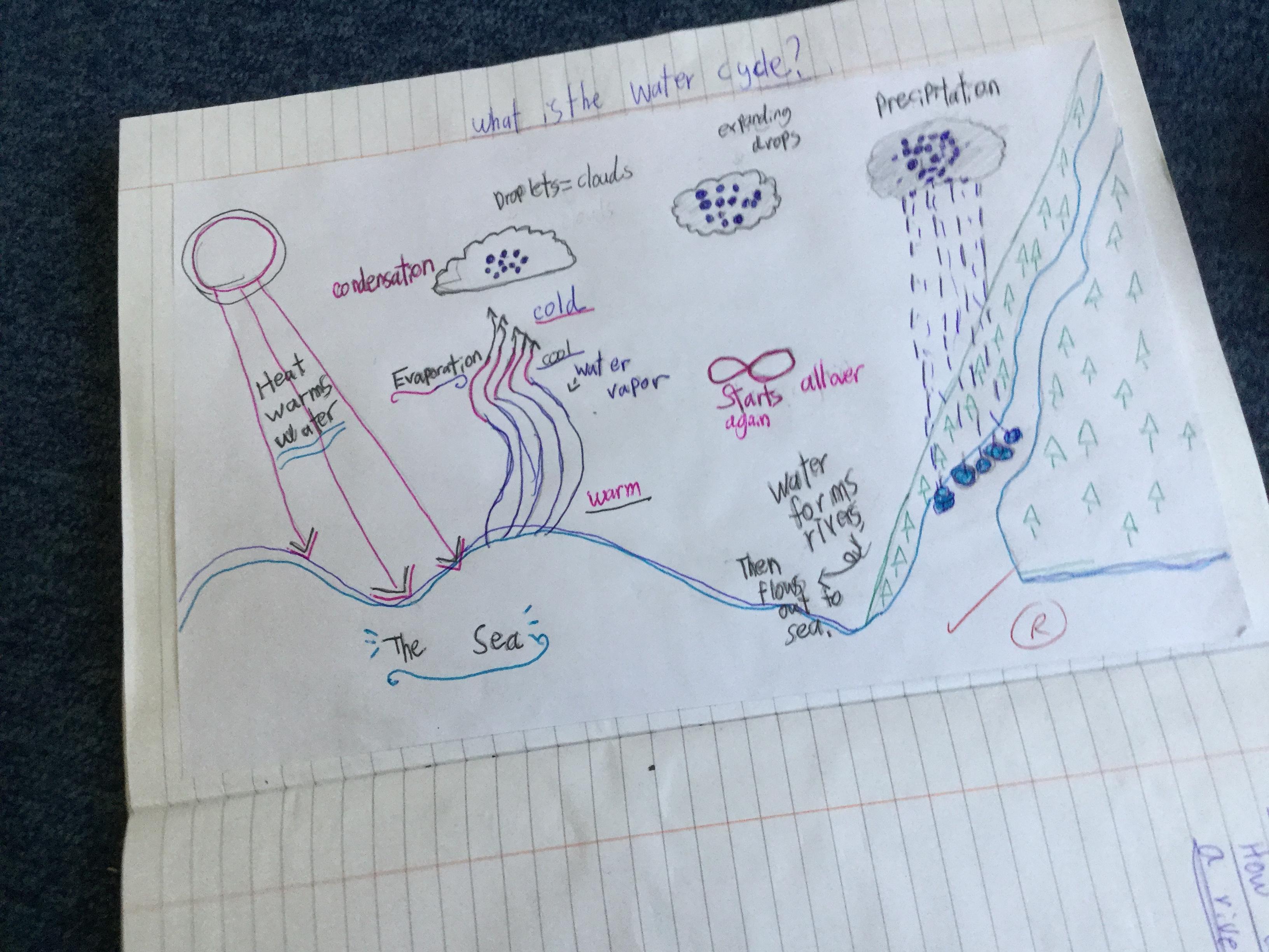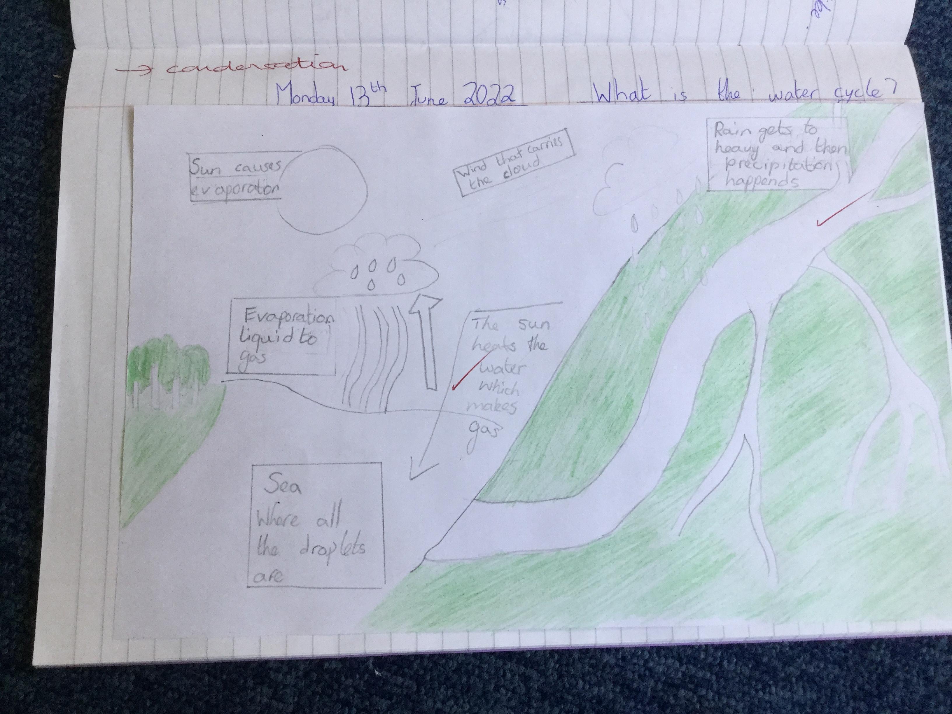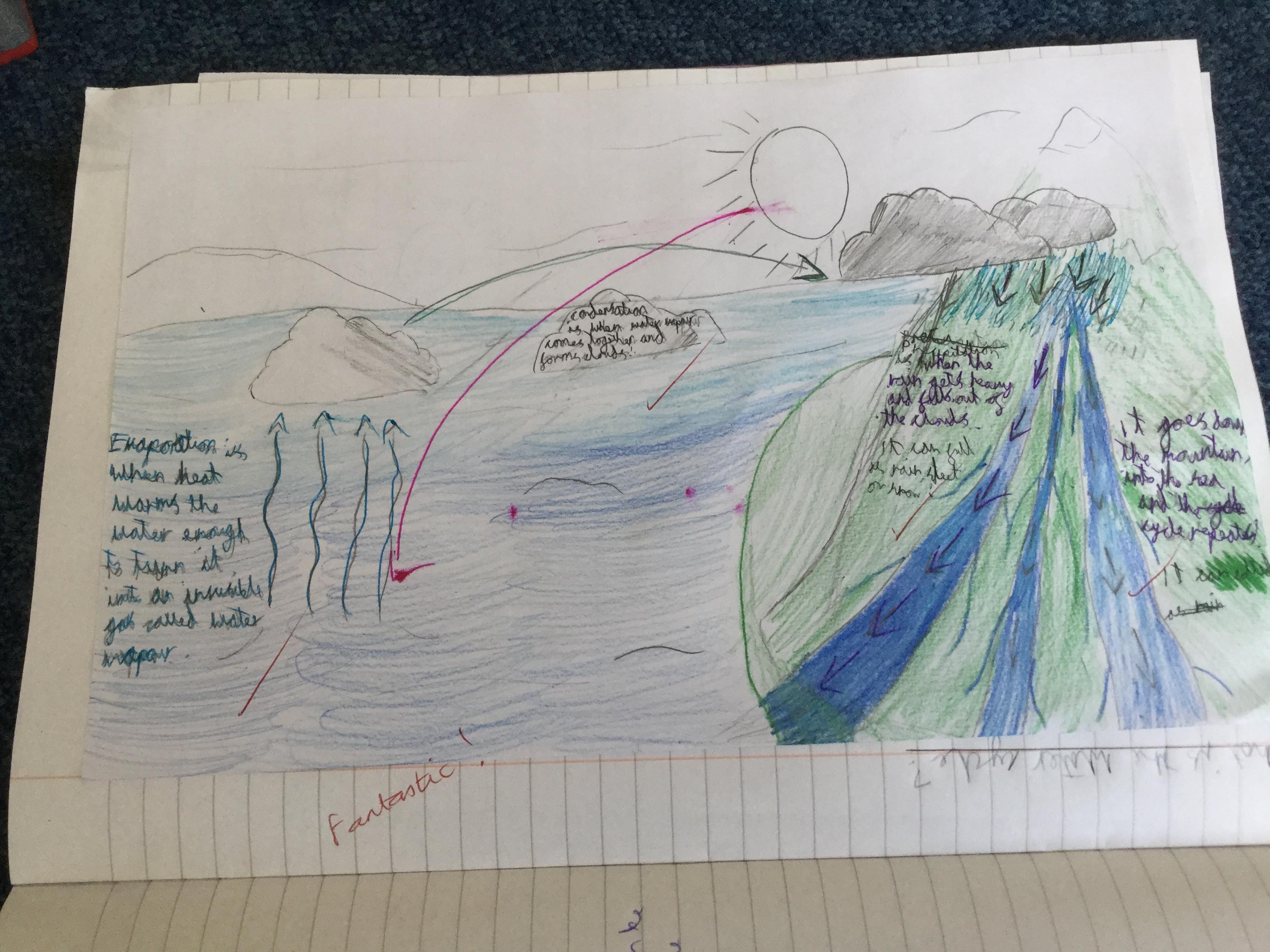 In order to understand rivers, we first need to know about the water cycle as the part that rivers play in it. We watched videos and used different sources of information around the room to find out. We then drew an illustration to explain the cycle.