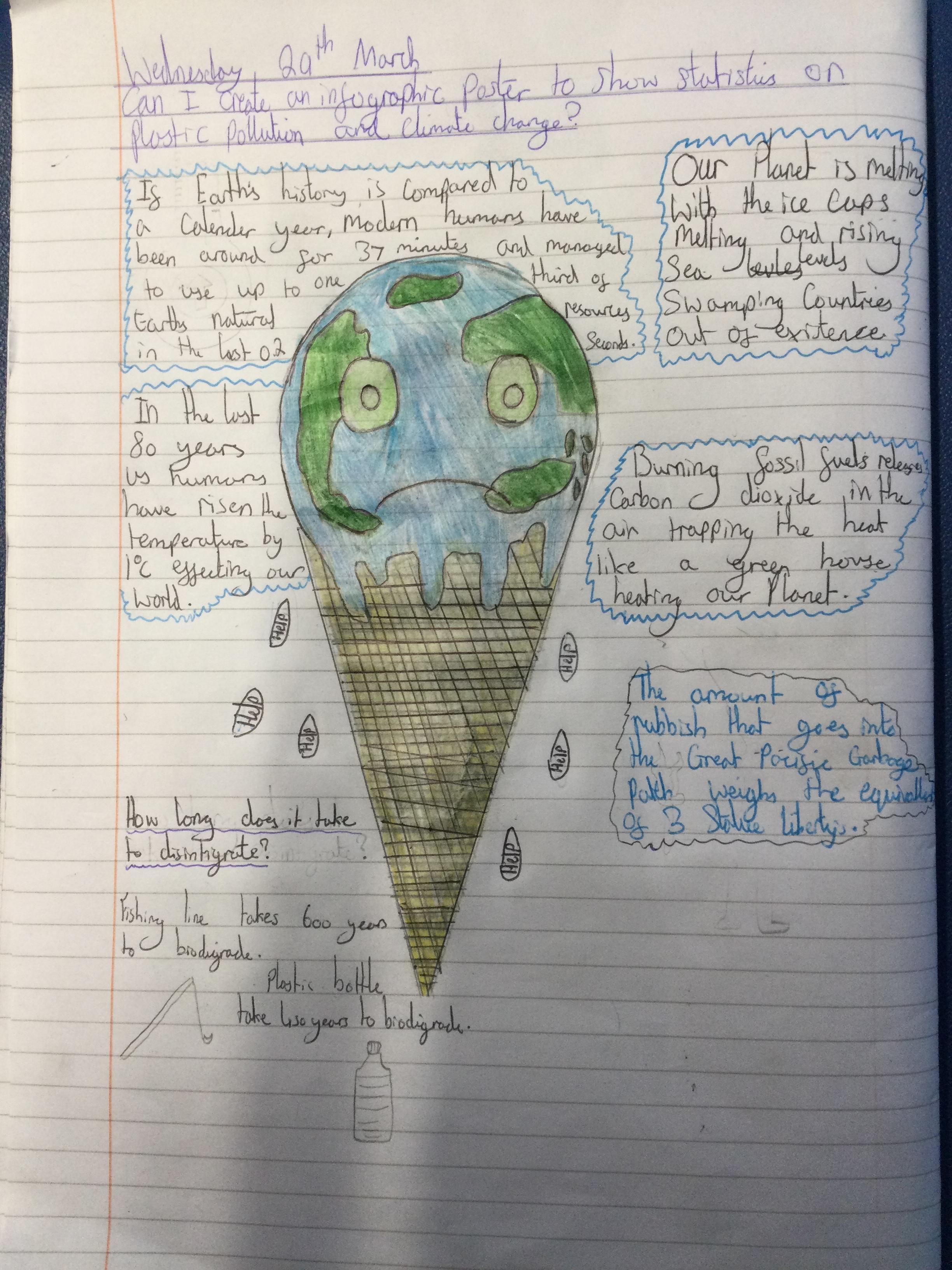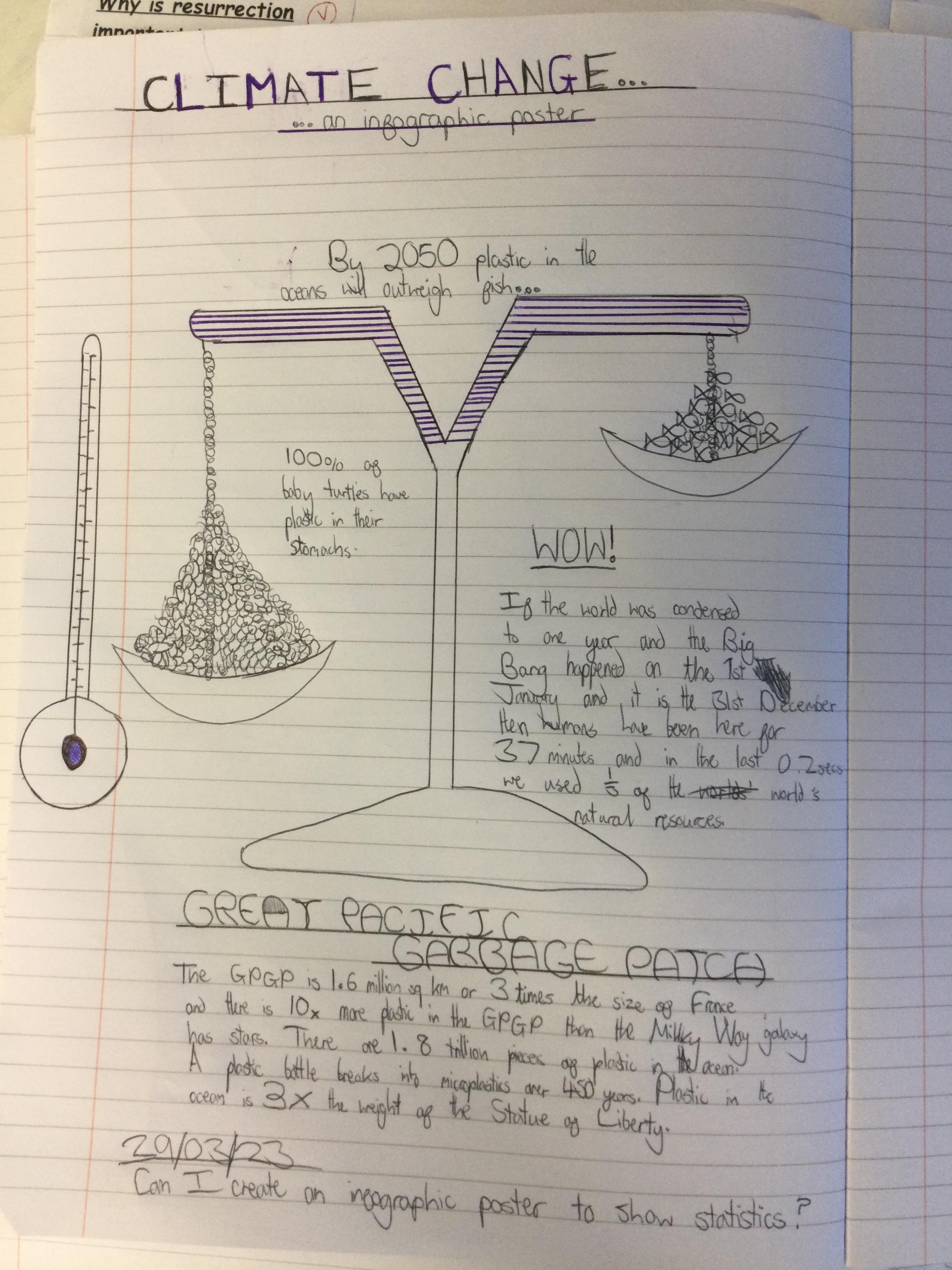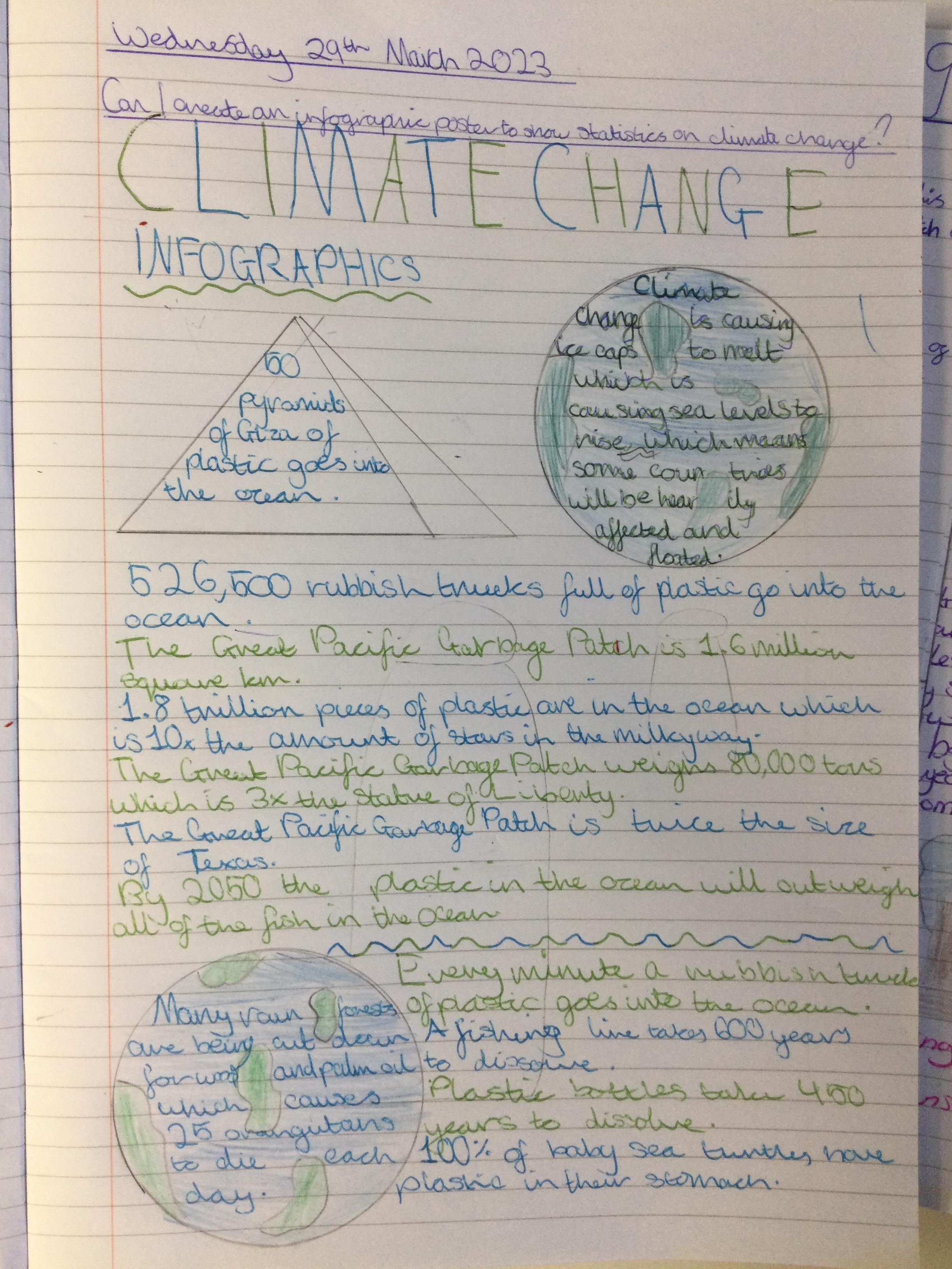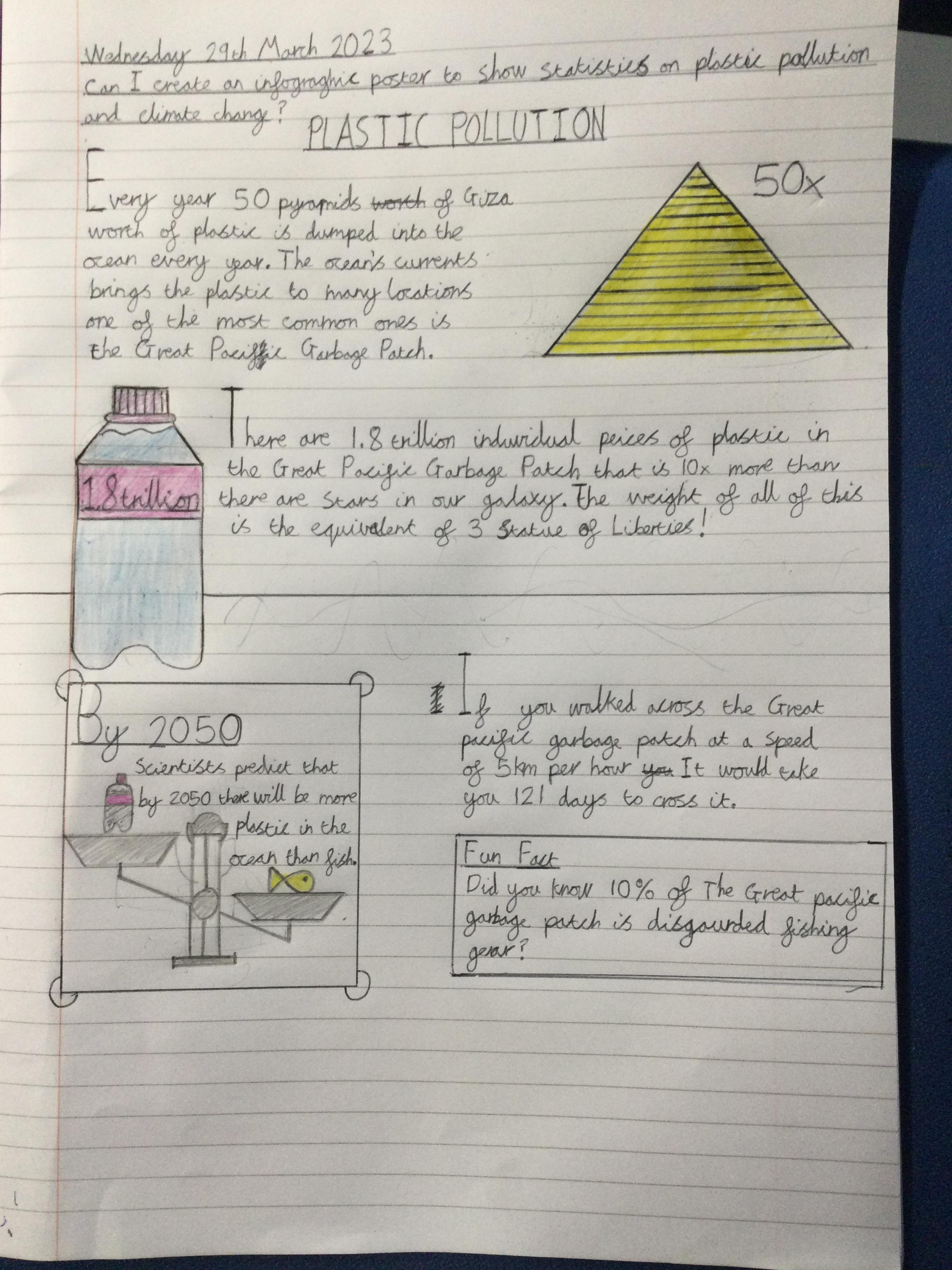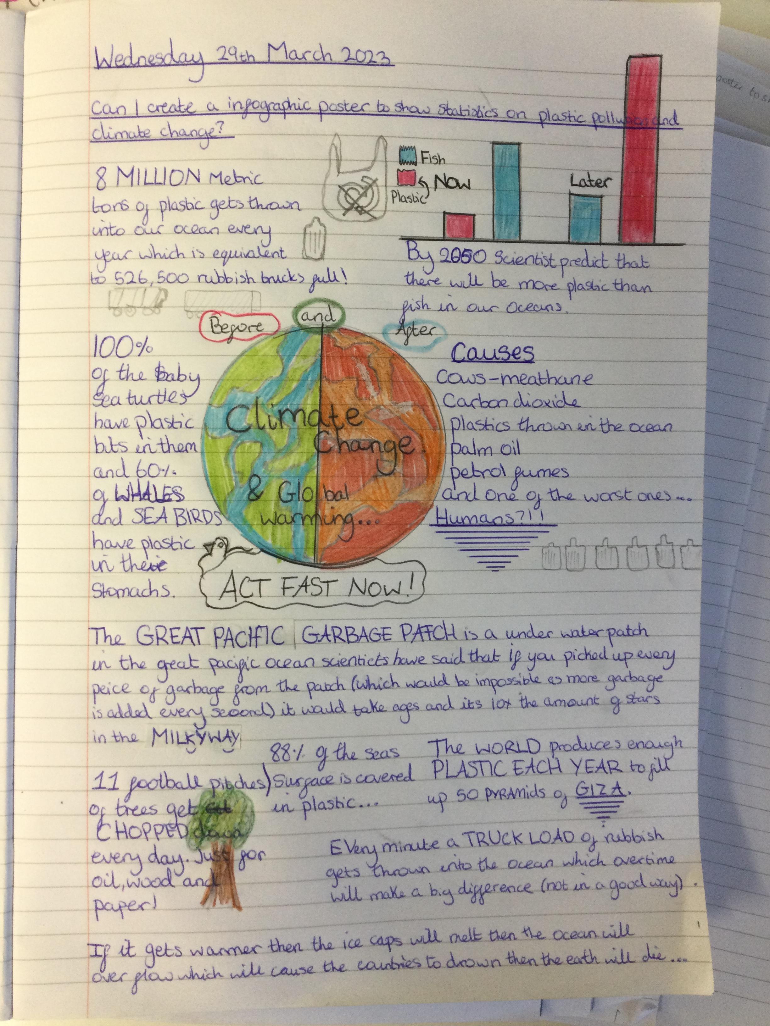 Infographics to illustrate the shocking facts about climate change and the Great Pacific Garbage Patch.