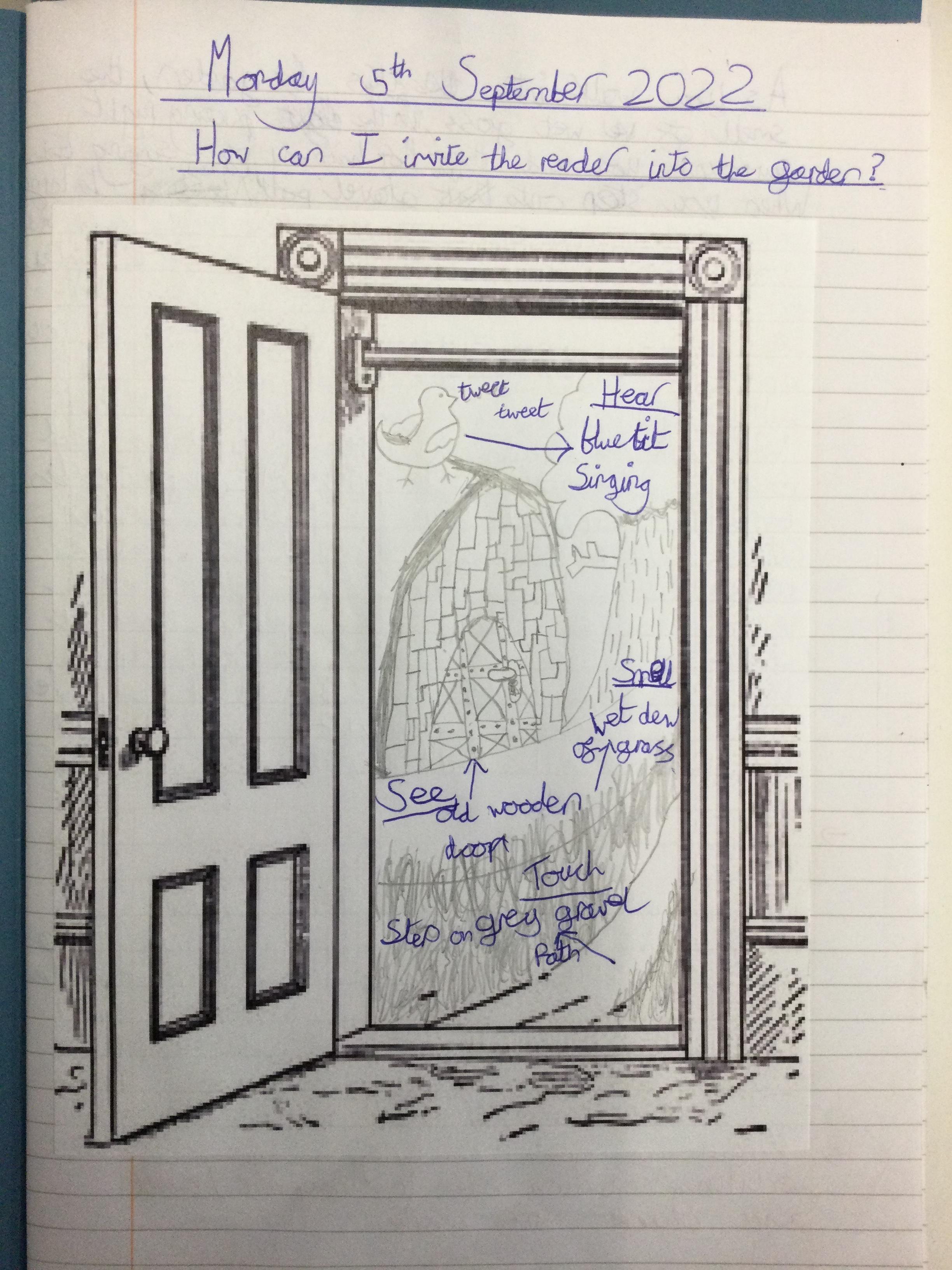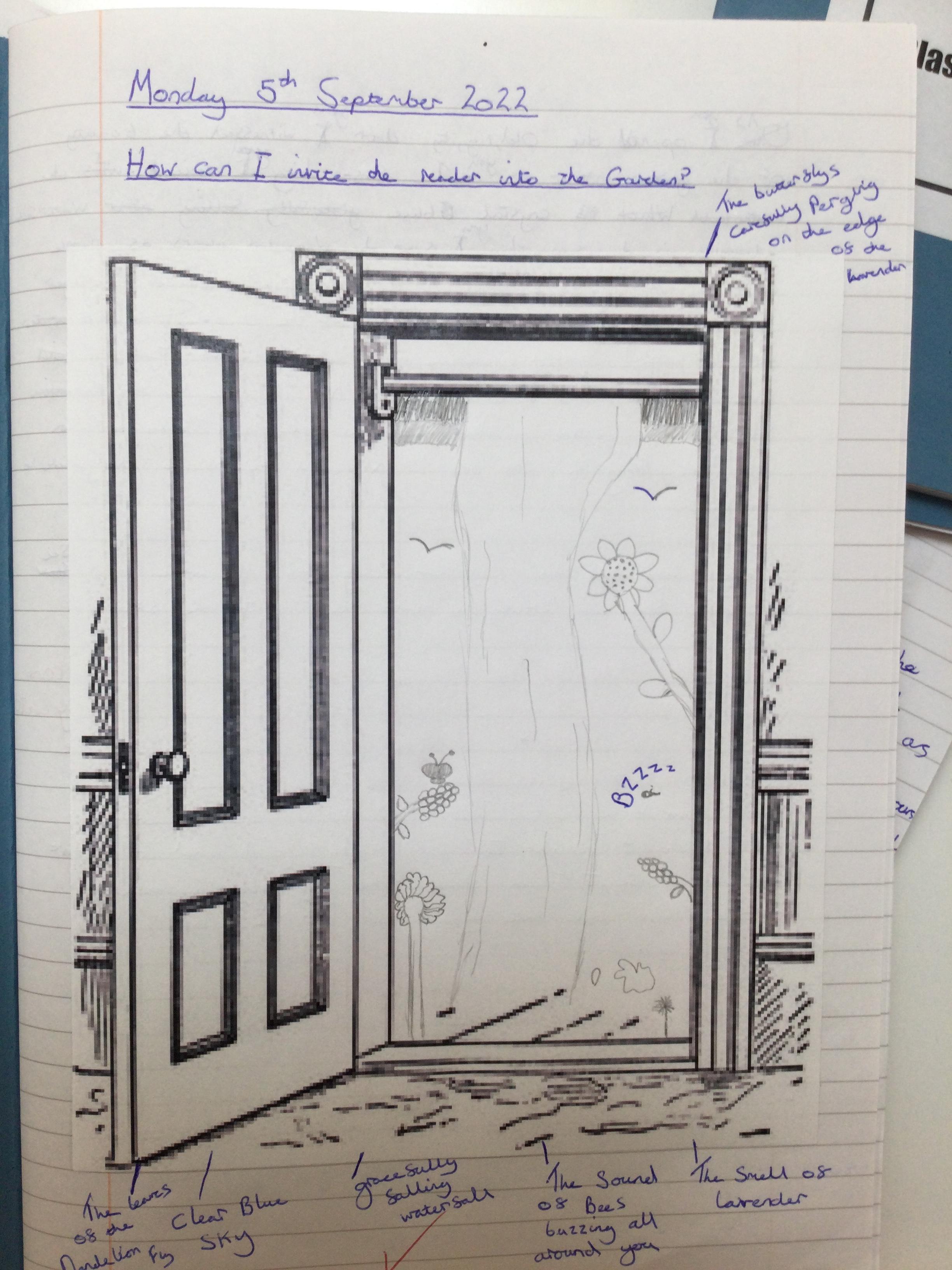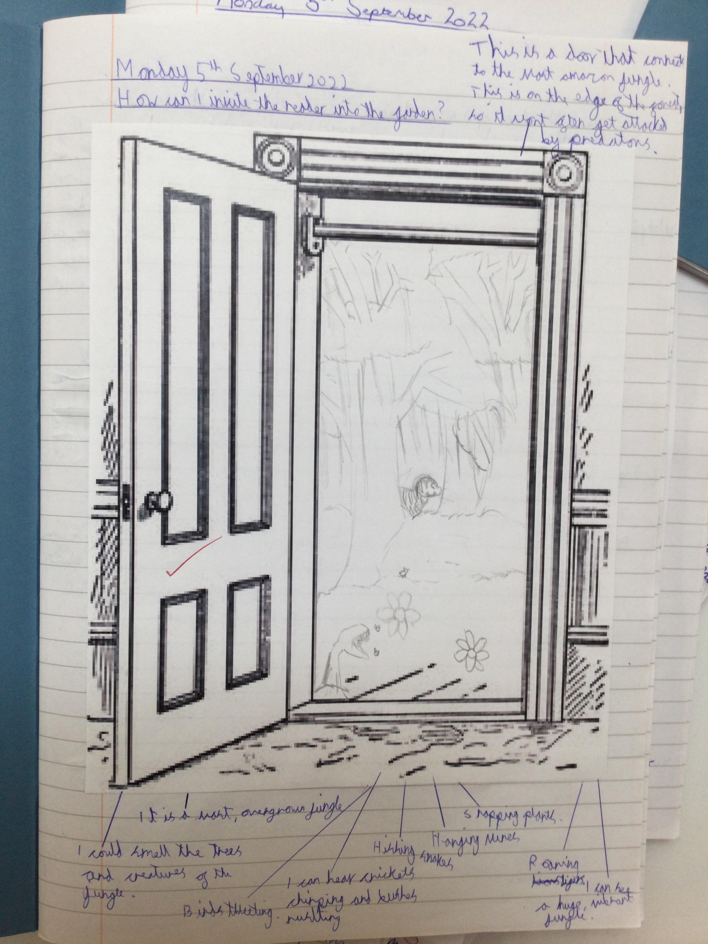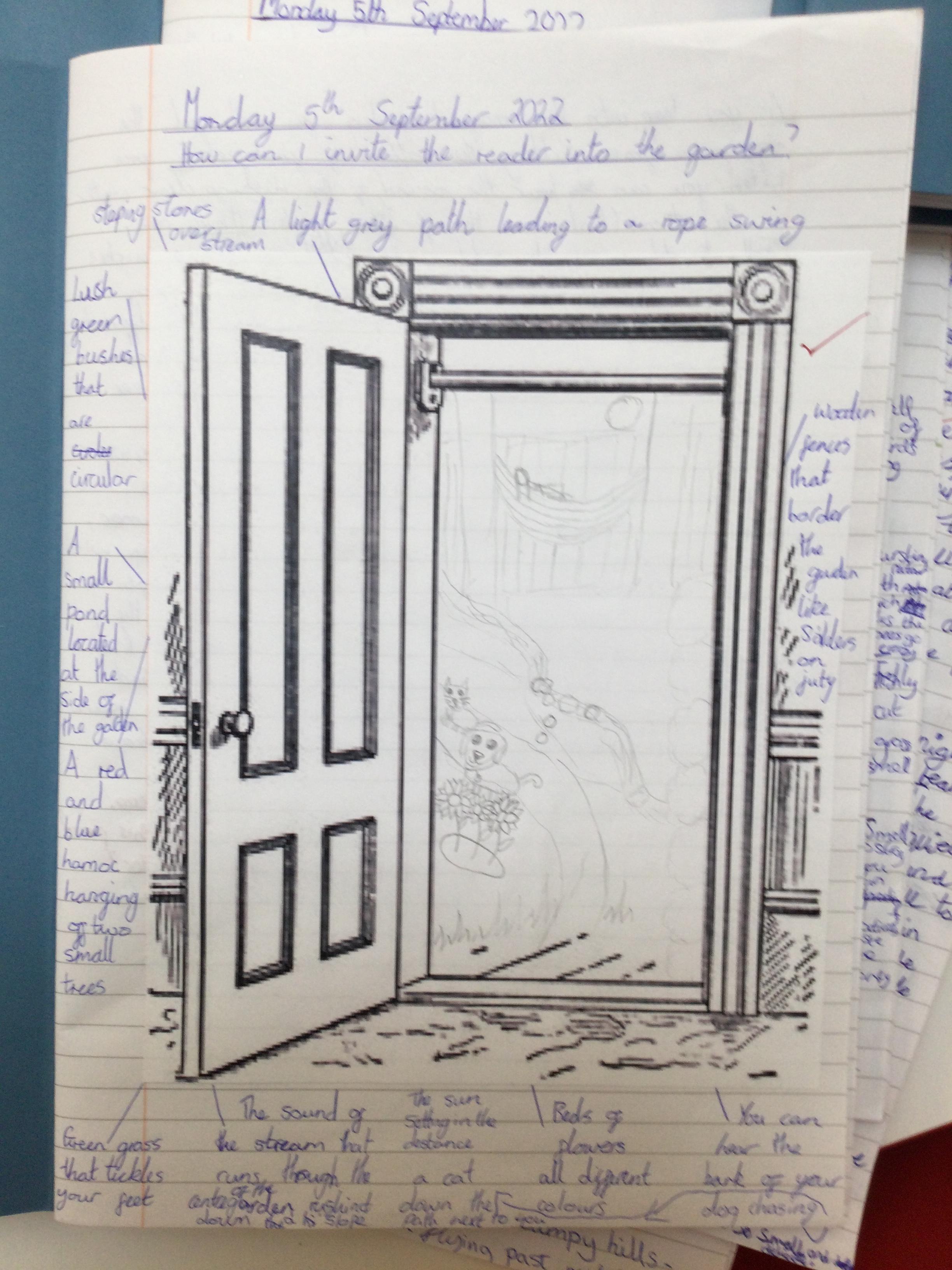 We began by thinking of a door. A door that opens into a garden. What is behinD the door? We then drew what our garden could look like - negative or positive, any time of day or night and any time of year. After this, we wrote descriptive pieces inviting the reader into our gardens.