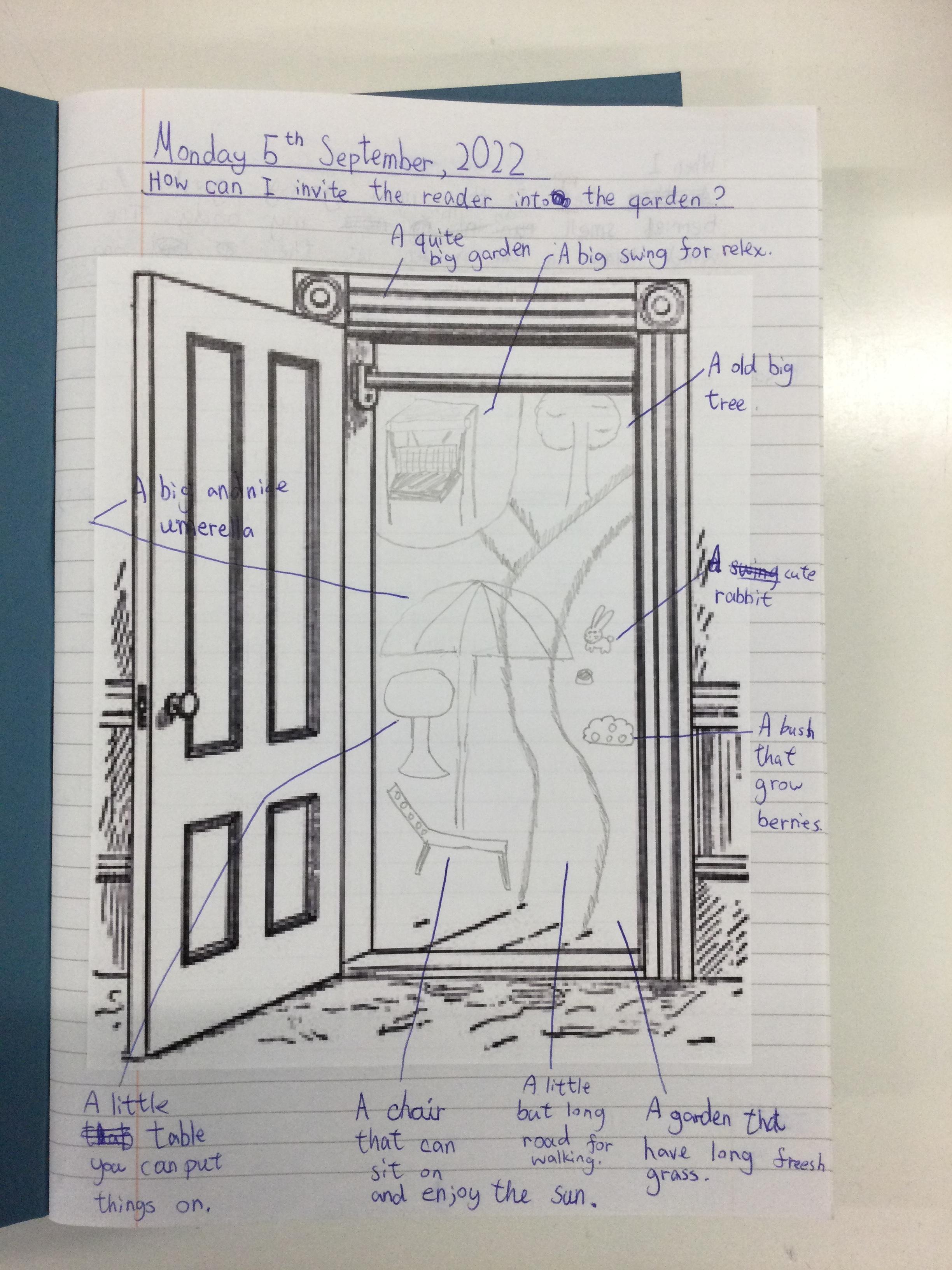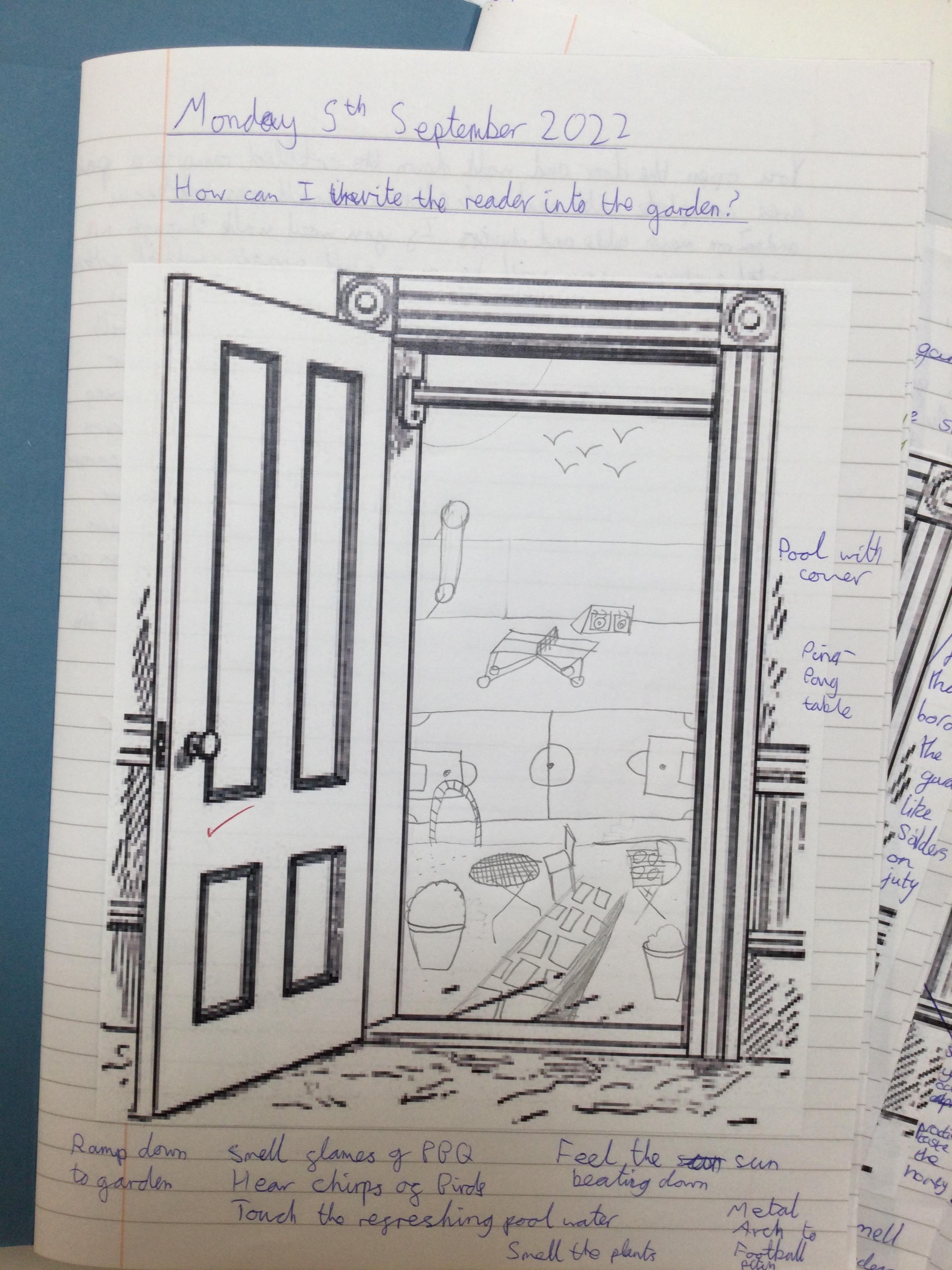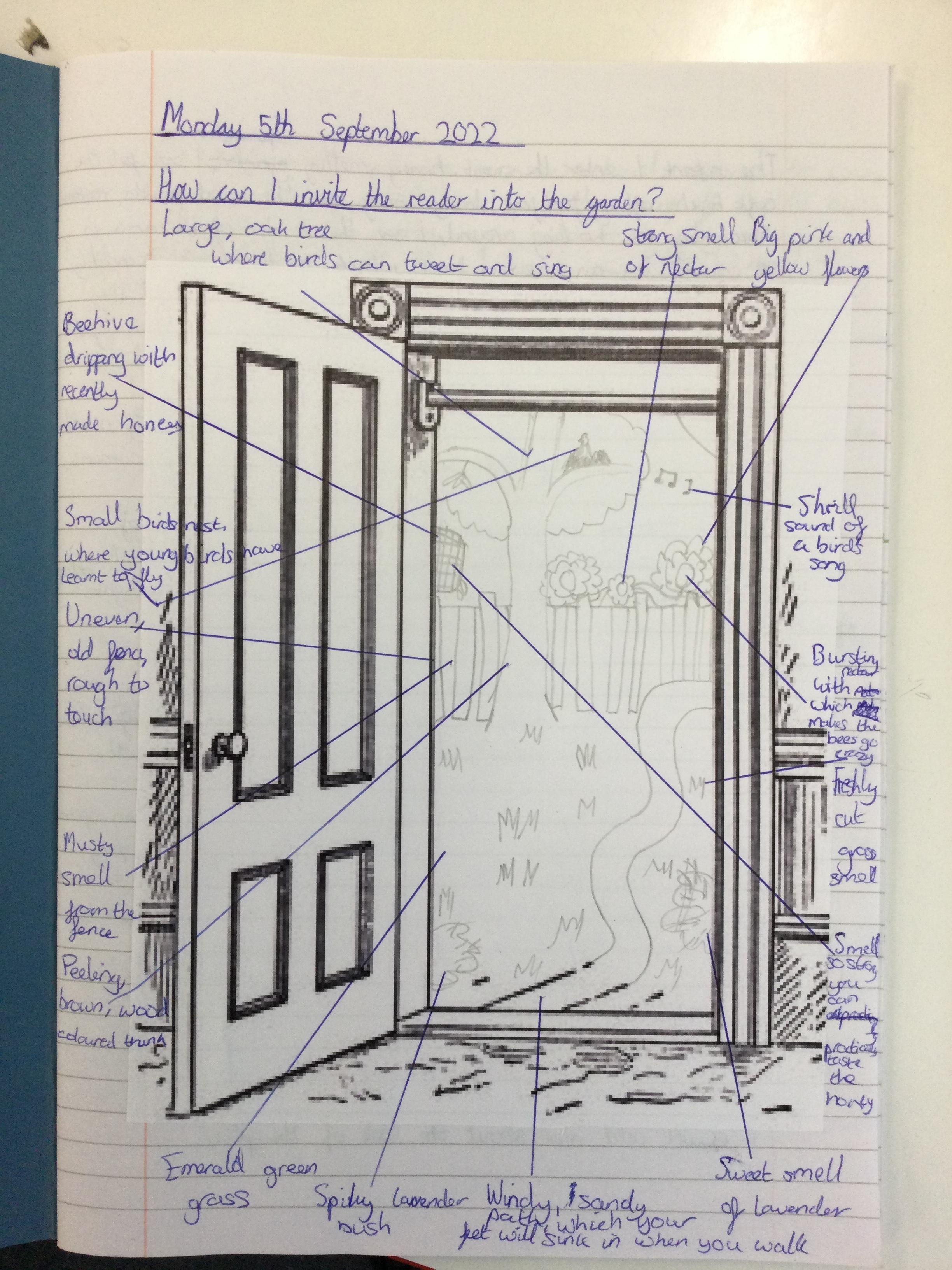 We began by thinking of a door. A door that opens into a garden. What is behinD the door? We then drew what our garden could look like - negative or positive, any time of day or night and any time of year. After this, we wrote descriptive pieces inviting the reader into our gardens.