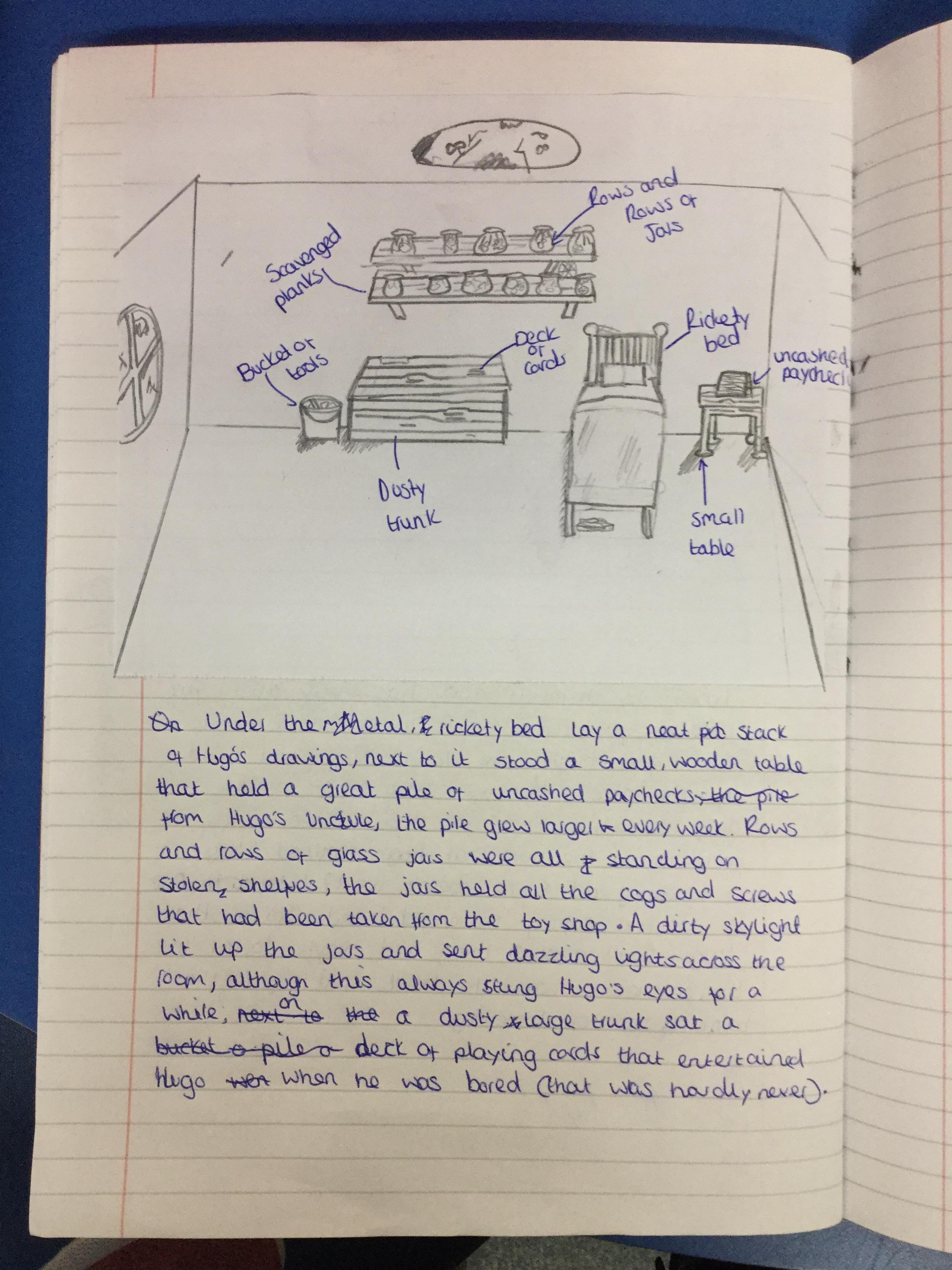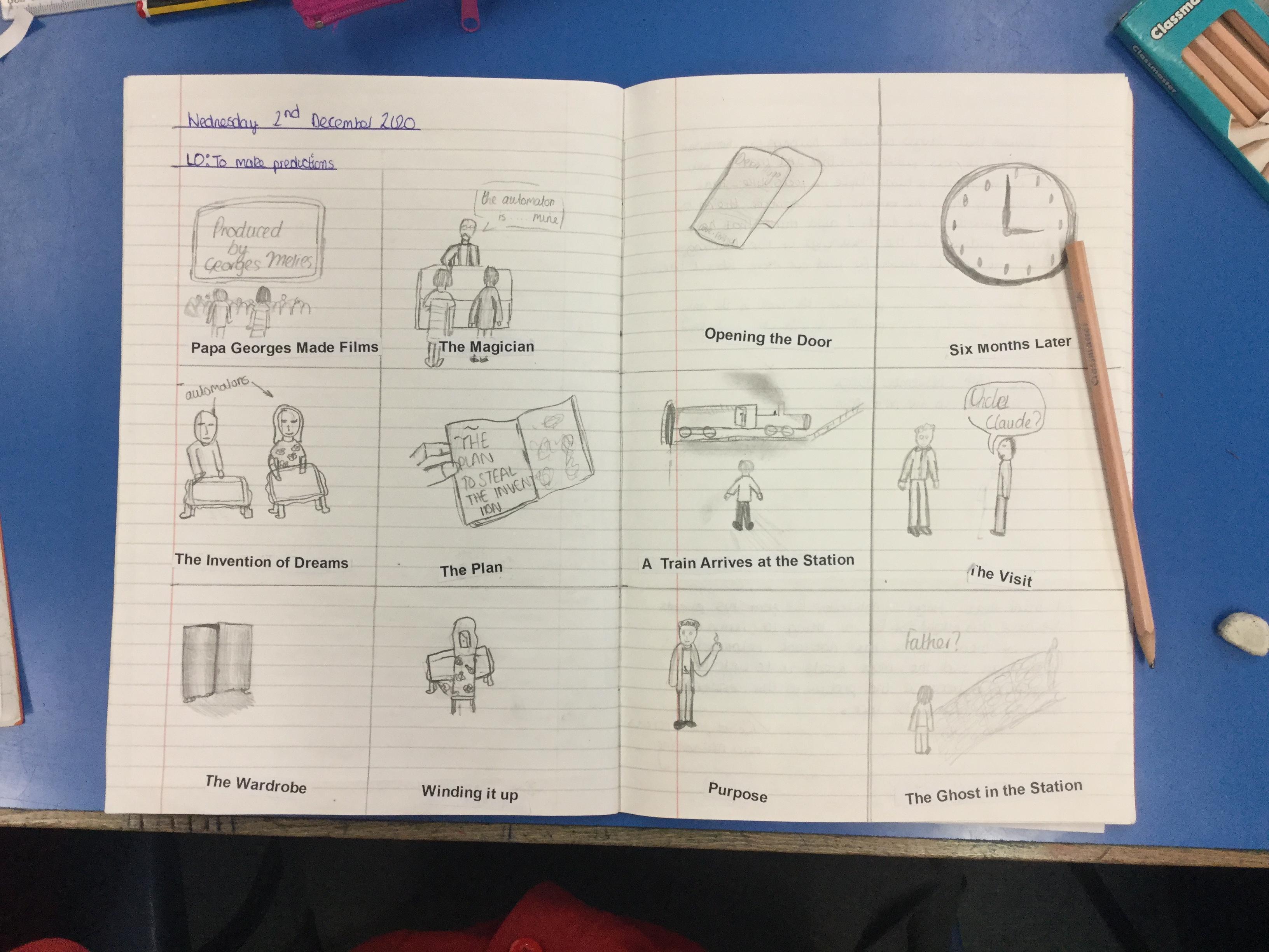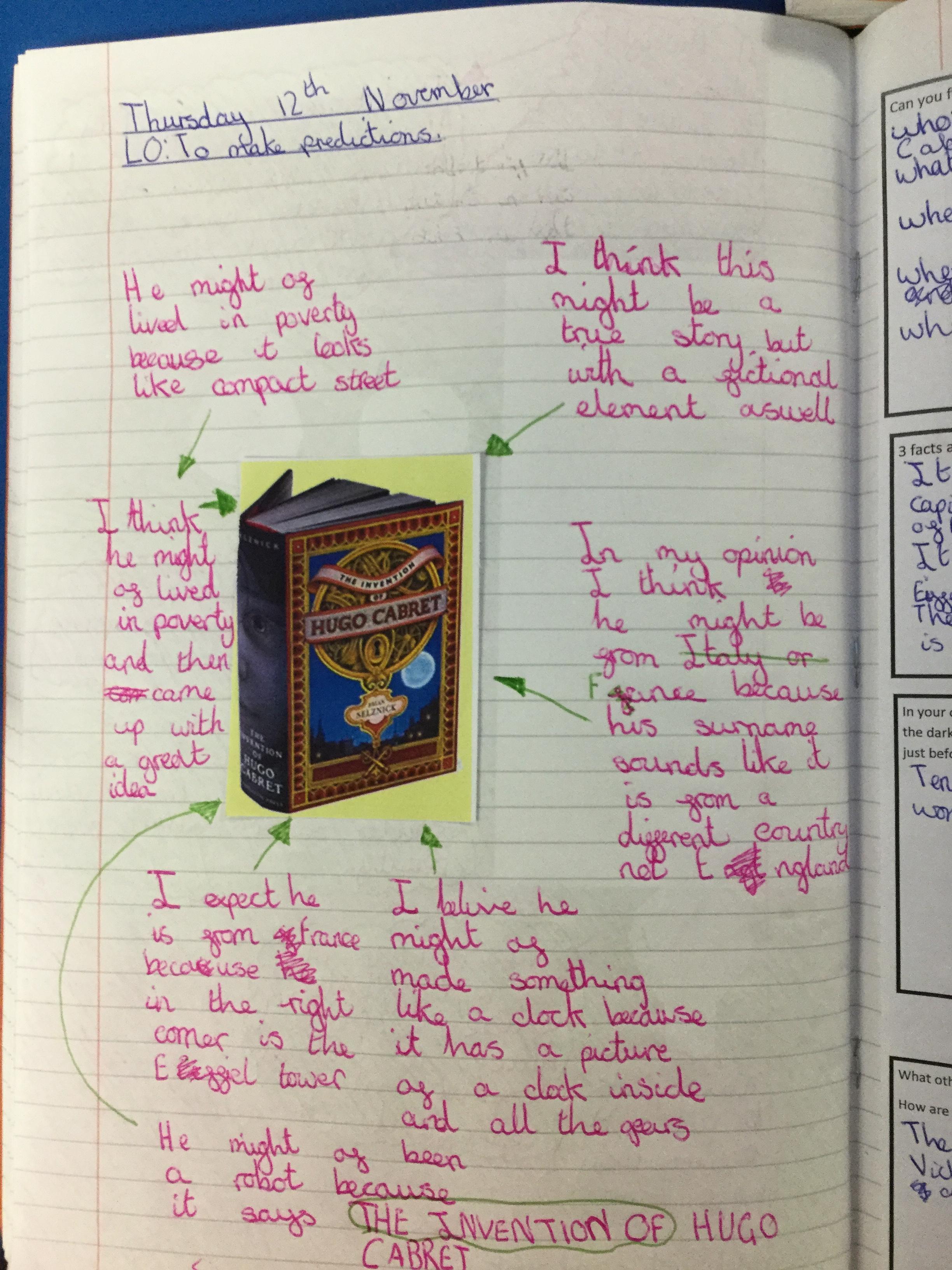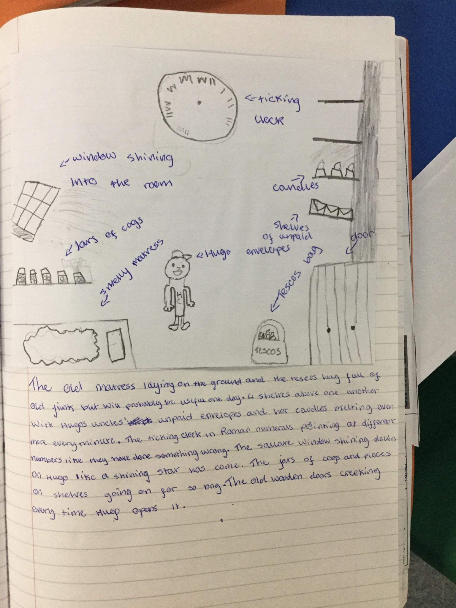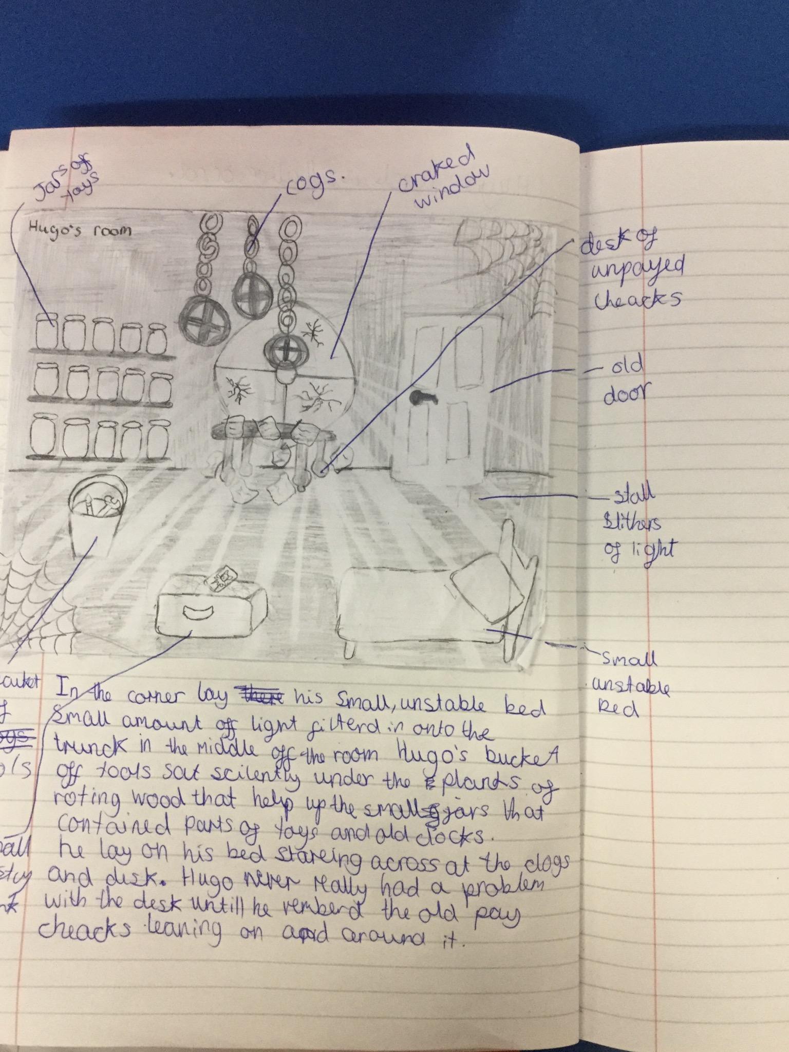 We have begun our new book: Brian Selznick’s The invention of Hugo Cabret’. We made predictions based on the front cover of the novel, made inferences about Hugo based on his notebook and what we have learnt about his room. We have retrieved information from the text to created diagrams of Hugo’s room in the train station in the style of Selznick.