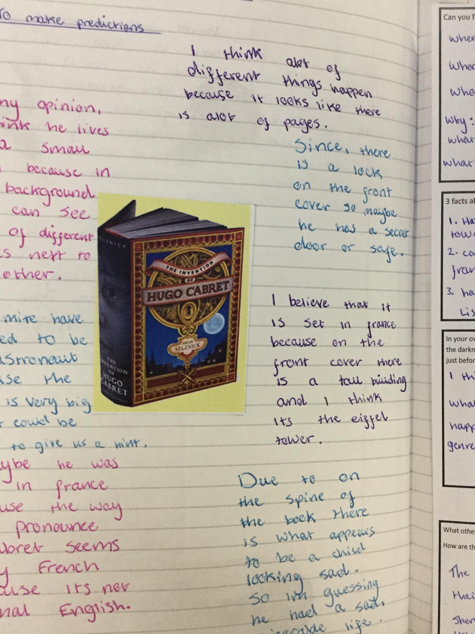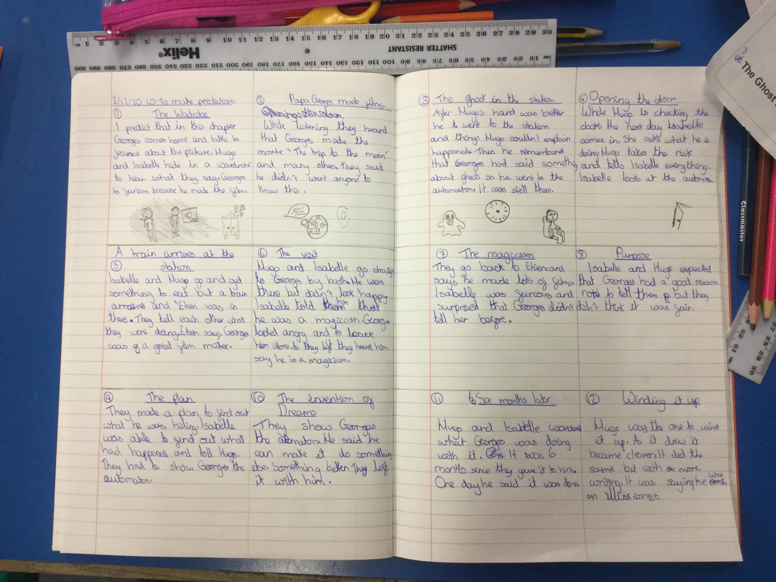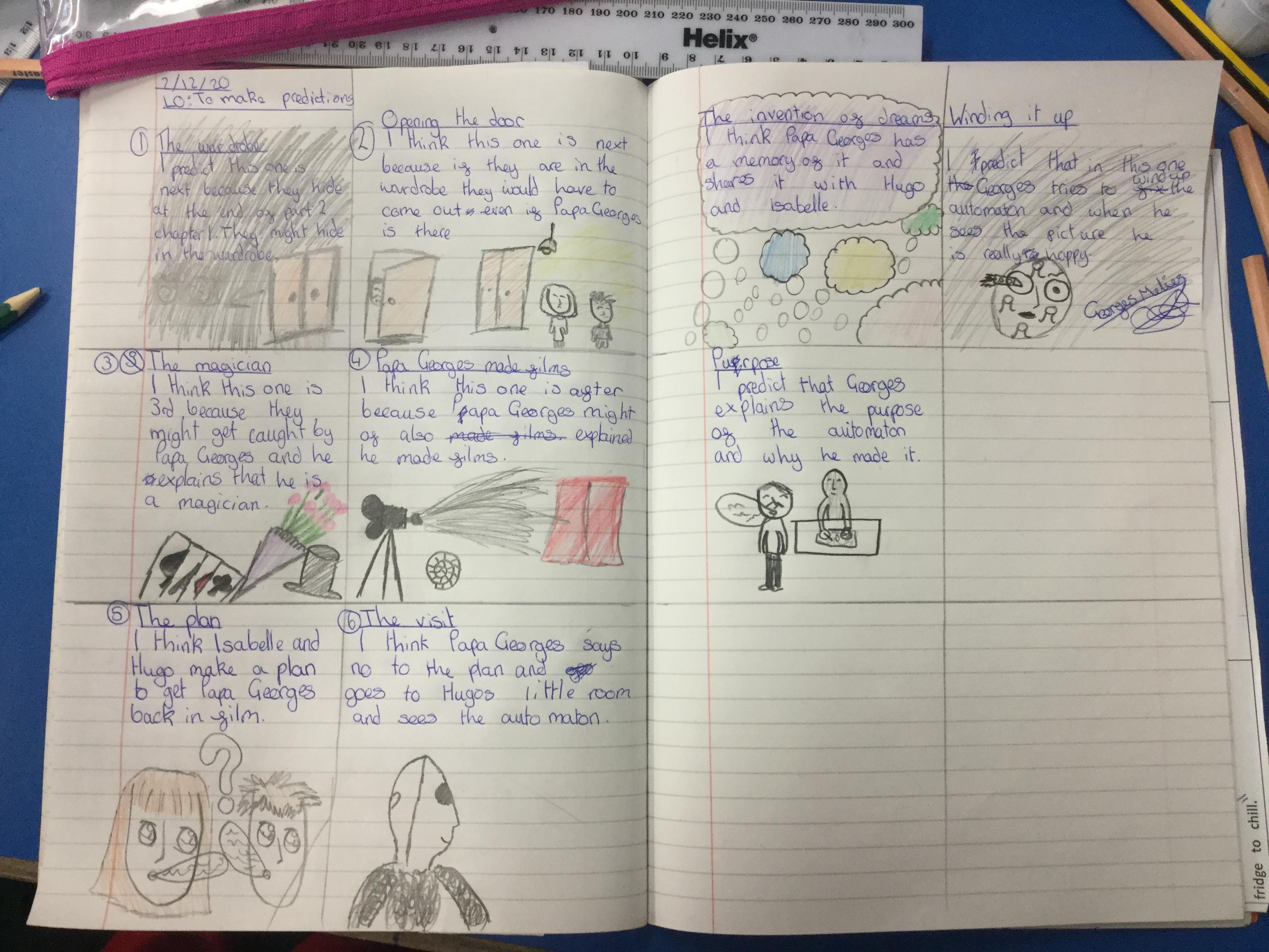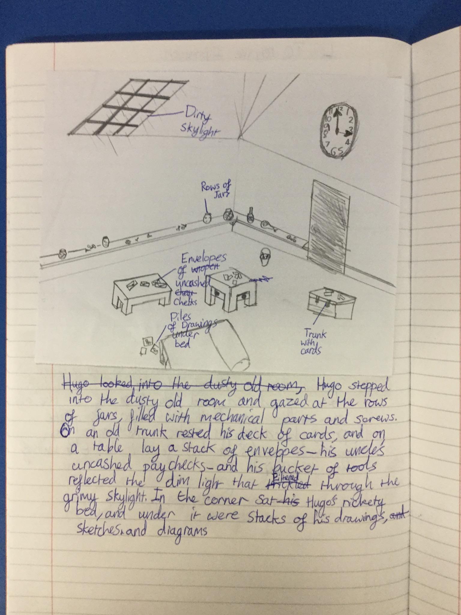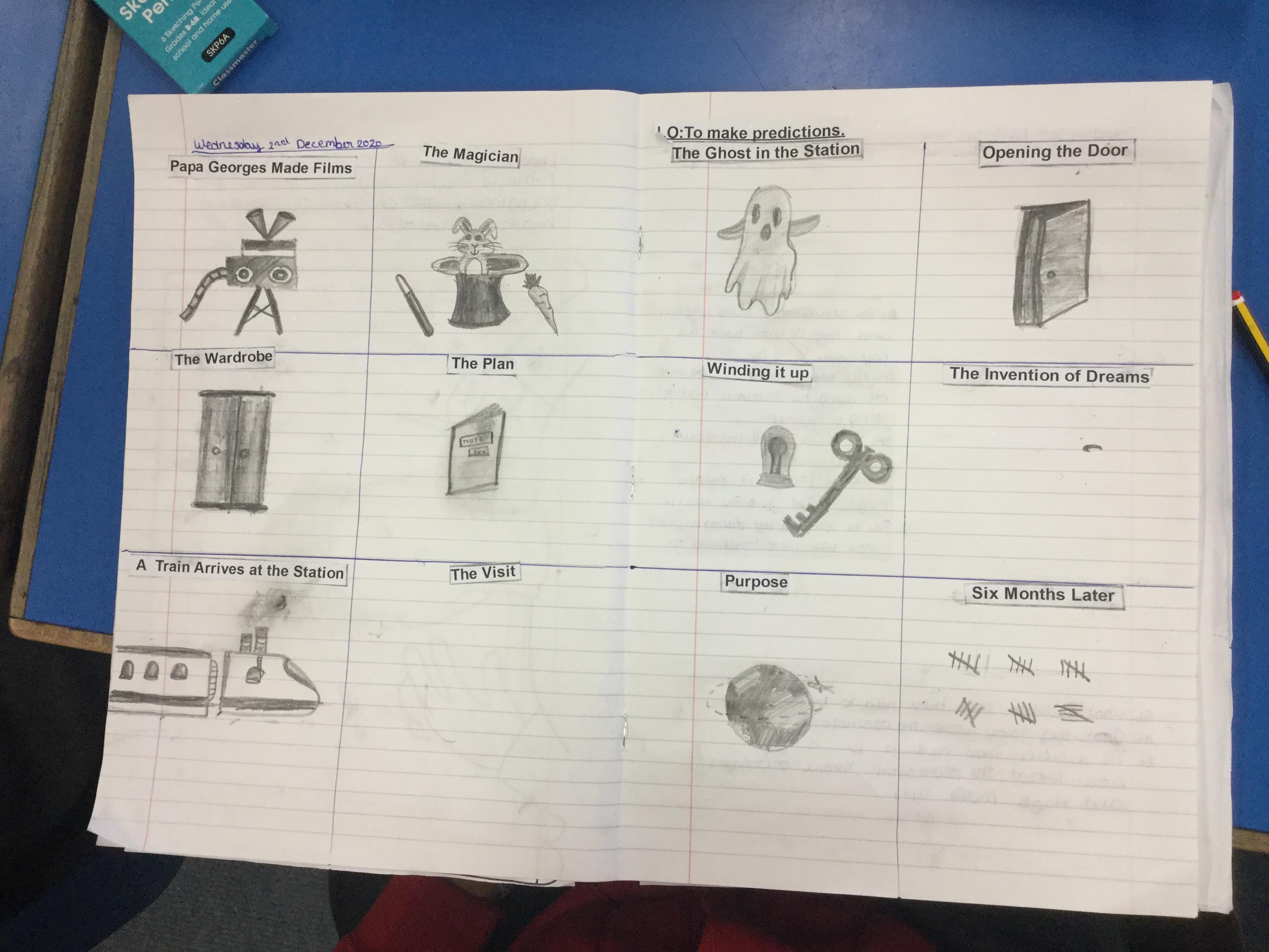 We have begun our new book: Brian Selznick’s The invention of Hugo Cabret’. We made predictions based on the front cover of the novel, made inferences about Hugo based on his notebook and what we have learnt about his room. We have retrieved information from the text to created diagrams of Hugo’s room in the train station in the style of Selznick.