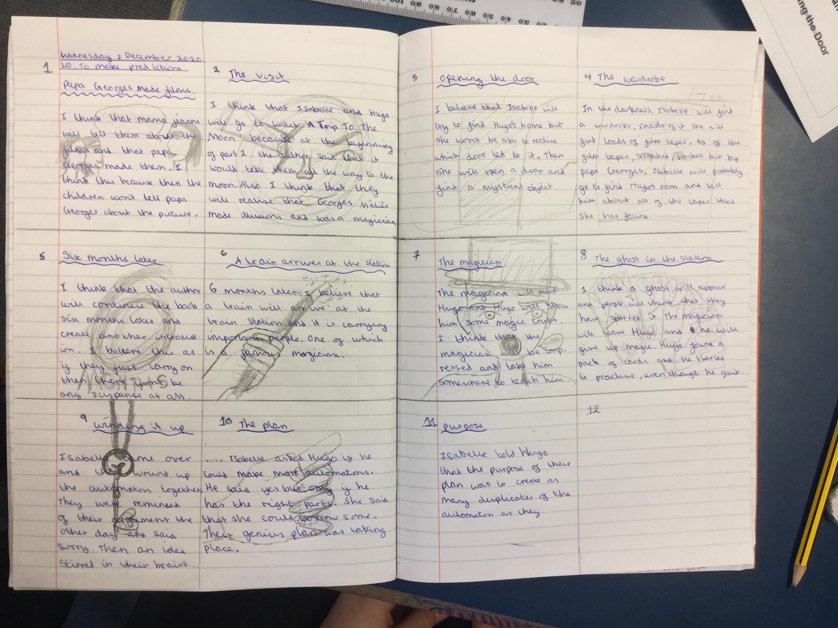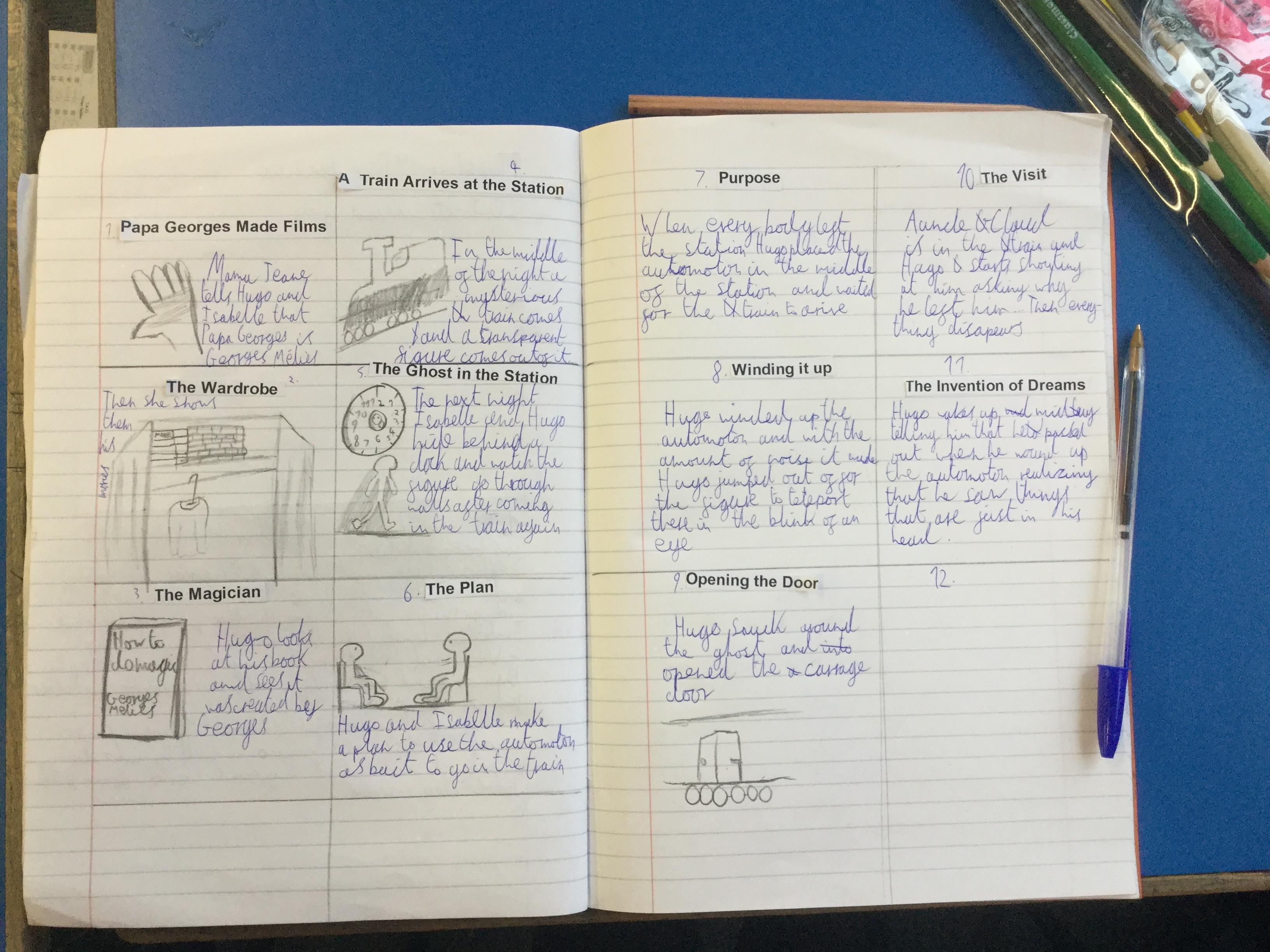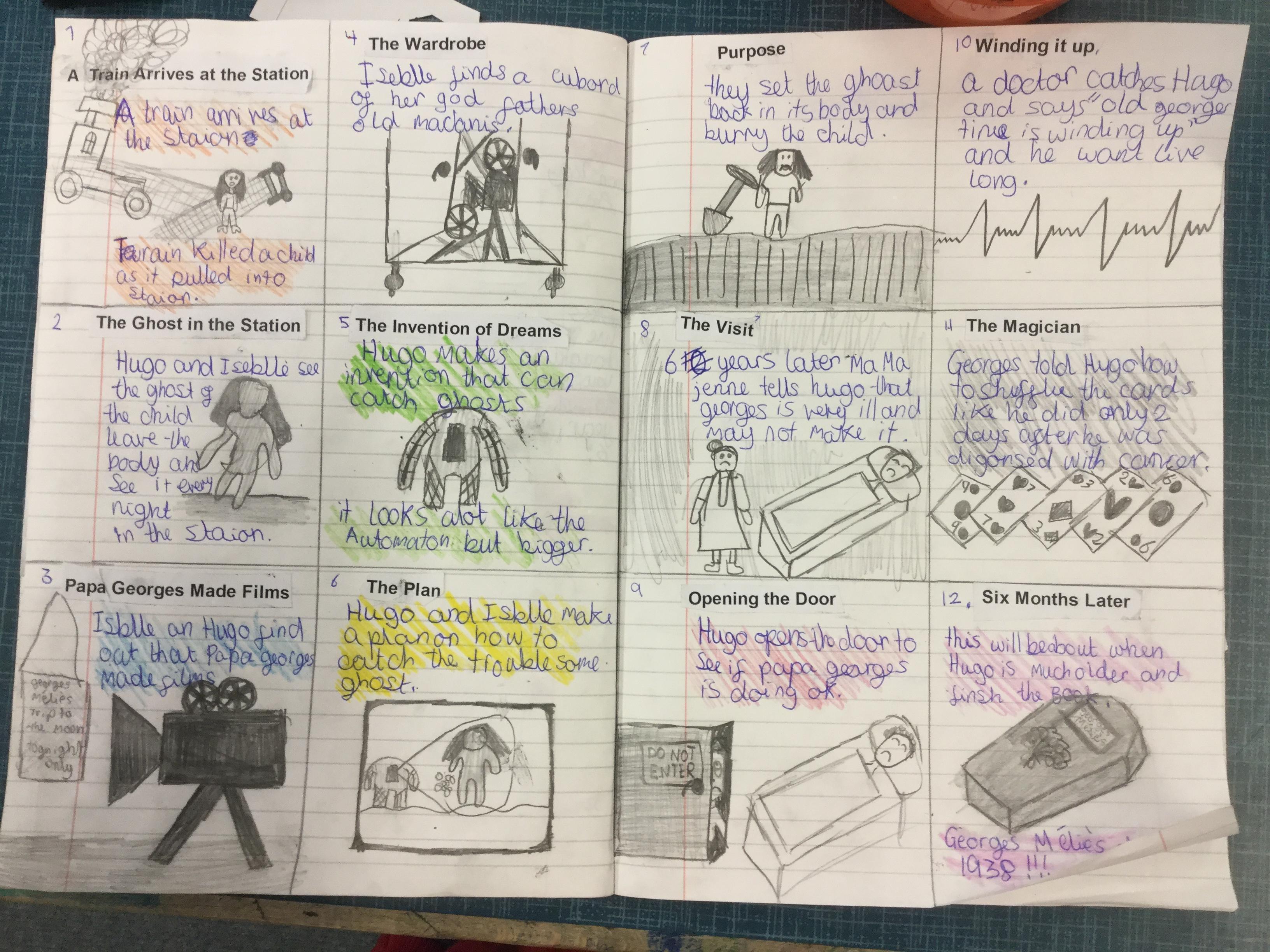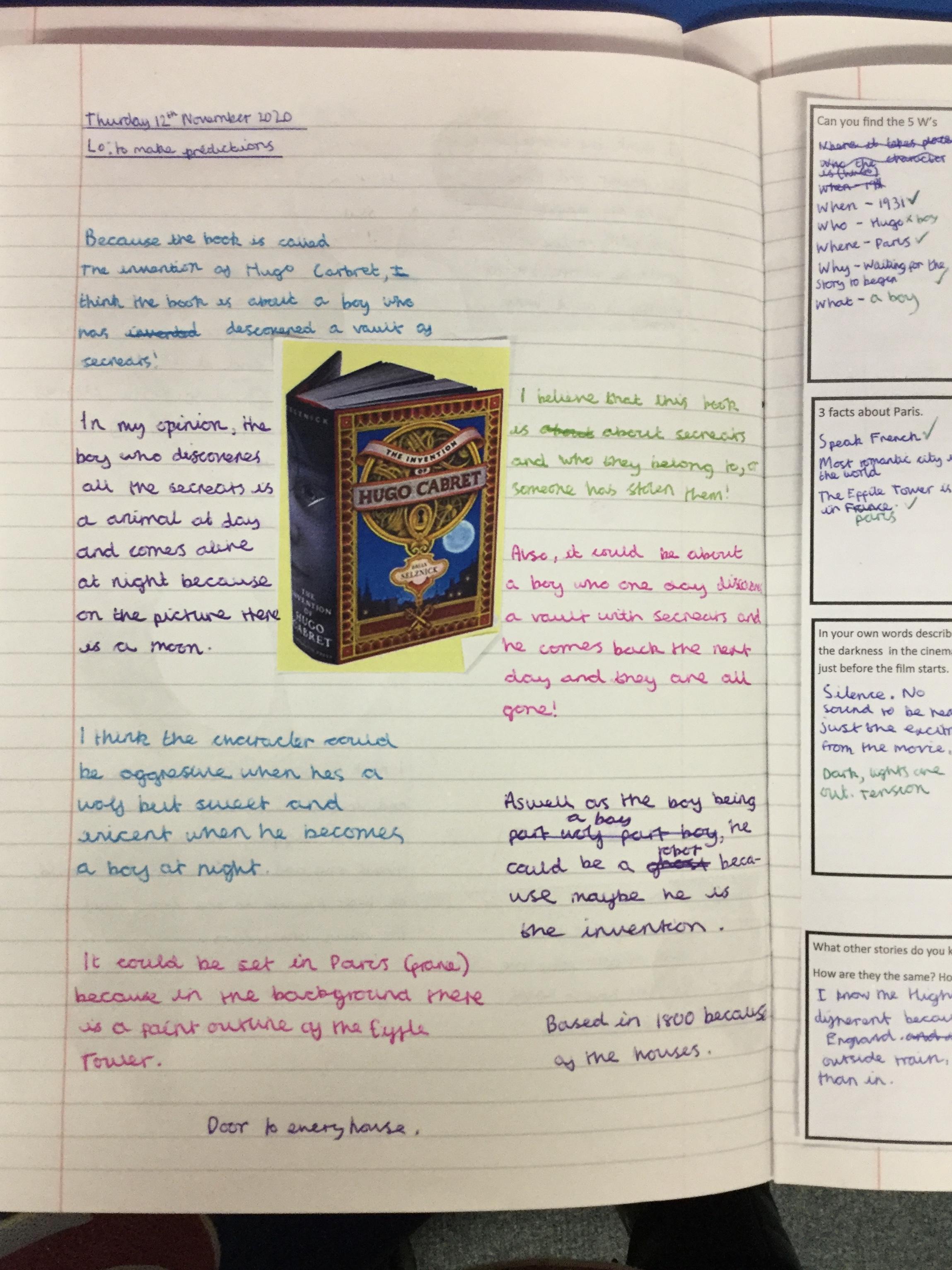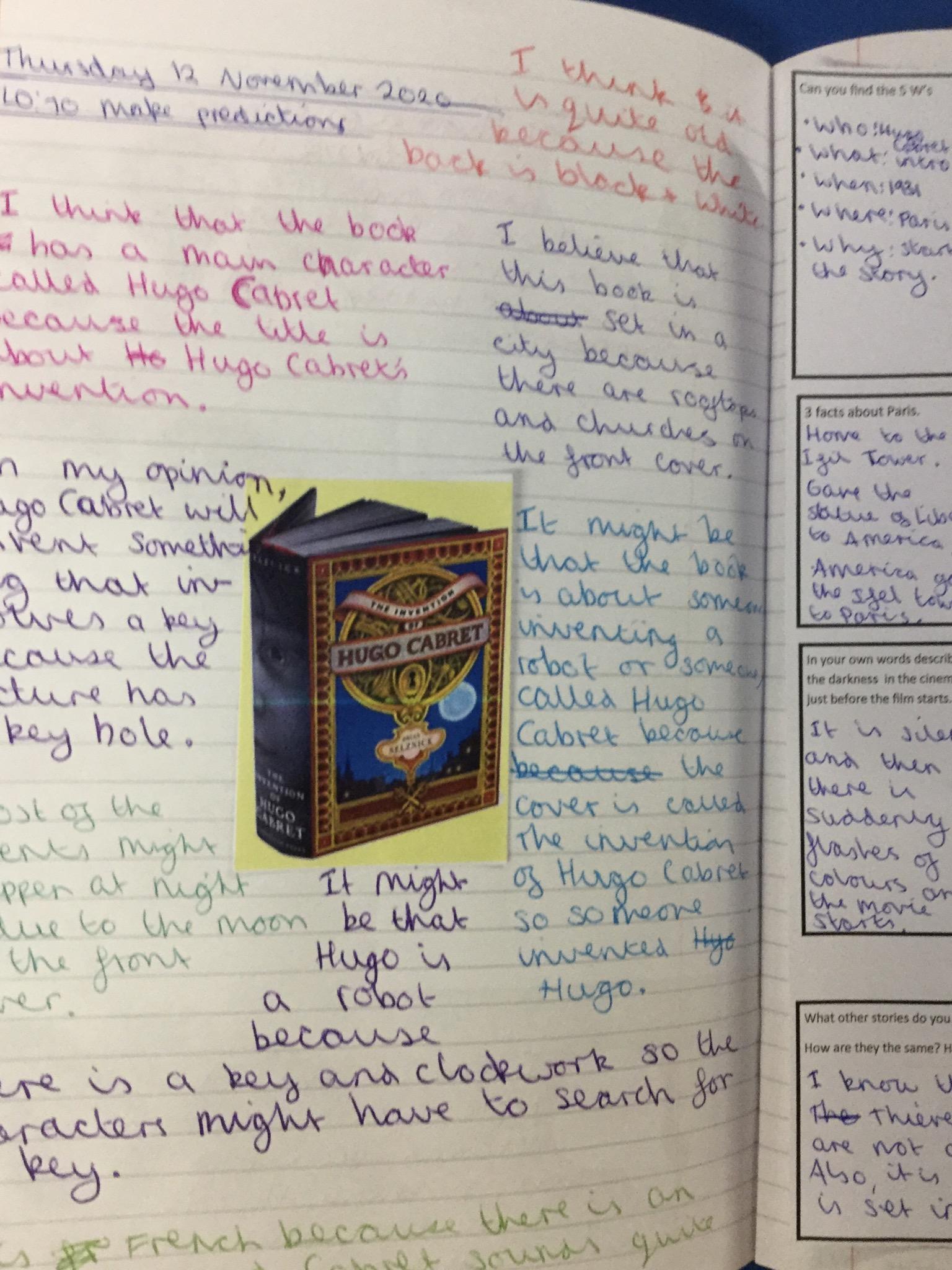 We have begun our new book: Brian Selznick’s The invention of Hugo Cabret’. We made predictions based on the front cover of the novel, made inferences about Hugo based on his notebook and what we have learnt about his room. We have retrieved information from the text to created diagrams of Hugo’s room in the train station in the style of Selznick.