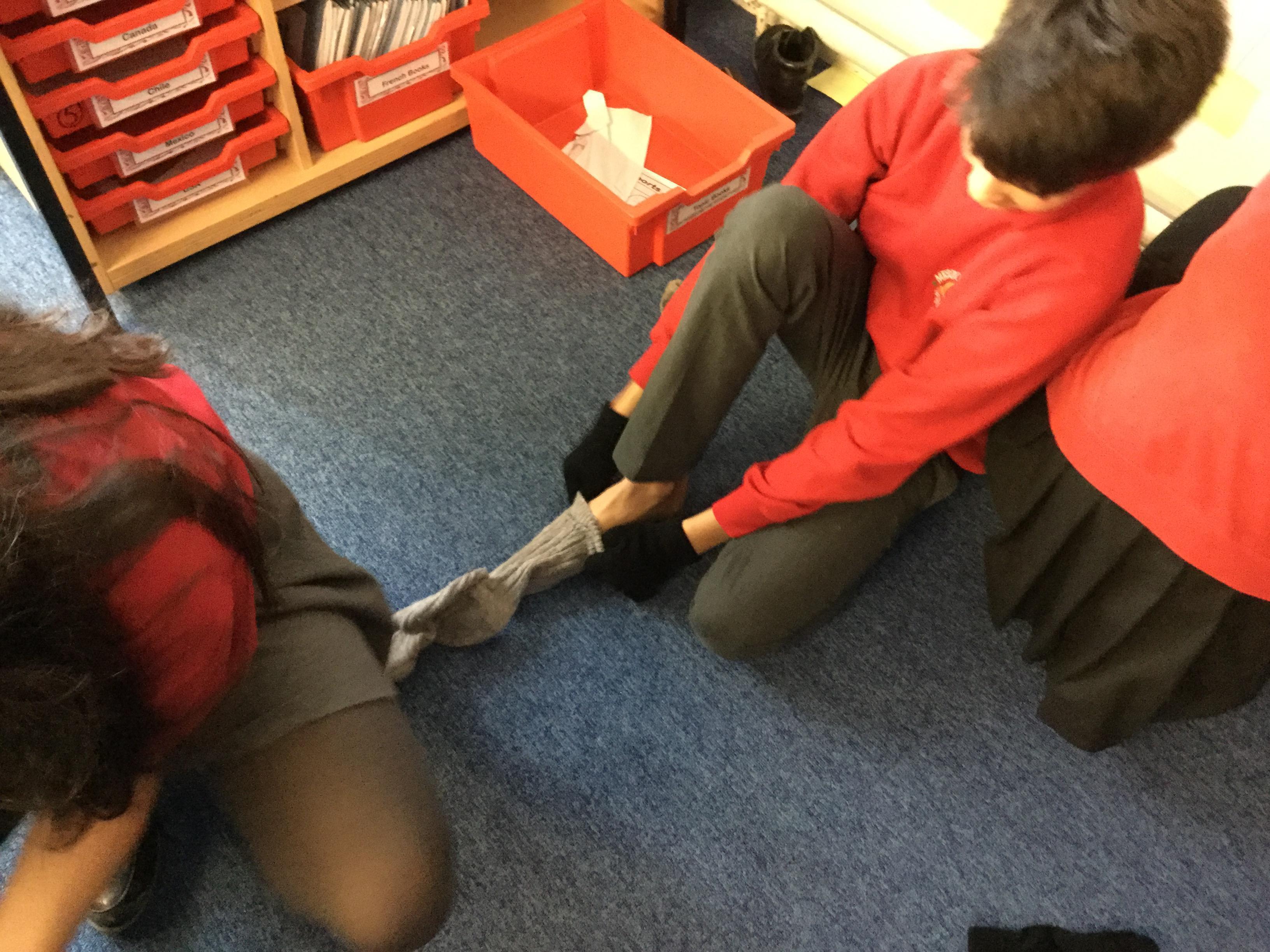 As part of our topic we have been learning about life in the trenches.  During the winter, especially 1916/17, the soldiers suffered in the extreme cold.  To give the children an idea of what that was like we asked willing volunteers to wear frozen gloves and socks!!