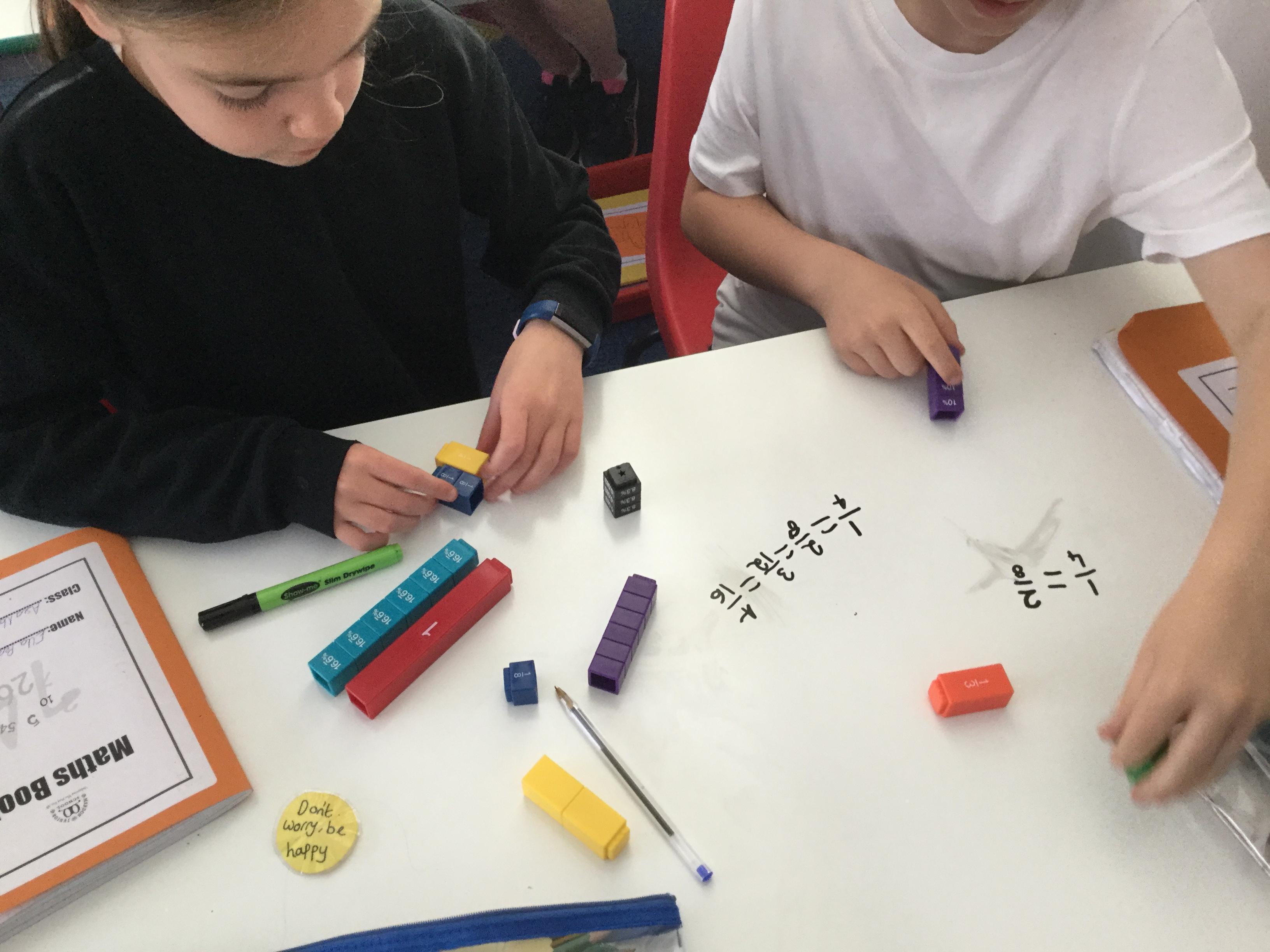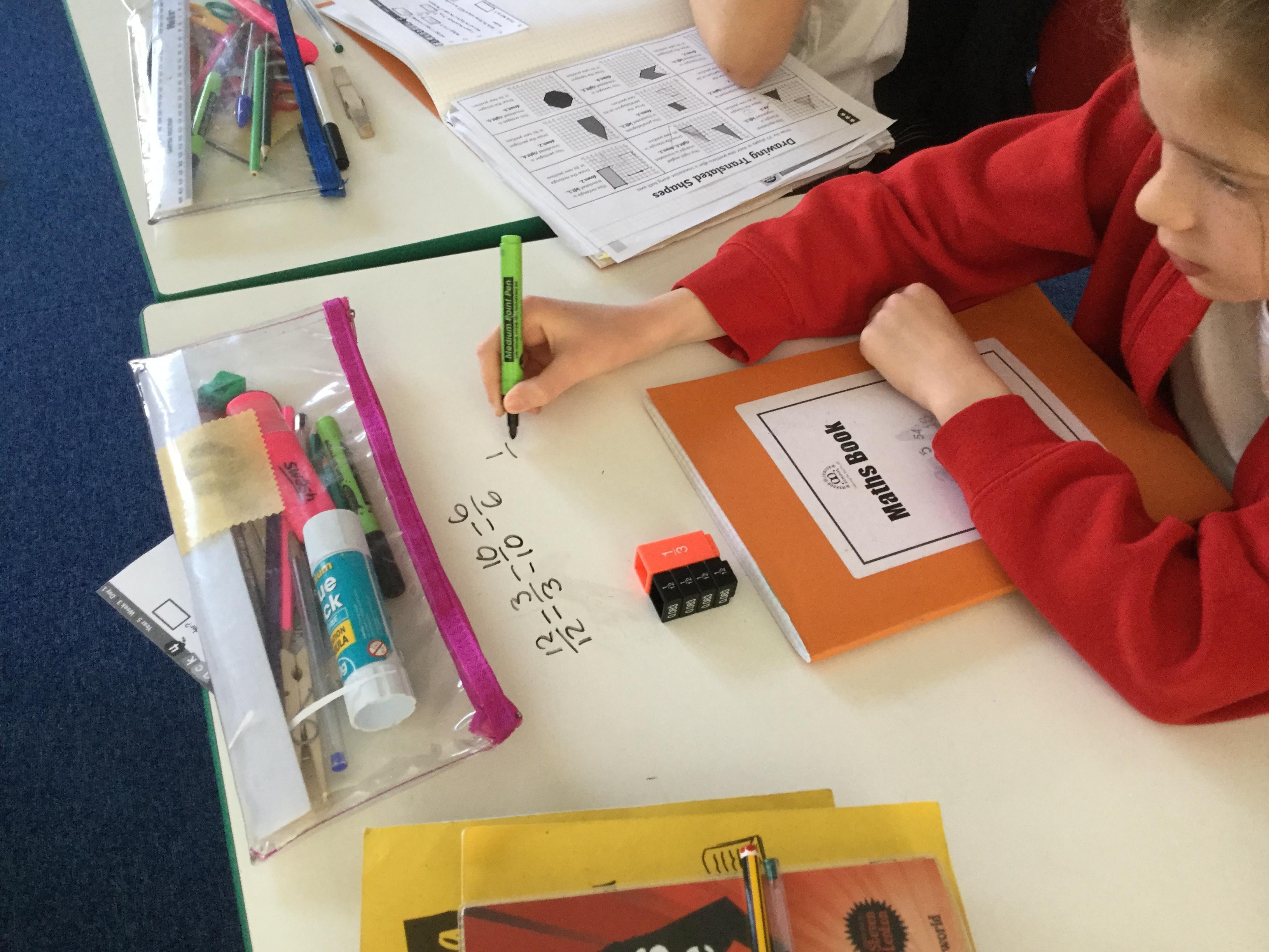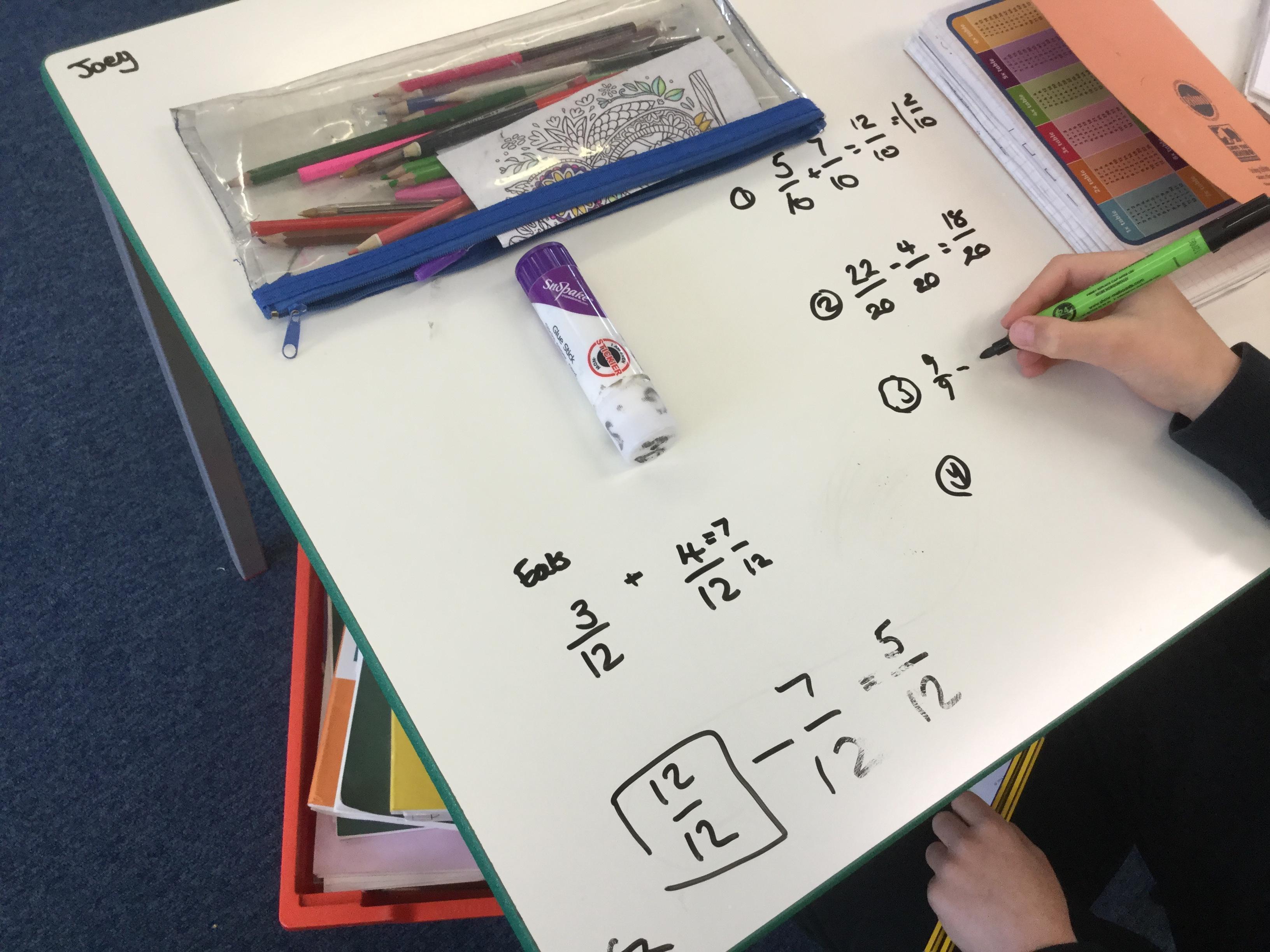 Year 5 are still working hard on fractions, this week continually using their whiteboard tables to help each other figure out what to when we add and subtract fractions with same and different denominators.