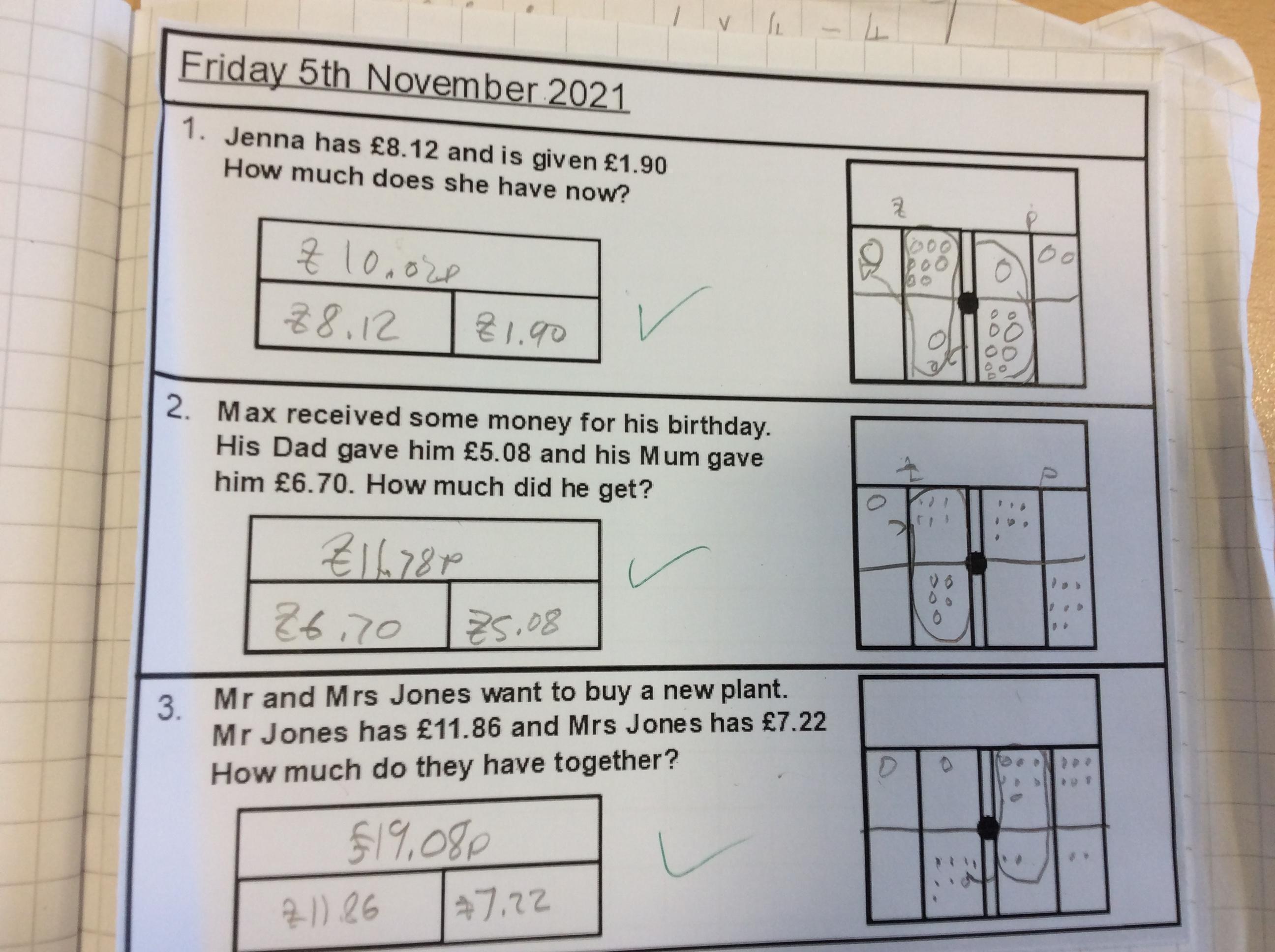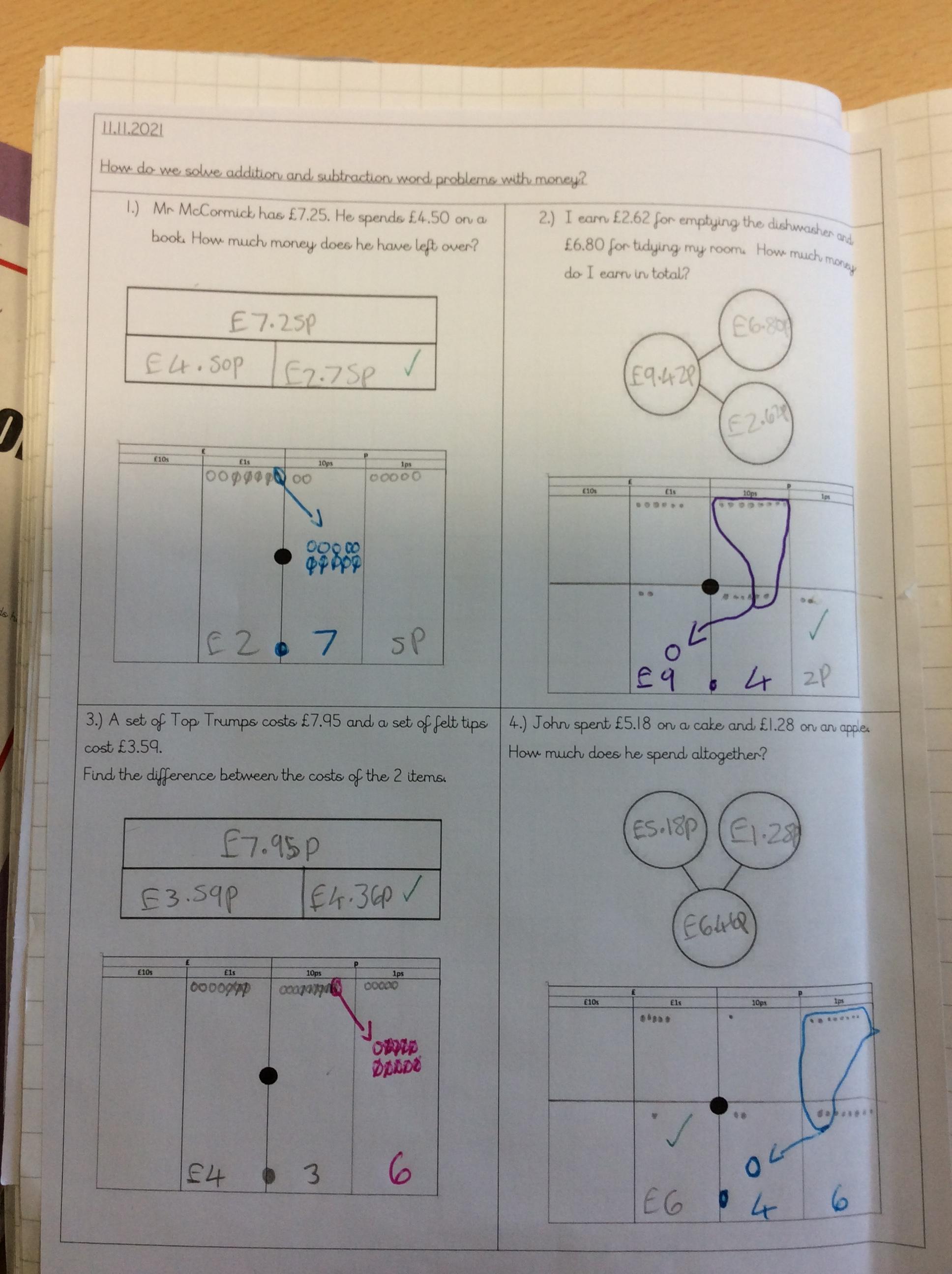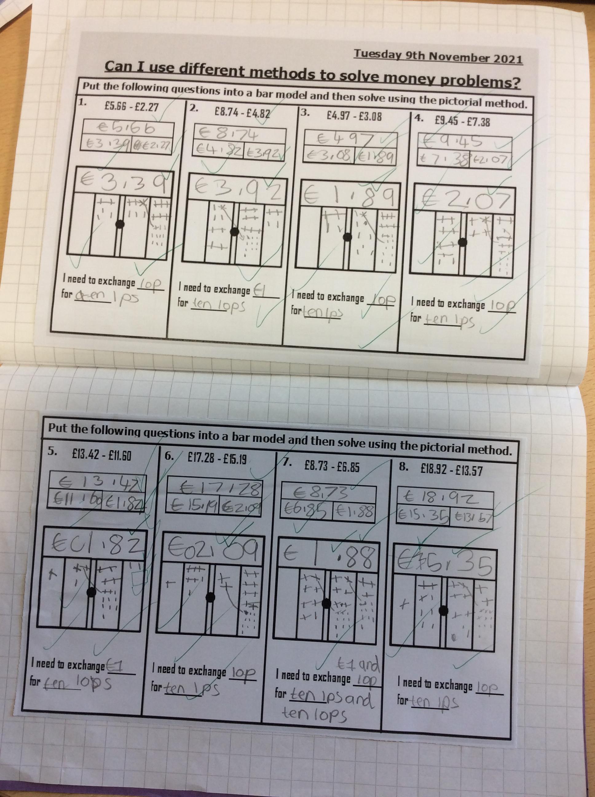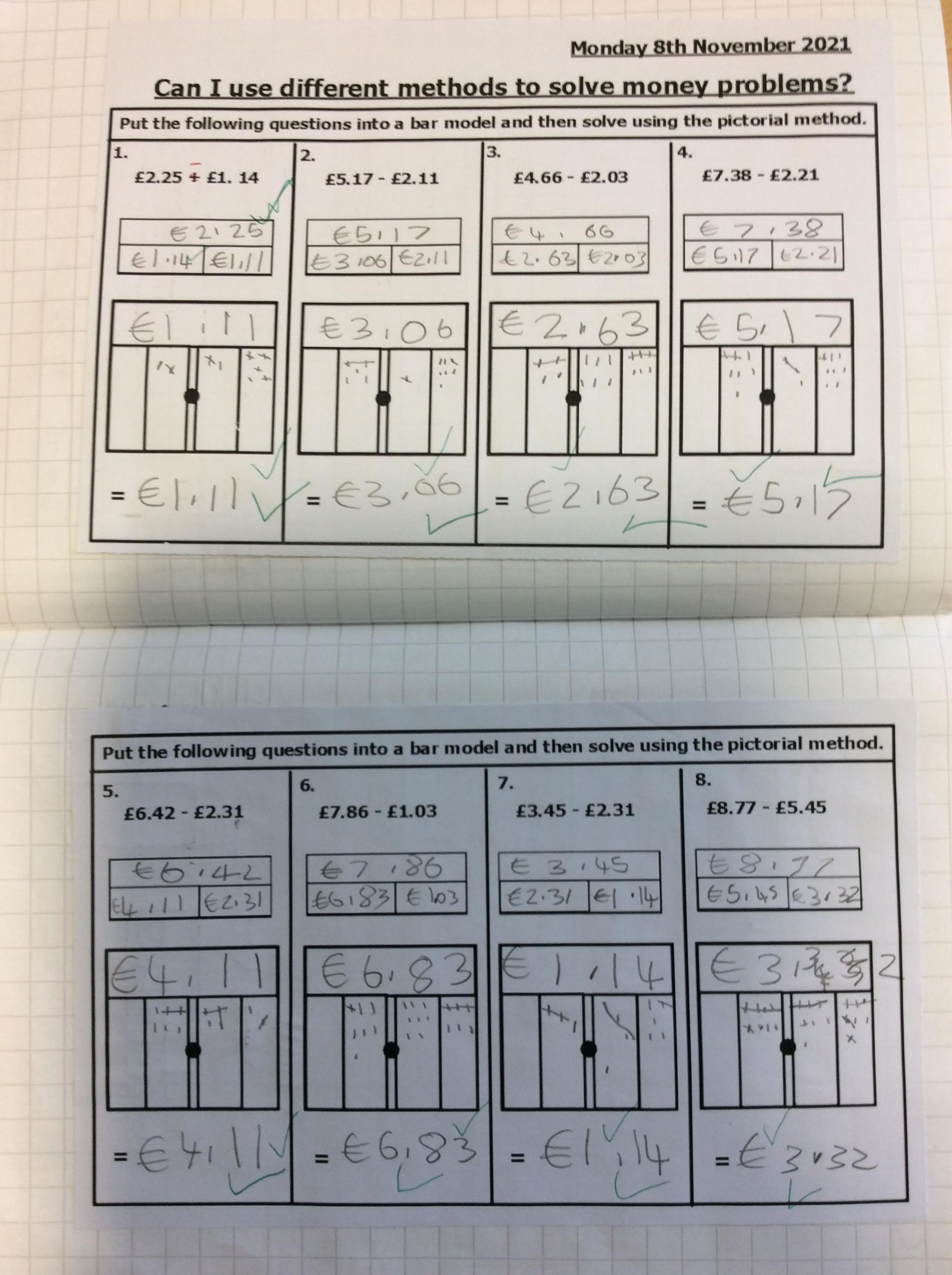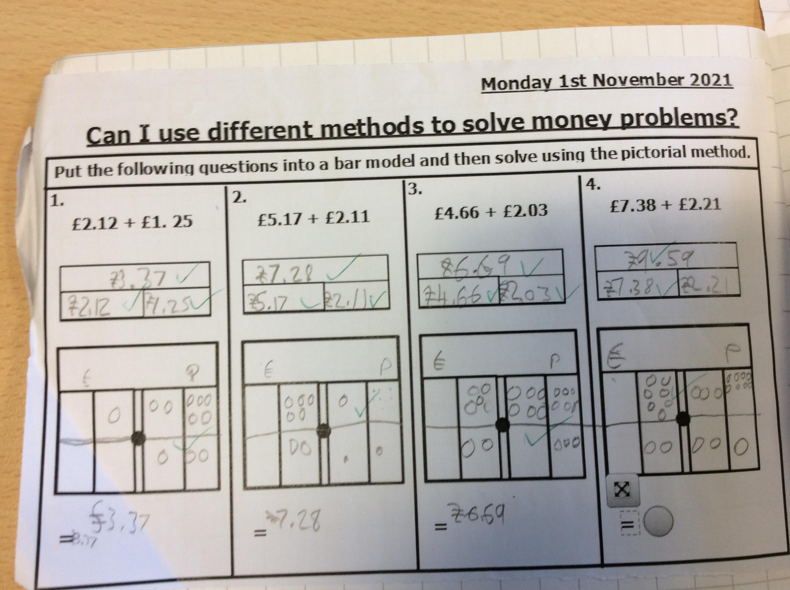 This week, we have been focusing on solving addition and subtraction questions pictorially using money.
