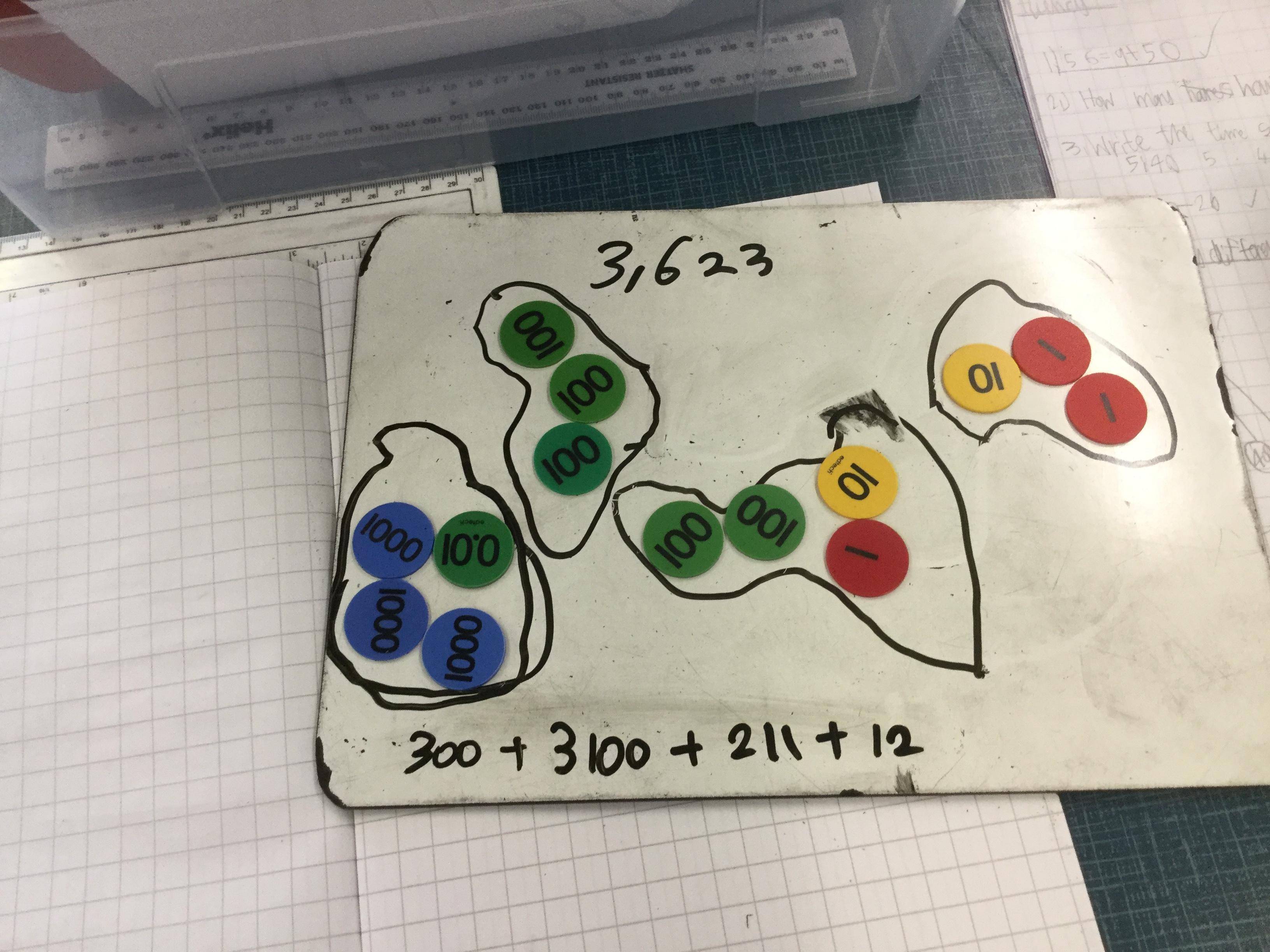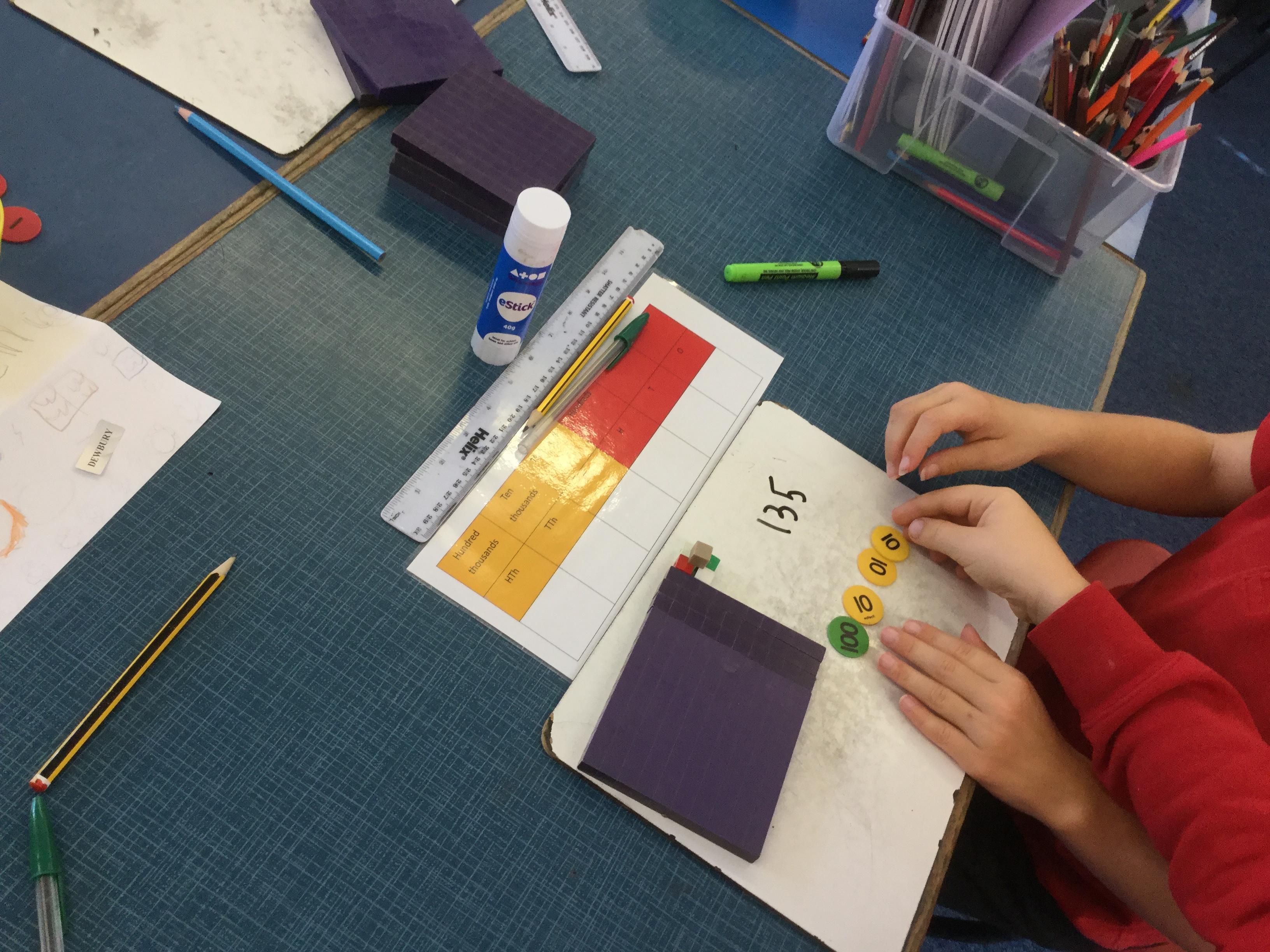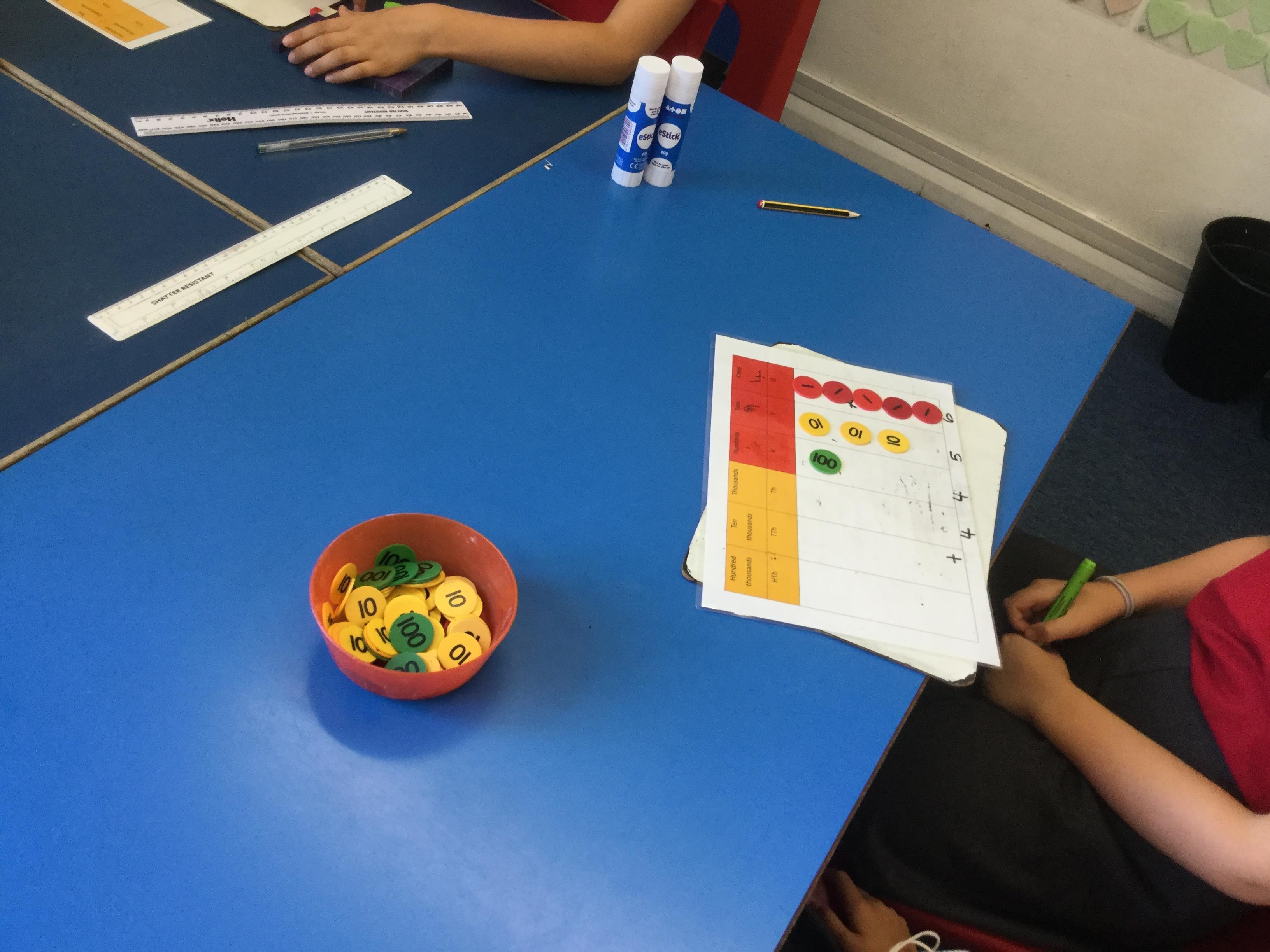 Using counters and working in pairs, we investigated different ways of partitioning numbers we started by partitioning into, for example, 2,456= 2,000+400+50+6 and then we went further and partitioned in more flexible ways by mixing the different place value counters. For example, 2,456=1000+1400+40+16. We found out there were many ways to partition the numbers!