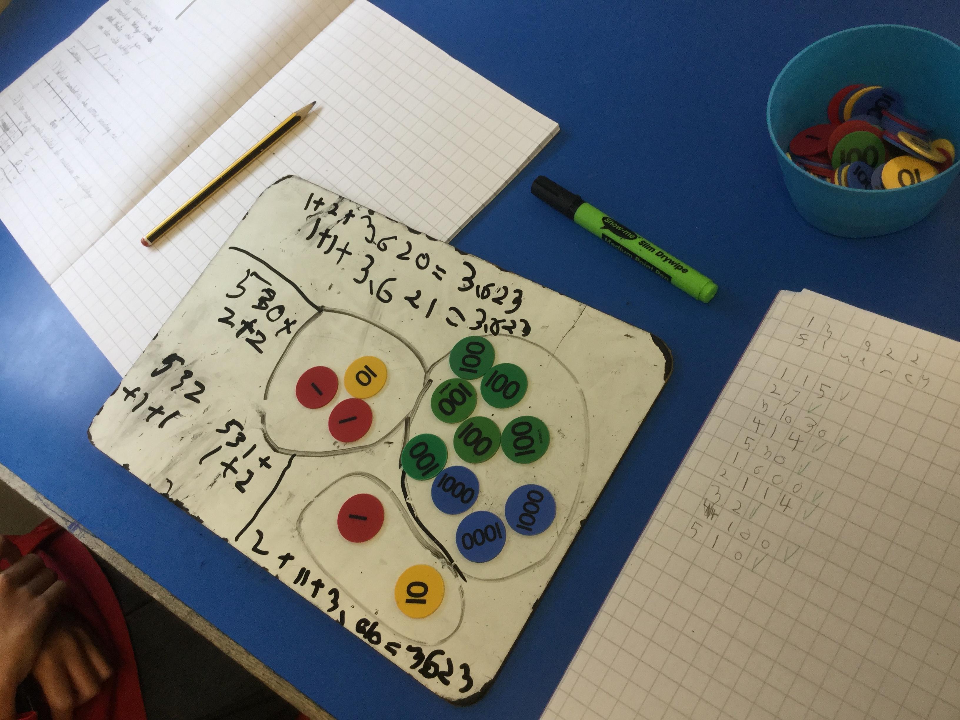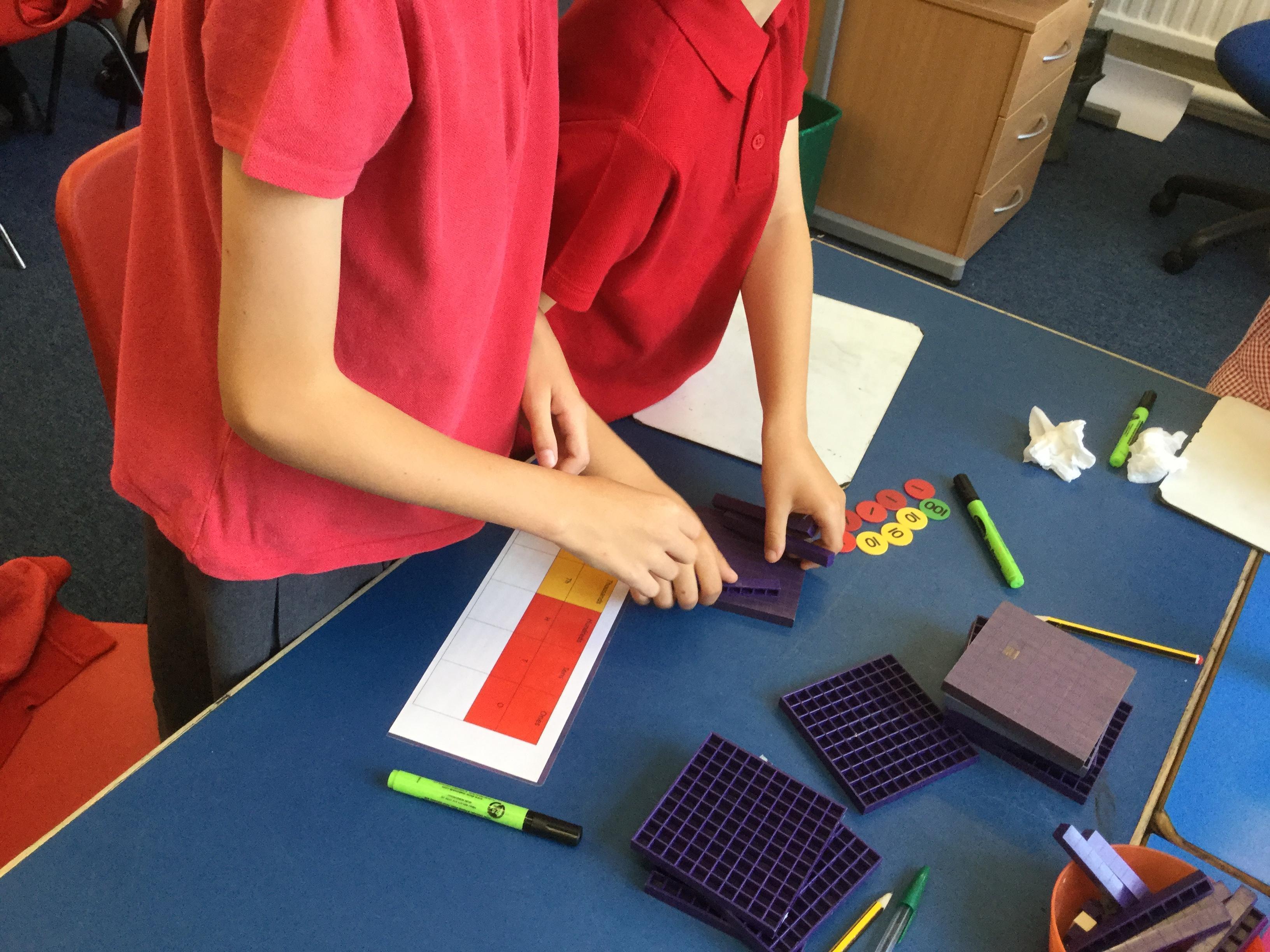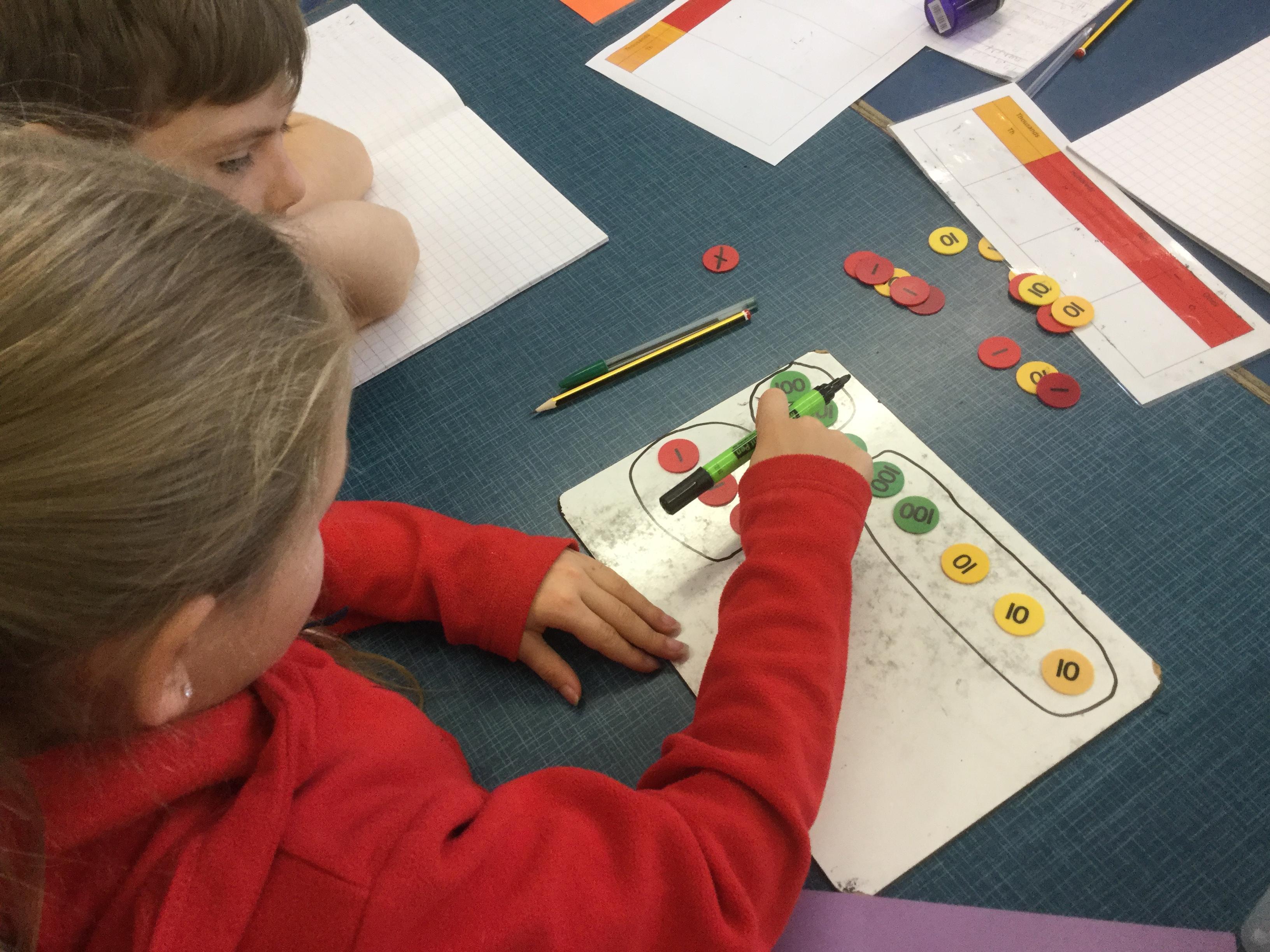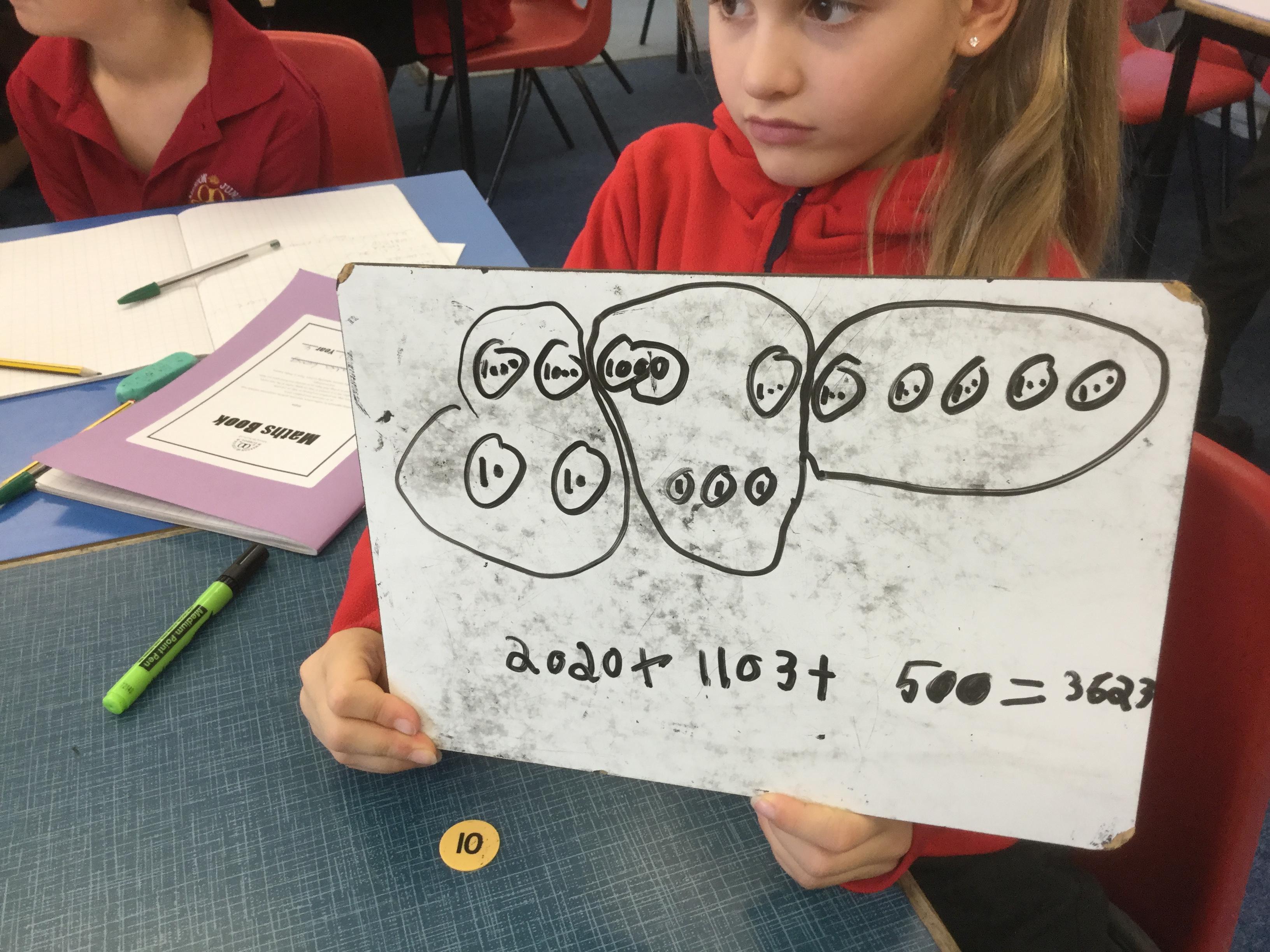Using counters and working in pairs, we investigated different ways of partitioning numbers we started by partitioning into, for example, 2,456= 2,000+400+50+6 and then we went further and partitioned in more flexible ways by mixing the different place value counters. For example, 2,456=1000+1400+40+16. We found out there were many ways to partition the numbers!