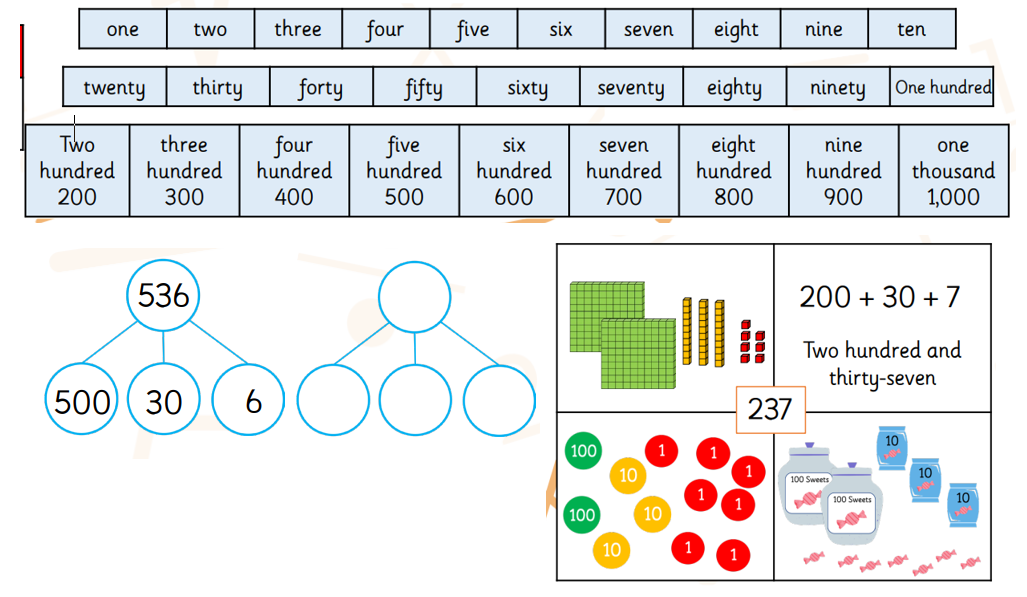 After revising our Place Value work on numbers up to 100 from Year 2, we started to look at bigger numbers (up to 1000). We interpreted different representations, partitioned them in different ways and used stem sentences to help us describe them.
