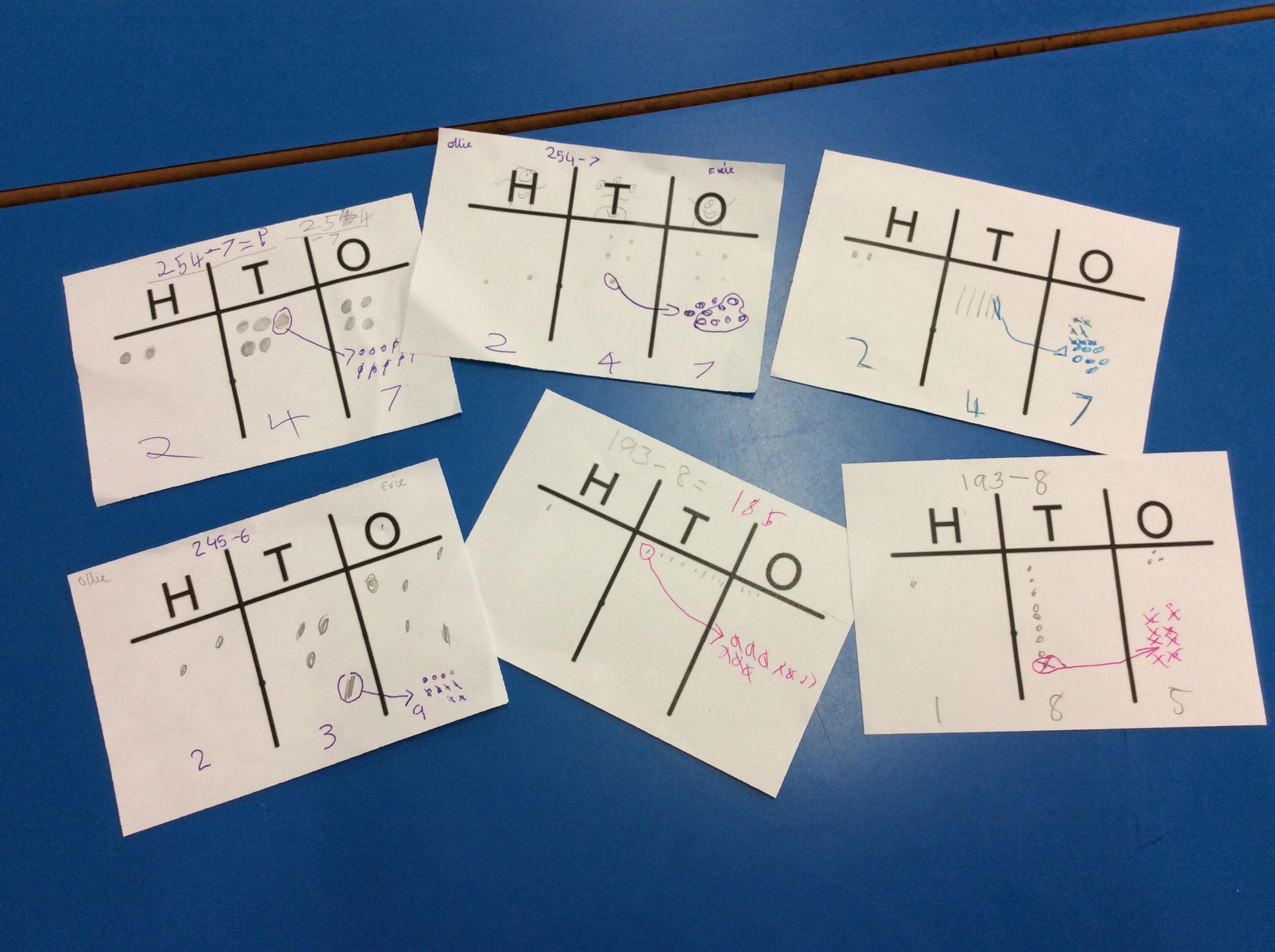 Next, we looked at how to show the exchange when solving questions like 436 + 7. We worked with partners, shared our work on the class whiteboard and did some work in our books.