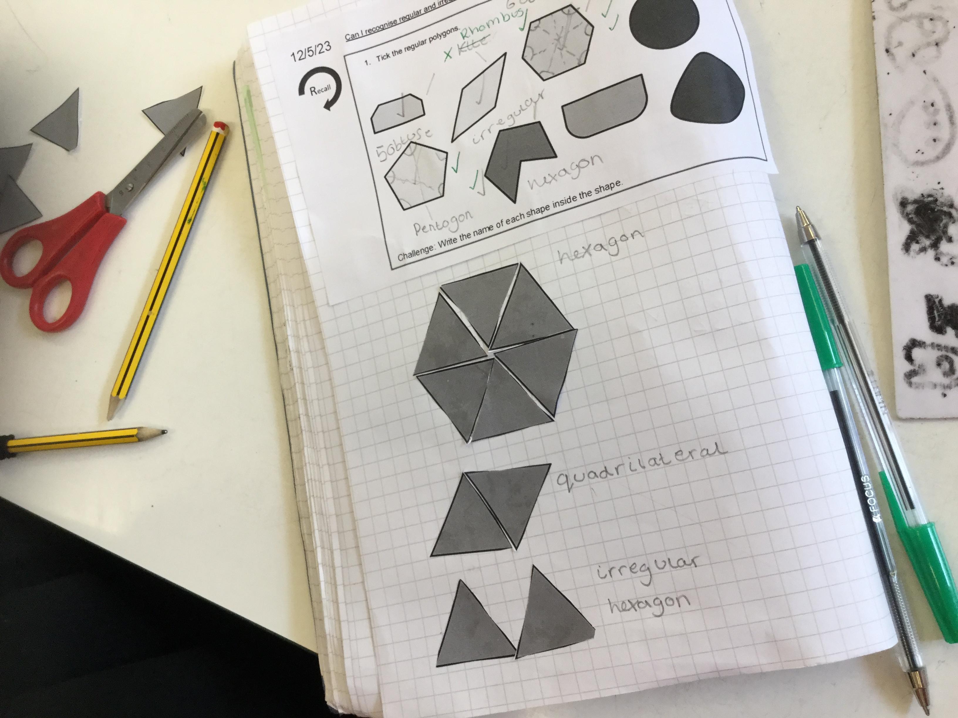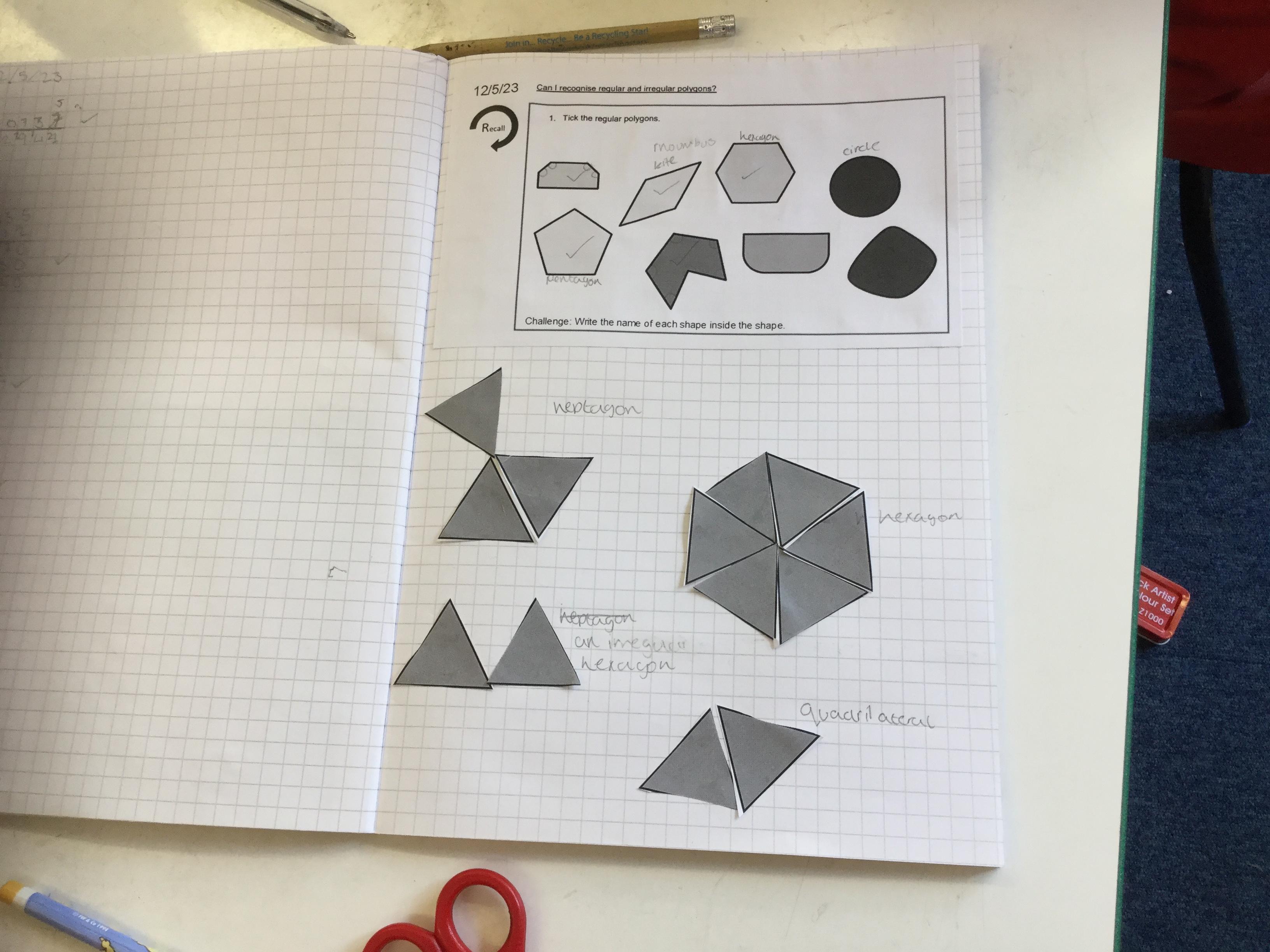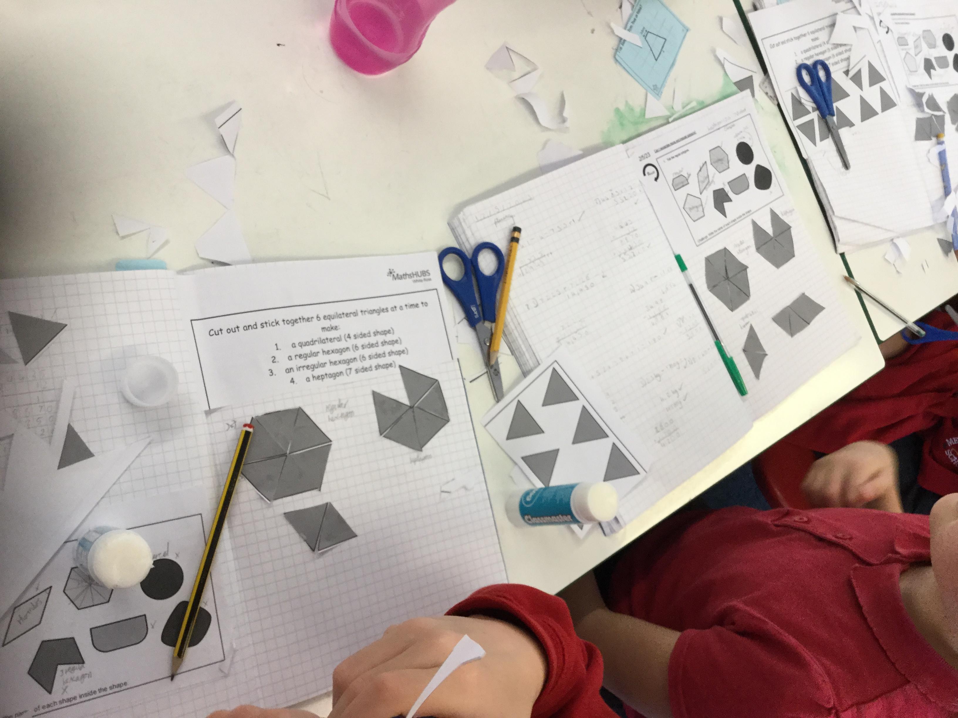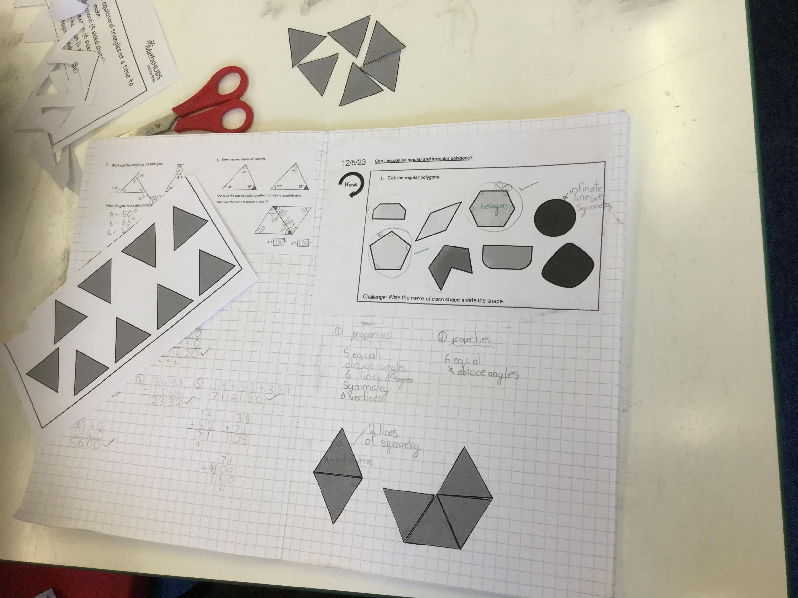 This morning we were exploring regular and irregular polygons. Firstly we had to recall what a polygon was (a closed 2d shape with straight lines) and then discover what made a polygon regular (all sides the same length and all internal angles the same size). Armed with that knowledge we tried making different shapes using equilateral triangles and then labelling the properties we could identify.