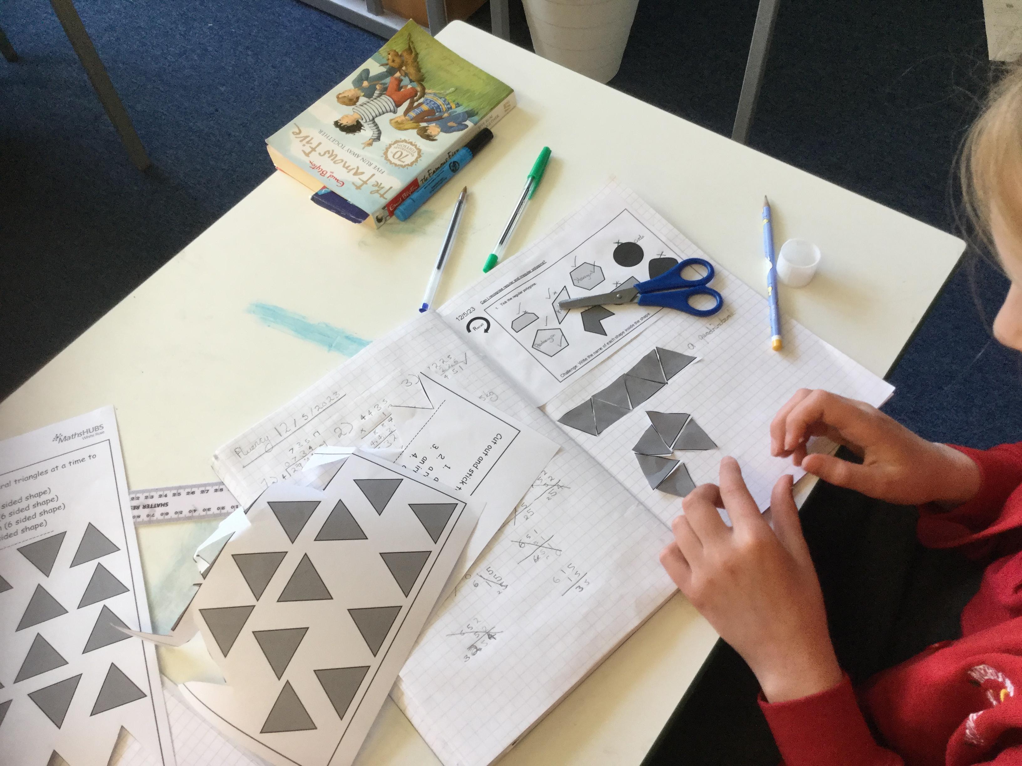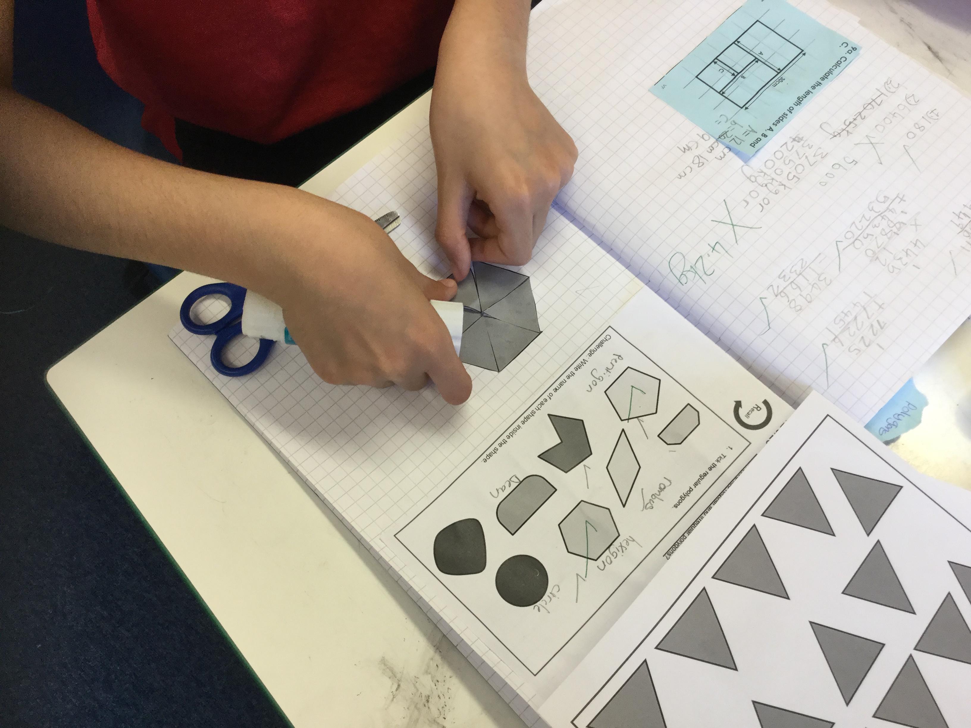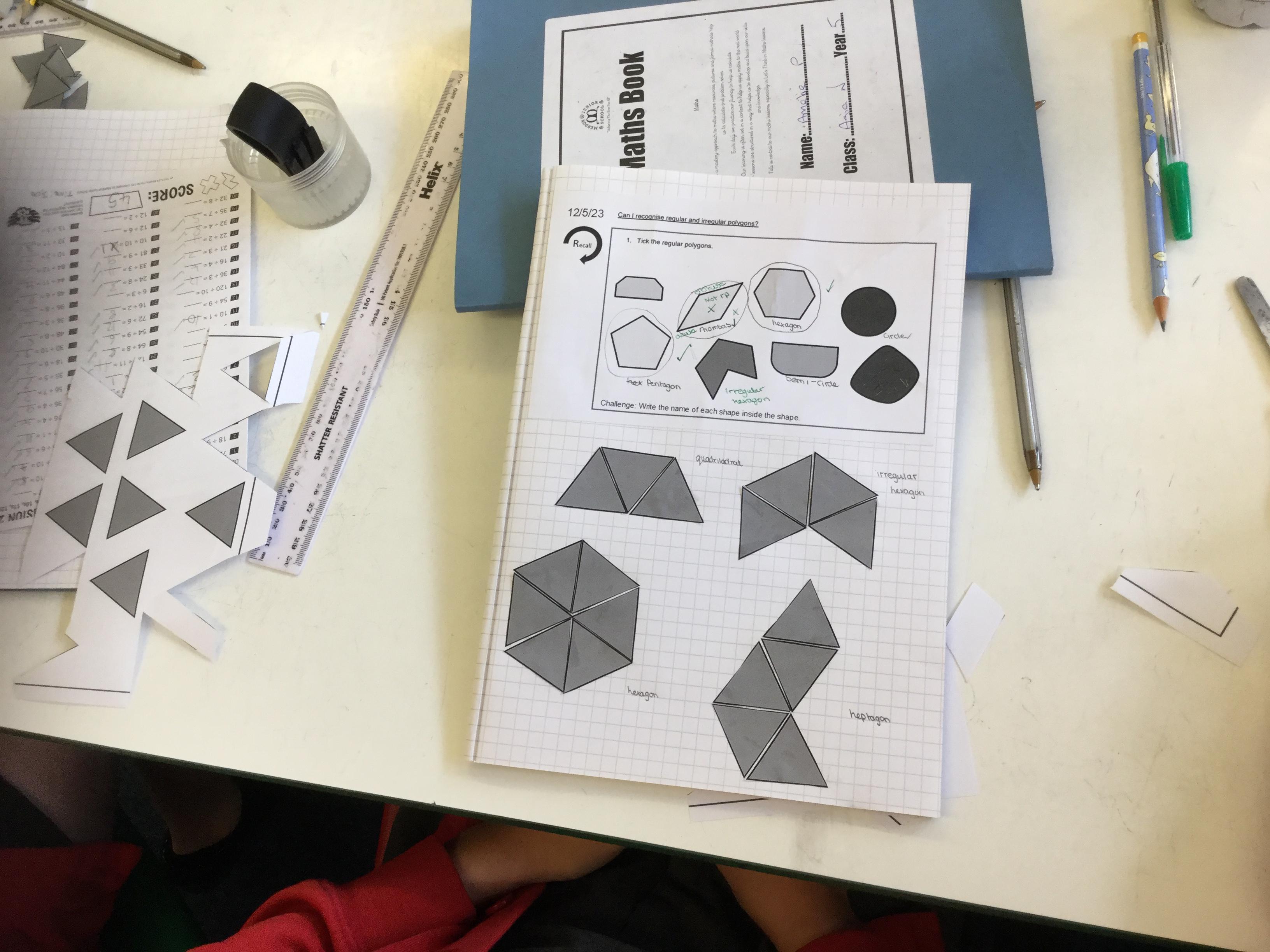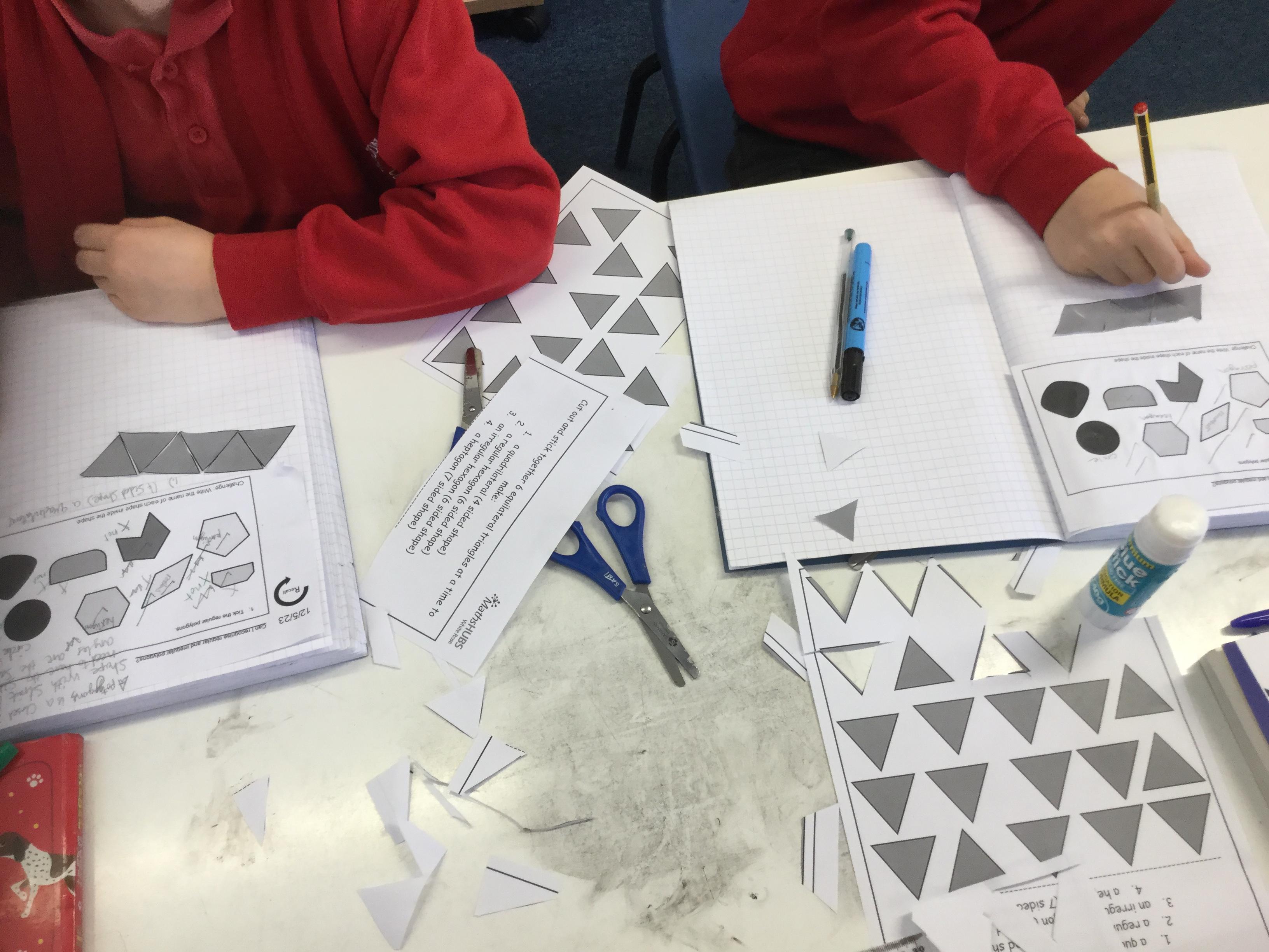 This morning we were exploring regular and irregular polygons. Firstly we had to recall what a polygon was (a closed 2d shape with straight lines) and then discover what made a polygon regular (all sides the same length and all internal angles the same size). Armed with that knowledge we tried making different shapes using equilateral triangles and then labelling the properties we could identify.