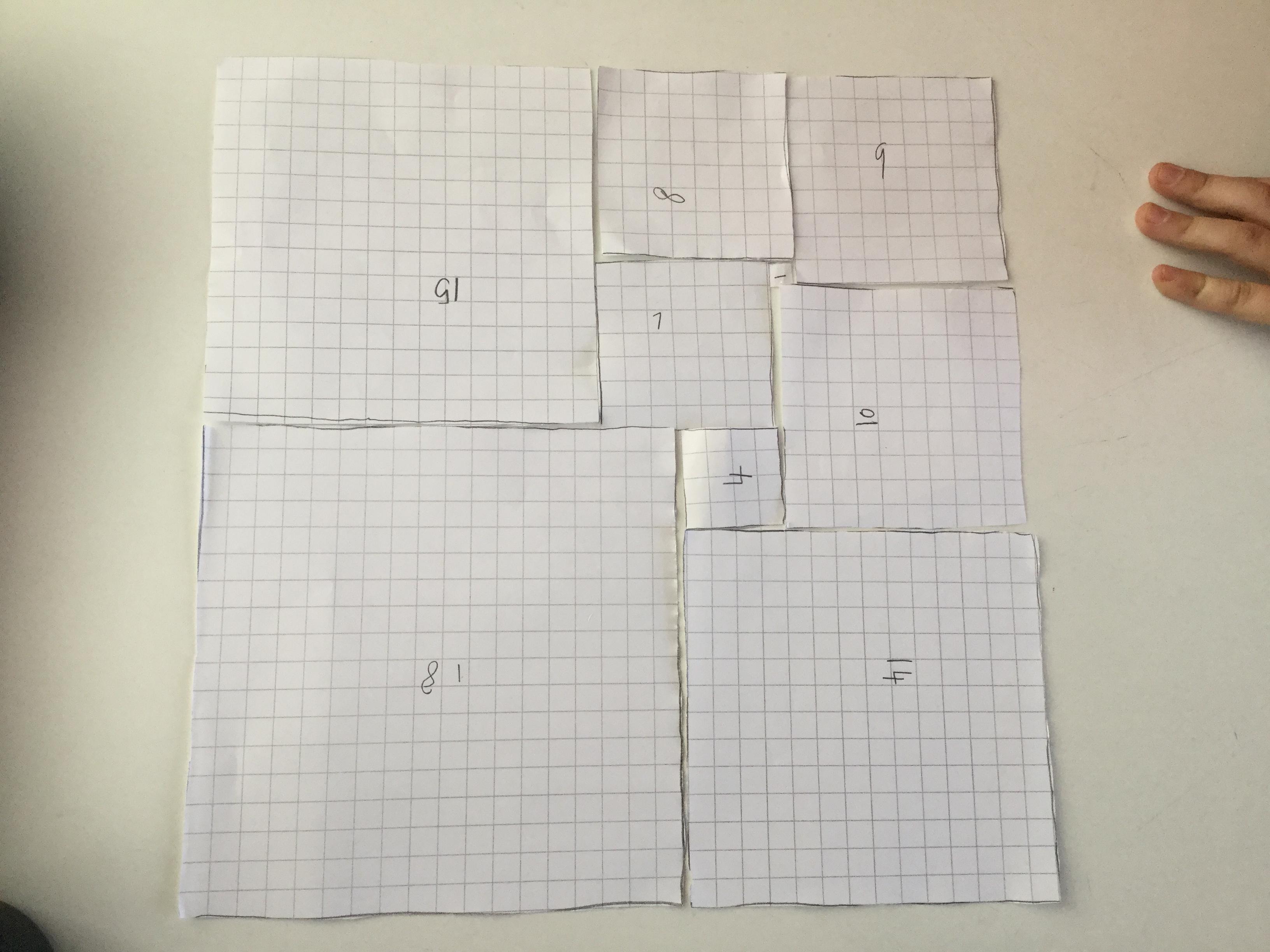 Secondly we were challenged to cut out 9 different sized squares, with sides ranging from 1cm to 18cm, and see if we could fit them all together into one rectangle!
