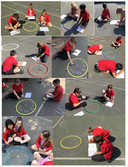 In Maths this week we have been having great fun doing some outdoor learning and creating our own clocks using a P.E hoop, sticks and chalk! We also played 'Telling the Time Bingo' too!