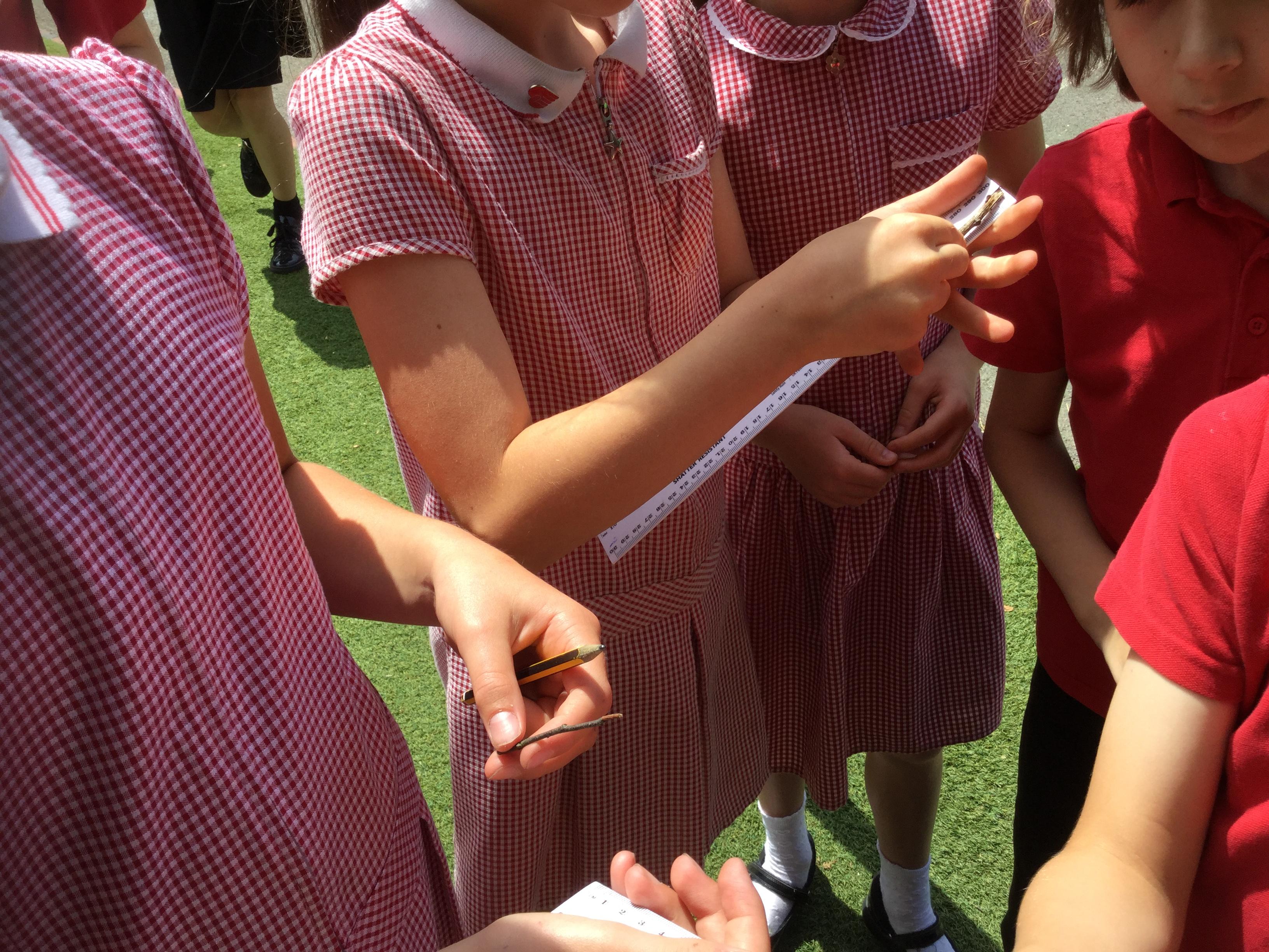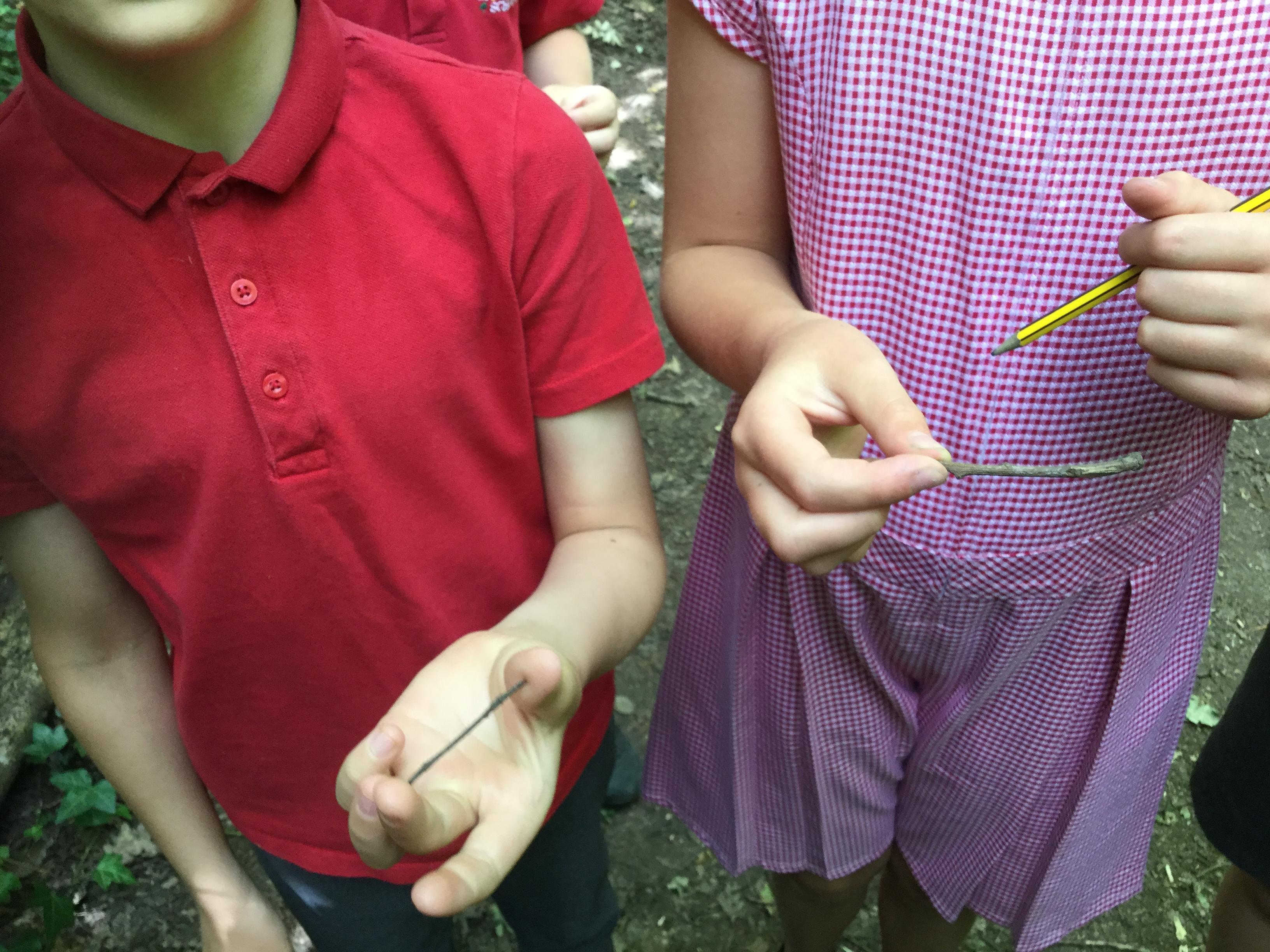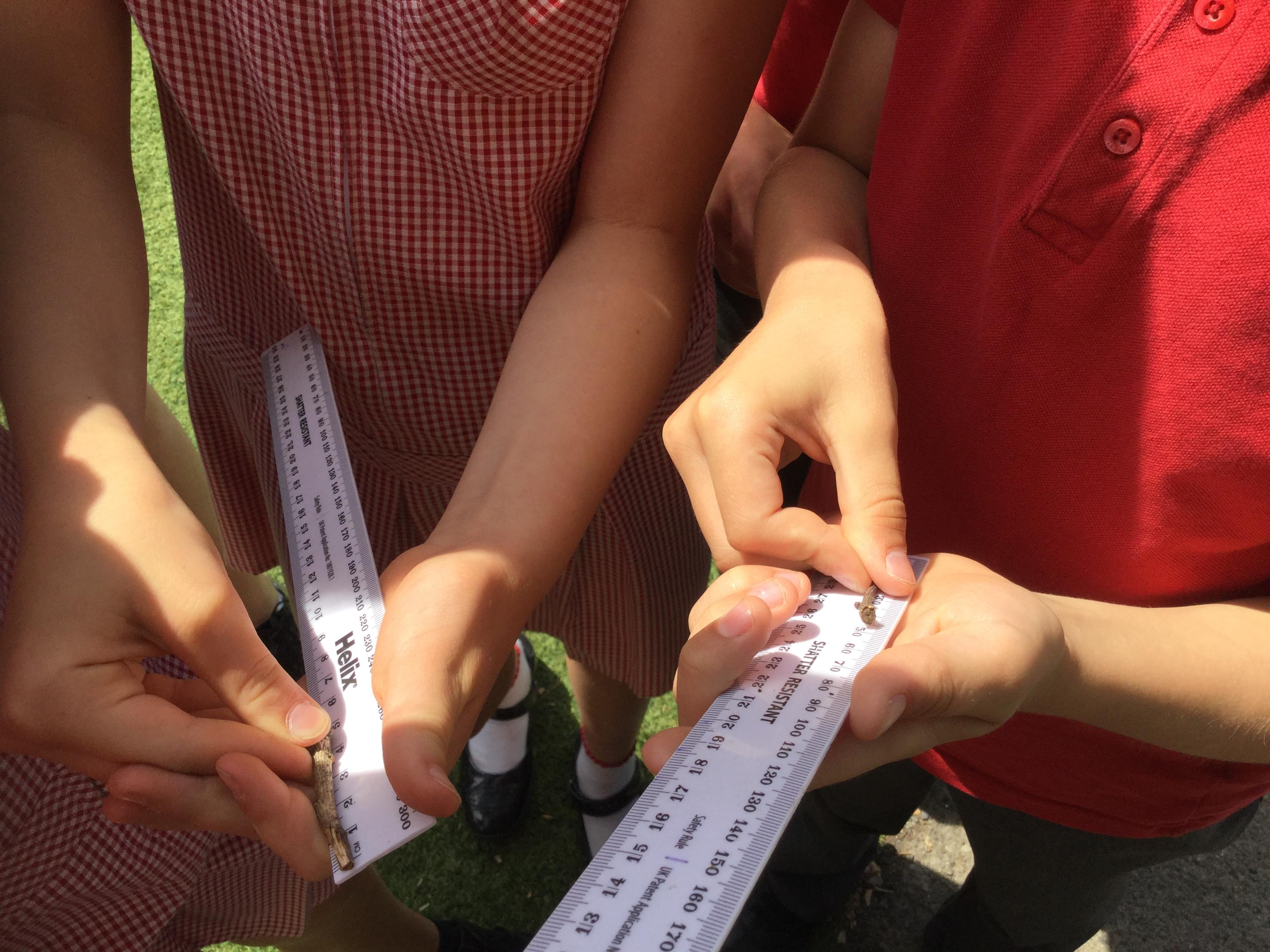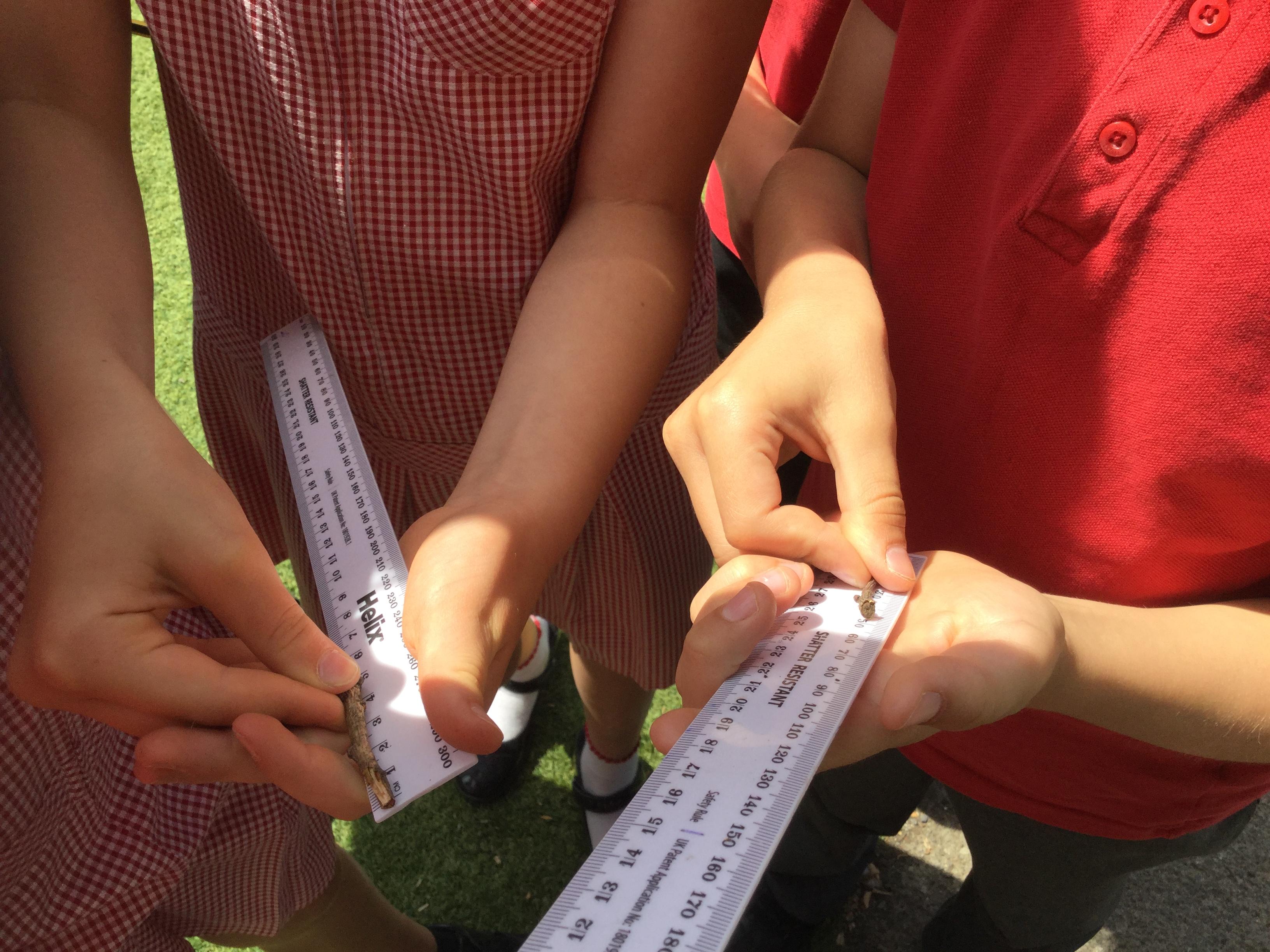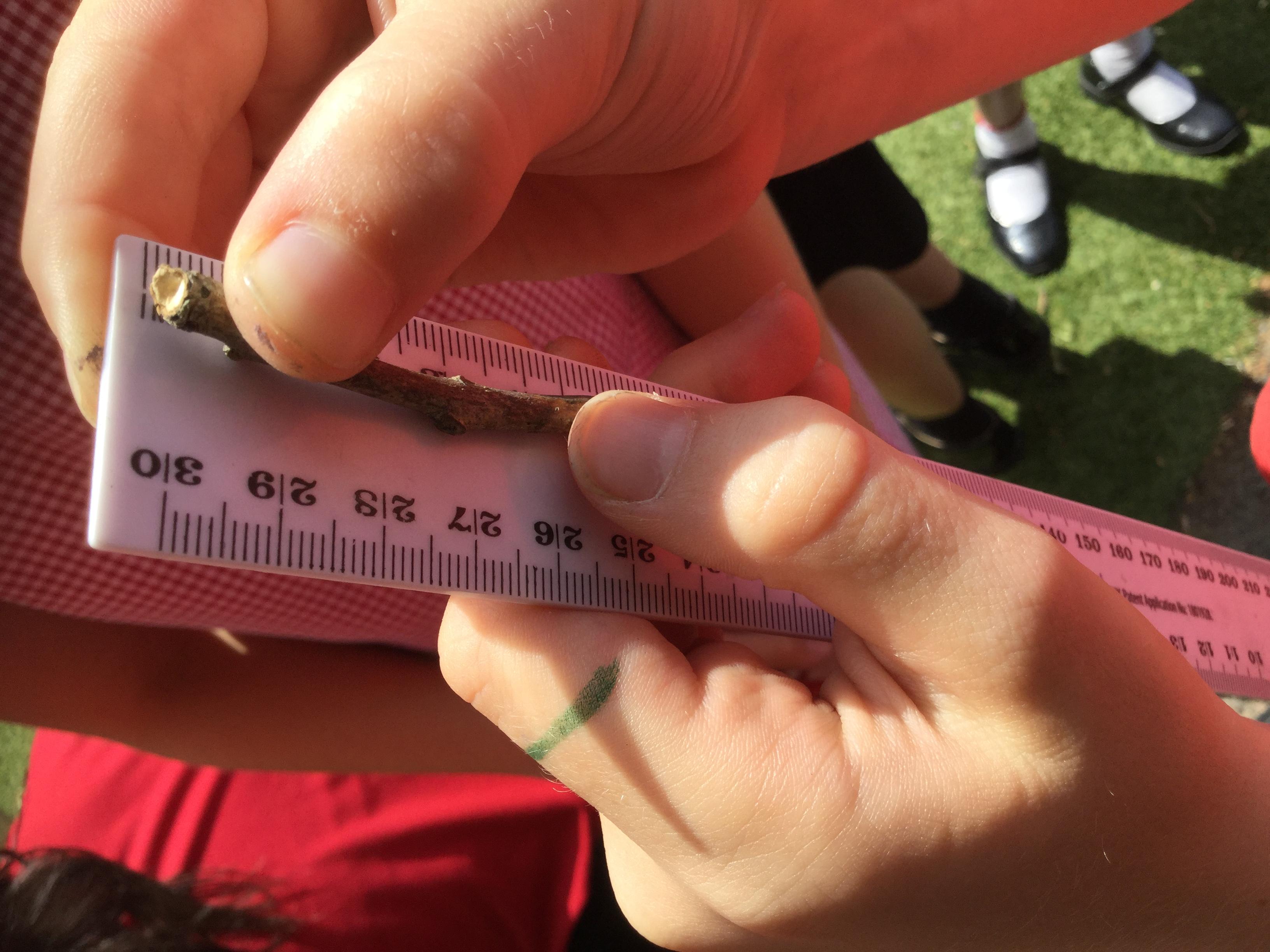 Today we started our Maths unit on measures. We thought about the different units of measure we knew and what they would be used for. Then we headed outside to estimate and measure objects. First the children were challenged to find something in the copse that was exactly 50mm long. Some of them were incredibly close (although there may have been some cheating with some of them drawing a line on their hands before they left the classroom!)