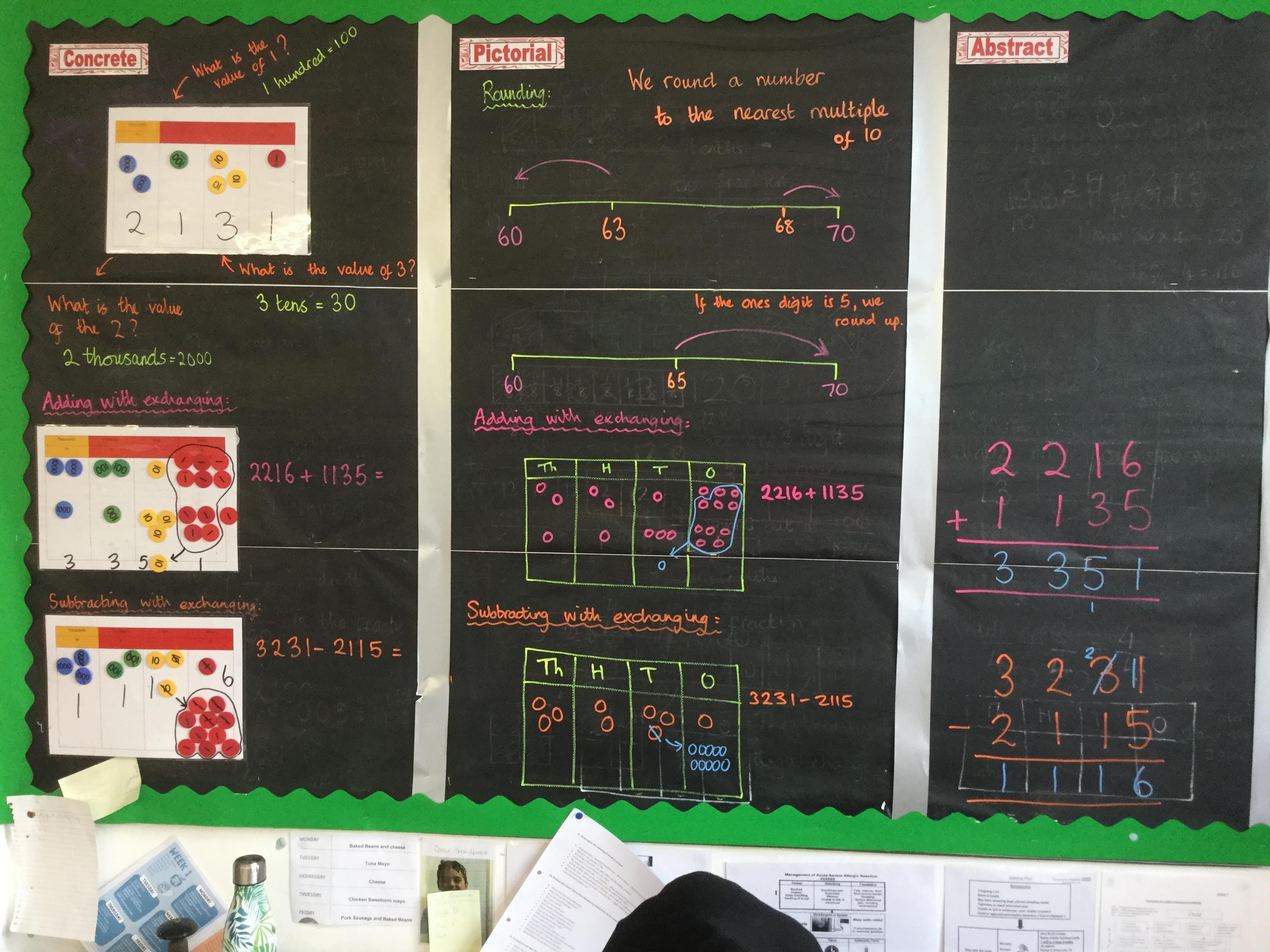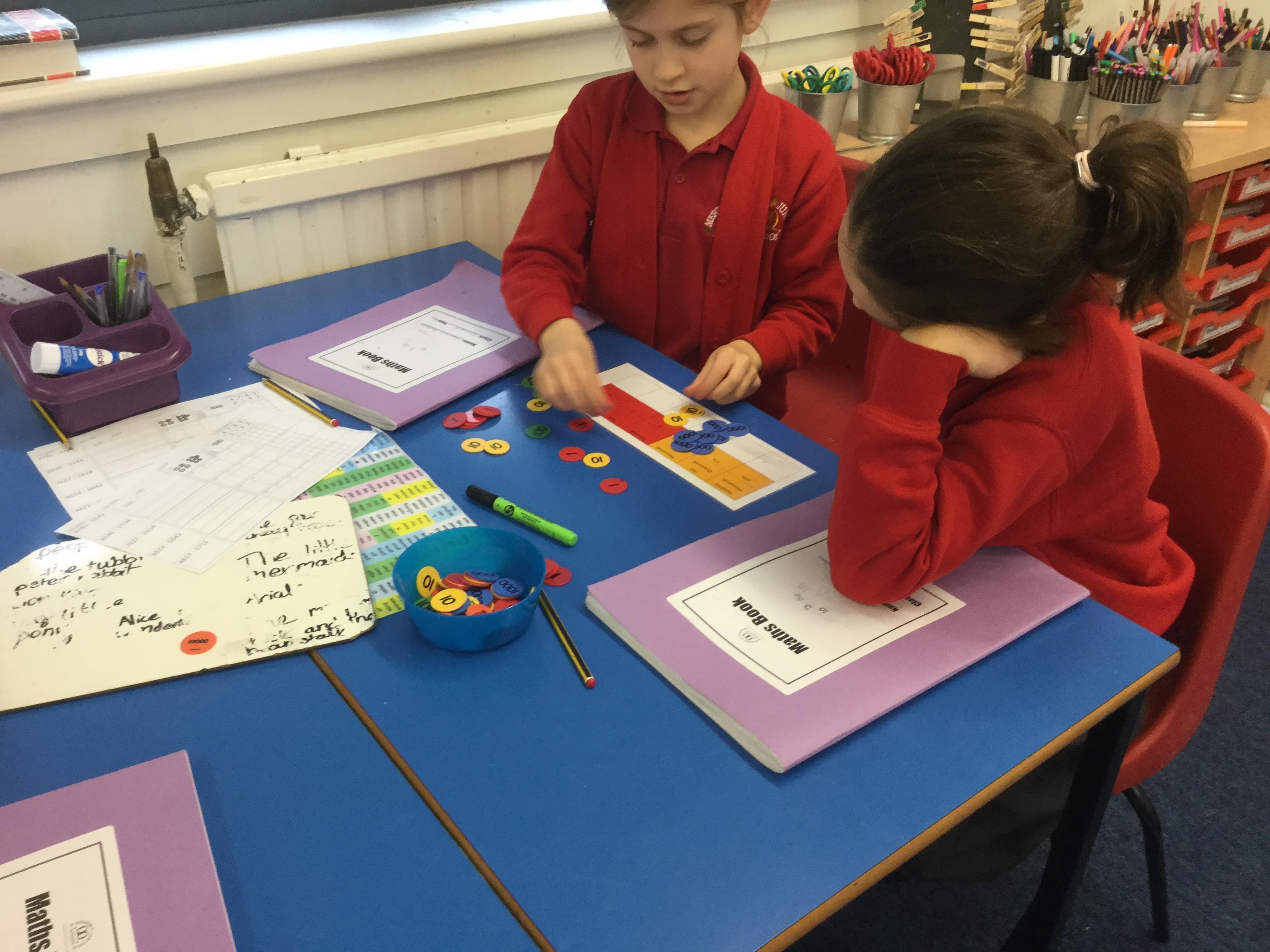 This week, we have been learning to subtract 4 digit numbers. We started by using place value counters so that we could see what happens to the numbers as we subtract. We then drew pictures of the counters as a way of recording. When we were ready, we then subtracted using the abstract method of column subtraction. We learnt how to exchange counters when there are not enough in a column to take away.