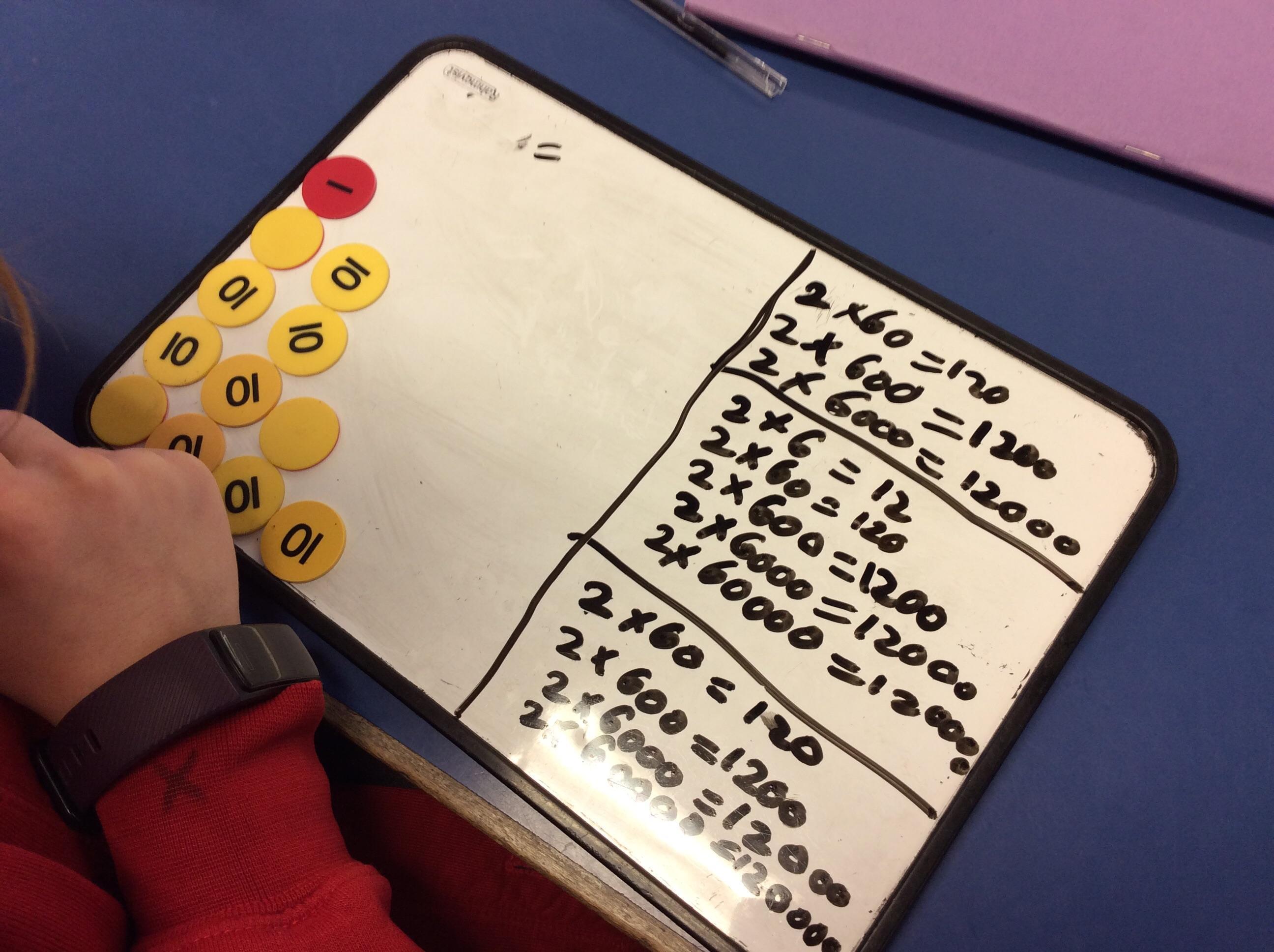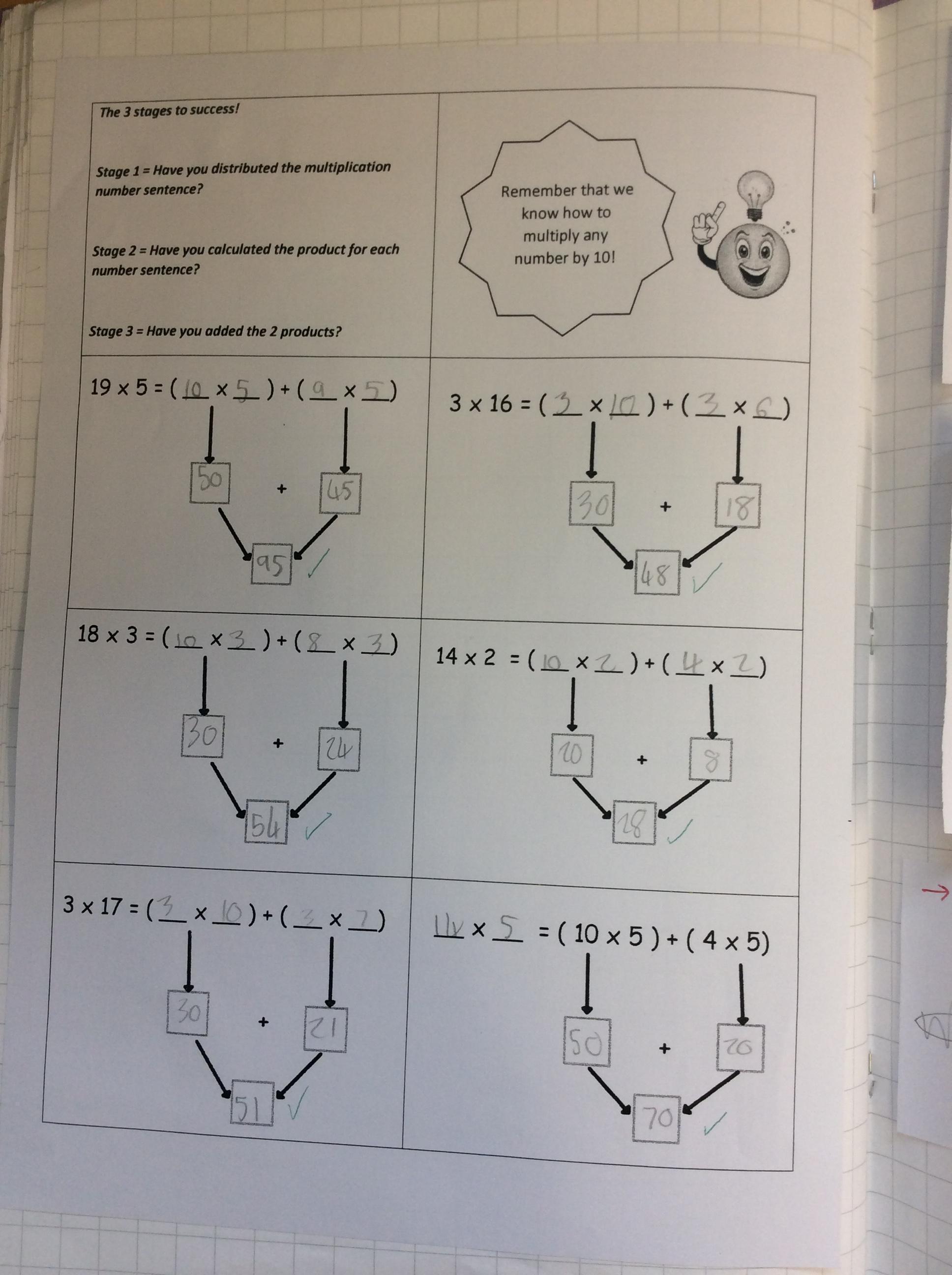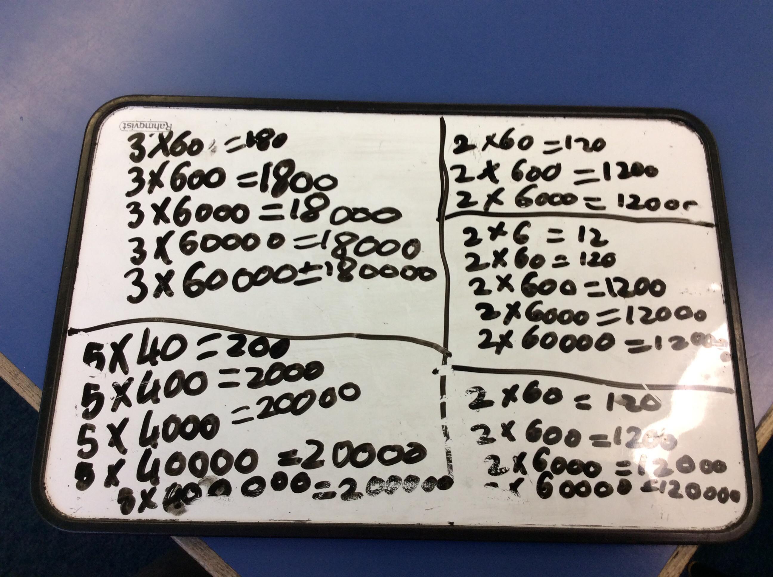 This week we have been applying our knowledge of our 2, 3 and 5 times tables to solve trickier multiplication calculations. Also, we drew on our knowledge of distributing and our special power of being able to multiply any number by 10 to help us with these calculations.