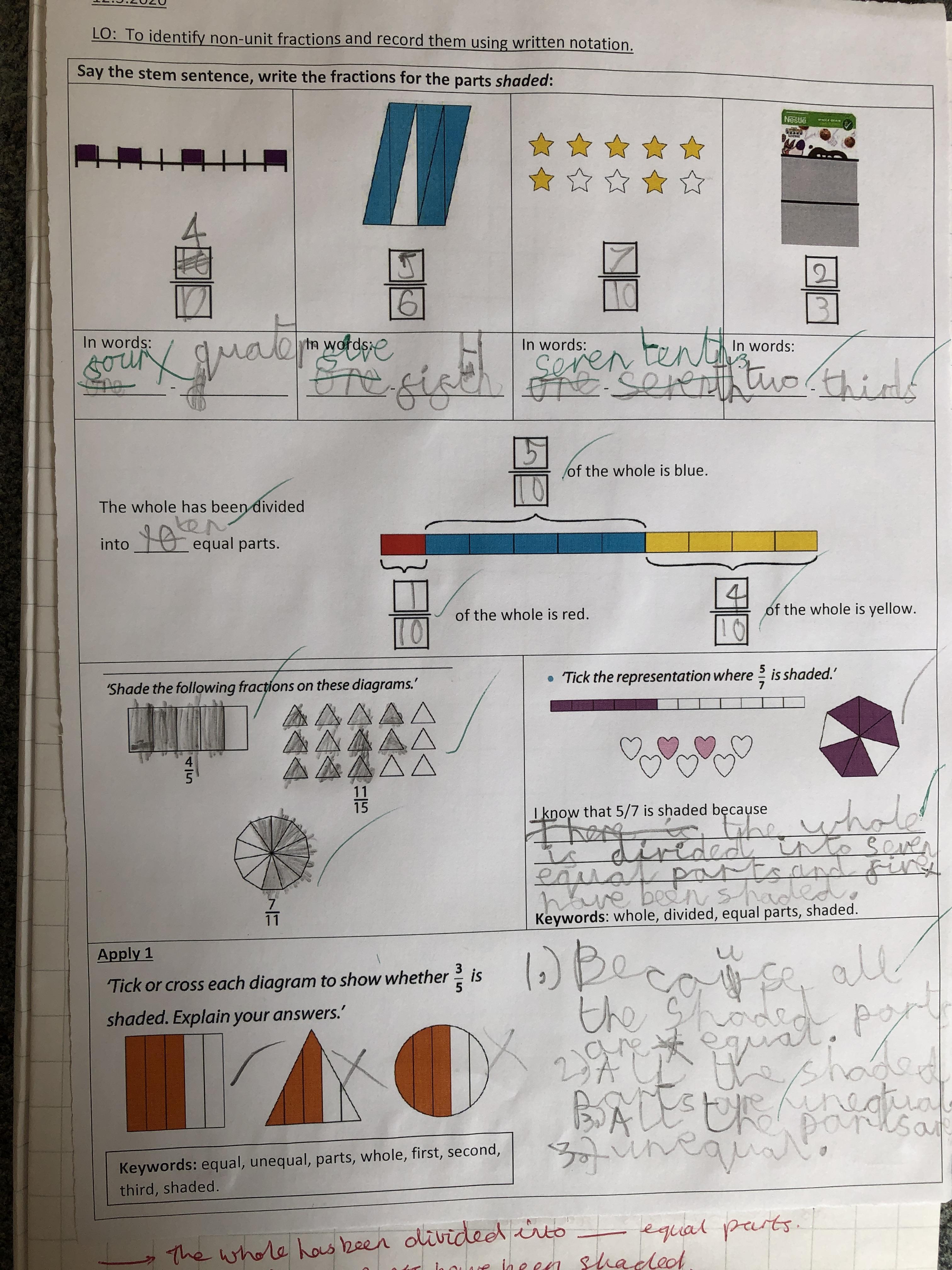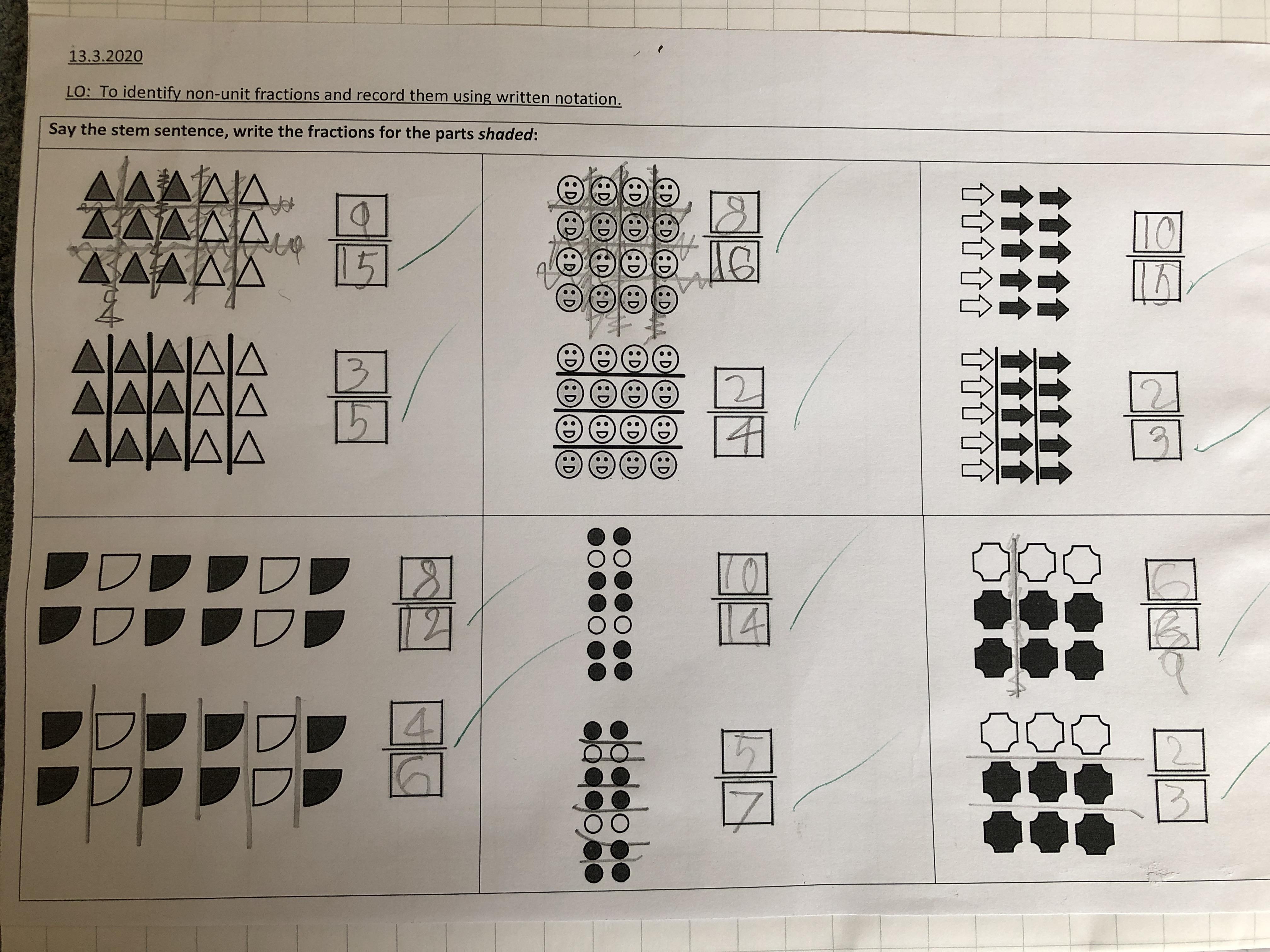 This week, we moved onto identifying and writing non-unit fractions. We also discovered that when the numerator and denominator are equal, we have made 1 whole.