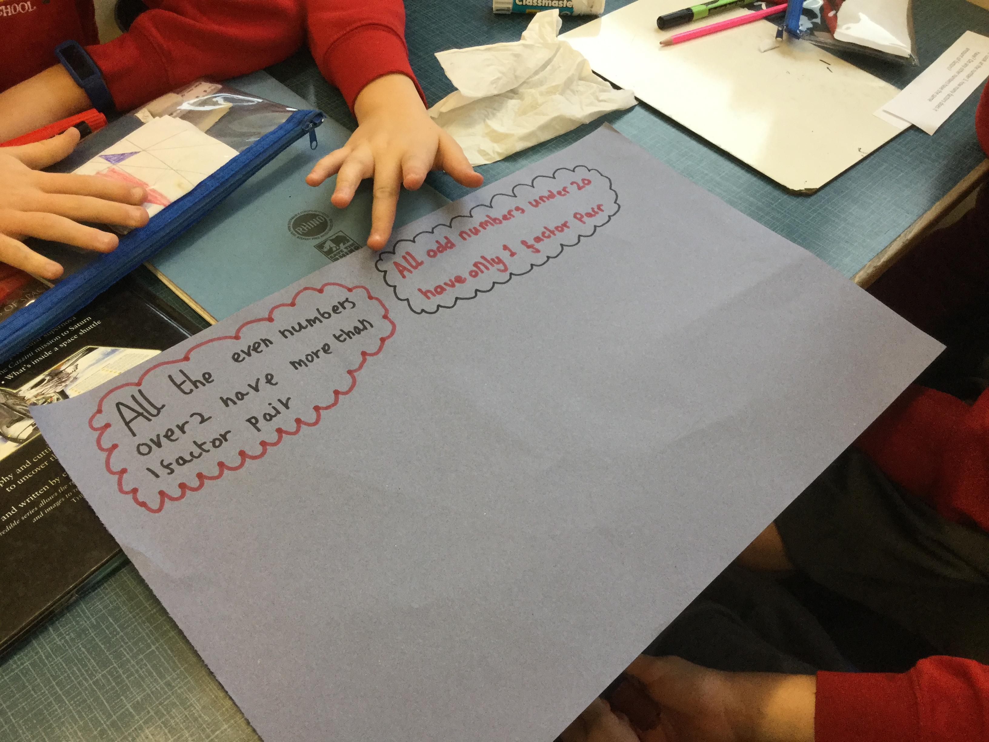 Today, children worked in groups to try to discover the features and properties of prime, square and cubed numbers. They were given challenges to slowly help them learn about the properties of these numbers. They were then challenged to create a poster to present to the rest of the class to teach them about their numbers.