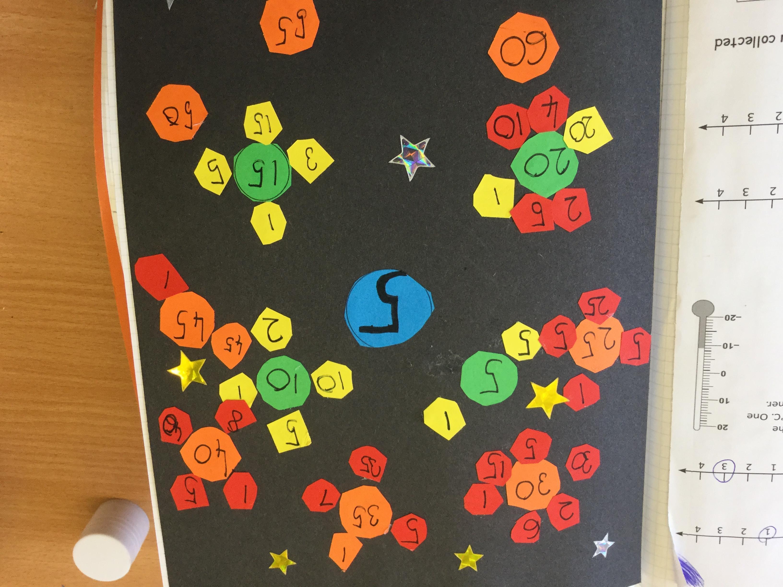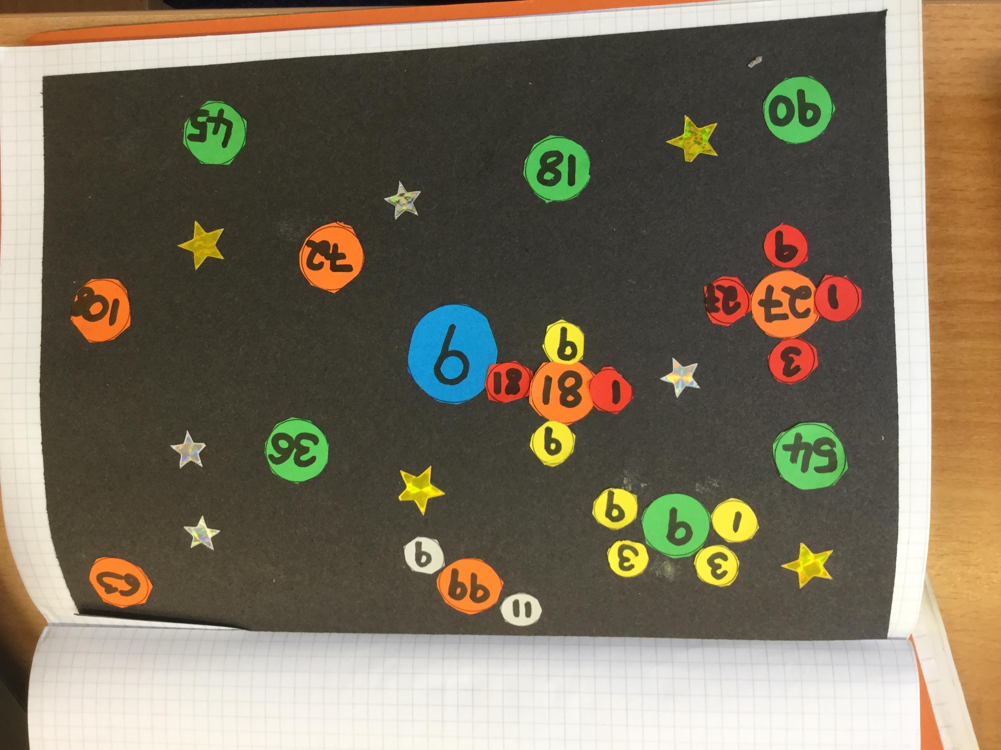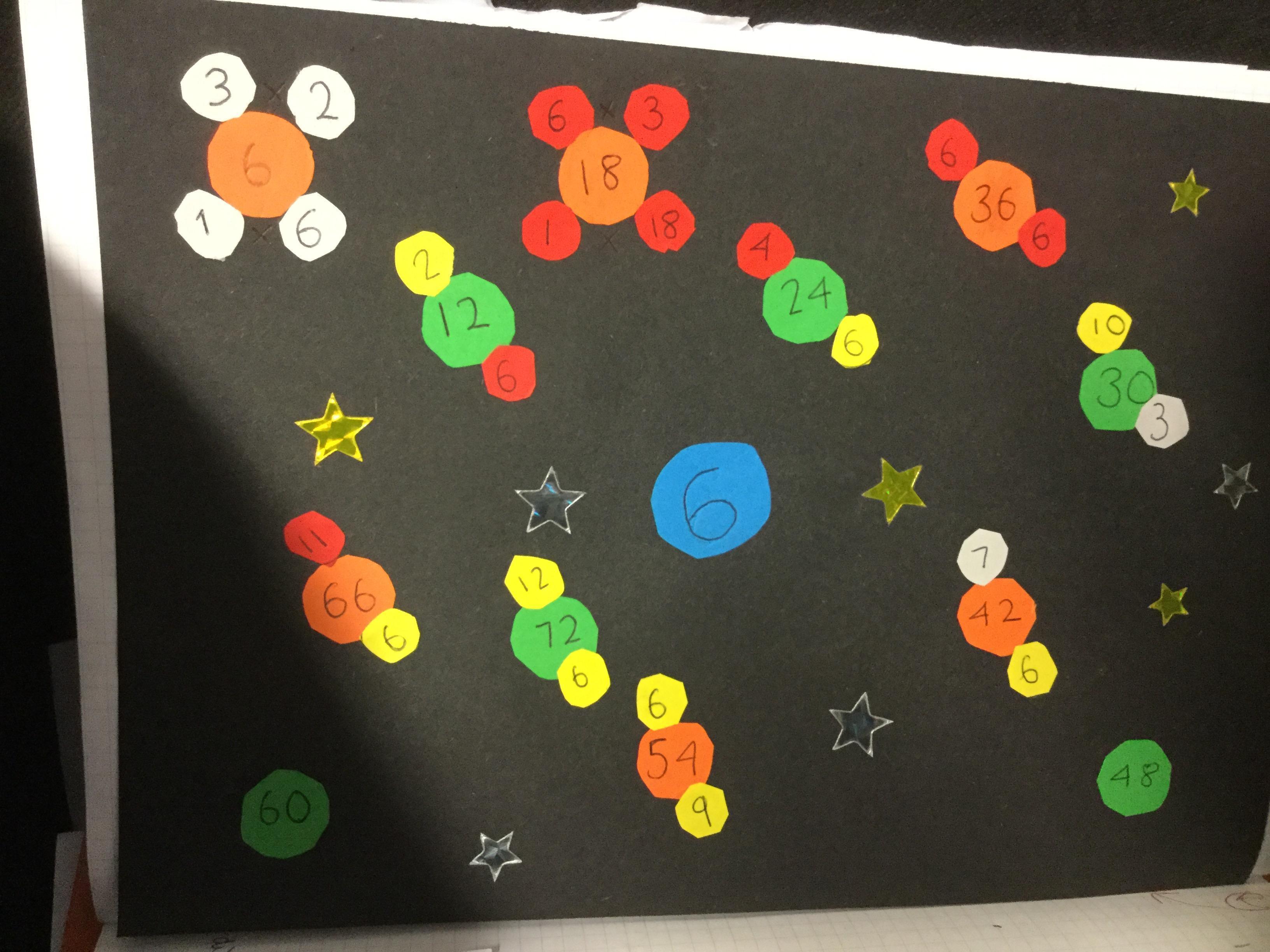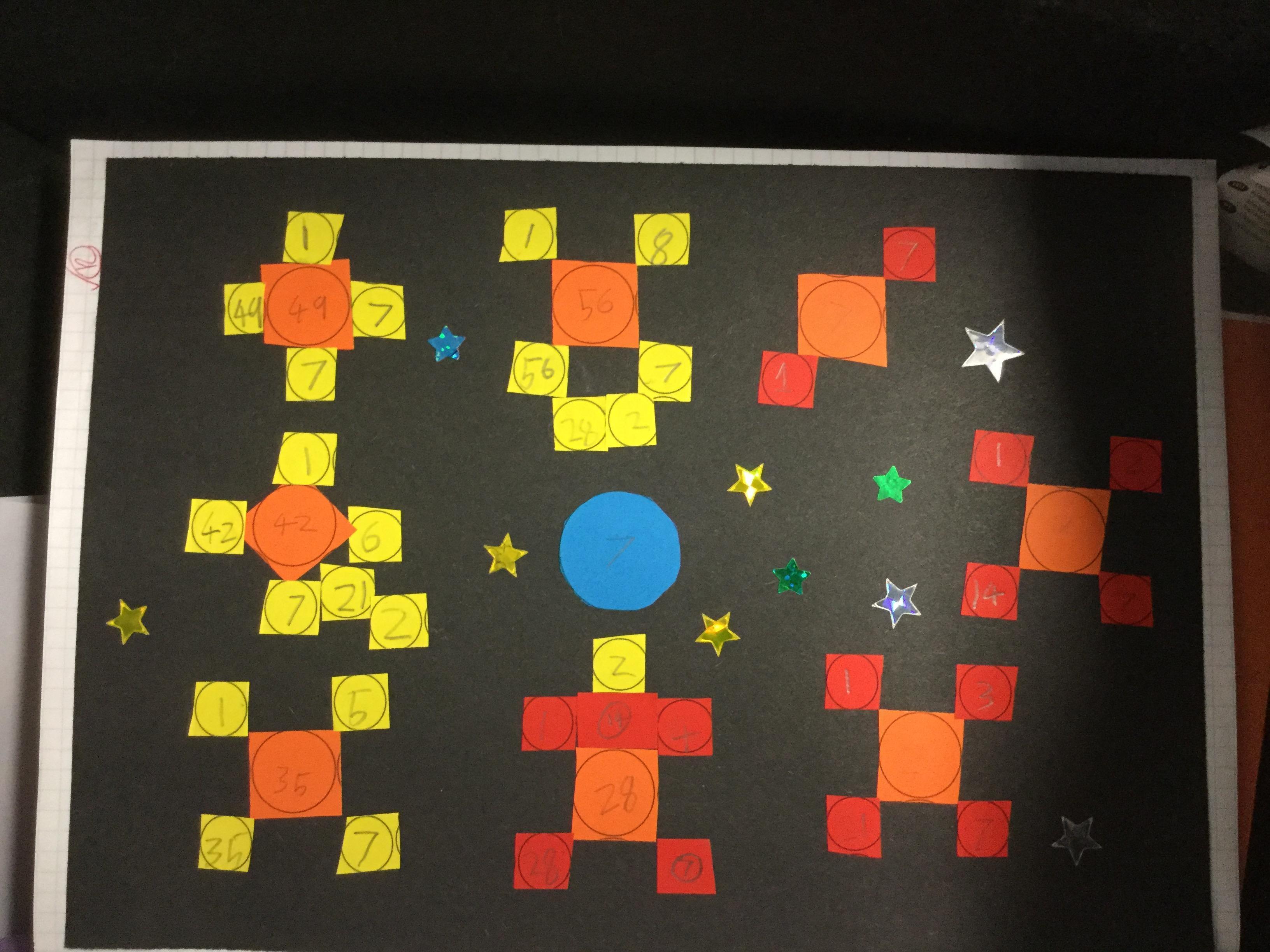 Today we had great fun making our own factor galaxies. We had to choose a times table that became the number on our sun. Then we had to make all its multiples into planets. Each planet was then orbited by its moons which were the factors of that number. Here are the results!