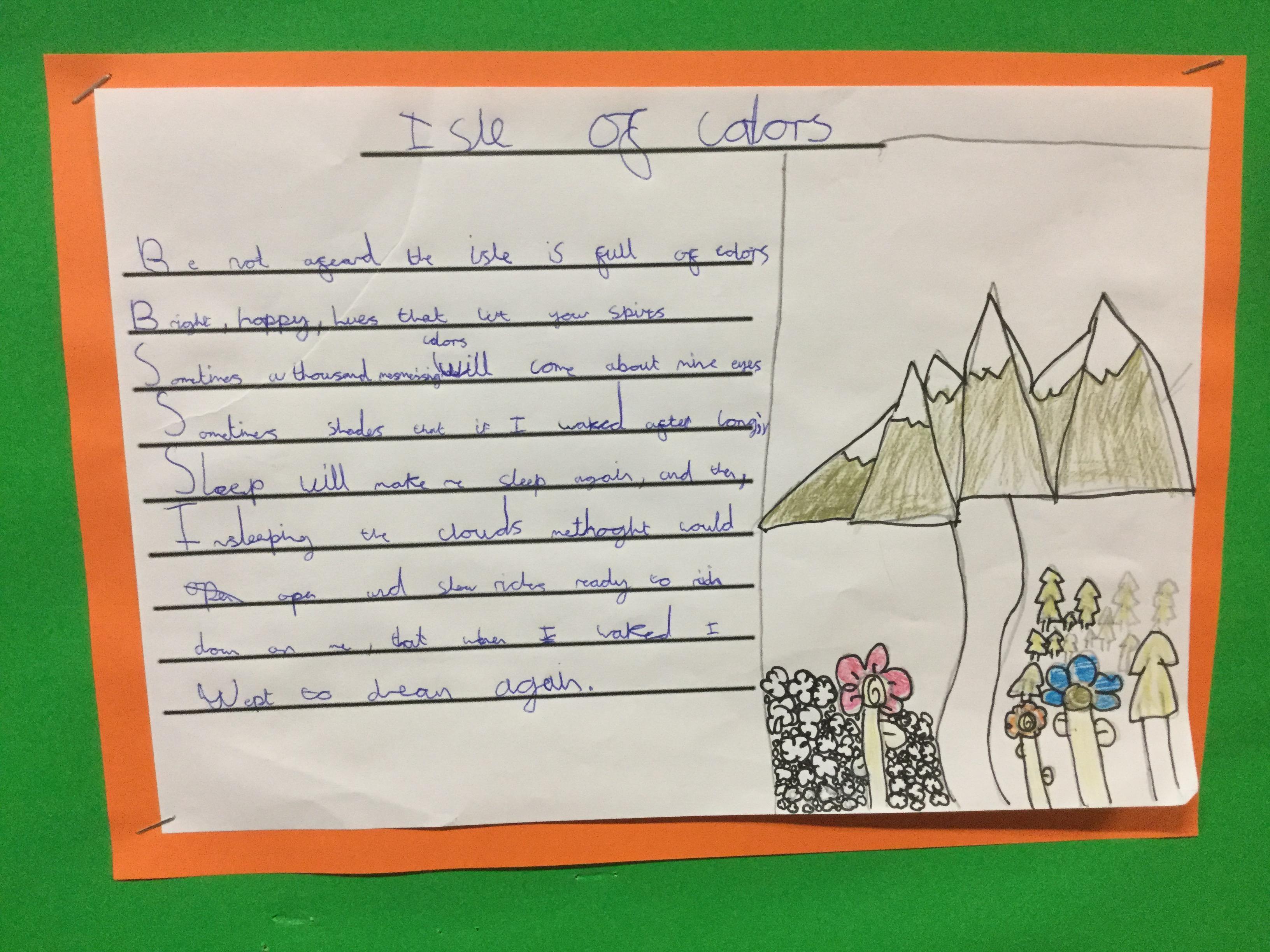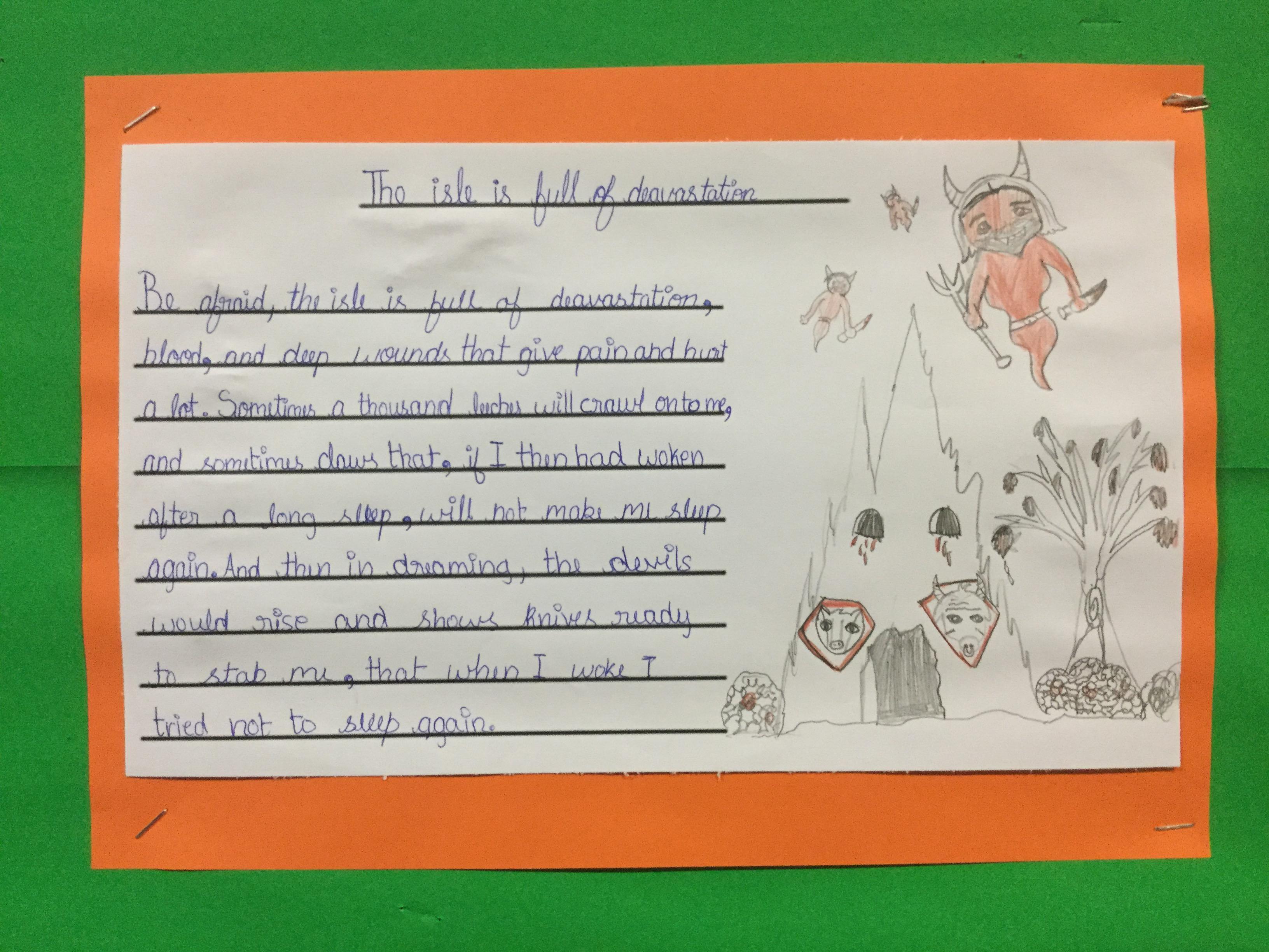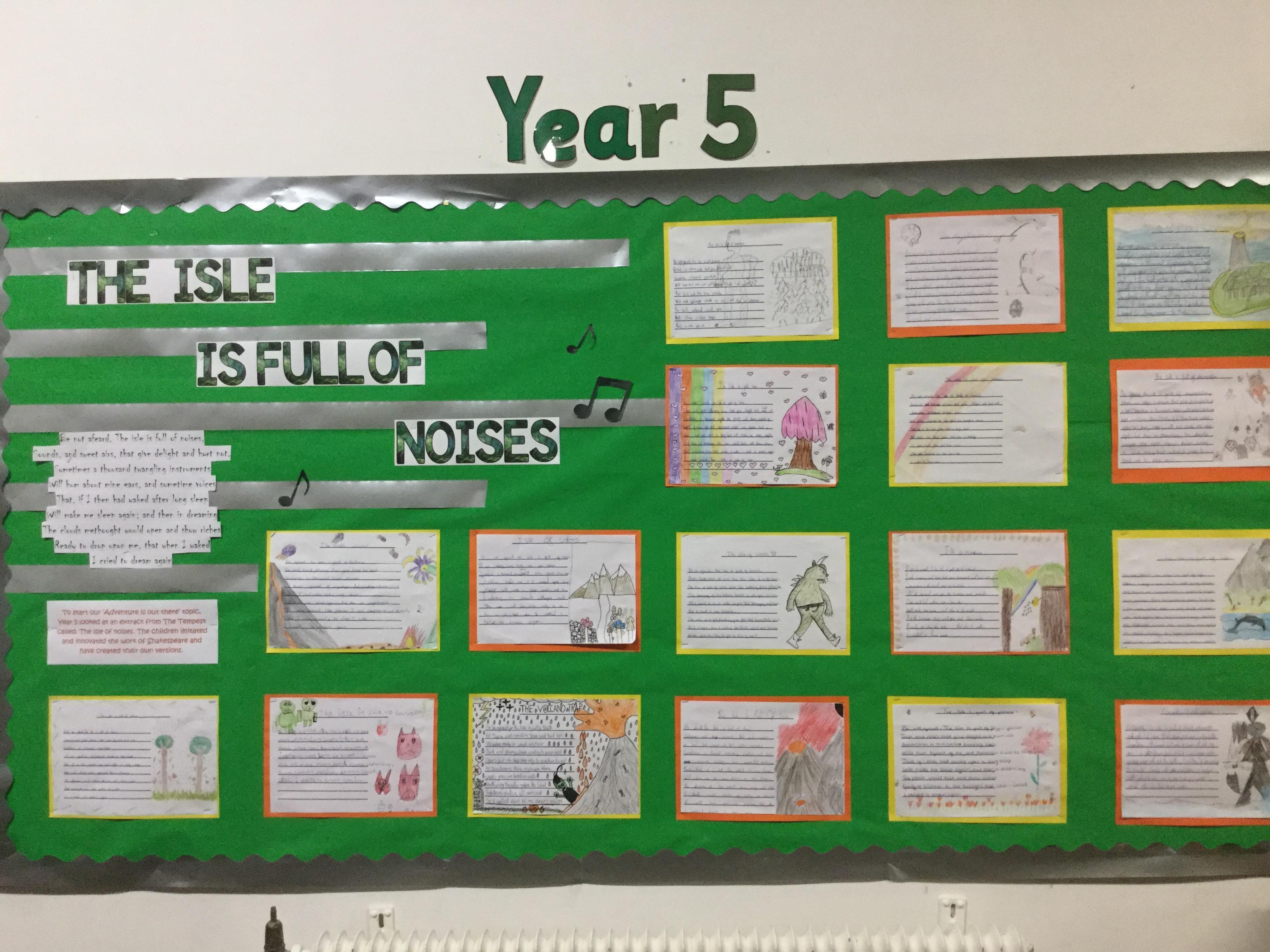To start our unit of ‘Adventure is out there’, Year 5 looked at an extra from The Tempest by Shakespeare called ‘The Isle of Noises.’ Over the week the children imitated and innovated the work, creating their own version of the poem about an isle of their choice. The work is now on display at school.