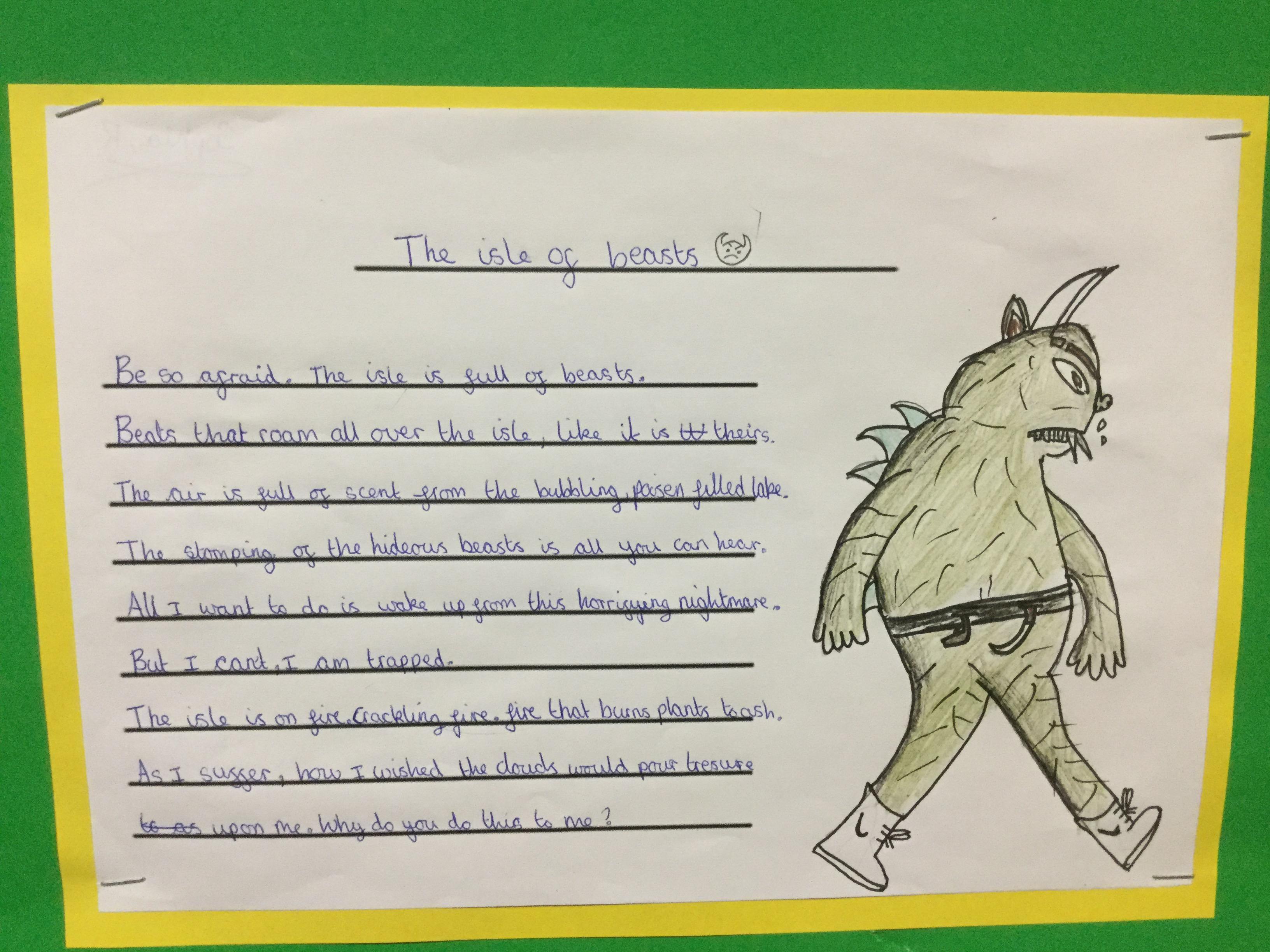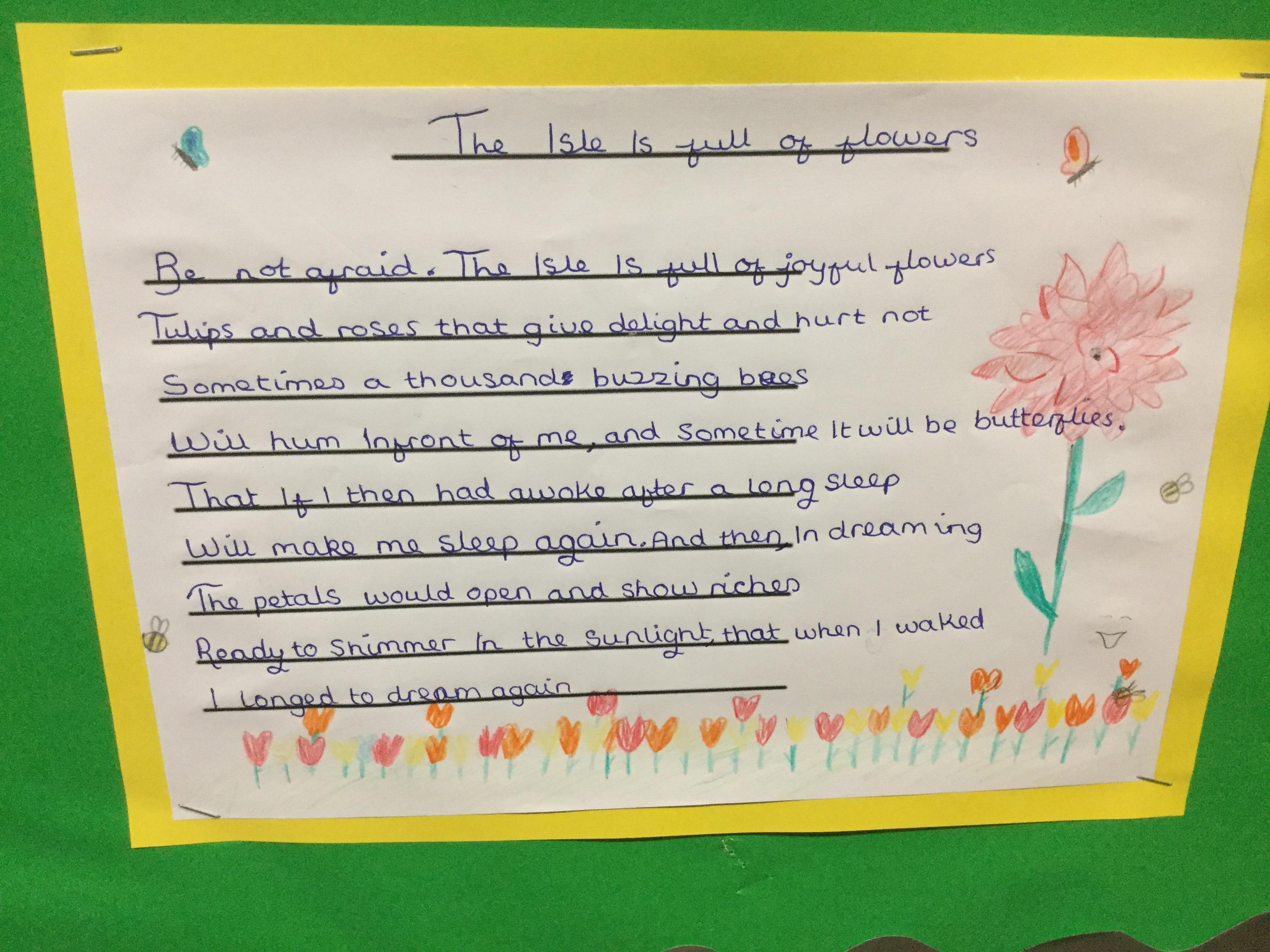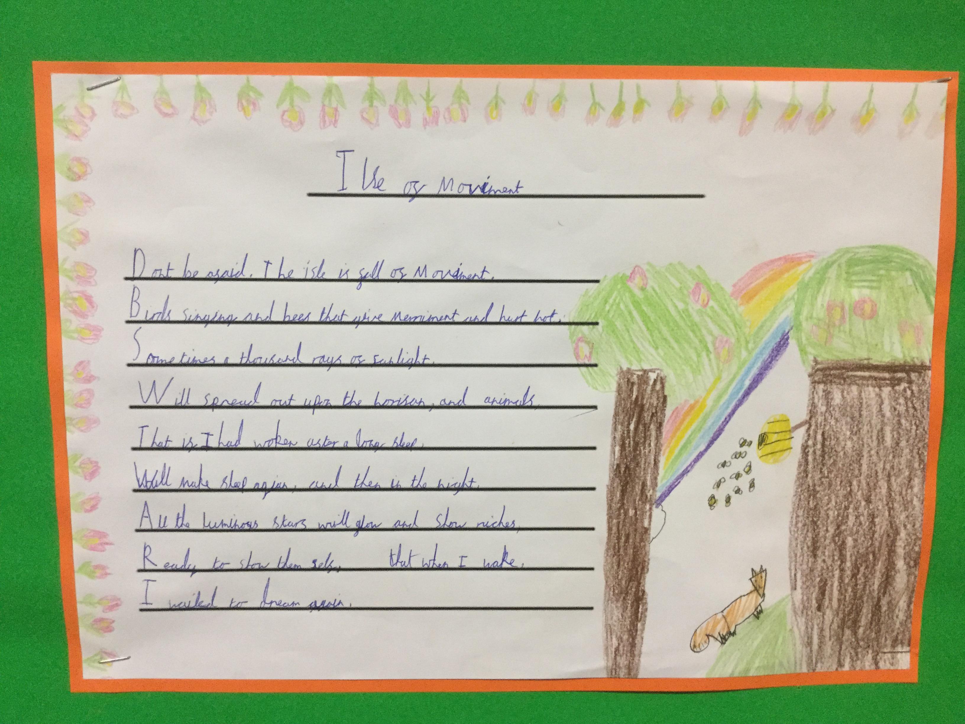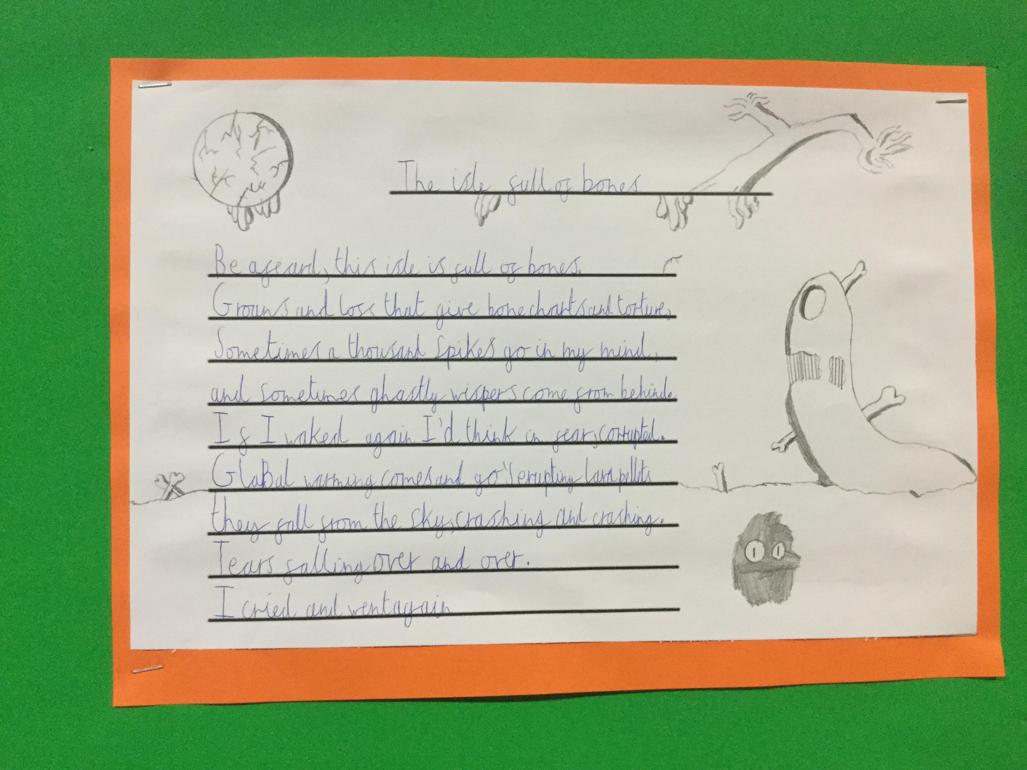 To start our unit of ‘Adventure is out there’, Year 5 looked at an extra from The Tempest by Shakespeare called ‘The Isle of Noises.’ Over the week the children imitated and innovated the work, creating their own version of the poem about an isle of their choice. The work is now on display at school.