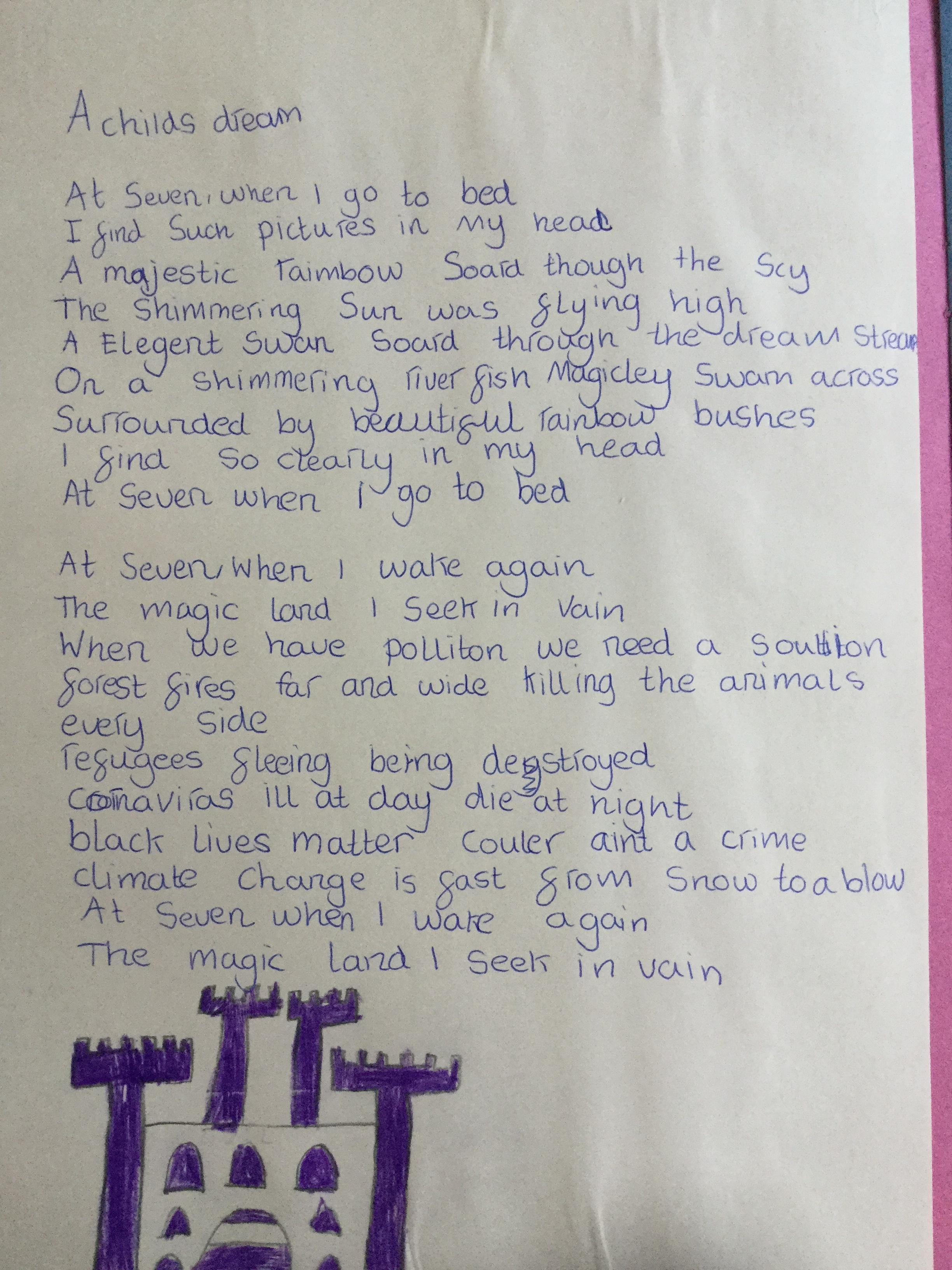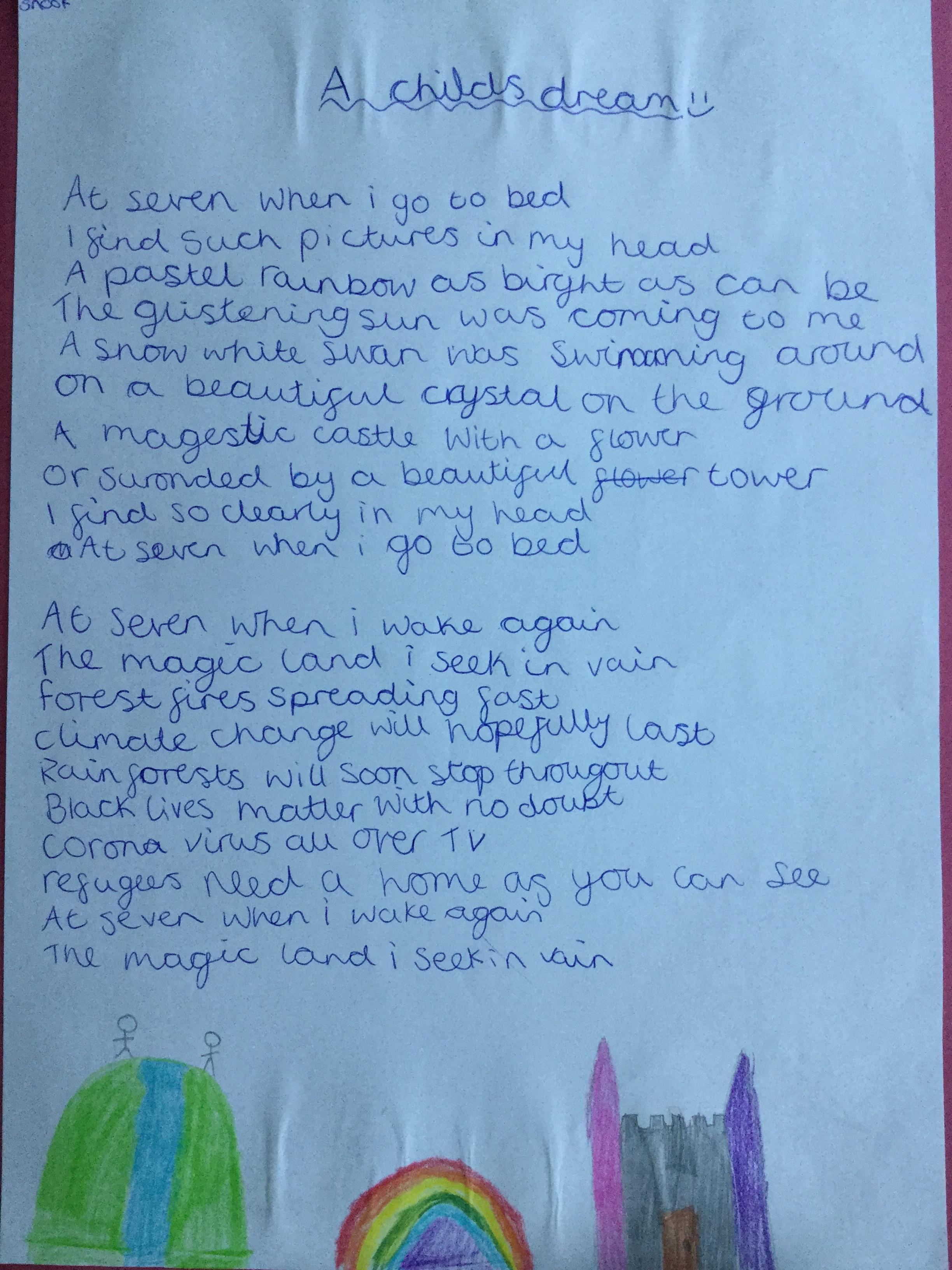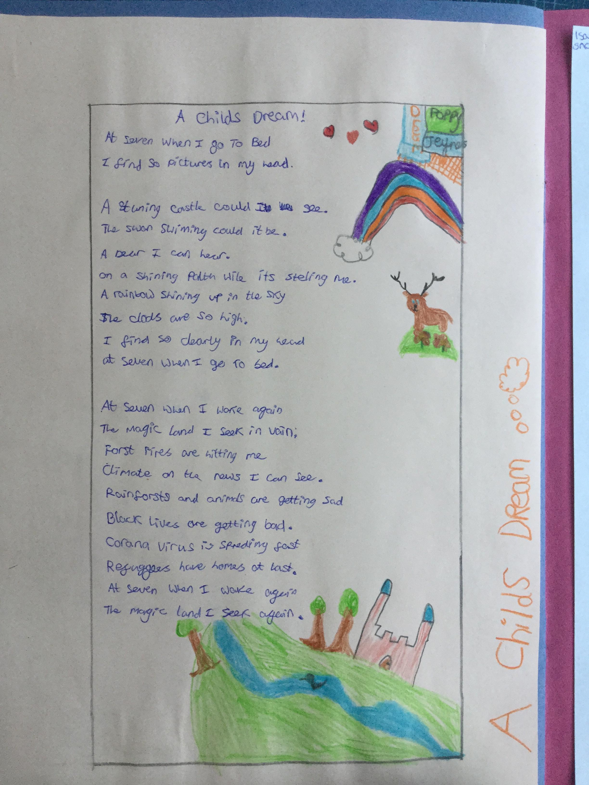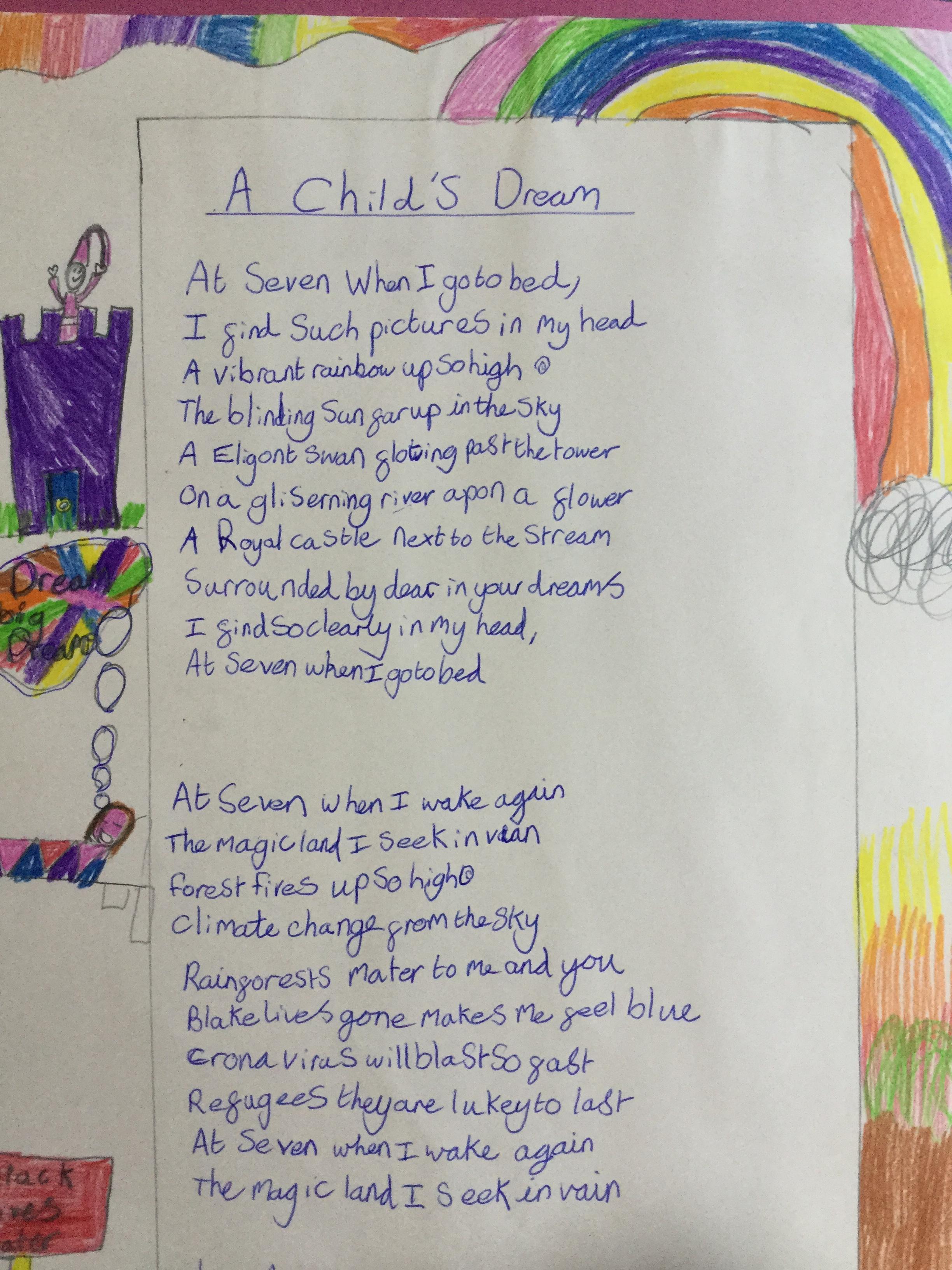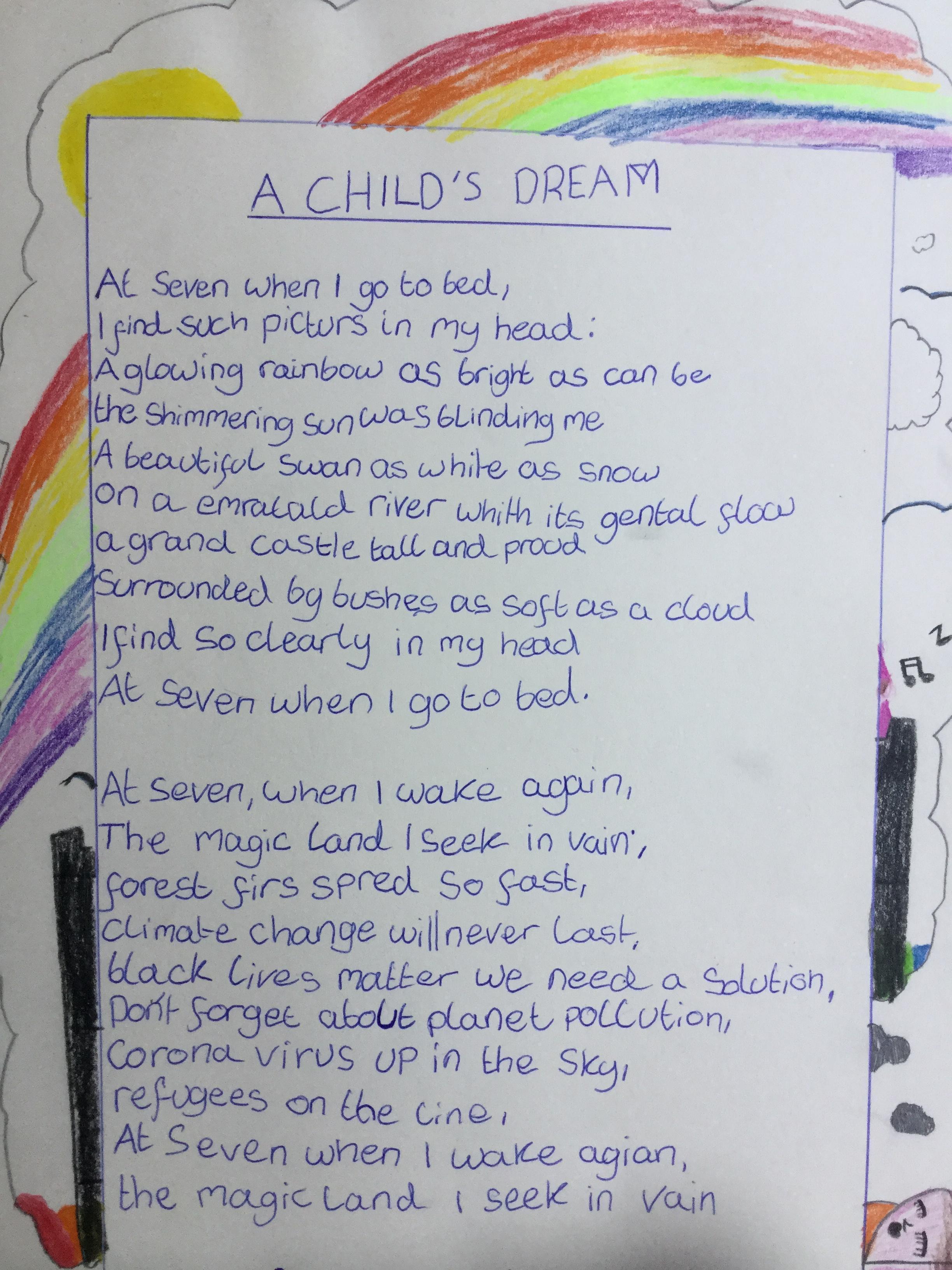 This week the children have been studying and imitating the work of Robert Lewis Stevenson about a child’s thought. This poem is about a dreamland vs reality of life. Across the week we have widened our vocabulary thinking about: verbs, nouns, adverbs, adjectives, thoughts, feelings and 5 senses to create poems with imagery and meaning. To start with we imitated the poet using the image given and then created our own based on a new dreamworld and the reality of life that is happening in the world around us such as: lockdown, coronavirus, black lives matter, deforestation, politics, technology, climate change, protests, war, fires amongst others. All ideas were from the children. It was a great week of creativity and poetry from Year 5!