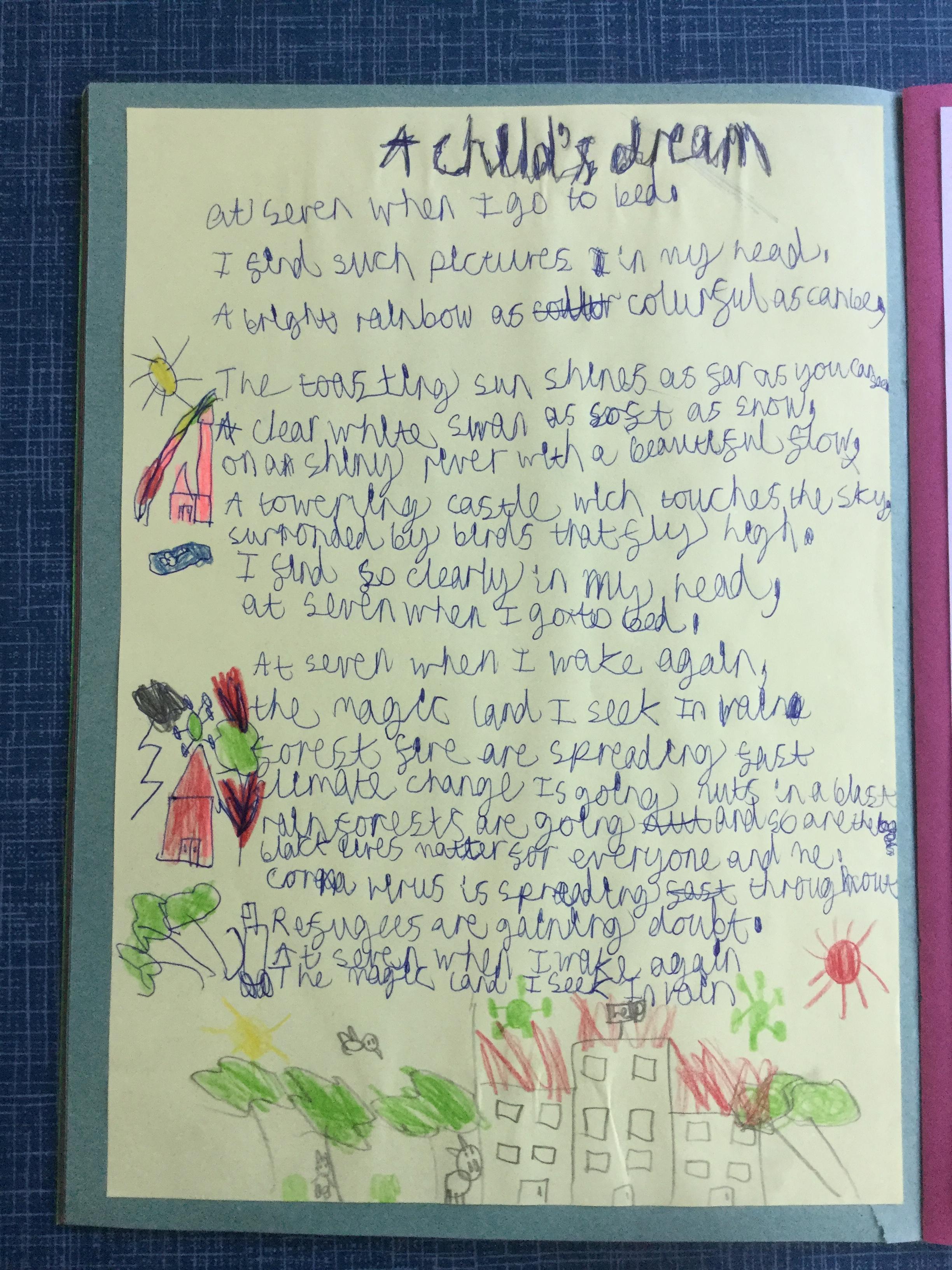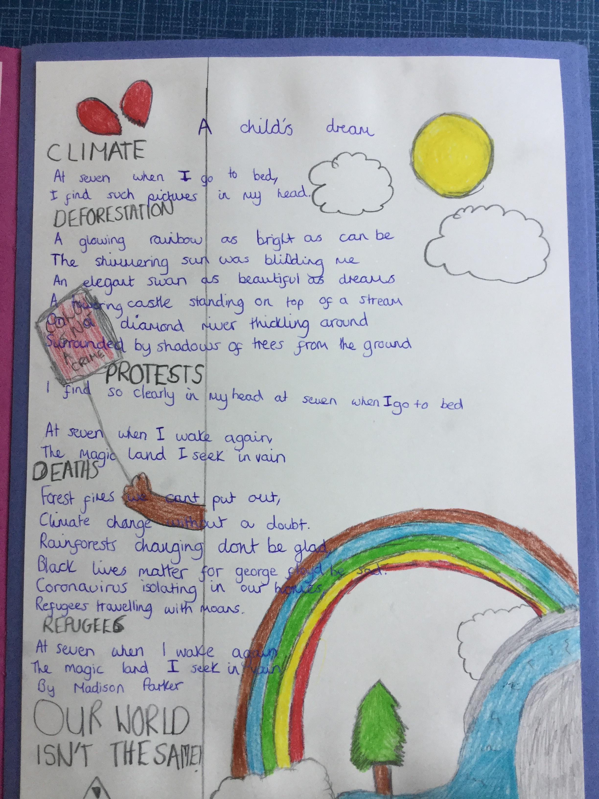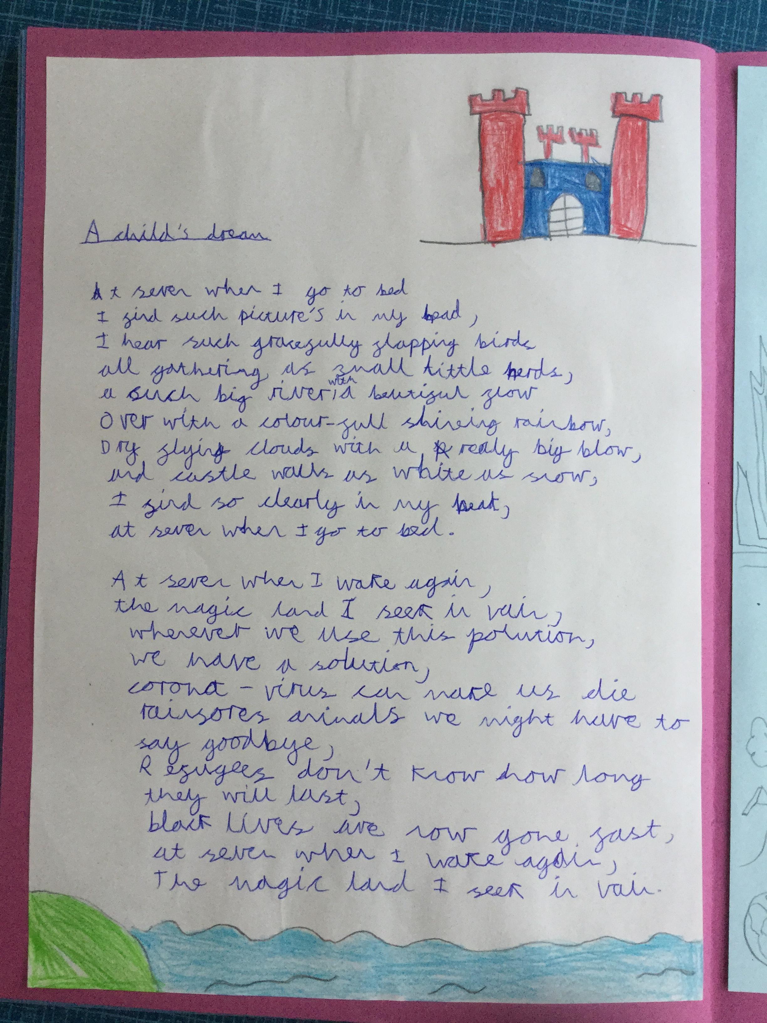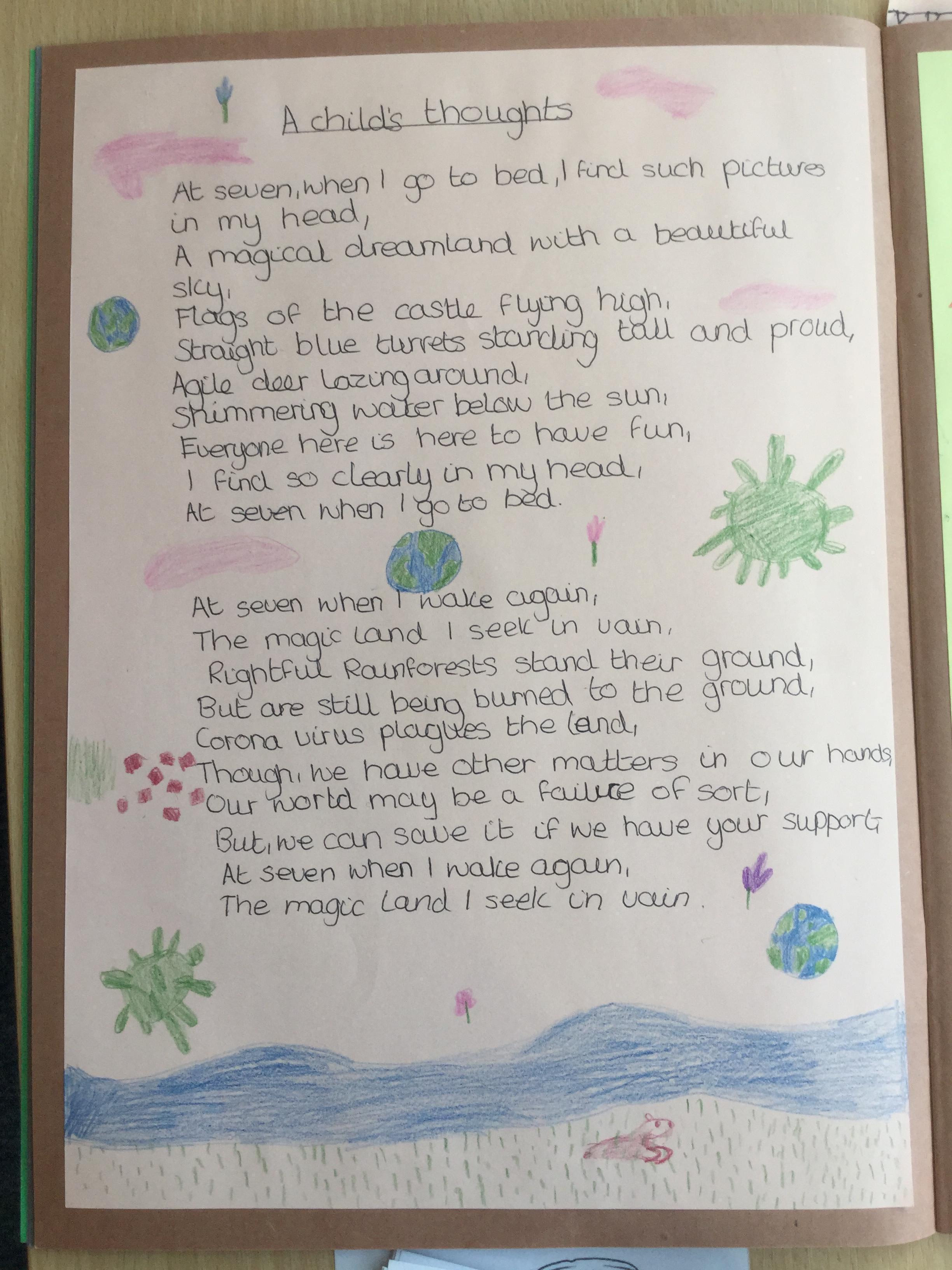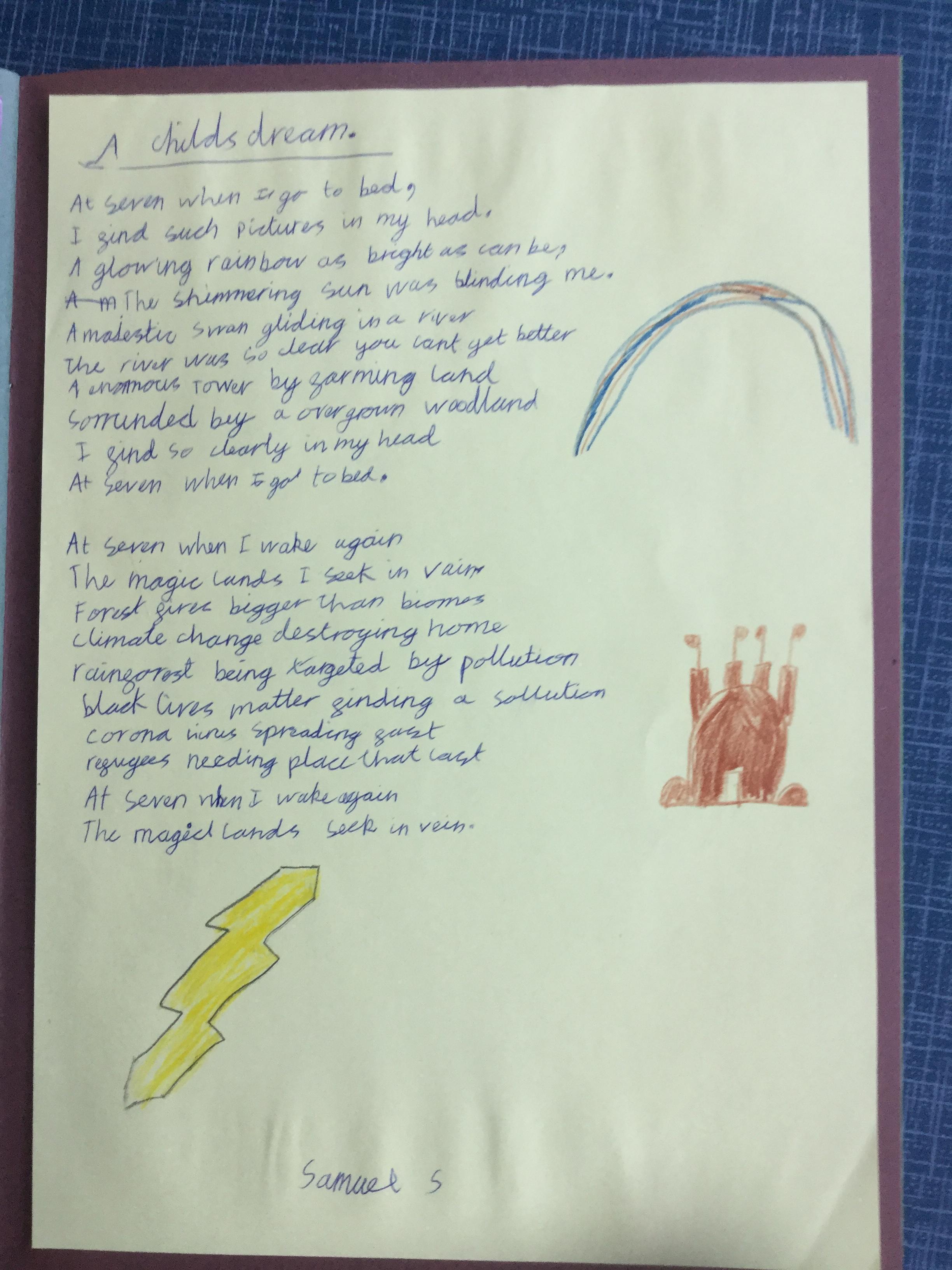 This week the children have been studying and imitating the work of Robert Lewis Stevenson about a child’s thought. This poem is about a dreamland vs reality of life. Across the week we have widened our vocabulary thinking about: verbs, nouns, adverbs, adjectives, thoughts, feelings and 5 senses to create poems with imagery and meaning. To start with we imitated the poet using the image given and then created our own based on a new dreamworld and the reality of life that is happening in the world around us such as: lockdown, coronavirus, black lives matter, deforestation, politics, technology, climate change, protests, war, fires amongst others. All ideas were from the children. It was a great week of creativity and poetry from Year 5!
